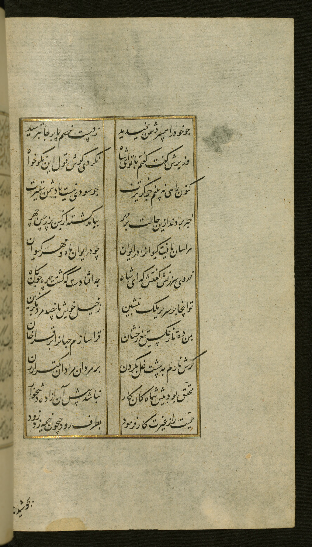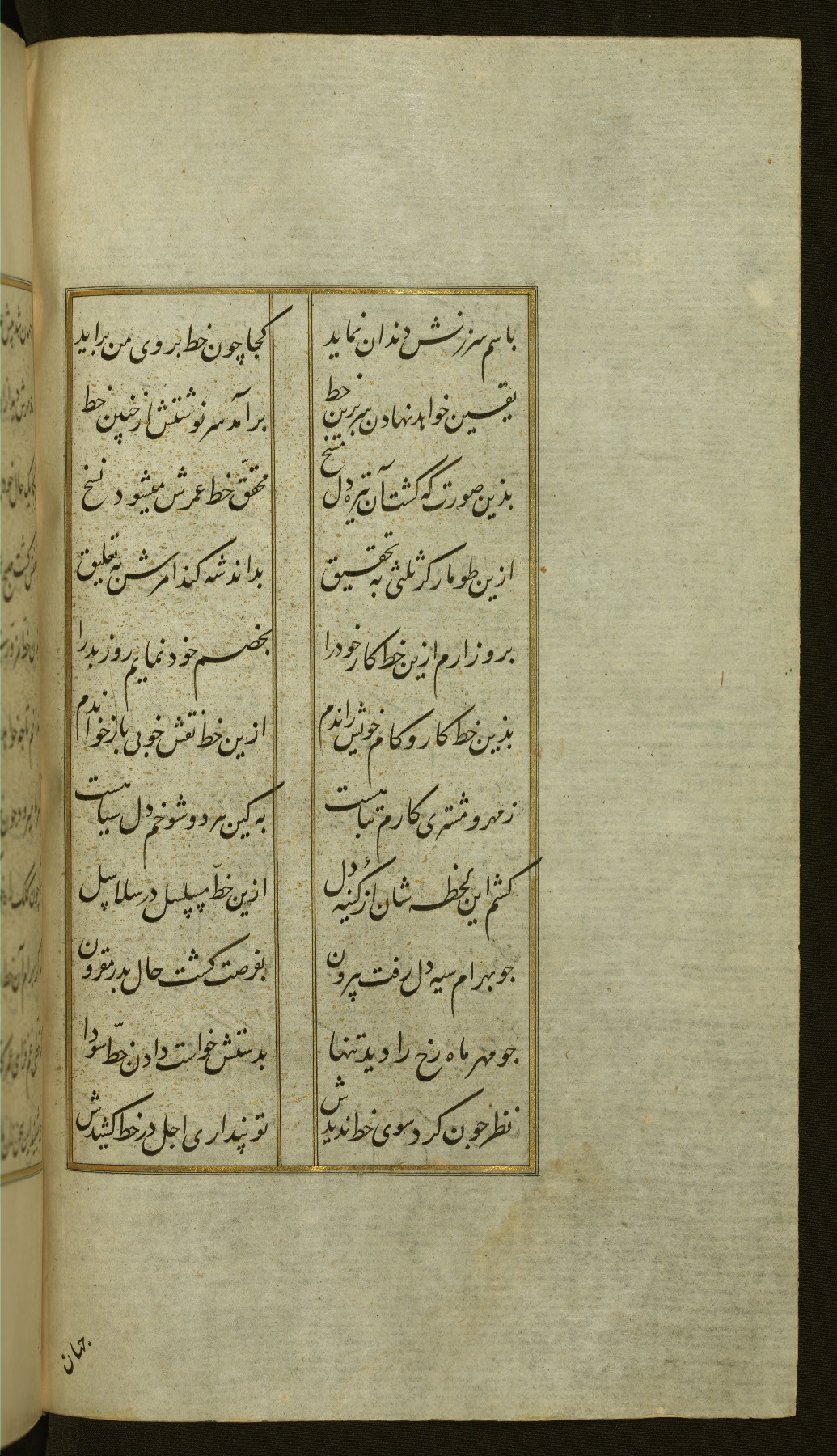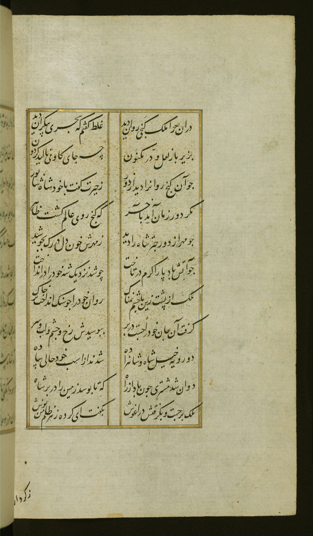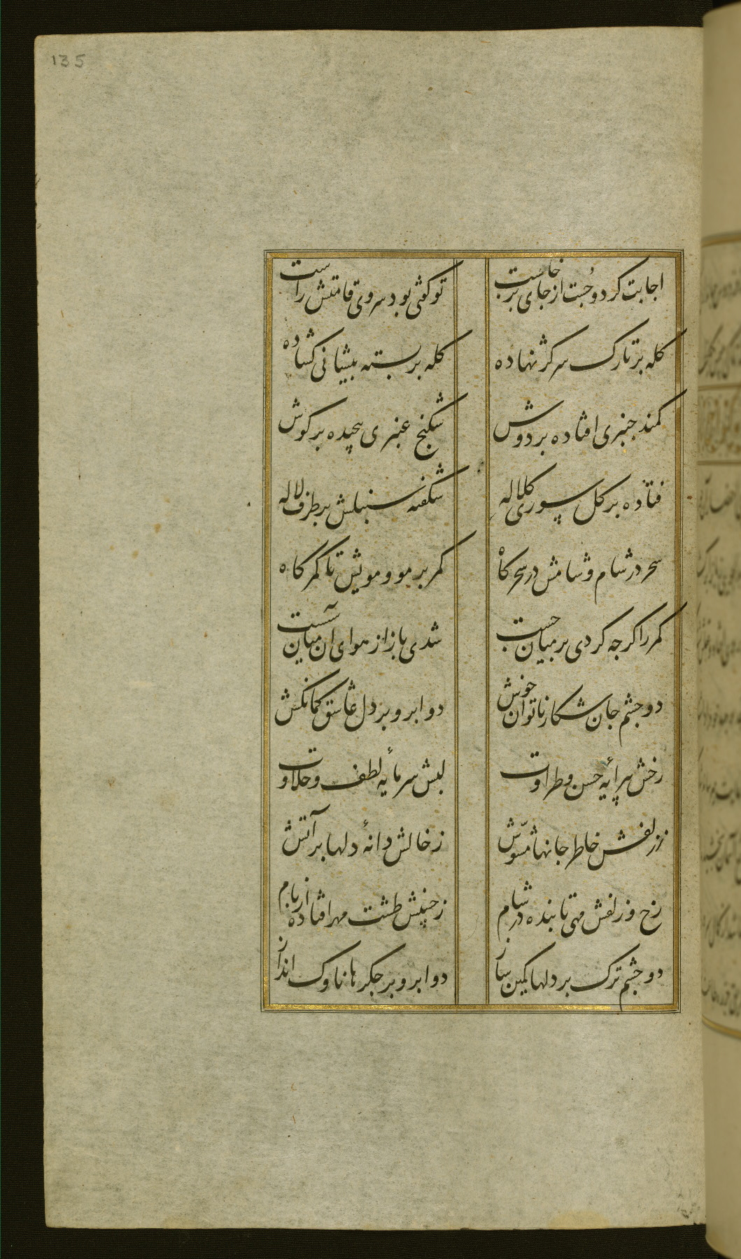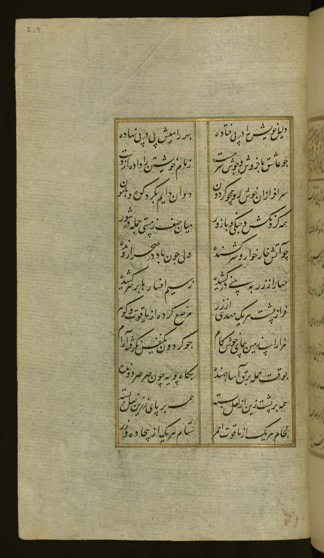This manuscript is an illustrated copy of the well-known poem recounting the platonic love story between Mihr (the Sun), the son of Shāhpūr, and his vizier's son Mushtarī (Jupiter). The story of 90 chapters was composed by Muḥammad ibn Aḥmad ‘Aṣṣār Tabrīzī (d. 784 AH / 1382 CE). The present copy was written in nasta‘līq script by Murshid al-Kātib in 881 AH / 1476 CE. Considering the number of surviving manuscripts in which this calligrapher’s name is found, it seems he was particularly prolific. The present codex is illustrated with nine paintings. The gold-brushed leather binding with doublures of red leather decorated with filigree work is original to the manuscript.