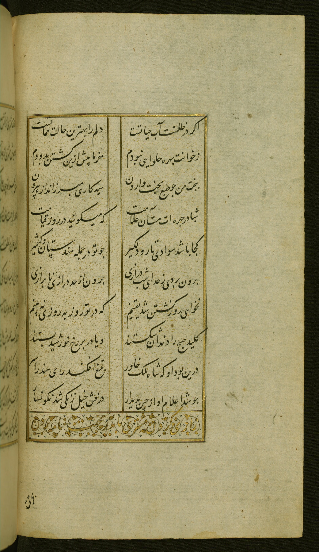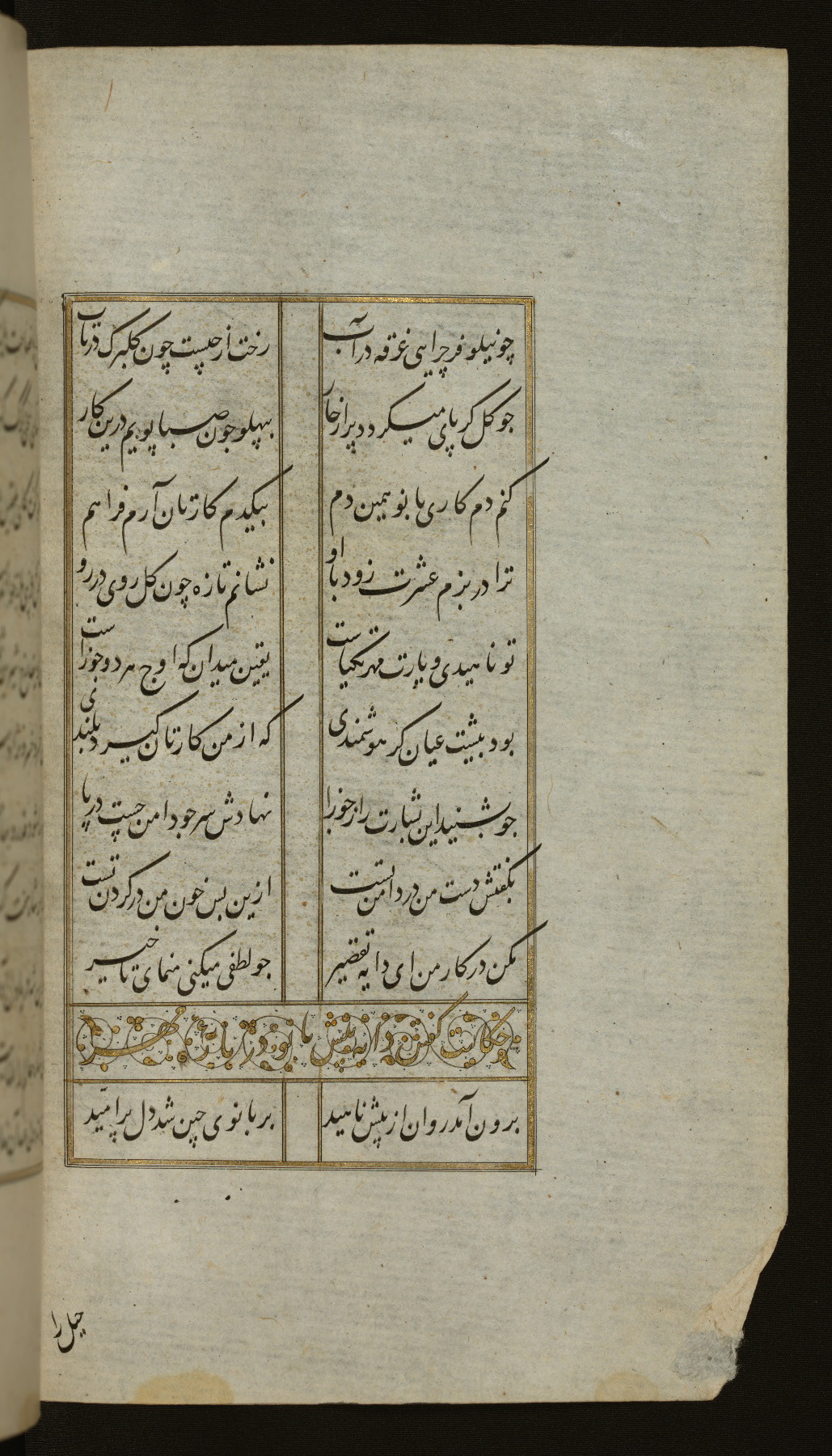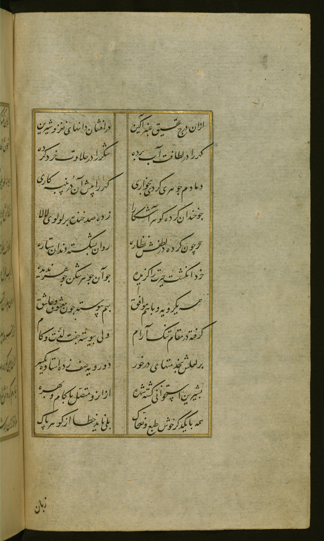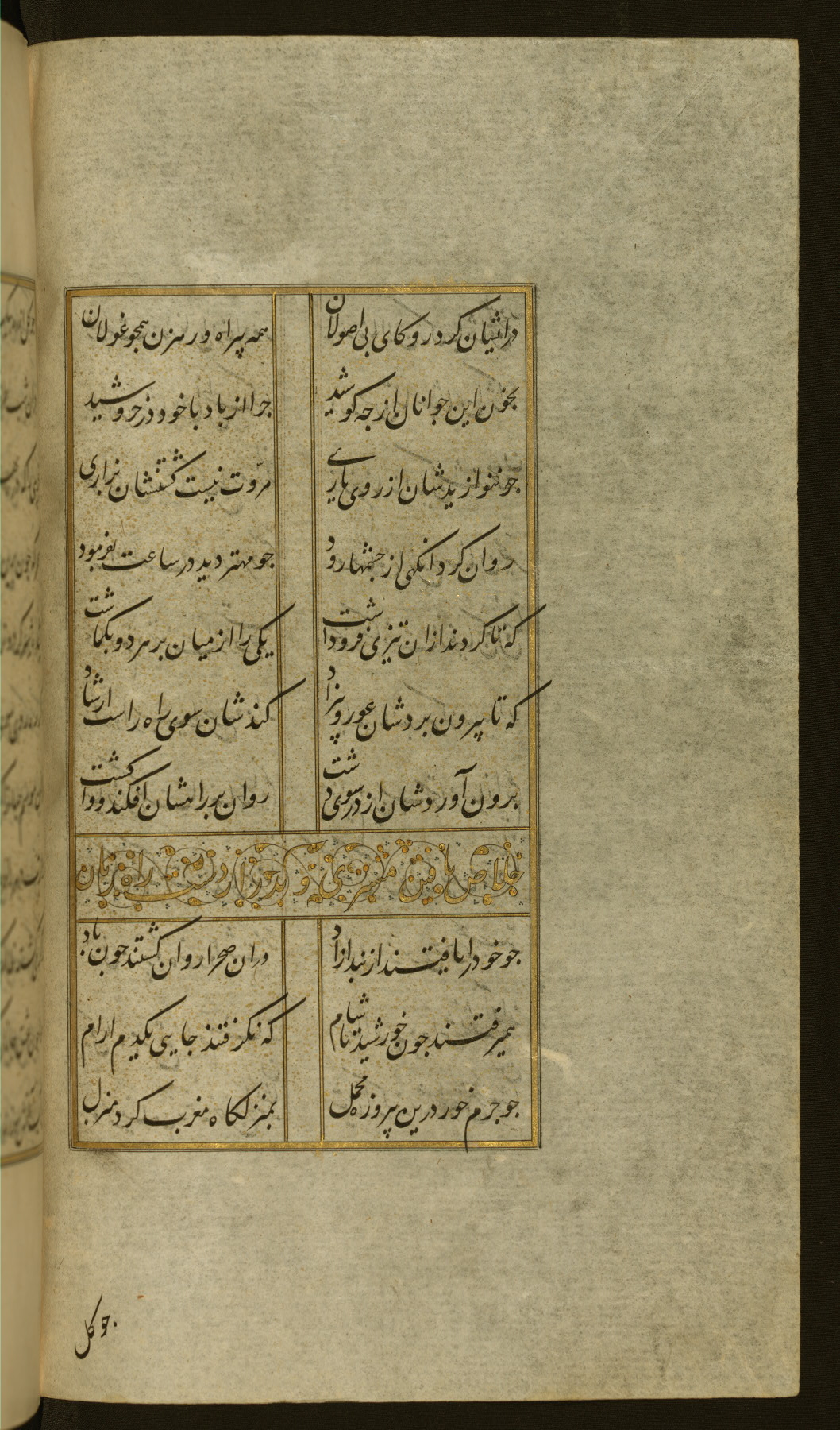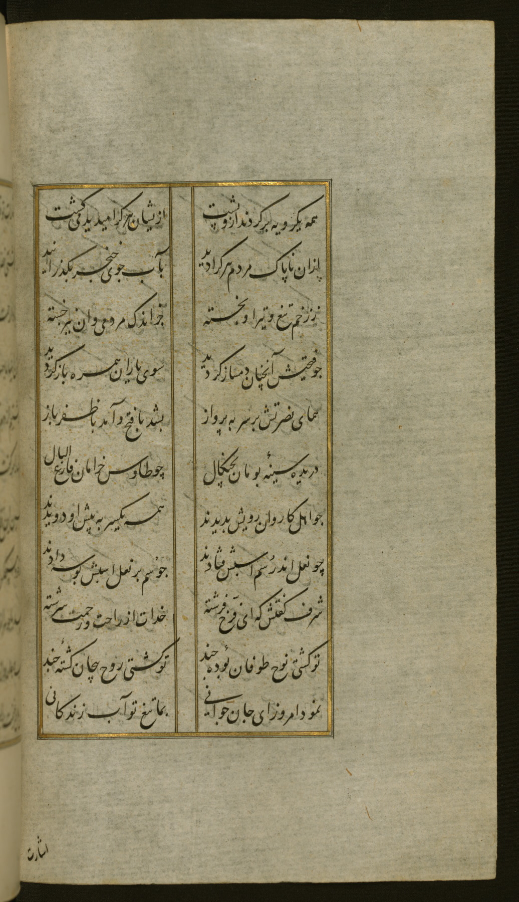 This manuscript is an illustrated copy of the well-known poem recounting the platonic love story between Mihr (the Sun), the son of Shāhpūr, and his vizier's son Mushtarī (Jupiter). The story of 90 chapters was composed by Muḥammad ibn Aḥmad ‘Aṣṣār Tabrīzī (d. 784 AH / 1382 CE). The present copy was written in nasta‘līq script by Murshid al-Kātib in 881 AH / 1476 CE. Considering the number of surviving manuscripts in which this calligrapher’s name is found, it seems he was particularly prolific. The present codex is illustrated with nine paintings. The gold-brushed leather binding with doublures of red leather decorated with filigree work is original to the manuscript.