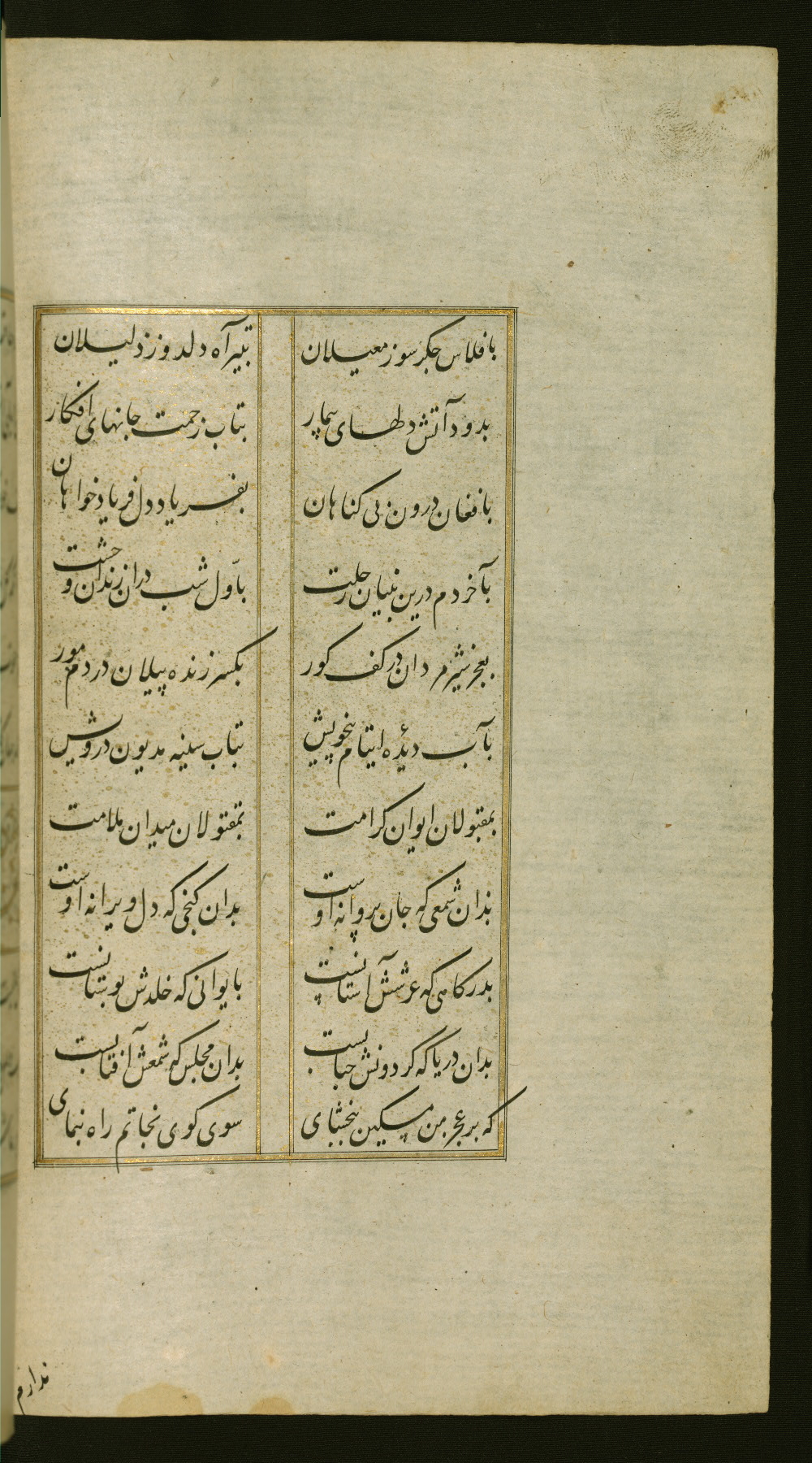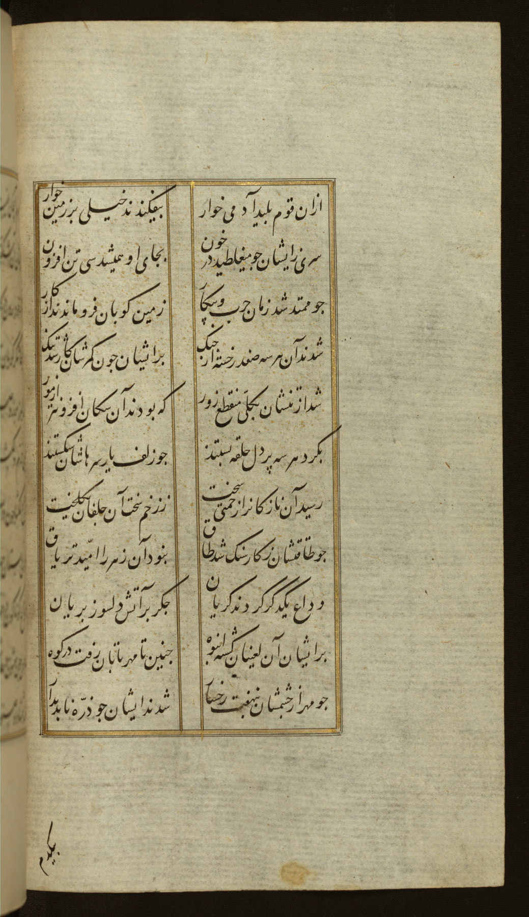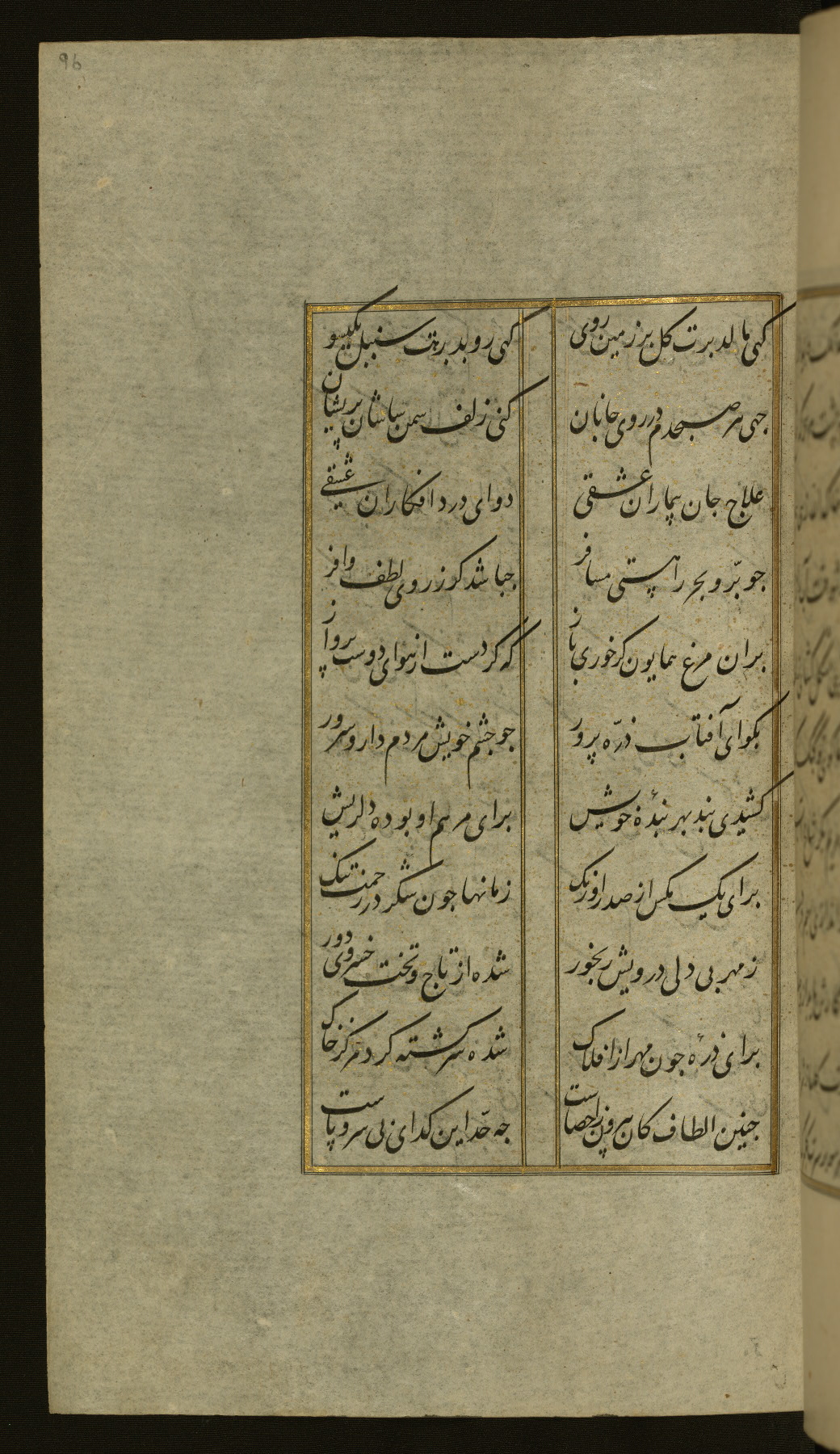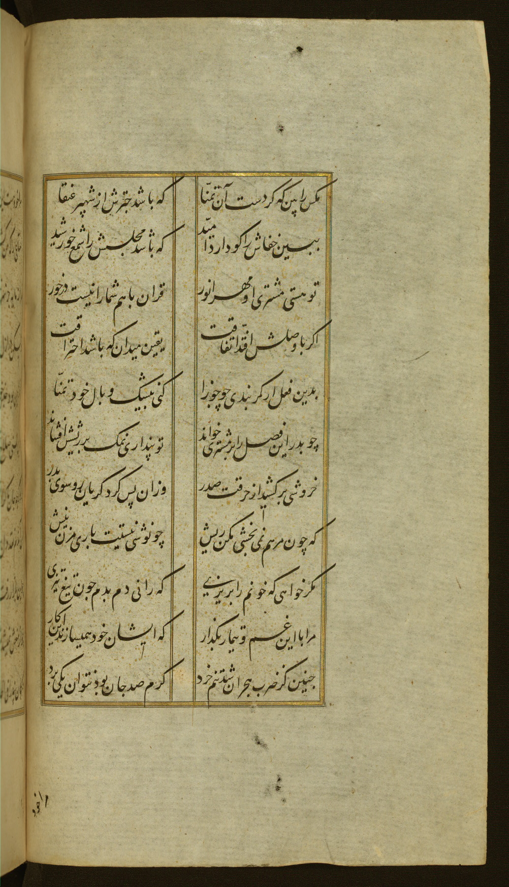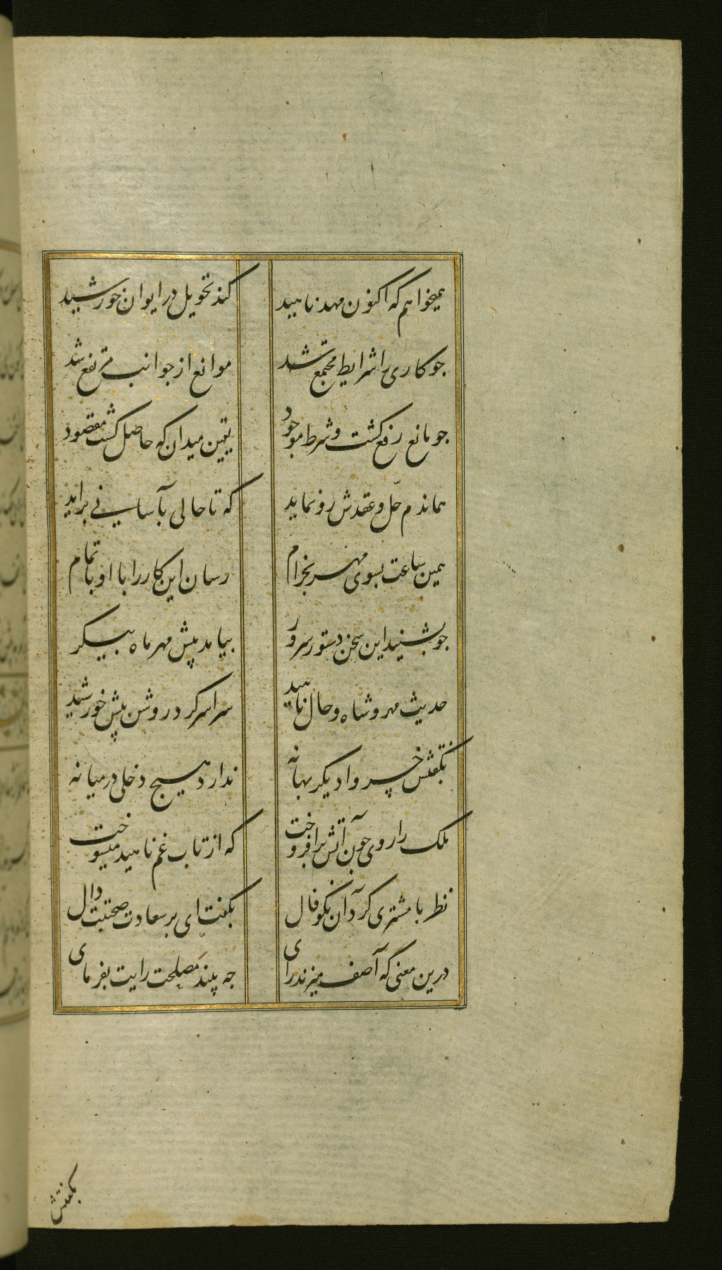 This manuscript is an illustrated copy of the well-known poem recounting the platonic love story between Mihr (the Sun), the son of Shāhpūr, and his vizier's son Mushtarī (Jupiter). The story of 90 chapters was composed by Muḥammad ibn Aḥmad ‘Aṣṣār Tabrīzī (d. 784 AH / 1382 CE). The present copy was written in nasta‘līq script by Murshid al-Kātib in 881 AH / 1476 CE. Considering the number of surviving manuscripts in which this calligrapher’s name is found, it seems he was particularly prolific. The present codex is illustrated with nine paintings. The gold-brushed leather binding with doublures of red leather decorated with filigree work is original to the manuscript.