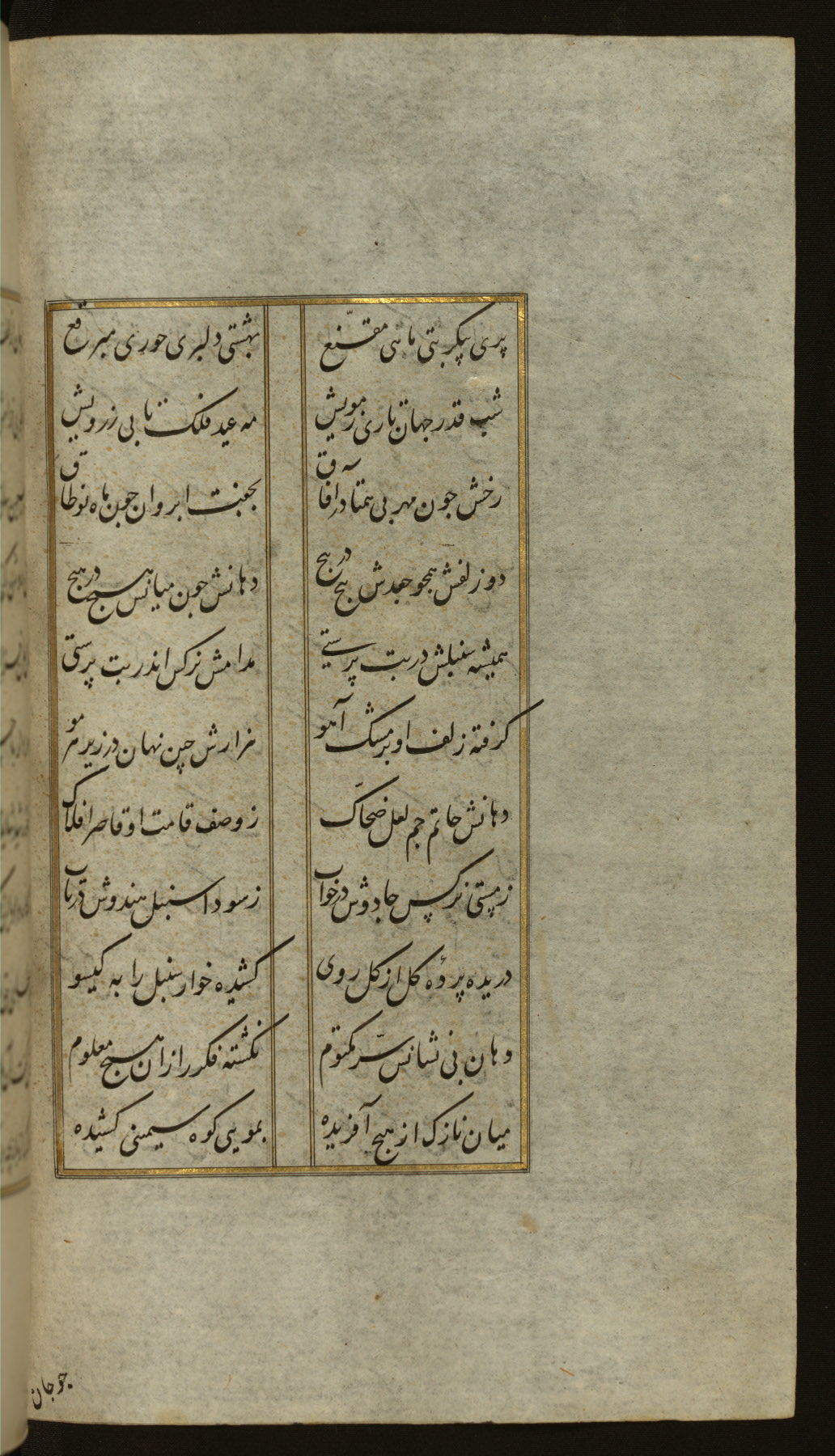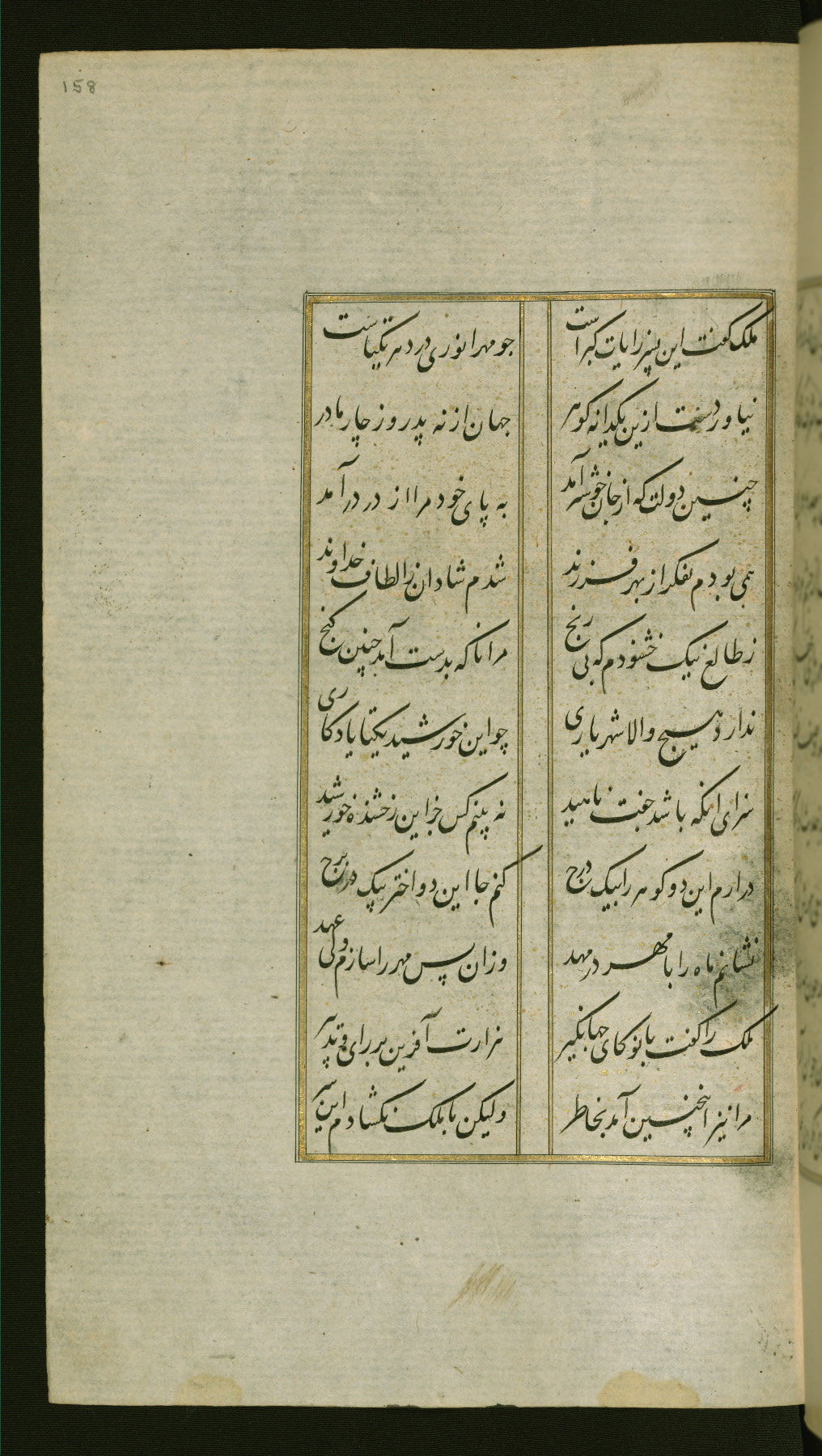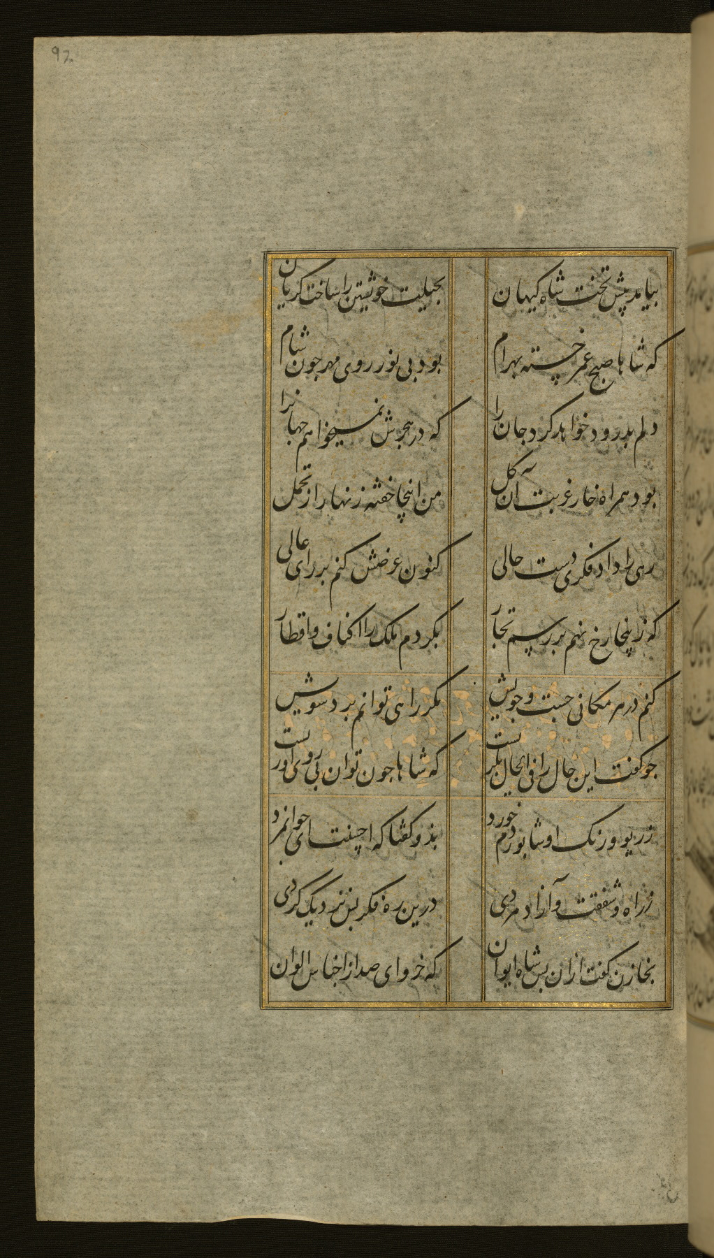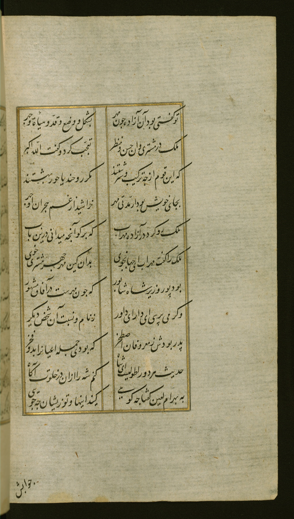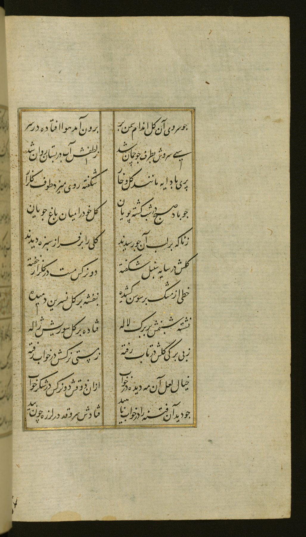 This manuscript is an illustrated copy of the well-known poem recounting the platonic love story between Mihr (the Sun), the son of Shāhpūr, and his vizier's son Mushtarī (Jupiter). The story of 90 chapters was composed by Muḥammad ibn Aḥmad ‘Aṣṣār Tabrīzī (d. 784 AH / 1382 CE). The present copy was written in nasta‘līq script by Murshid al-Kātib in 881 AH / 1476 CE. Considering the number of surviving manuscripts in which this calligrapher’s name is found, it seems he was particularly prolific. The present codex is illustrated with nine paintings. The gold-brushed leather binding with doublures of red leather decorated with filigree work is original to the manuscript.