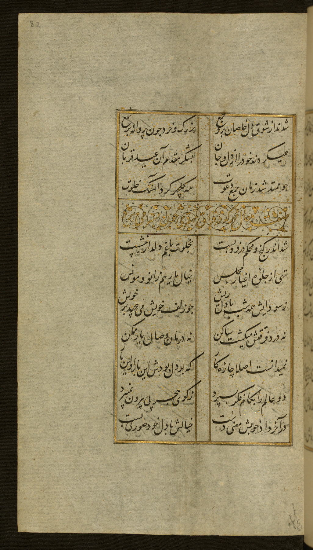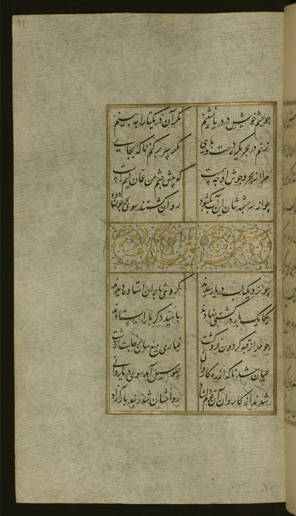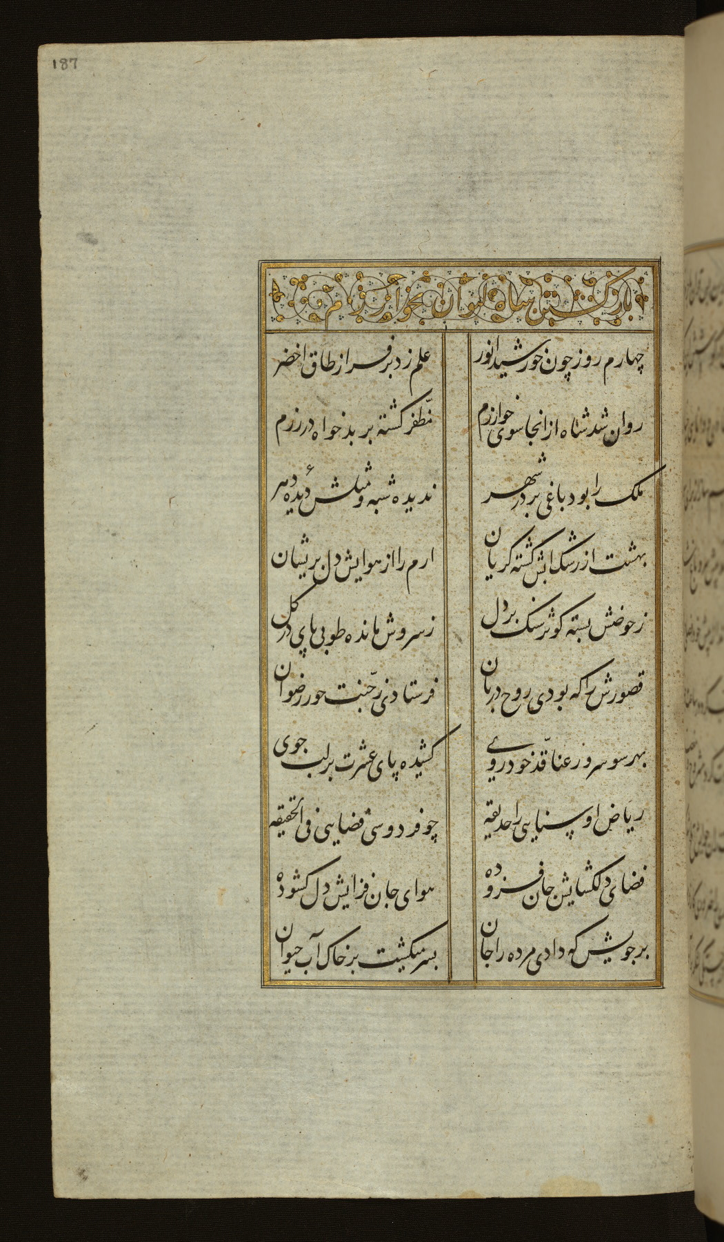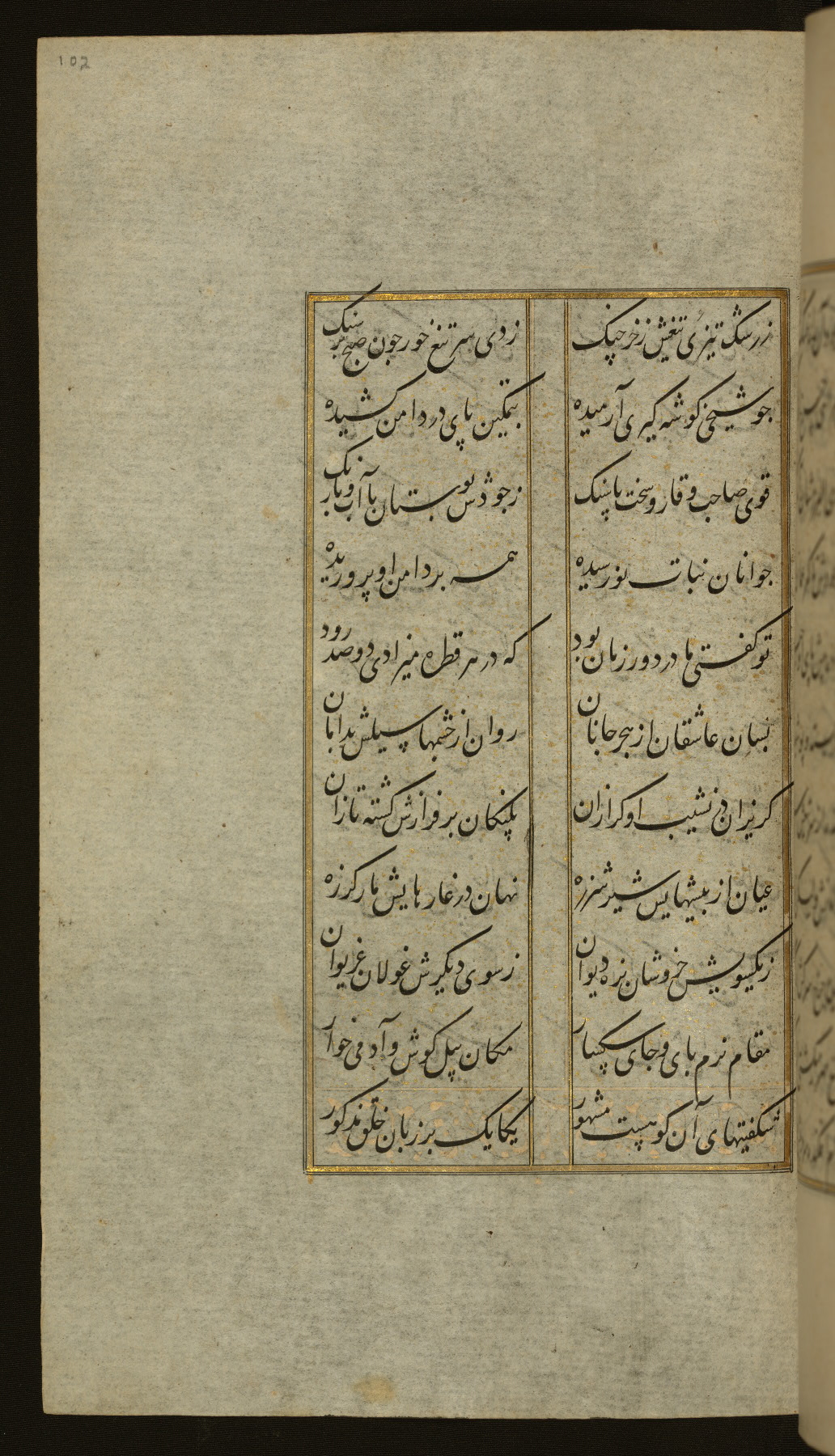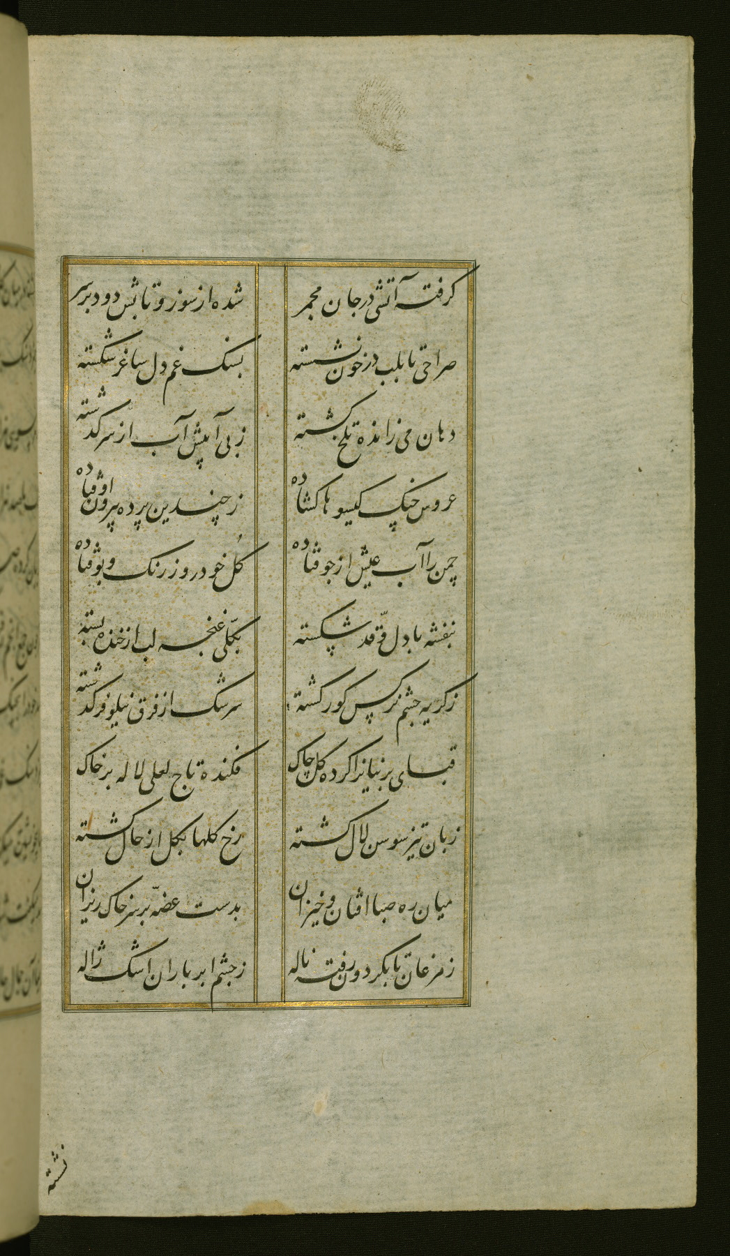 This manuscript is an illustrated copy of the well-known poem recounting the platonic love story between Mihr (the Sun), the son of Shāhpūr, and his vizier's son Mushtarī (Jupiter). The story of 90 chapters was composed by Muḥammad ibn Aḥmad ‘Aṣṣār Tabrīzī (d. 784 AH / 1382 CE). The present copy was written in nasta‘līq script by Murshid al-Kātib in 881 AH / 1476 CE. Considering the number of surviving manuscripts in which this calligrapher’s name is found, it seems he was particularly prolific. The present codex is illustrated with nine paintings. The gold-brushed leather binding with doublures of red leather decorated with filigree work is original to the manuscript.
