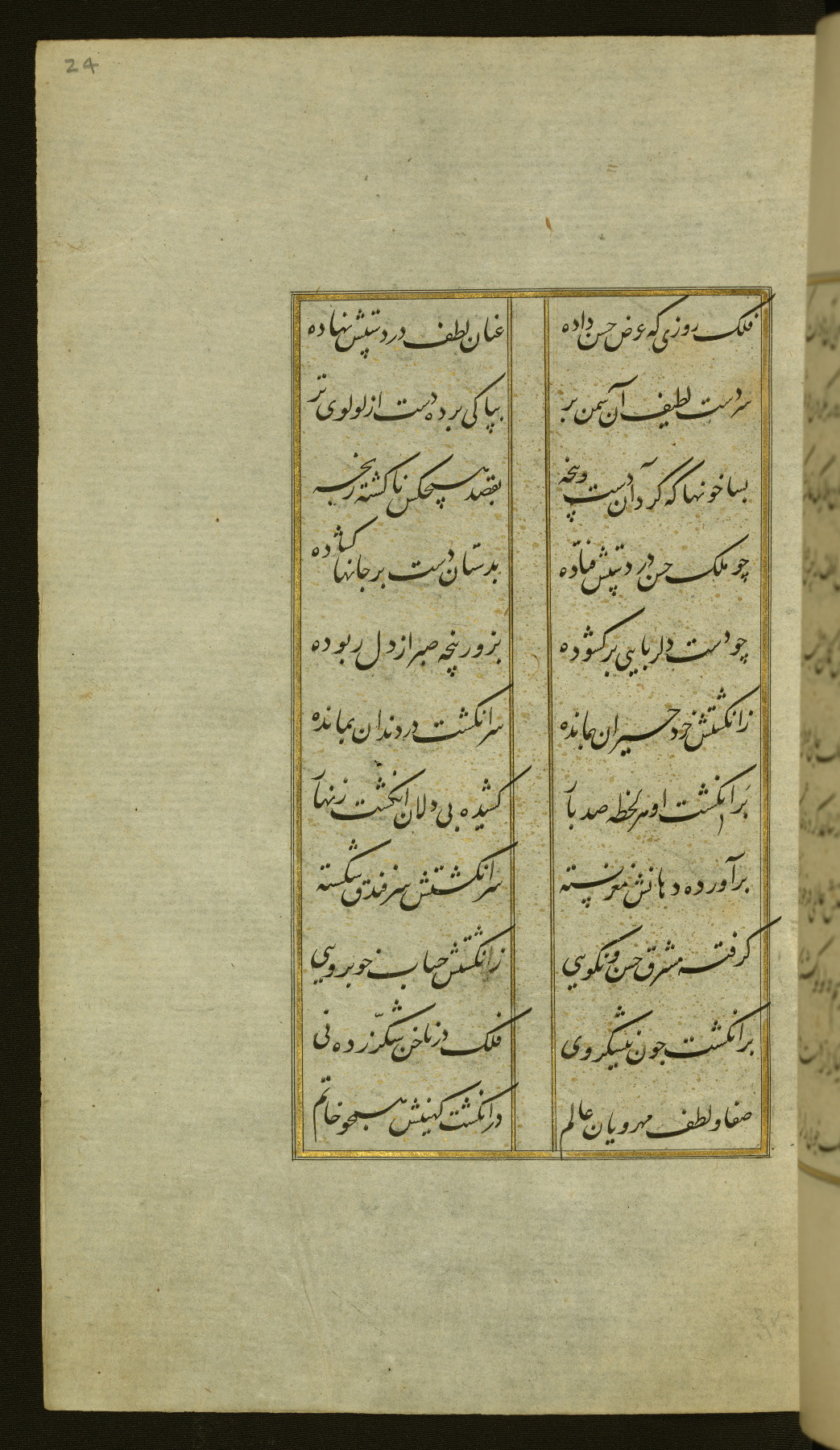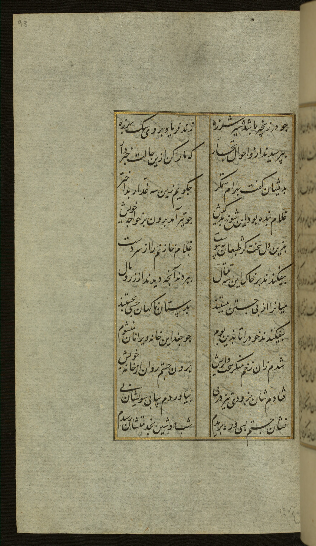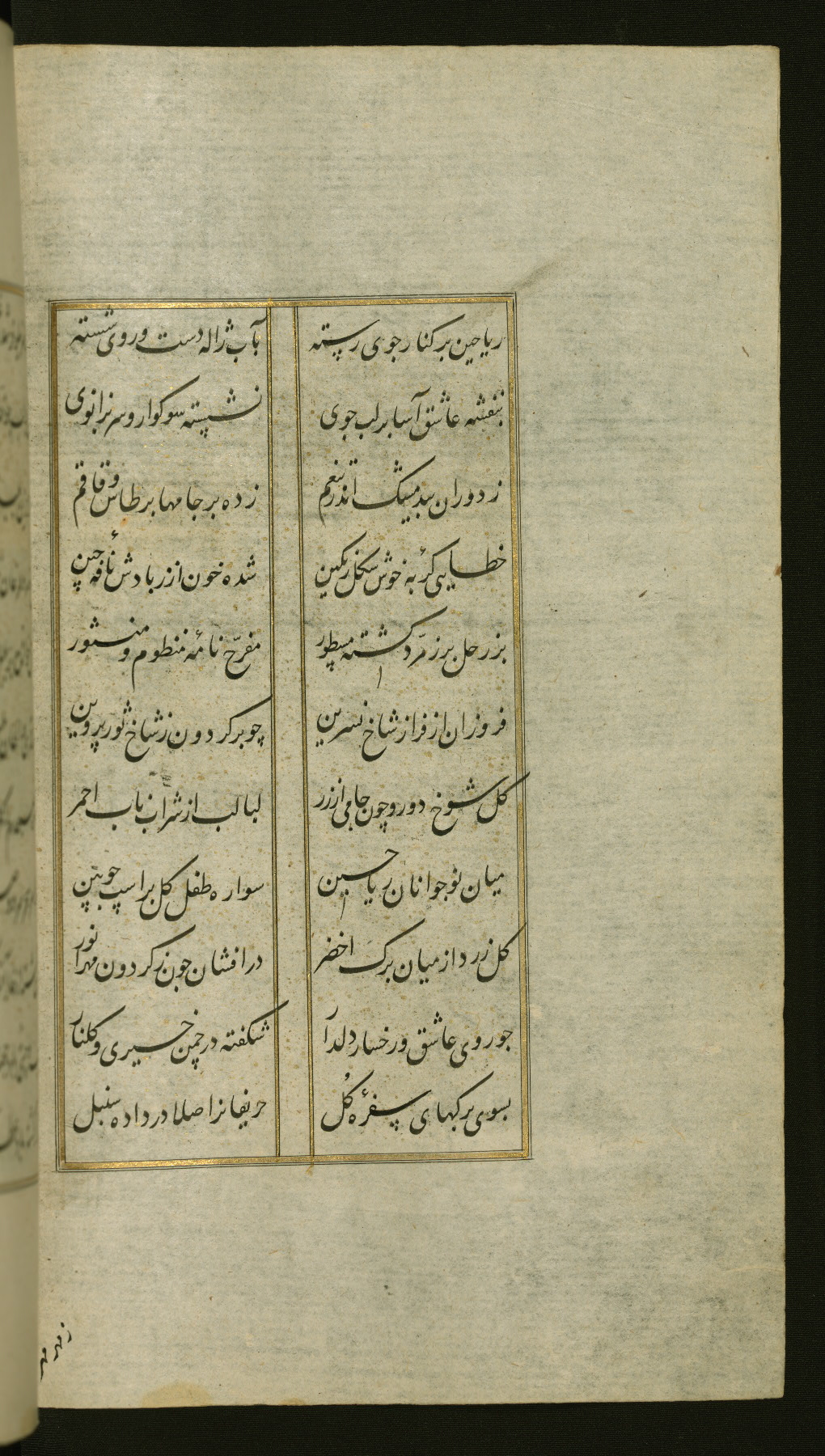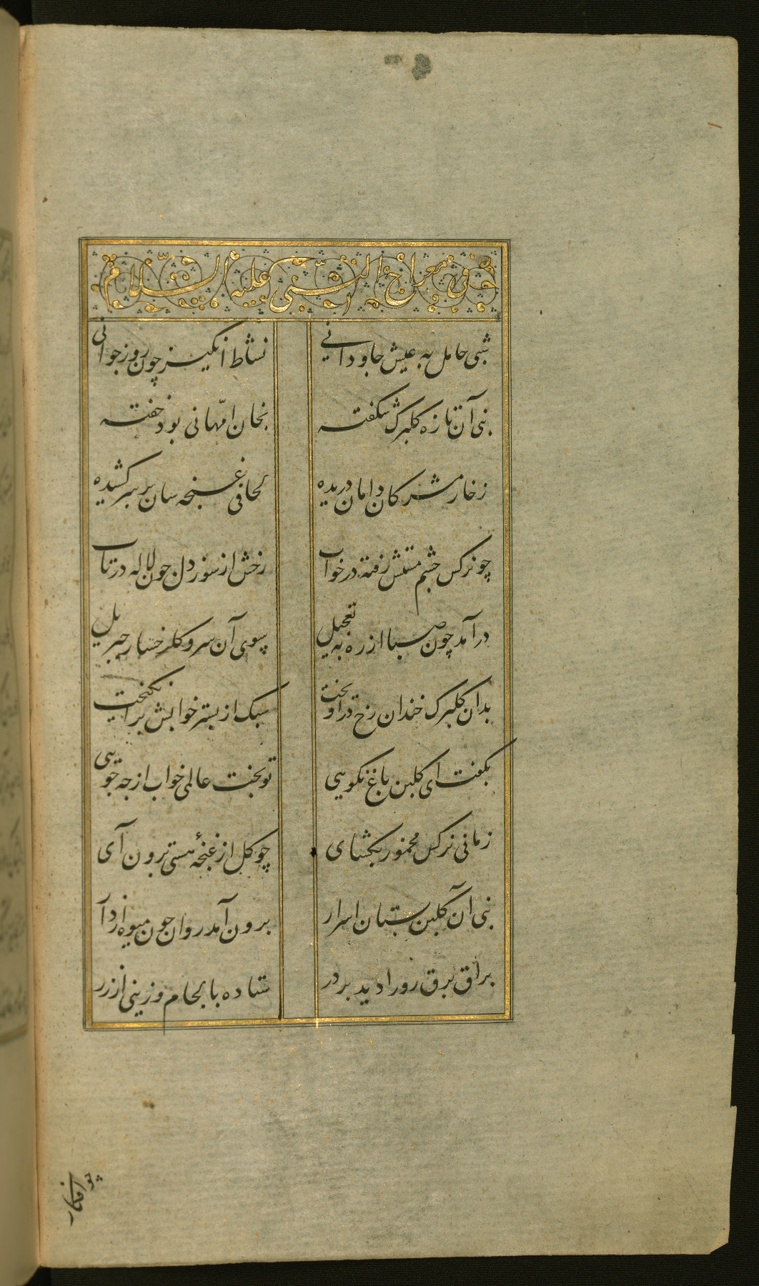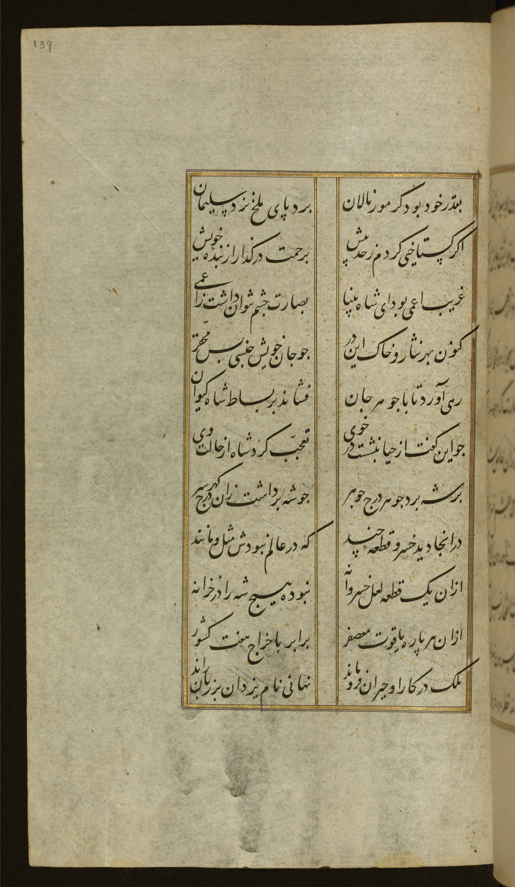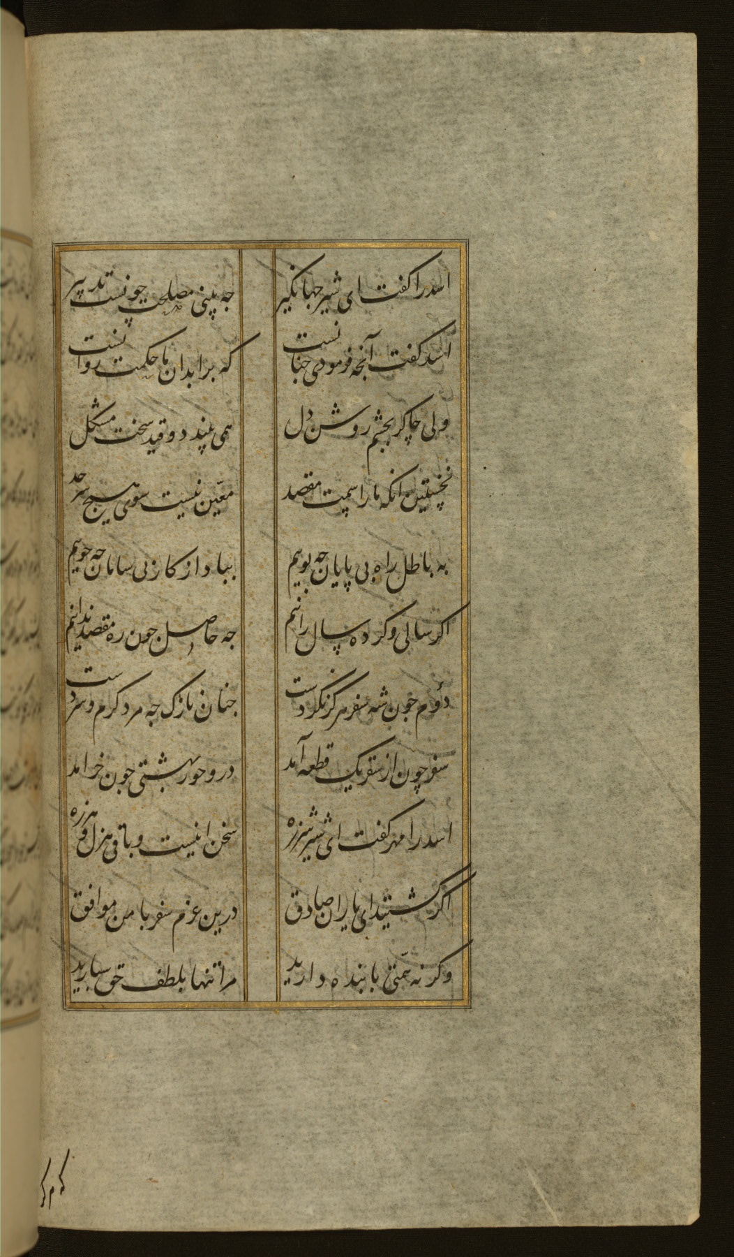 This manuscript is an illustrated copy of the well-known poem recounting the platonic love story between Mihr (the Sun), the son of Shāhpūr, and his vizier's son Mushtarī (Jupiter). The story of 90 chapters was composed by Muḥammad ibn Aḥmad ‘Aṣṣār Tabrīzī (d. 784 AH / 1382 CE). The present copy was written in nasta‘līq script by Murshid al-Kātib in 881 AH / 1476 CE. Considering the number of surviving manuscripts in which this calligrapher’s name is found, it seems he was particularly prolific. The present codex is illustrated with nine paintings. The gold-brushed leather binding with doublures of red leather decorated with filigree work is original to the manuscript.