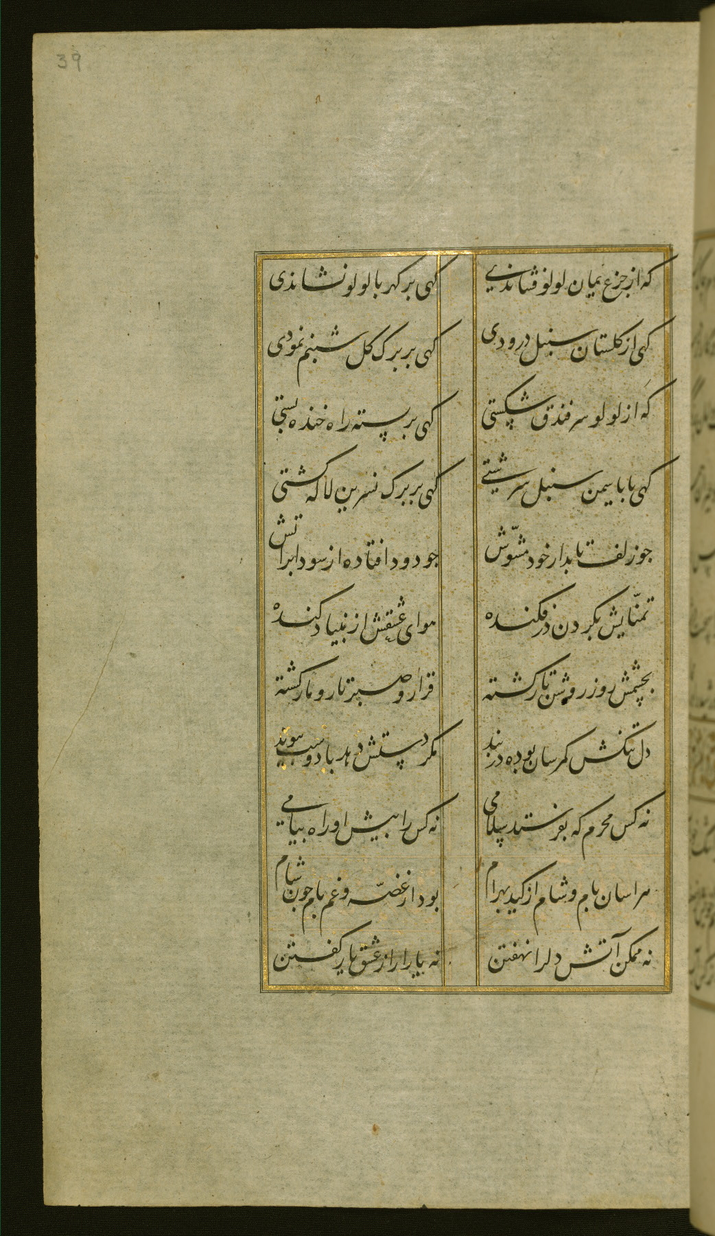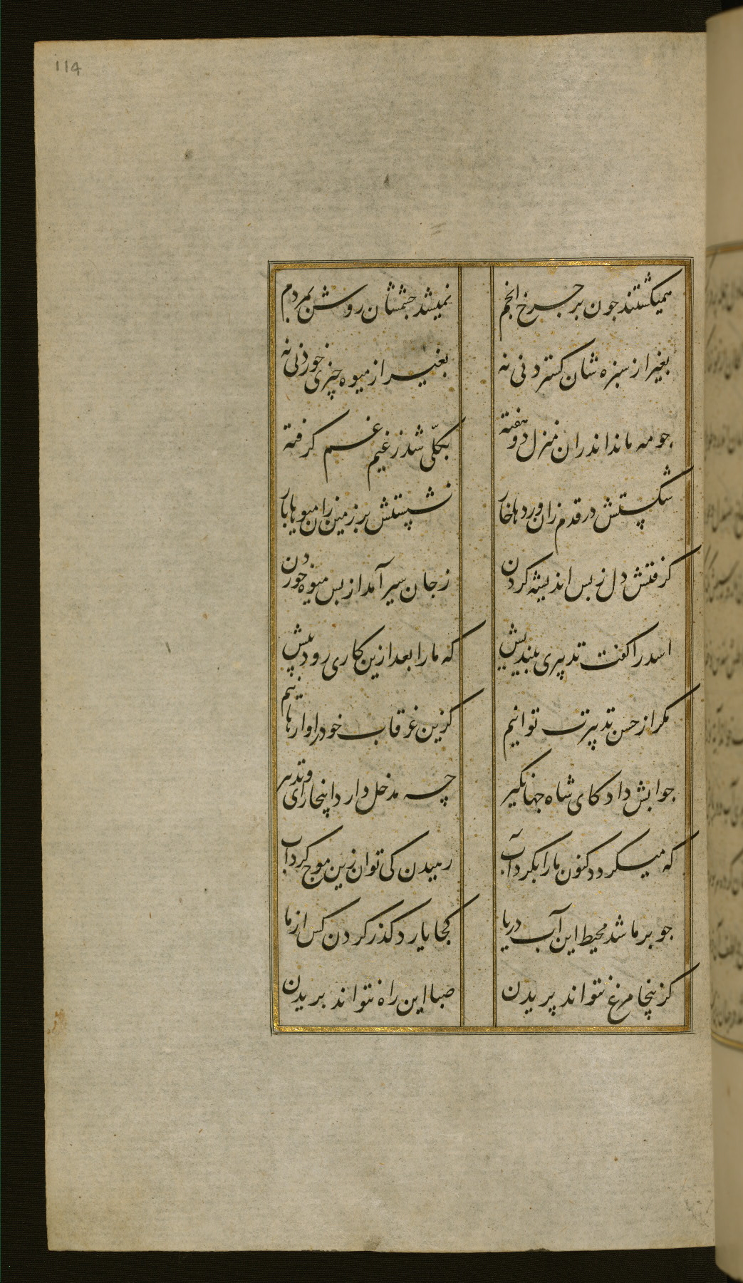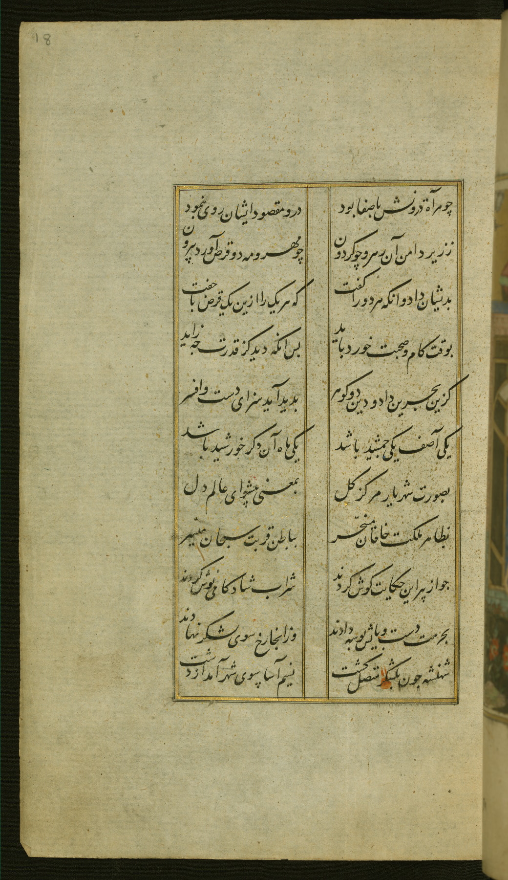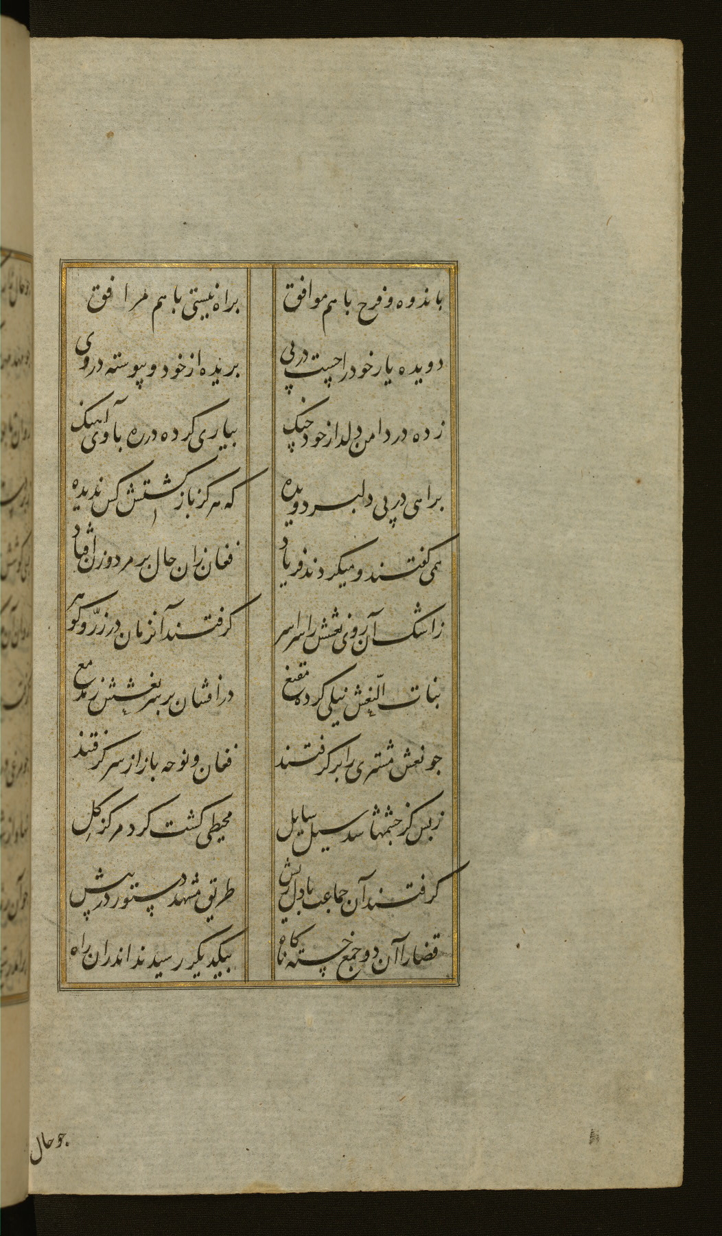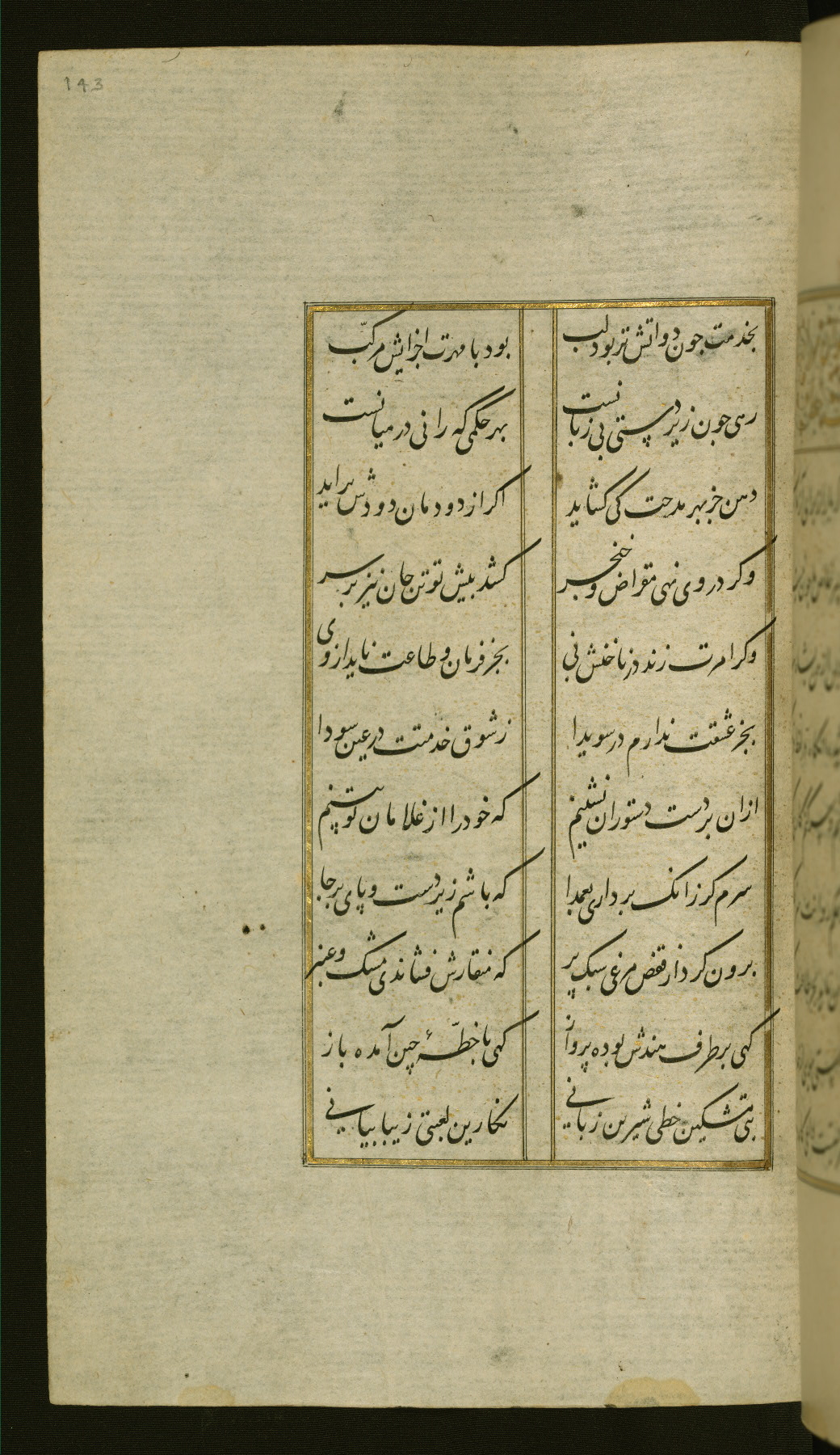 This manuscript is an illustrated copy of the well-known poem recounting the platonic love story between Mihr (the Sun), the son of Shāhpūr, and his vizier's son Mushtarī (Jupiter). The story of 90 chapters was composed by Muḥammad ibn Aḥmad ‘Aṣṣār Tabrīzī (d. 784 AH / 1382 CE). The present copy was written in nasta‘līq script by Murshid al-Kātib in 881 AH / 1476 CE. Considering the number of surviving manuscripts in which this calligrapher’s name is found, it seems he was particularly prolific. The present codex is illustrated with nine paintings. The gold-brushed leather binding with doublures of red leather decorated with filigree work is original to the manuscript.