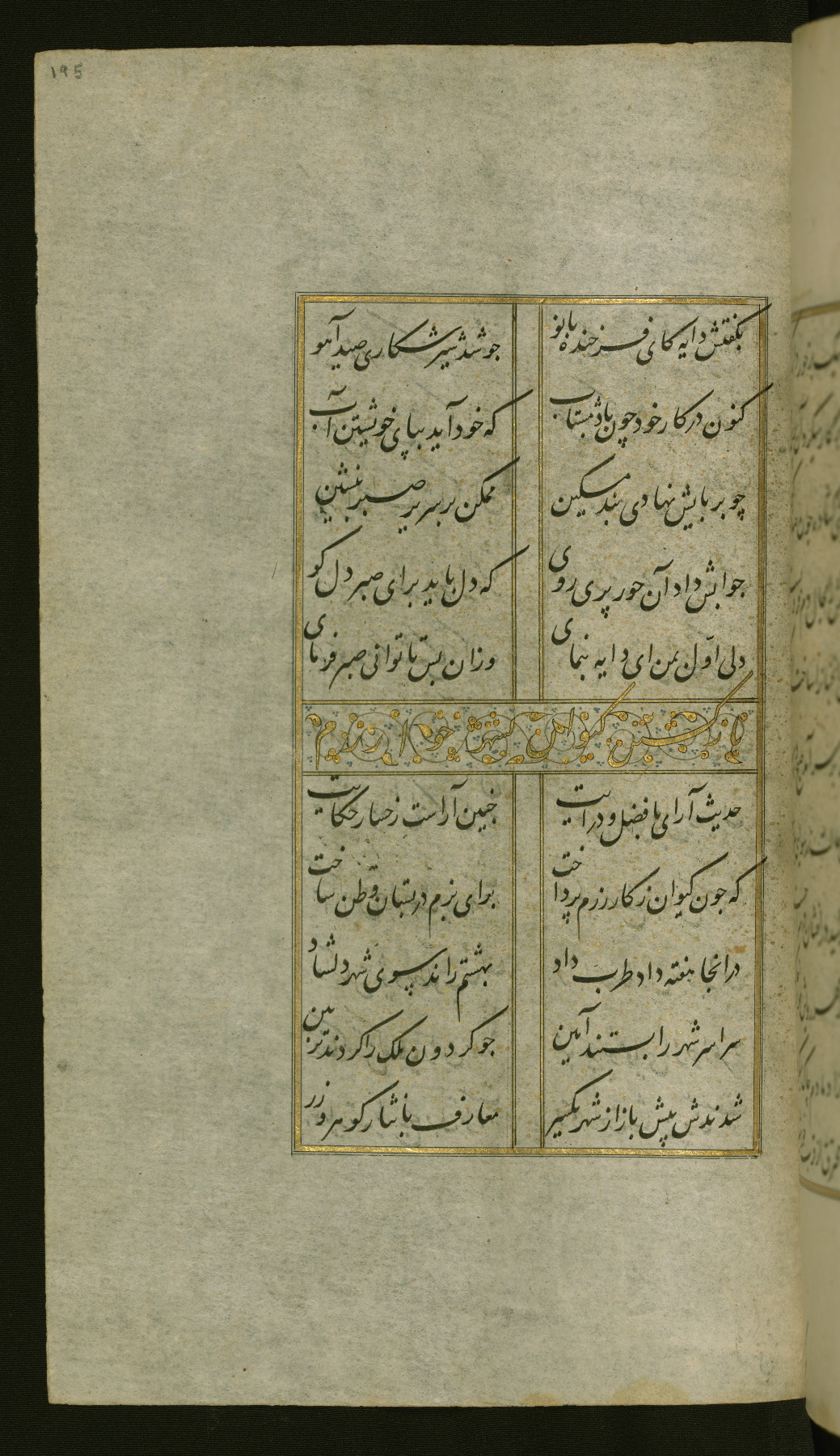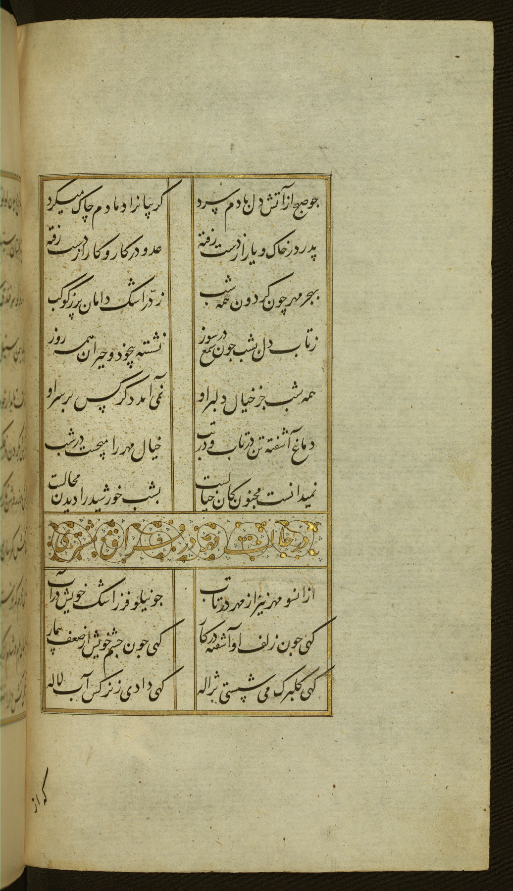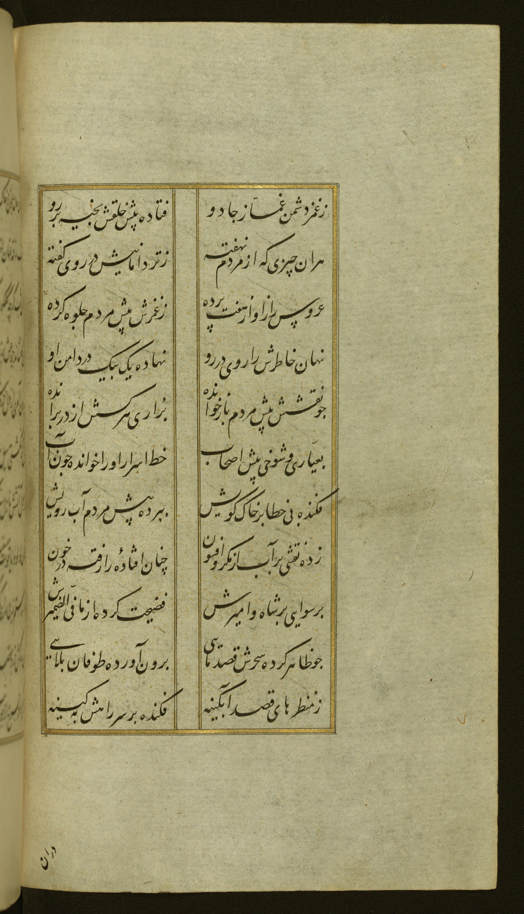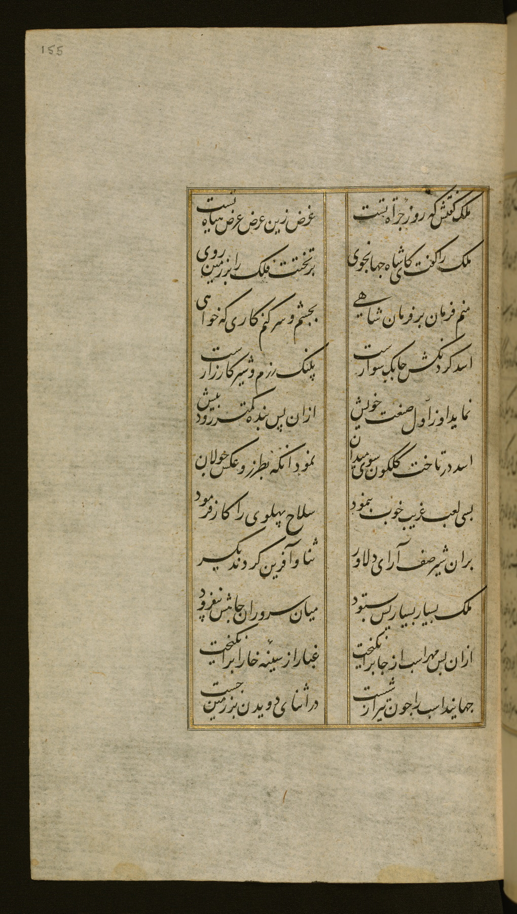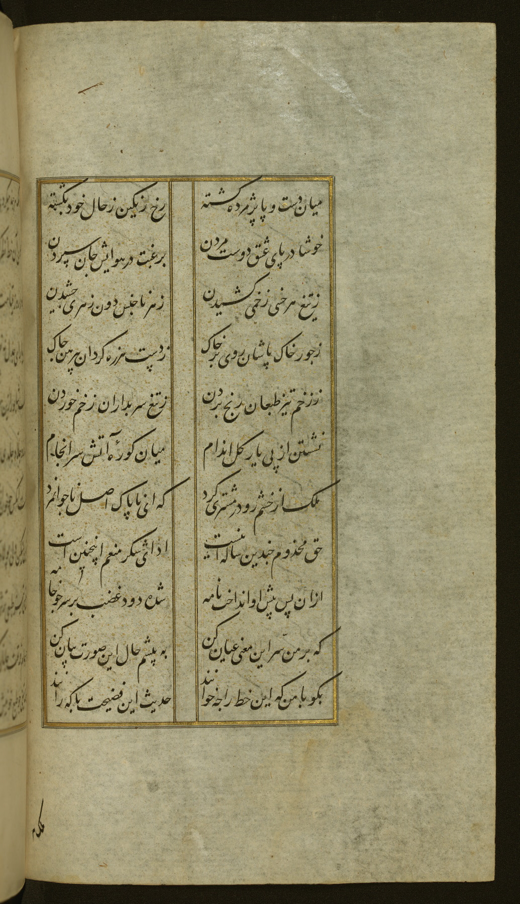 This manuscript is an illustrated copy of the well-known poem recounting the platonic love story between Mihr (the Sun), the son of Shāhpūr, and his vizier's son Mushtarī (Jupiter). The story of 90 chapters was composed by Muḥammad ibn Aḥmad ‘Aṣṣār Tabrīzī (d. 784 AH / 1382 CE). The present copy was written in nasta‘līq script by Murshid al-Kātib in 881 AH / 1476 CE. Considering the number of surviving manuscripts in which this calligrapher’s name is found, it seems he was particularly prolific. The present codex is illustrated with nine paintings. The gold-brushed leather binding with doublures of red leather decorated with filigree work is original to the manuscript.