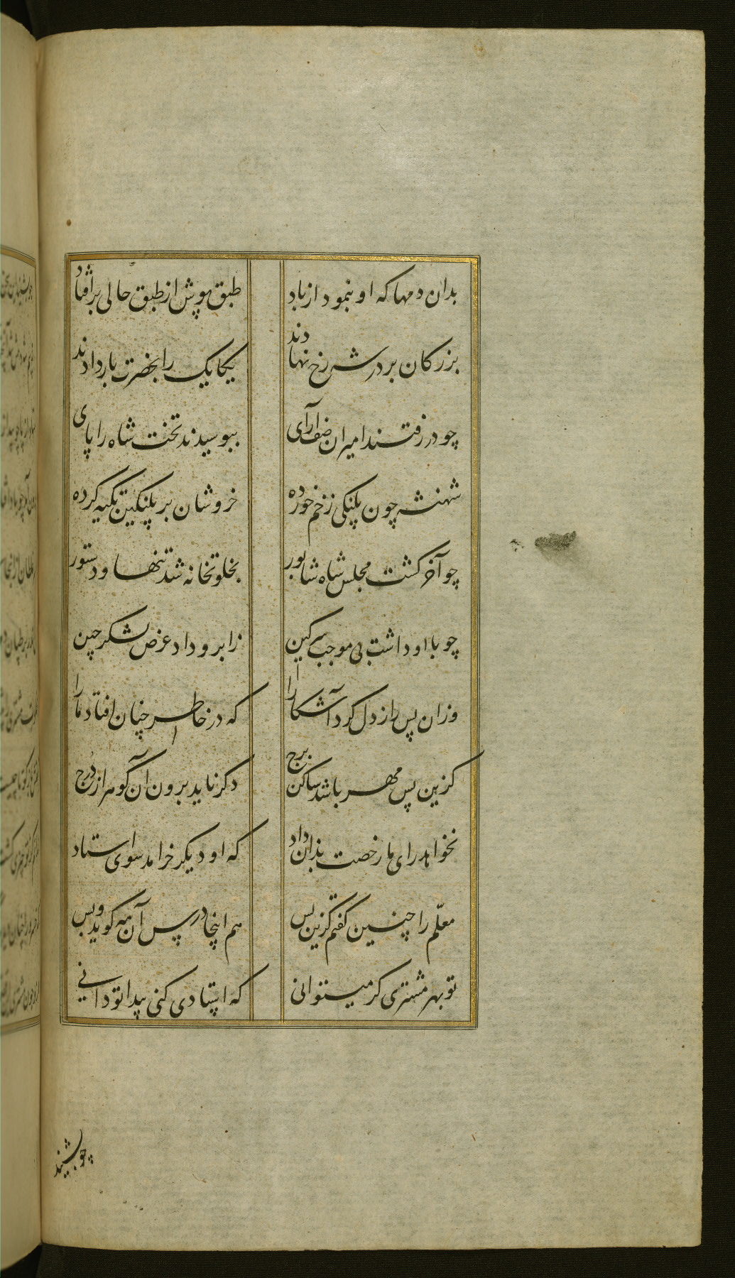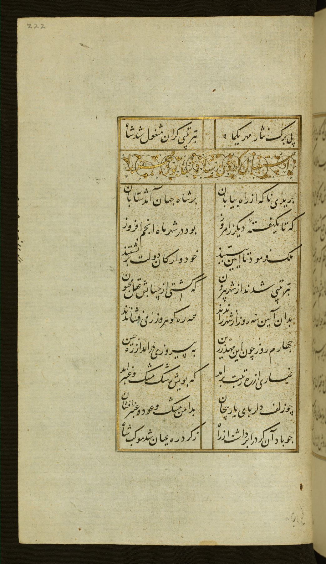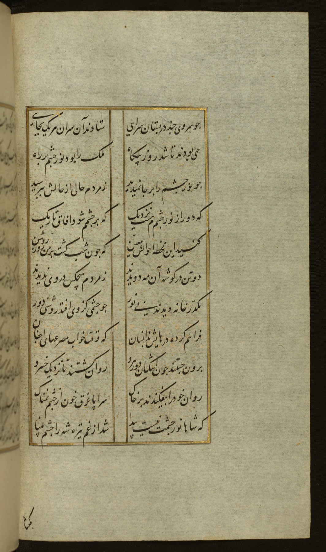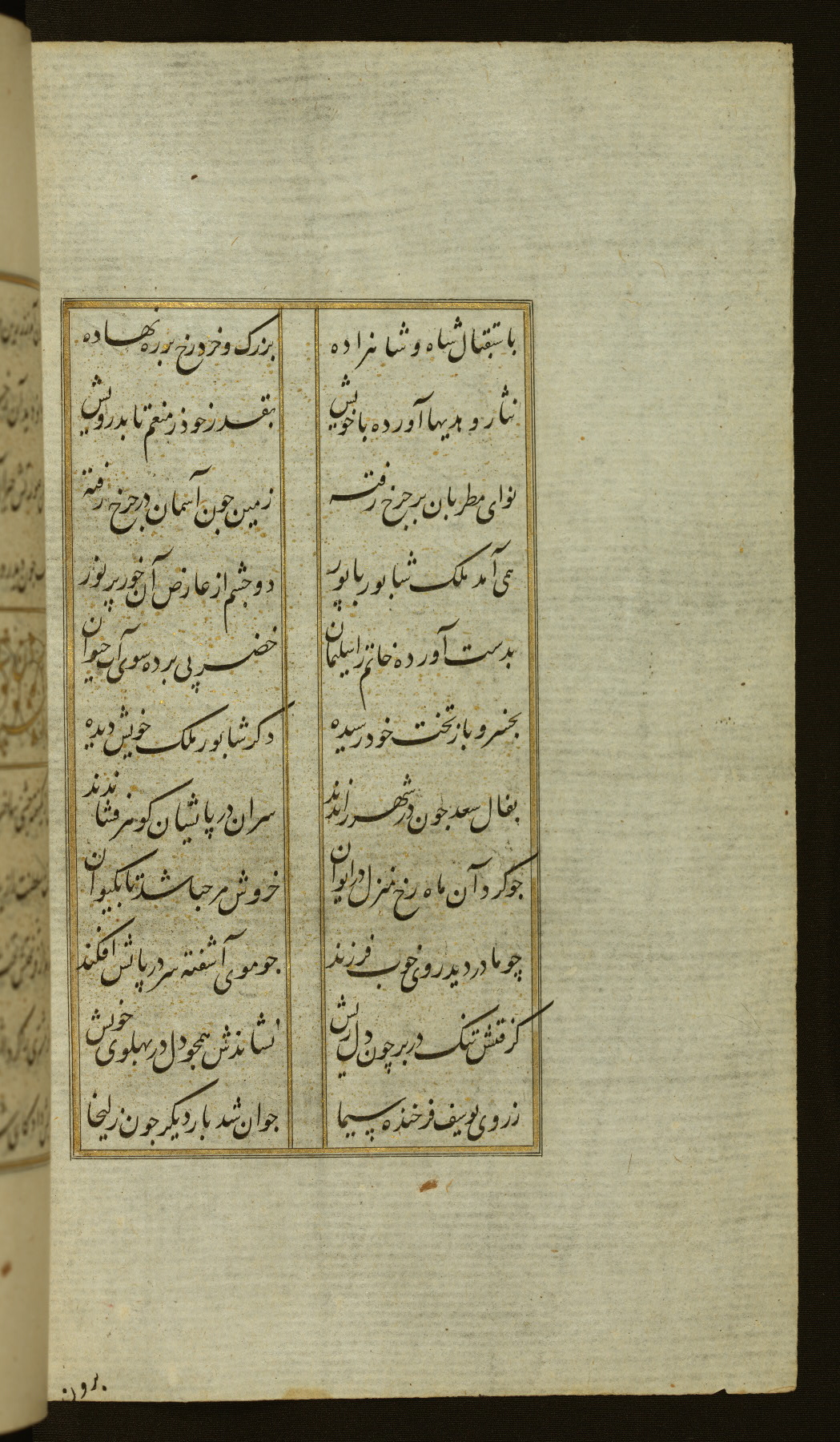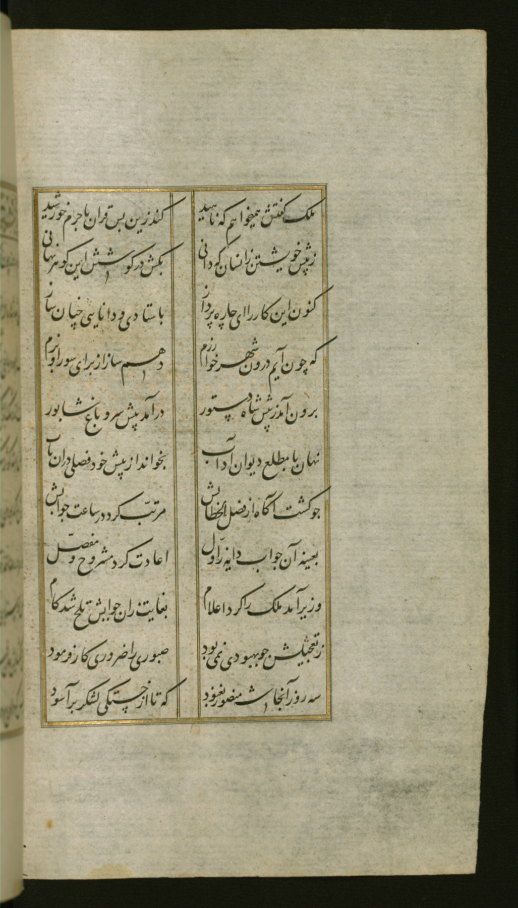This manuscript is an illustrated copy of the well-known poem recounting the platonic love story between Mihr (the Sun), the son of Shāhpūr, and his vizier's son Mushtarī (Jupiter). The story of 90 chapters was composed by Muḥammad ibn Aḥmad ‘Aṣṣār Tabrīzī (d. 784 AH / 1382 CE). The present copy was written in nasta‘līq script by Murshid al-Kātib in 881 AH / 1476 CE. Considering the number of surviving manuscripts in which this calligrapher’s name is found, it seems he was particularly prolific. The present codex is illustrated with nine paintings. The gold-brushed leather binding with doublures of red leather decorated with filigree work is original to the manuscript.