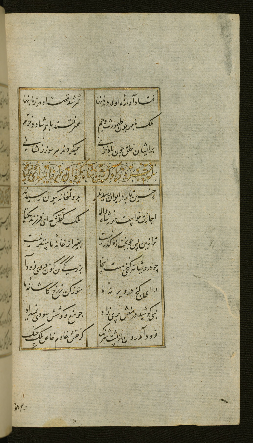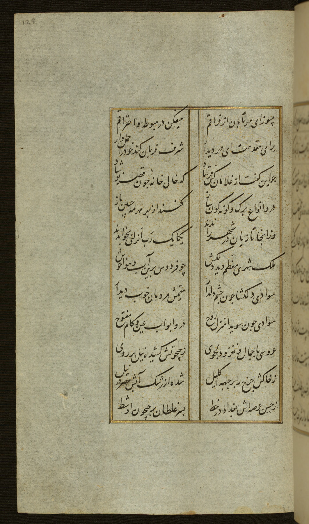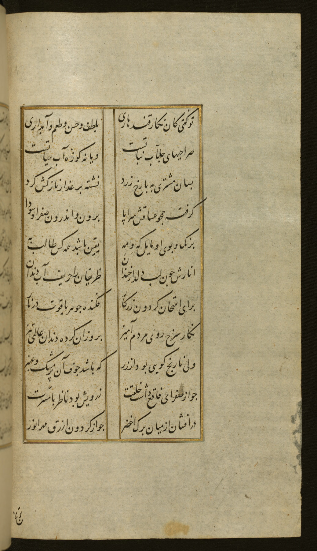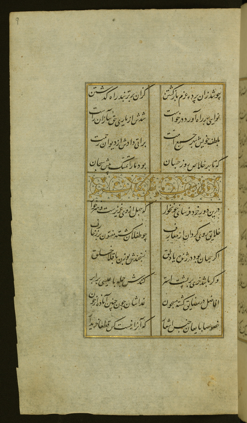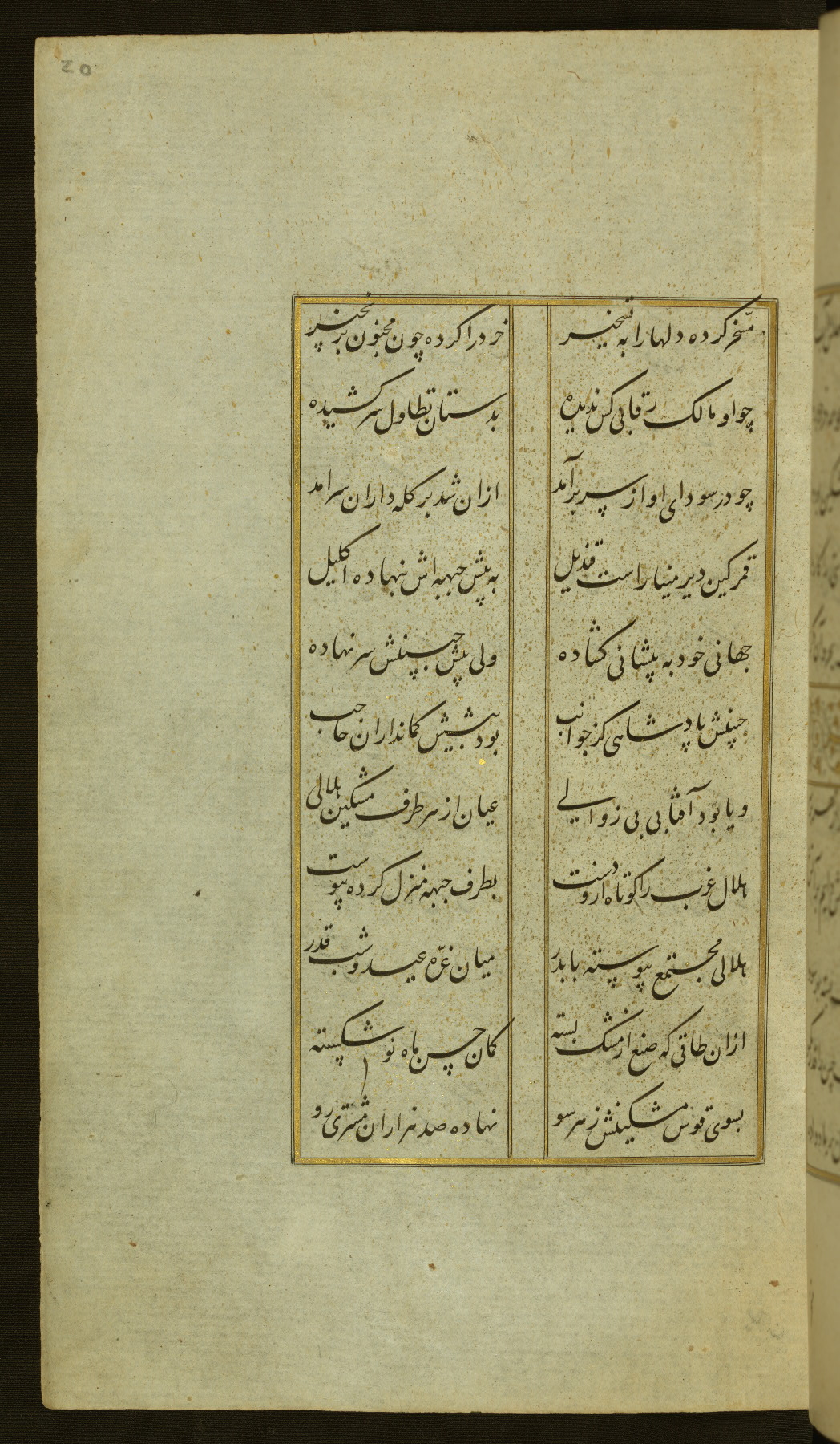This manuscript is an illustrated copy of the well-known poem recounting the platonic love story between Mihr (the Sun), the son of Shāhpūr, and his vizier's son Mushtarī (Jupiter). The story of 90 chapters was composed by Muḥammad ibn Aḥmad ‘Aṣṣār Tabrīzī (d. 784 AH / 1382 CE). The present copy was written in nasta‘līq script by Murshid al-Kātib in 881 AH / 1476 CE. Considering the number of surviving manuscripts in which this calligrapher’s name is found, it seems he was particularly prolific. The present codex is illustrated with nine paintings. The gold-brushed leather binding with doublures of red leather decorated with filigree work is original to the manuscript.