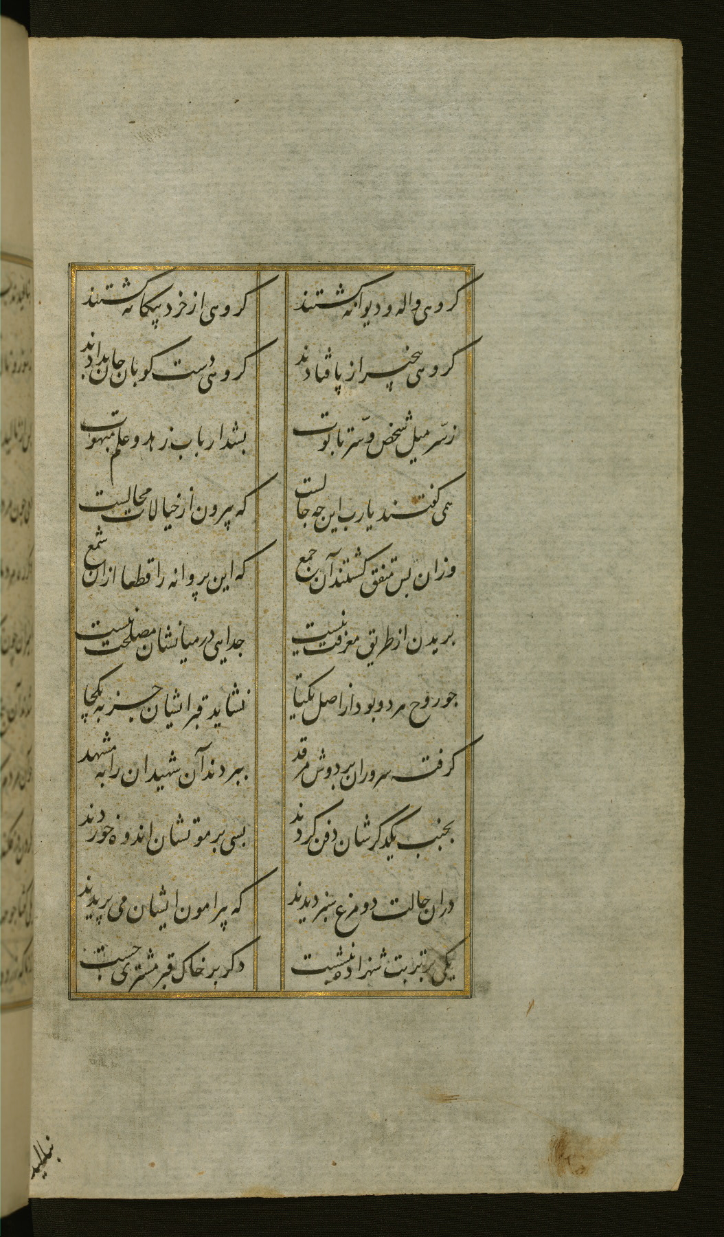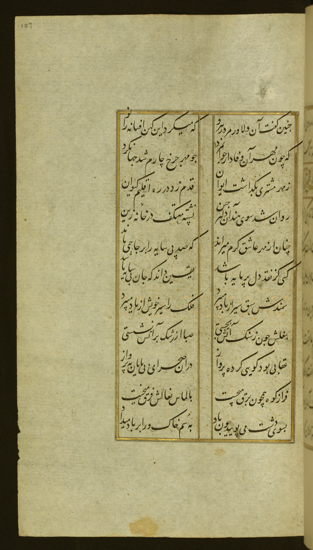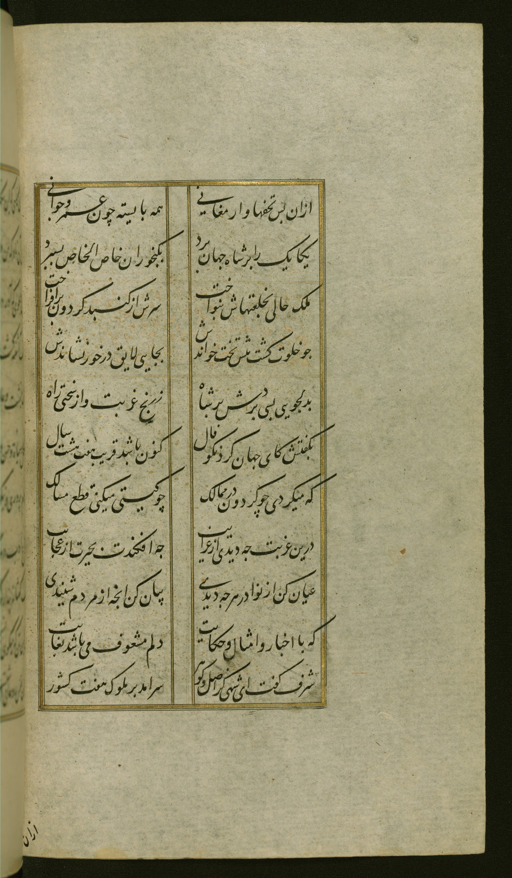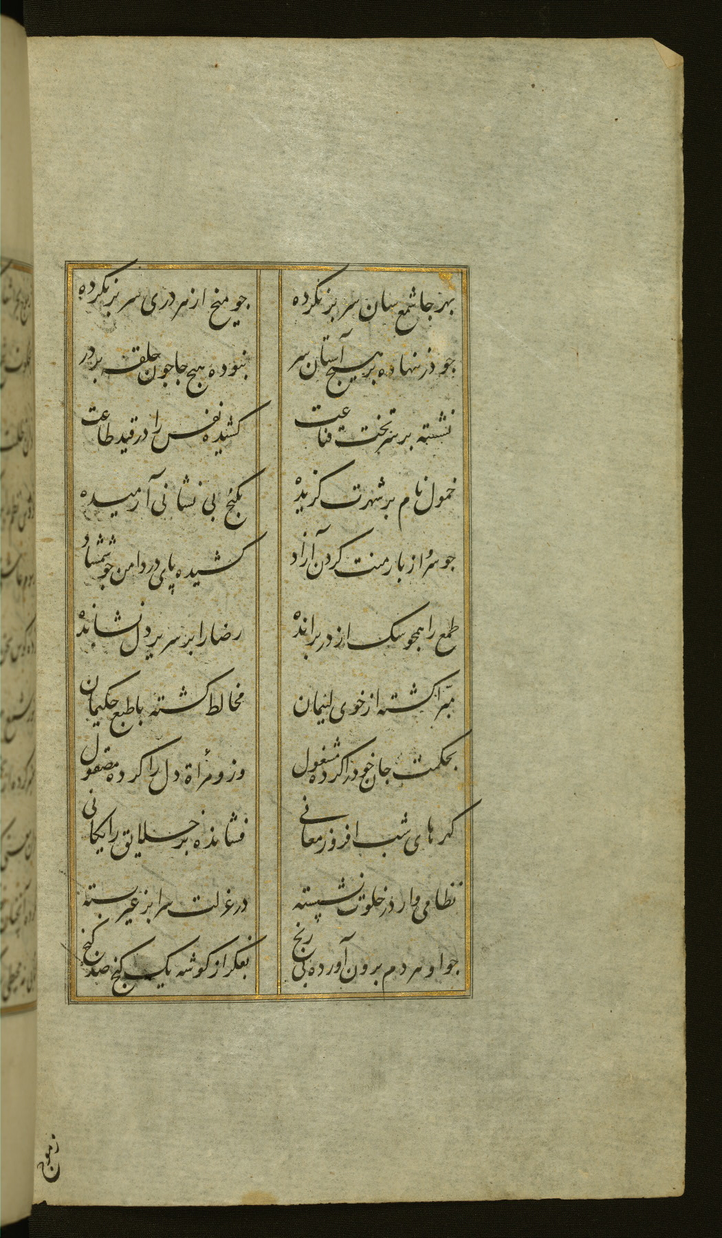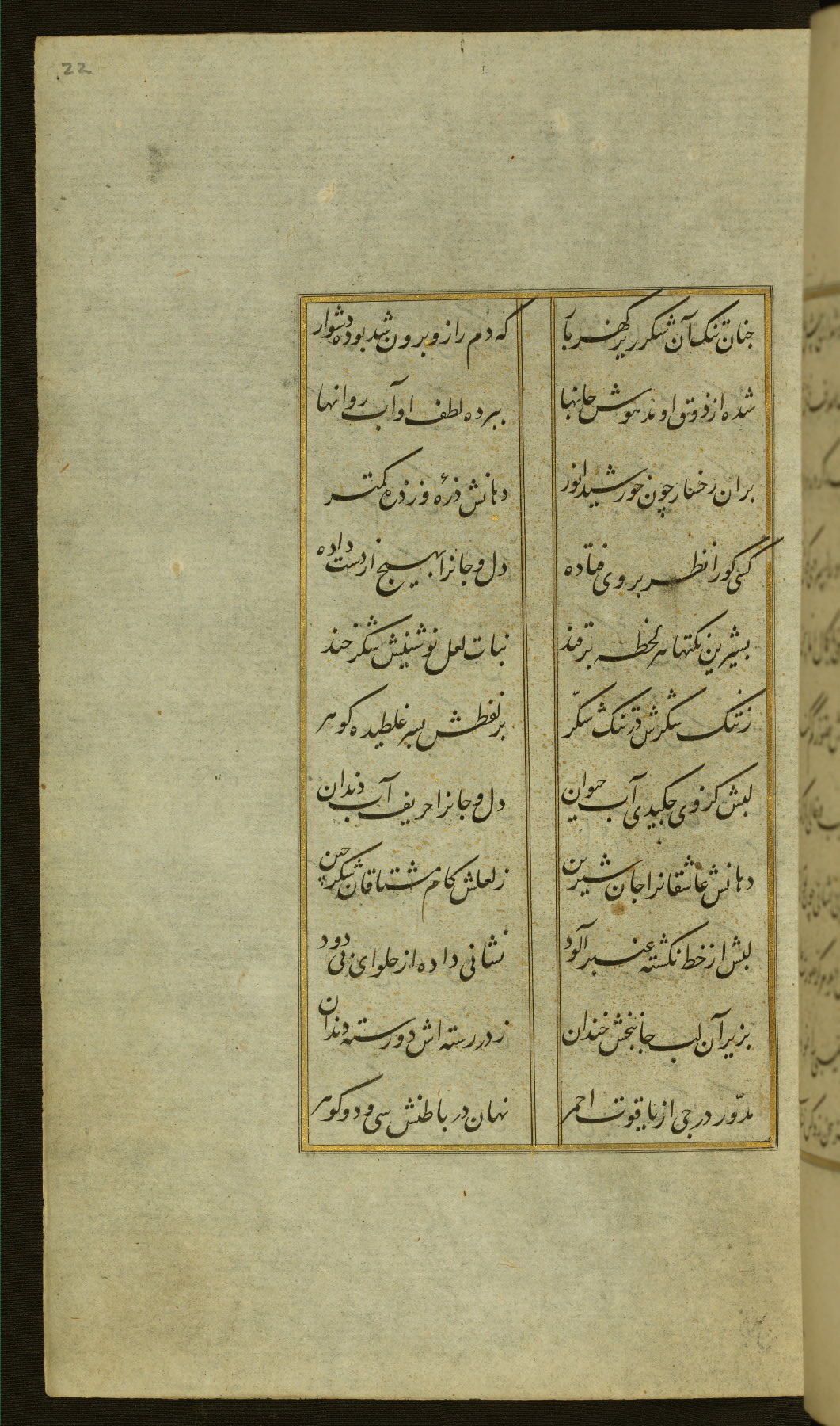 This manuscript is an illustrated copy of the well-known poem recounting the platonic love story between Mihr (the Sun), the son of Shāhpūr, and his vizier's son Mushtarī (Jupiter). The story of 90 chapters was composed by Muḥammad ibn Aḥmad ‘Aṣṣār Tabrīzī (d. 784 AH / 1382 CE). The present copy was written in nasta‘līq script by Murshid al-Kātib in 881 AH / 1476 CE. Considering the number of surviving manuscripts in which this calligrapher’s name is found, it seems he was particularly prolific. The present codex is illustrated with nine paintings. The gold-brushed leather binding with doublures of red leather decorated with filigree work is original to the manuscript.