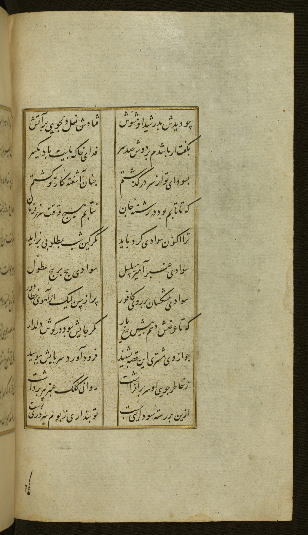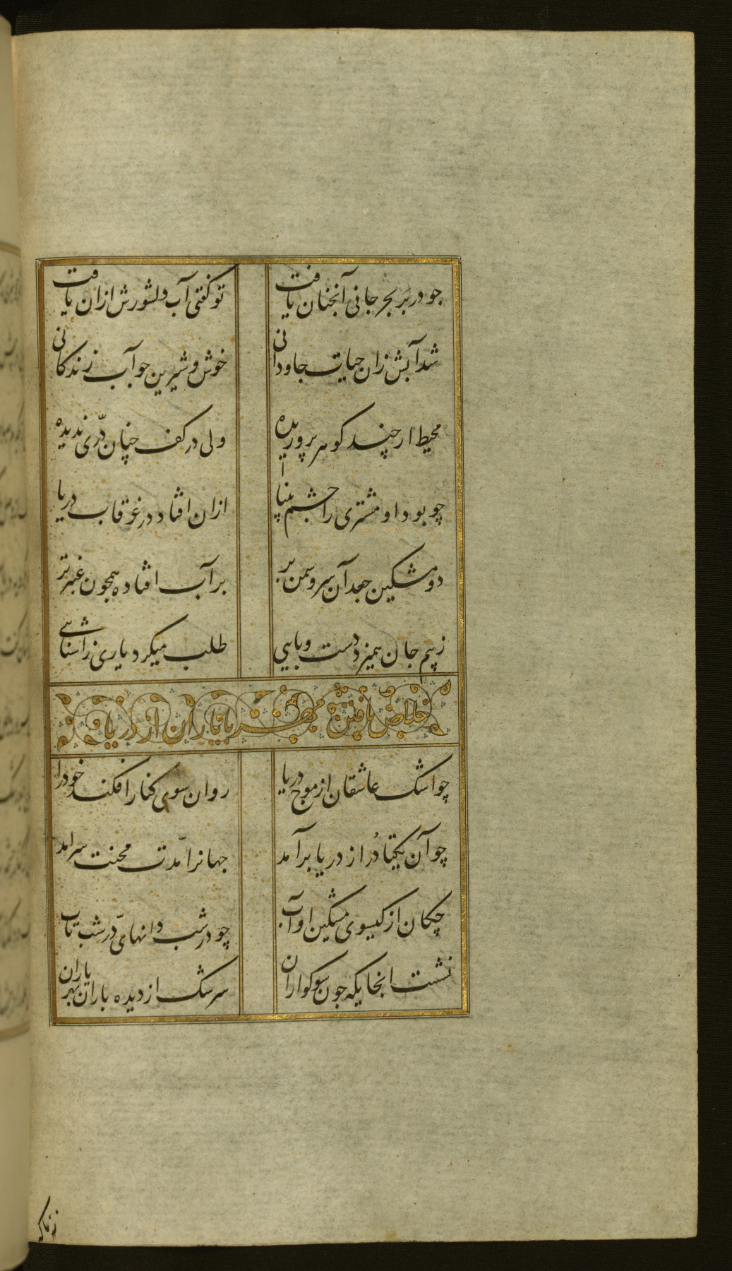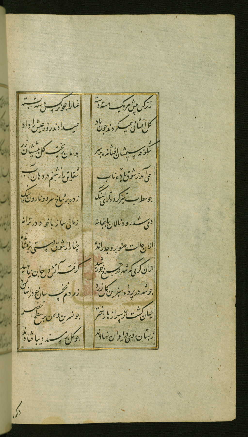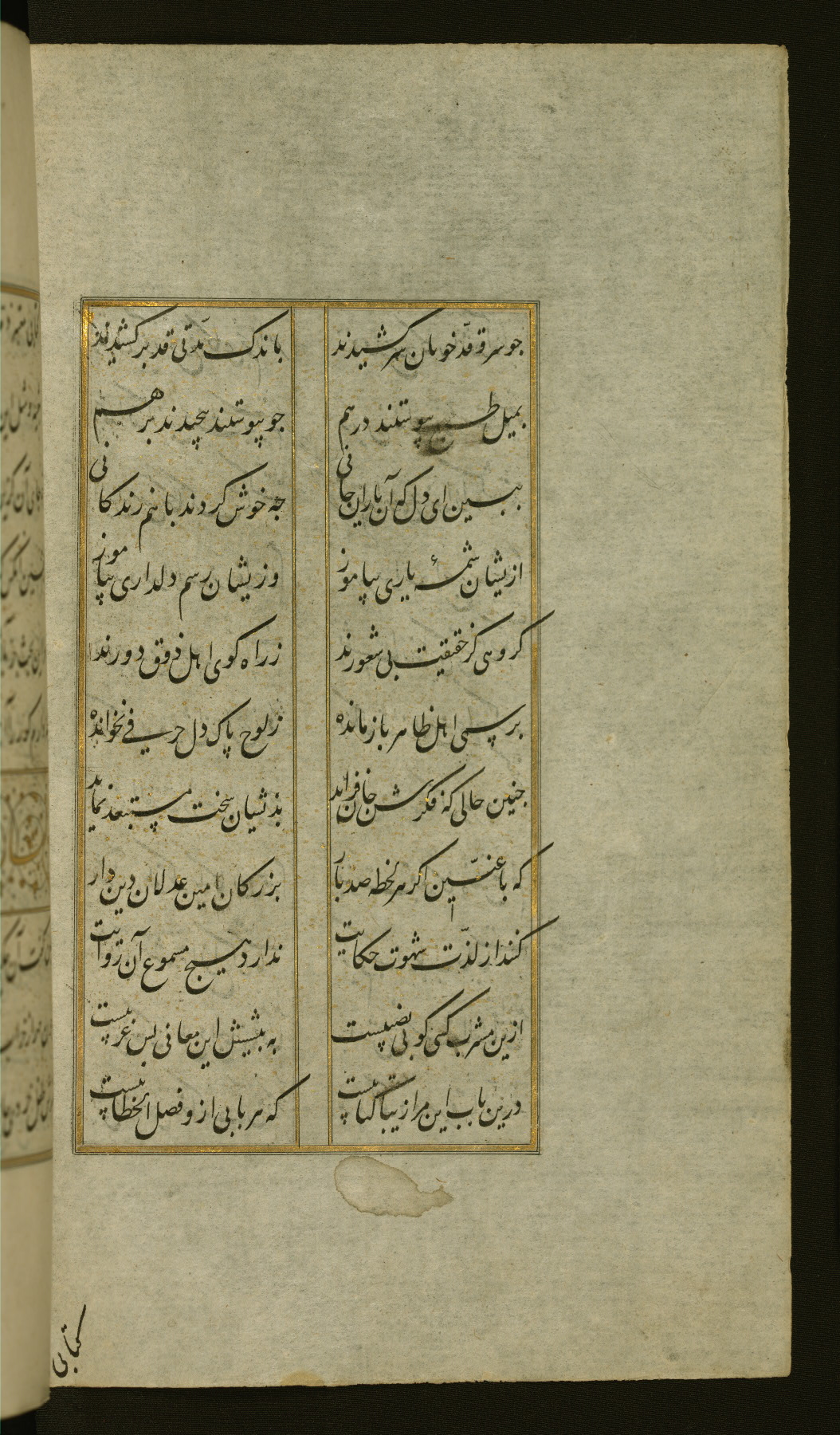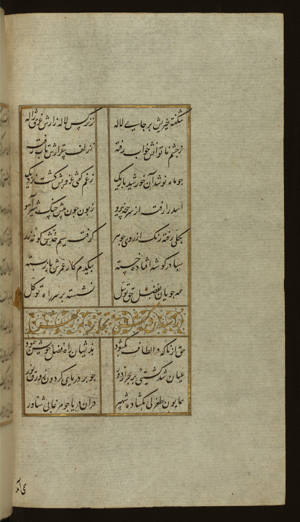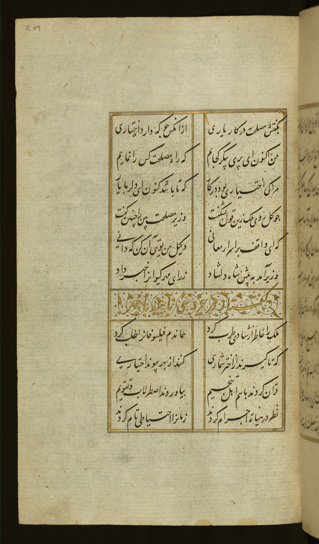 This manuscript is an illustrated copy of the well-known poem recounting the platonic love story between Mihr (the Sun), the son of Shāhpūr, and his vizier's son Mushtarī (Jupiter). The story of 90 chapters was composed by Muḥammad ibn Aḥmad ‘Aṣṣār Tabrīzī (d. 784 AH / 1382 CE). The present copy was written in nasta‘līq script by Murshid al-Kātib in 881 AH / 1476 CE. Considering the number of surviving manuscripts in which this calligrapher’s name is found, it seems he was particularly prolific. The present codex is illustrated with nine paintings. The gold-brushed leather binding with doublures of red leather decorated with filigree work is original to the manuscript.