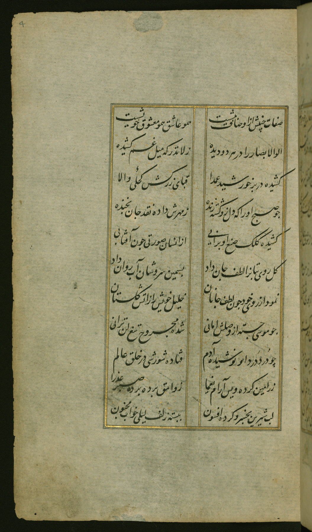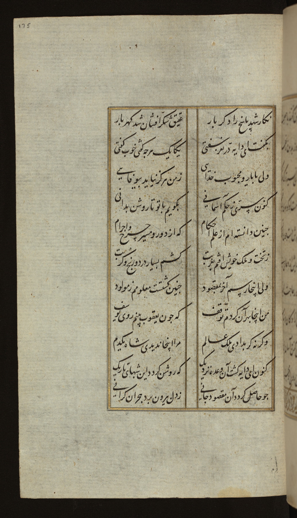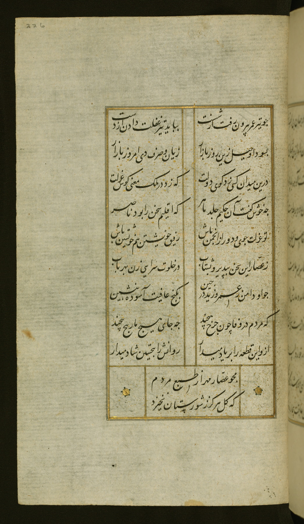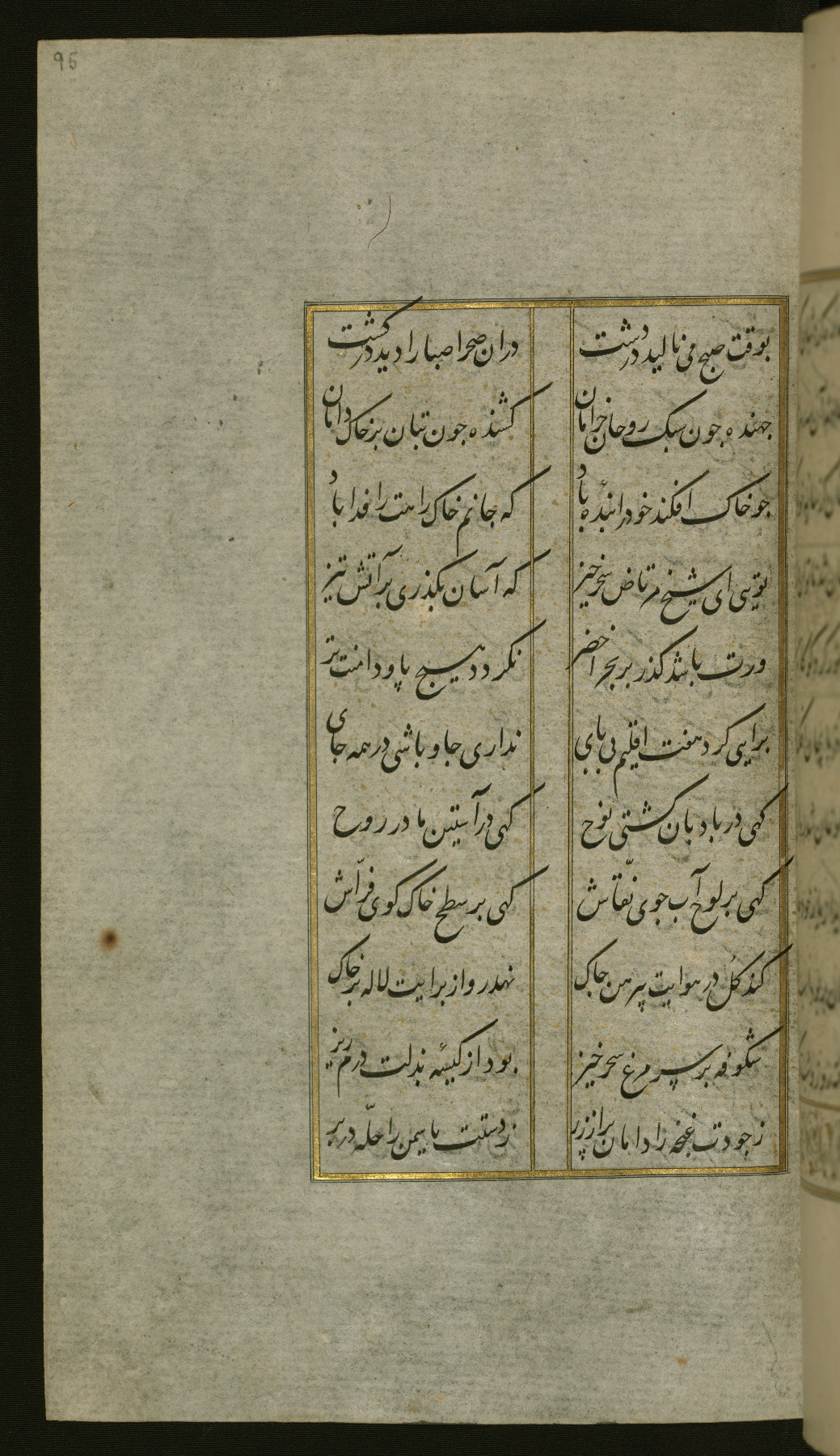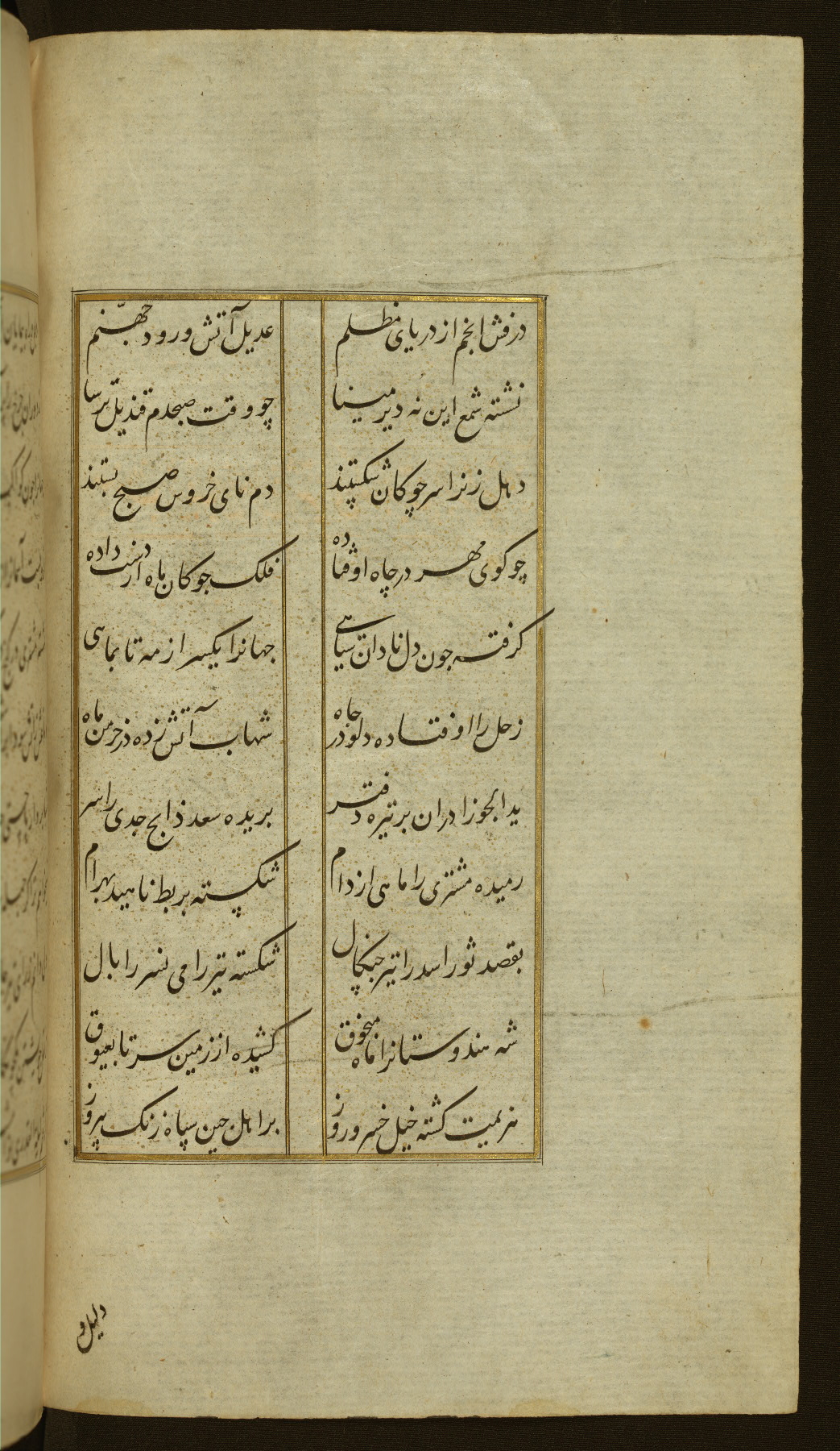 This manuscript is an illustrated copy of the well-known poem recounting the platonic love story between Mihr (the Sun), the son of Shāhpūr, and his vizier's son Mushtarī (Jupiter). The story of 90 chapters was composed by Muḥammad ibn Aḥmad ‘Aṣṣār Tabrīzī (d. 784 AH / 1382 CE). The present copy was written in nasta‘līq script by Murshid al-Kātib in 881 AH / 1476 CE. Considering the number of surviving manuscripts in which this calligrapher’s name is found, it seems he was particularly prolific. The present codex is illustrated with nine paintings. The gold-brushed leather binding with doublures of red leather decorated with filigree work is original to the manuscript.