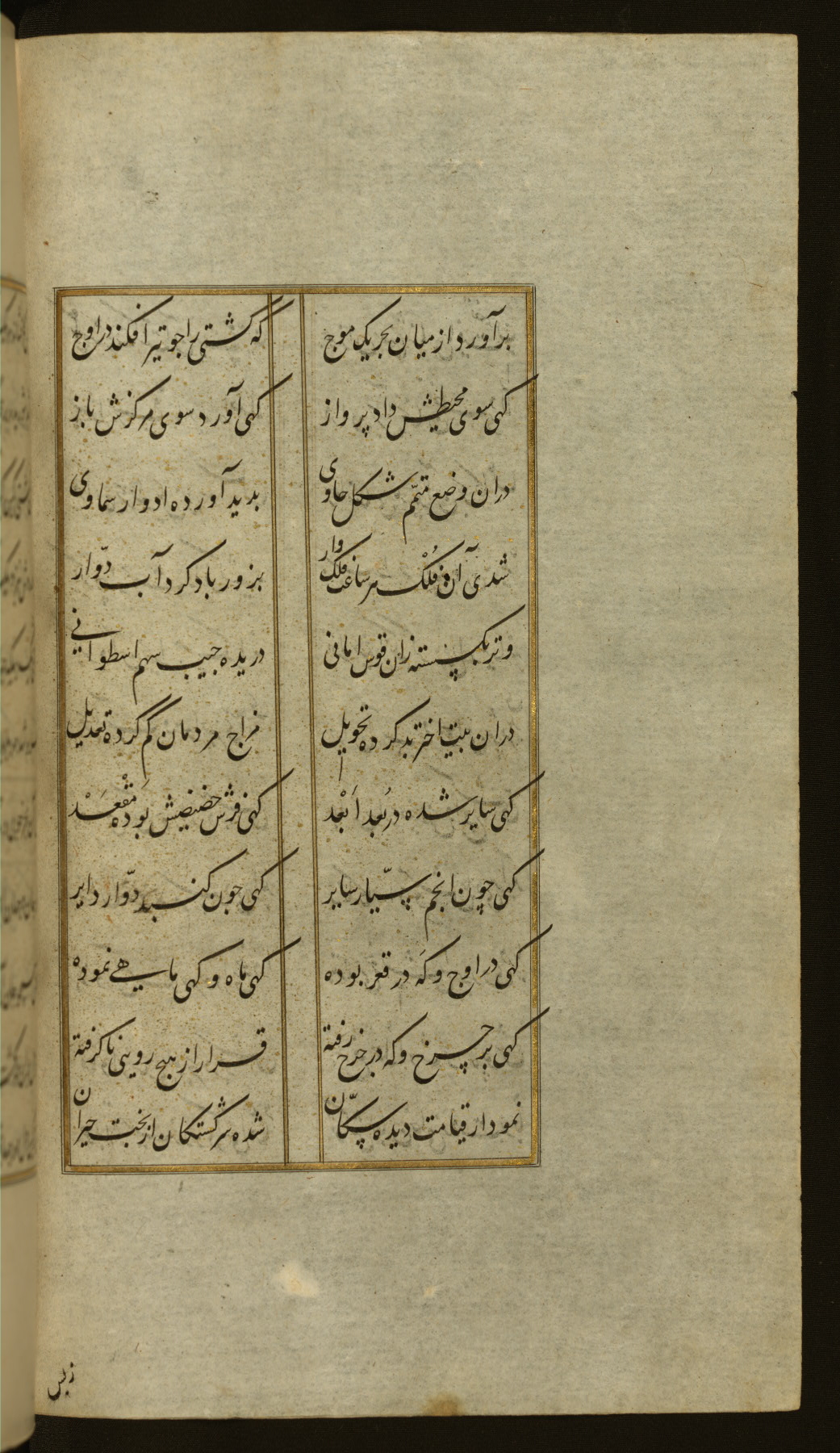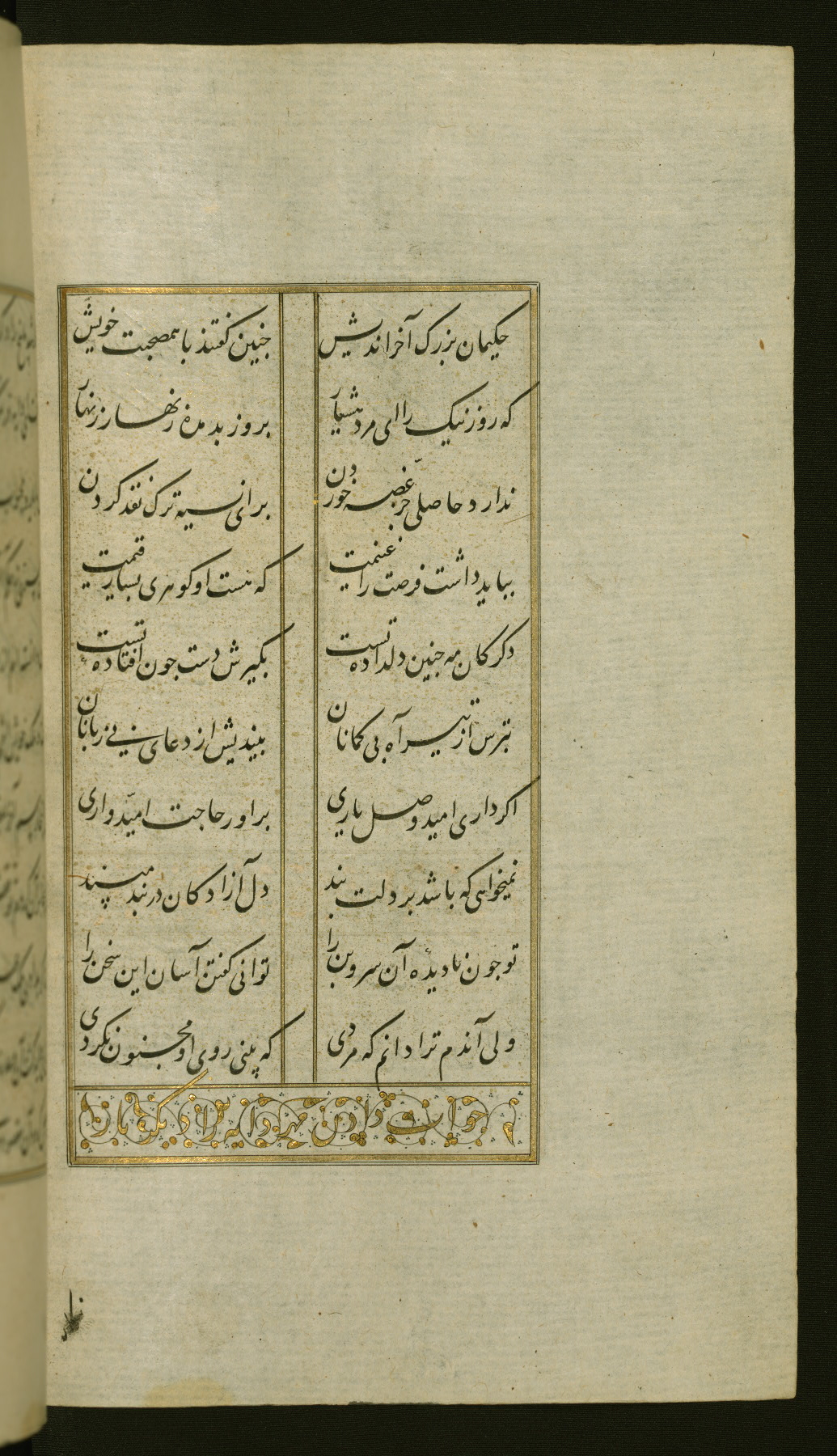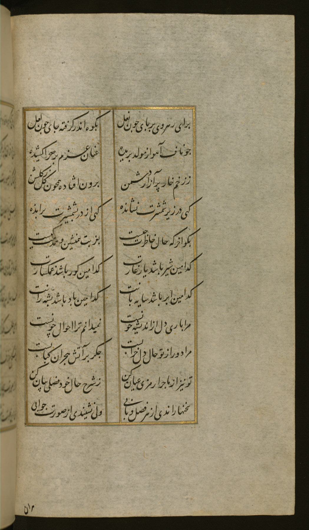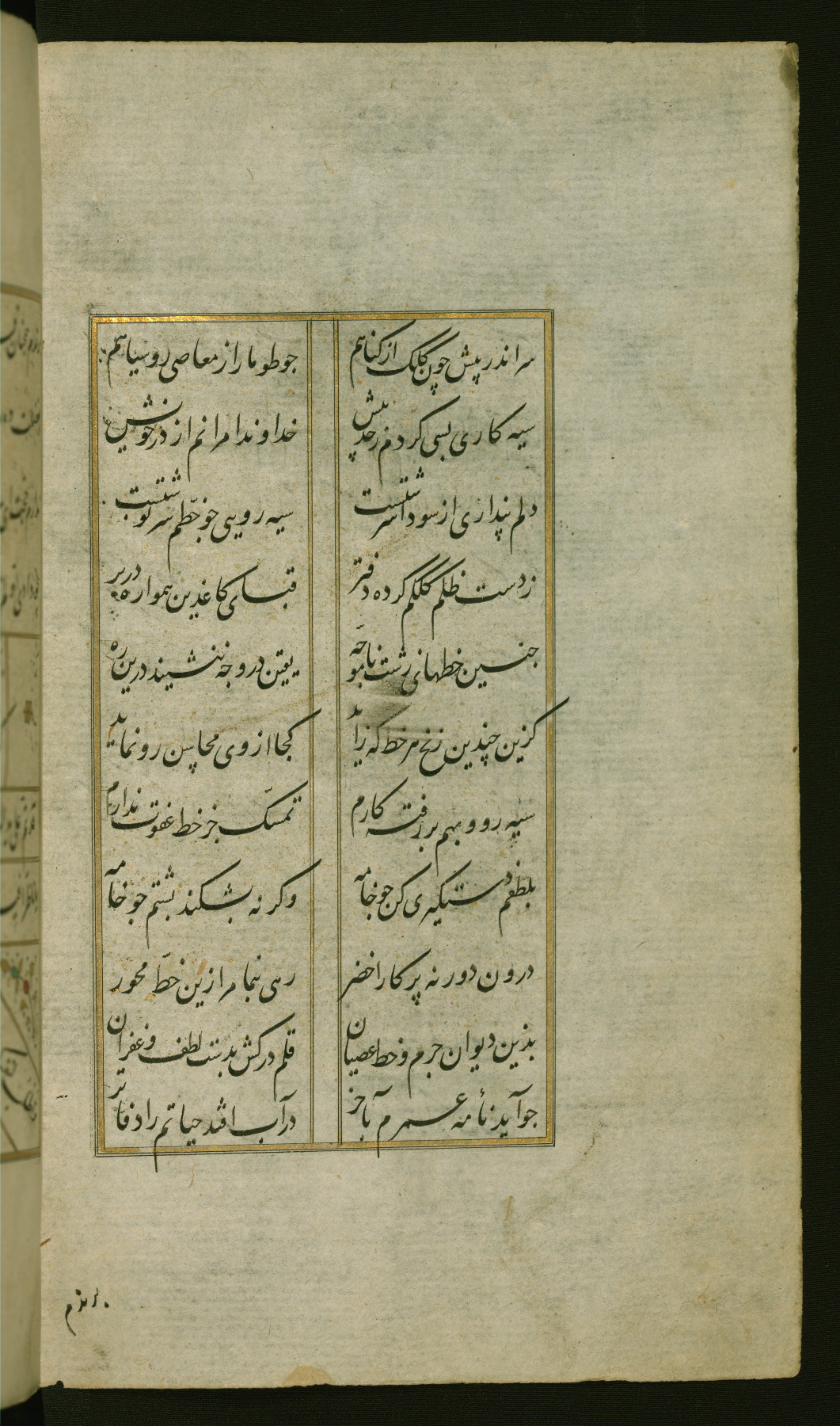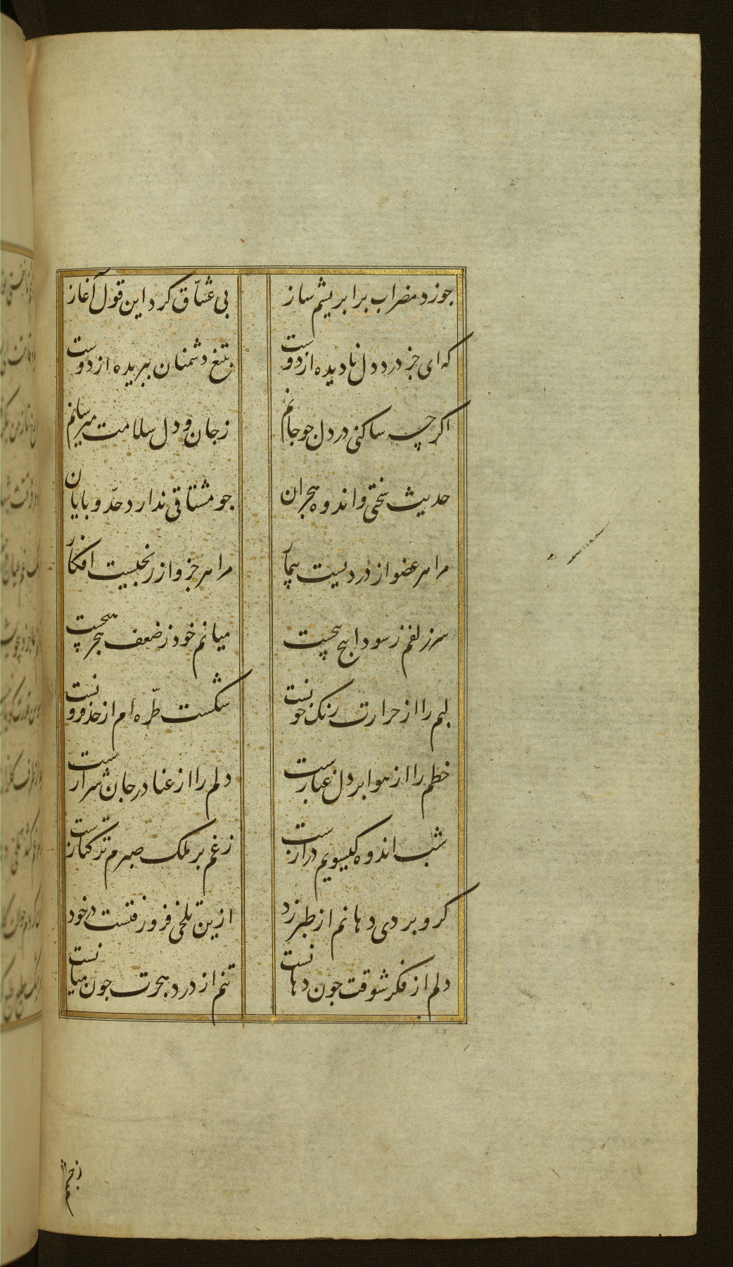 This manuscript is an illustrated copy of the well-known poem recounting the platonic love story between Mihr (the Sun), the son of Shāhpūr, and his vizier's son Mushtarī (Jupiter). The story of 90 chapters was composed by Muḥammad ibn Aḥmad ‘Aṣṣār Tabrīzī (d. 784 AH / 1382 CE). The present copy was written in nasta‘līq script by Murshid al-Kātib in 881 AH / 1476 CE. Considering the number of surviving manuscripts in which this calligrapher’s name is found, it seems he was particularly prolific. The present codex is illustrated with nine paintings. The gold-brushed leather binding with doublures of red leather decorated with filigree work is original to the manuscript.