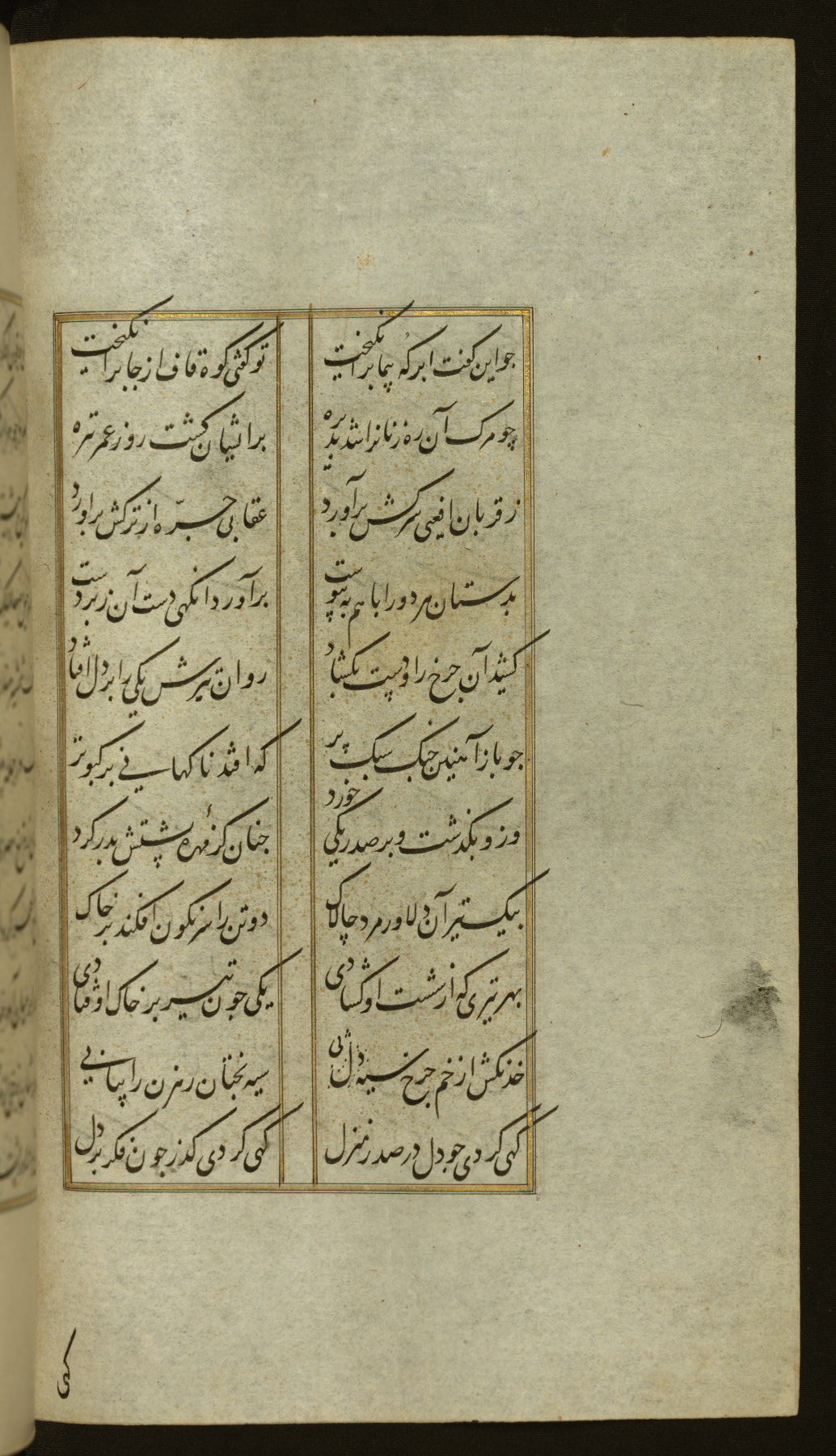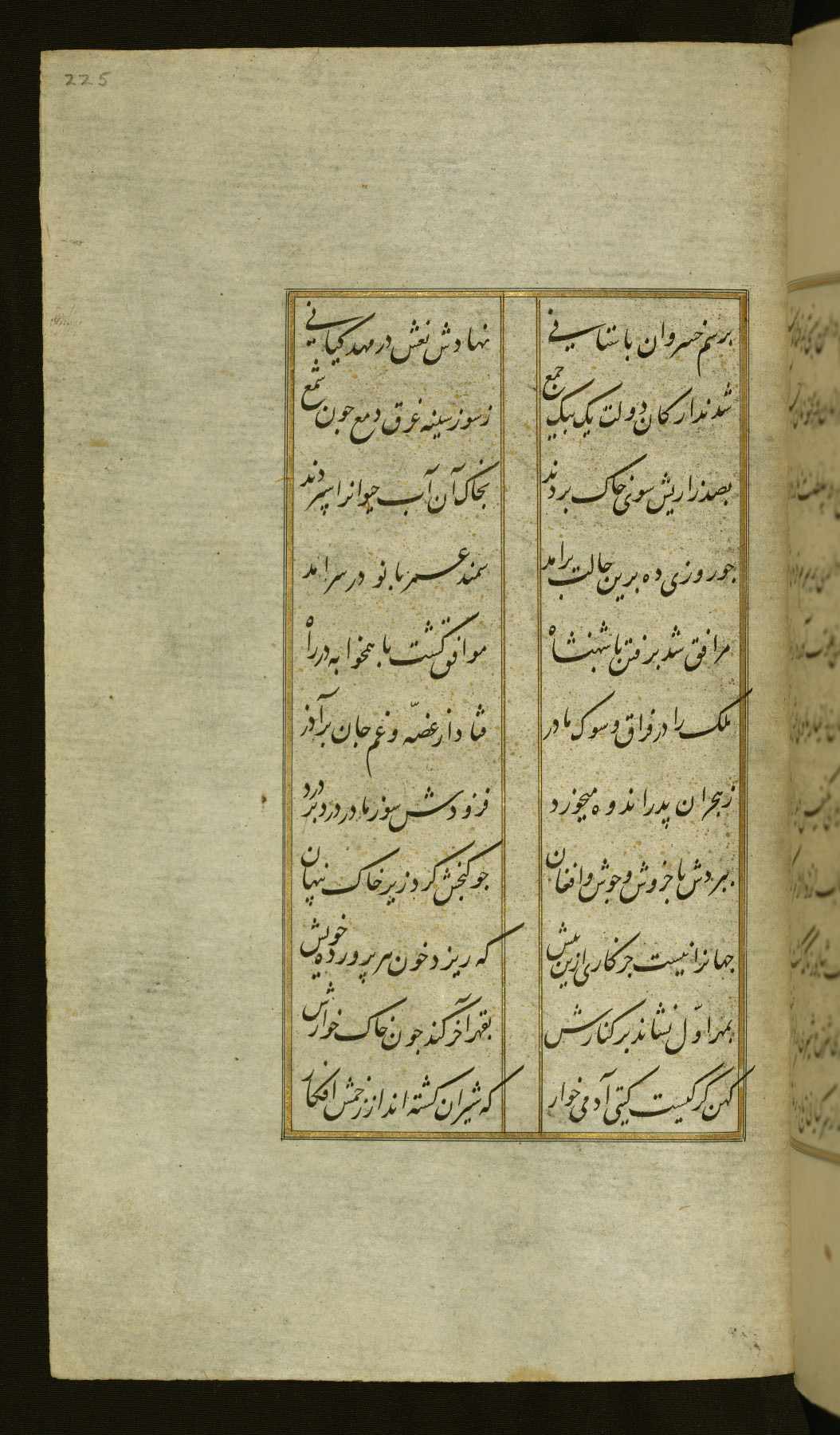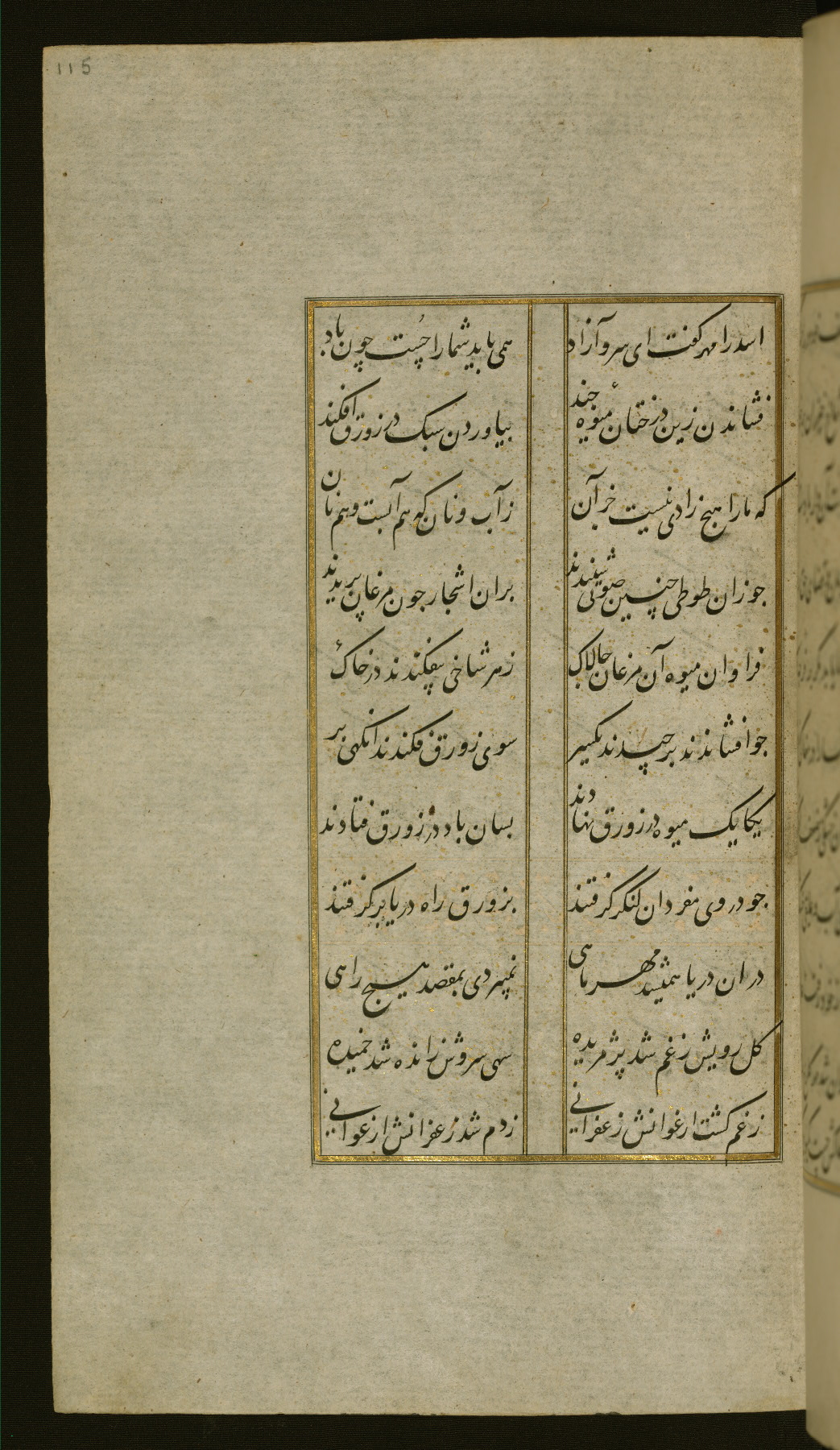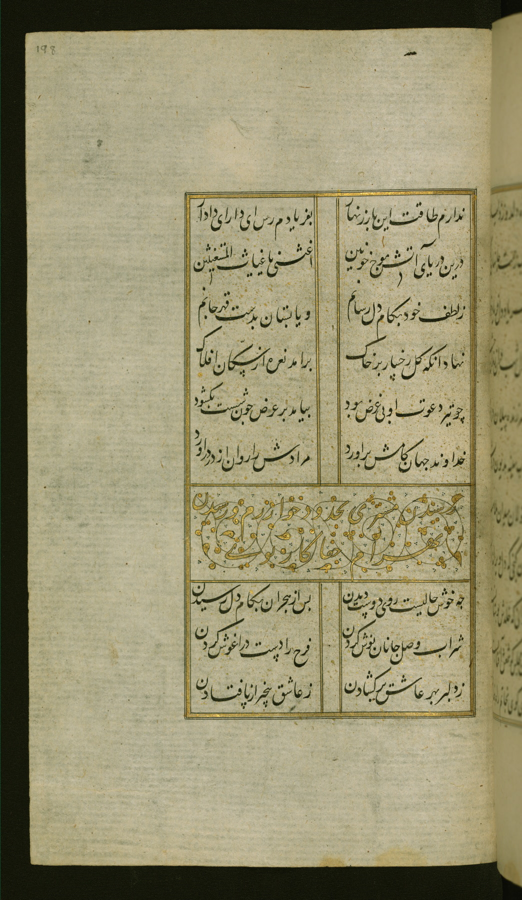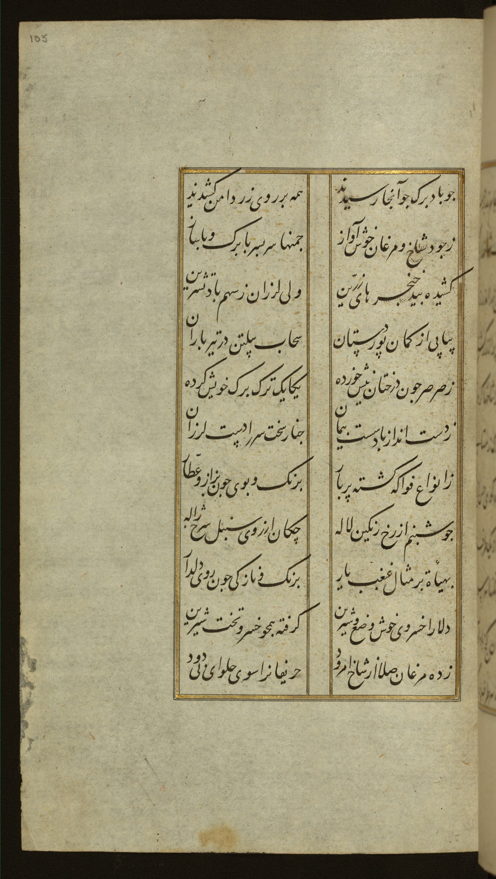 This manuscript is an illustrated copy of the well-known poem recounting the platonic love story between Mihr (the Sun), the son of Shāhpūr, and his vizier's son Mushtarī (Jupiter). The story of 90 chapters was composed by Muḥammad ibn Aḥmad ‘Aṣṣār Tabrīzī (d. 784 AH / 1382 CE). The present copy was written in nasta‘līq script by Murshid al-Kātib in 881 AH / 1476 CE. Considering the number of surviving manuscripts in which this calligrapher’s name is found, it seems he was particularly prolific. The present codex is illustrated with nine paintings. The gold-brushed leather binding with doublures of red leather decorated with filigree work is original to the manuscript.