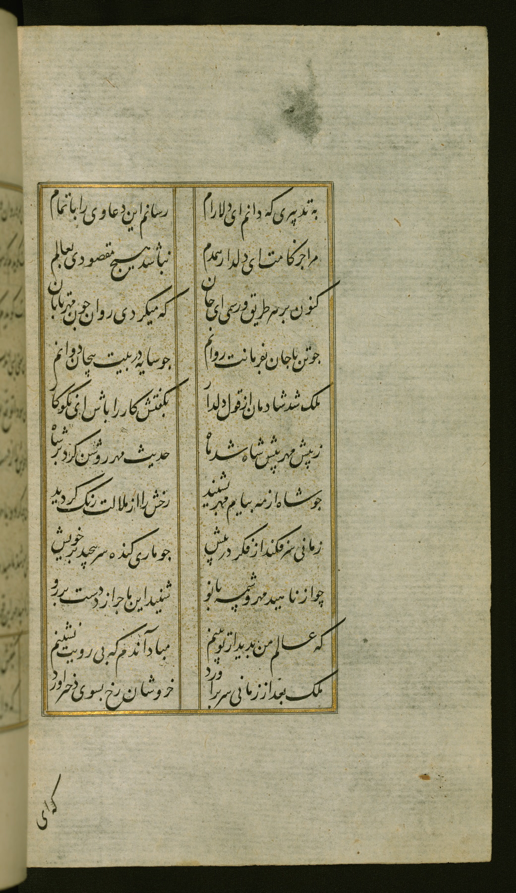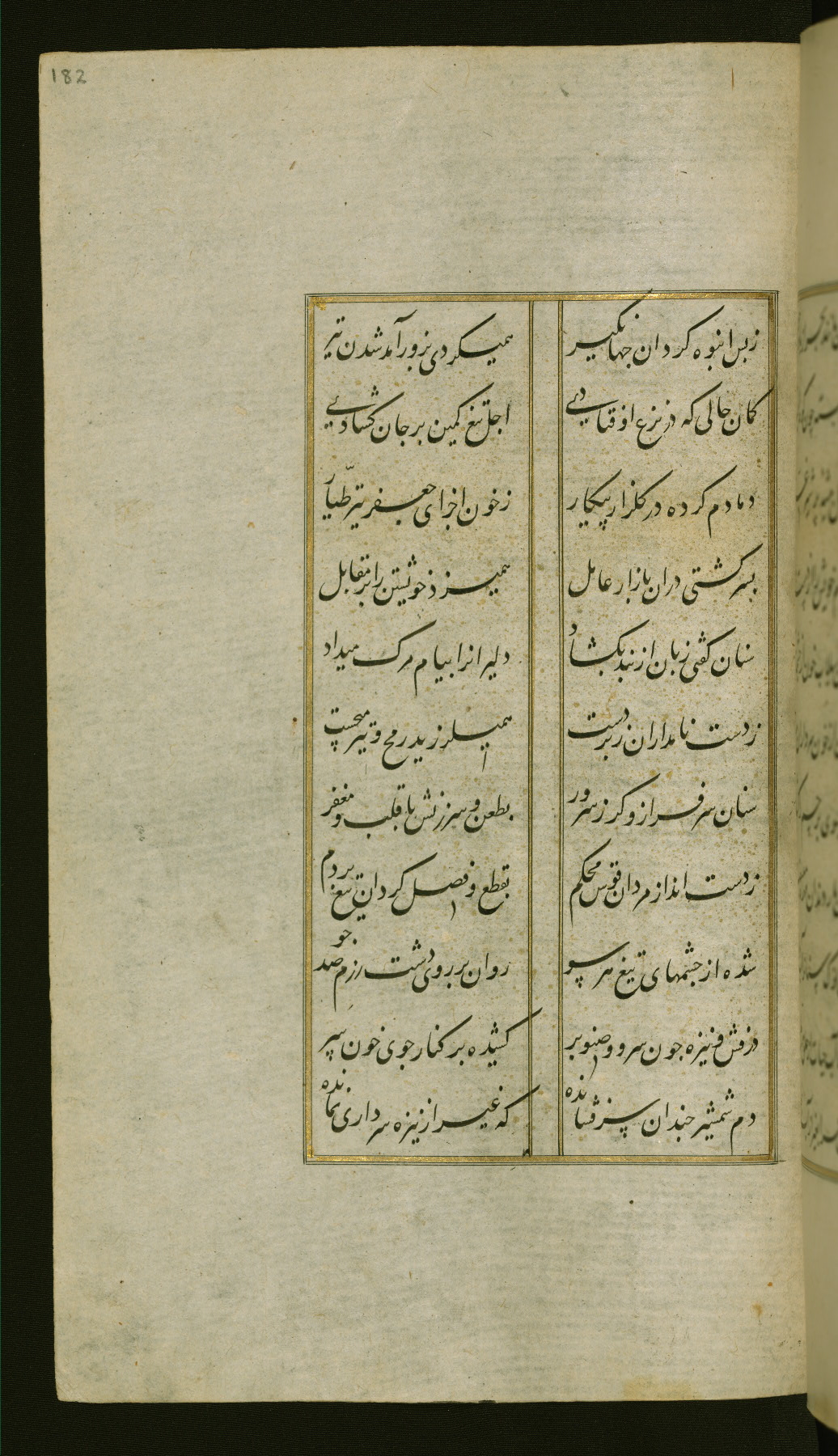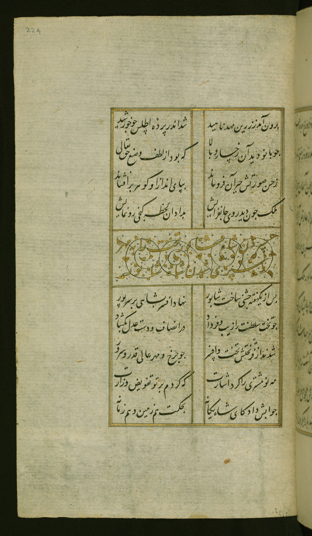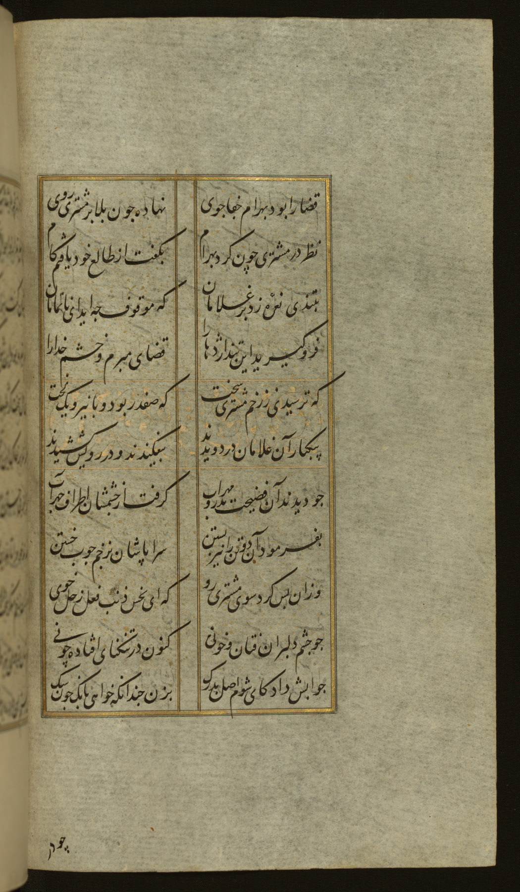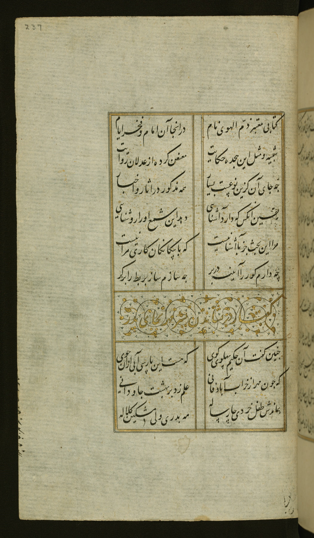 This manuscript is an illustrated copy of the well-known poem recounting the platonic love story between Mihr (the Sun), the son of Shāhpūr, and his vizier's son Mushtarī (Jupiter). The story of 90 chapters was composed by Muḥammad ibn Aḥmad ‘Aṣṣār Tabrīzī (d. 784 AH / 1382 CE). The present copy was written in nasta‘līq script by Murshid al-Kātib in 881 AH / 1476 CE. Considering the number of surviving manuscripts in which this calligrapher’s name is found, it seems he was particularly prolific. The present codex is illustrated with nine paintings. The gold-brushed leather binding with doublures of red leather decorated with filigree work is original to the manuscript.