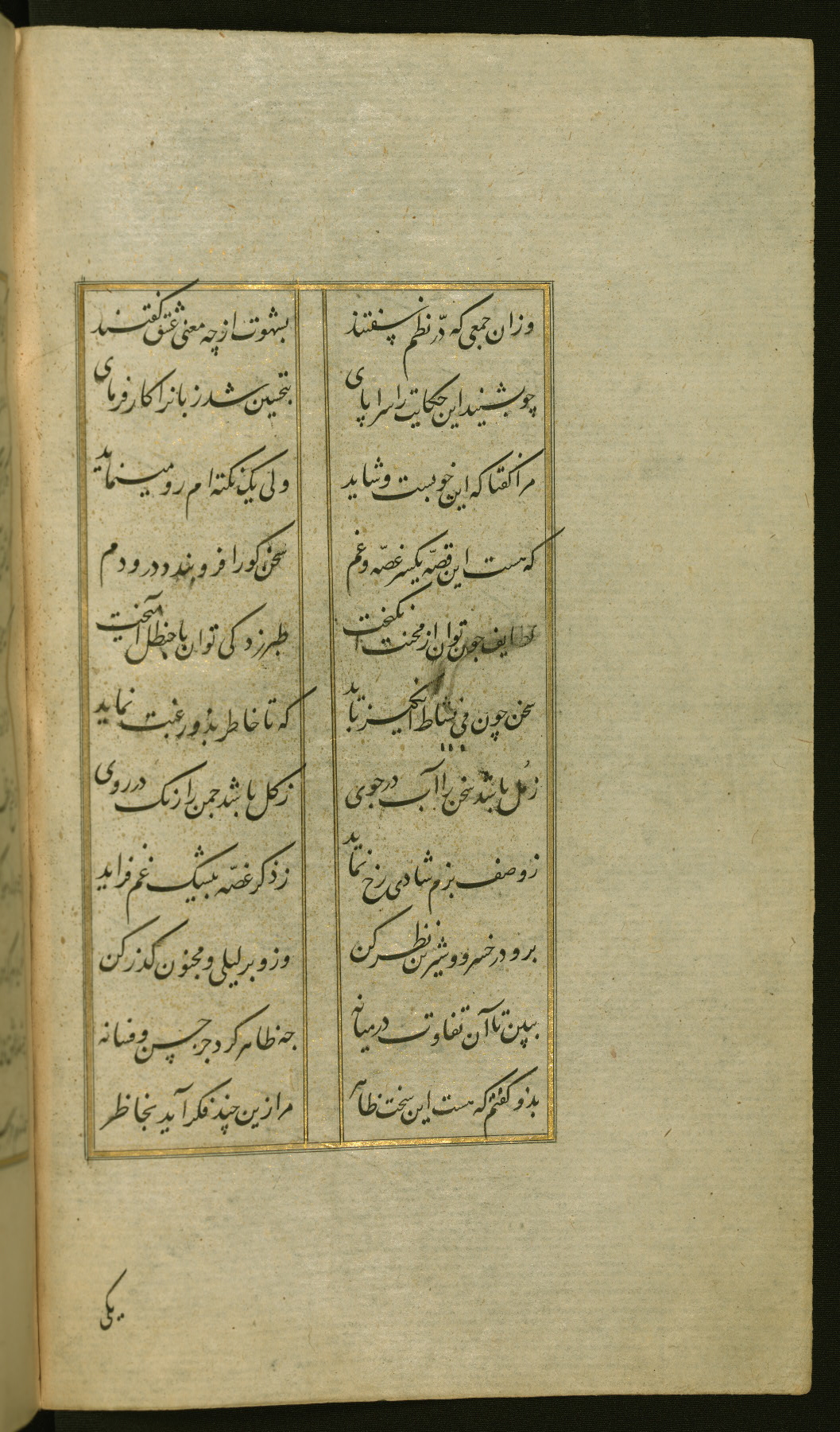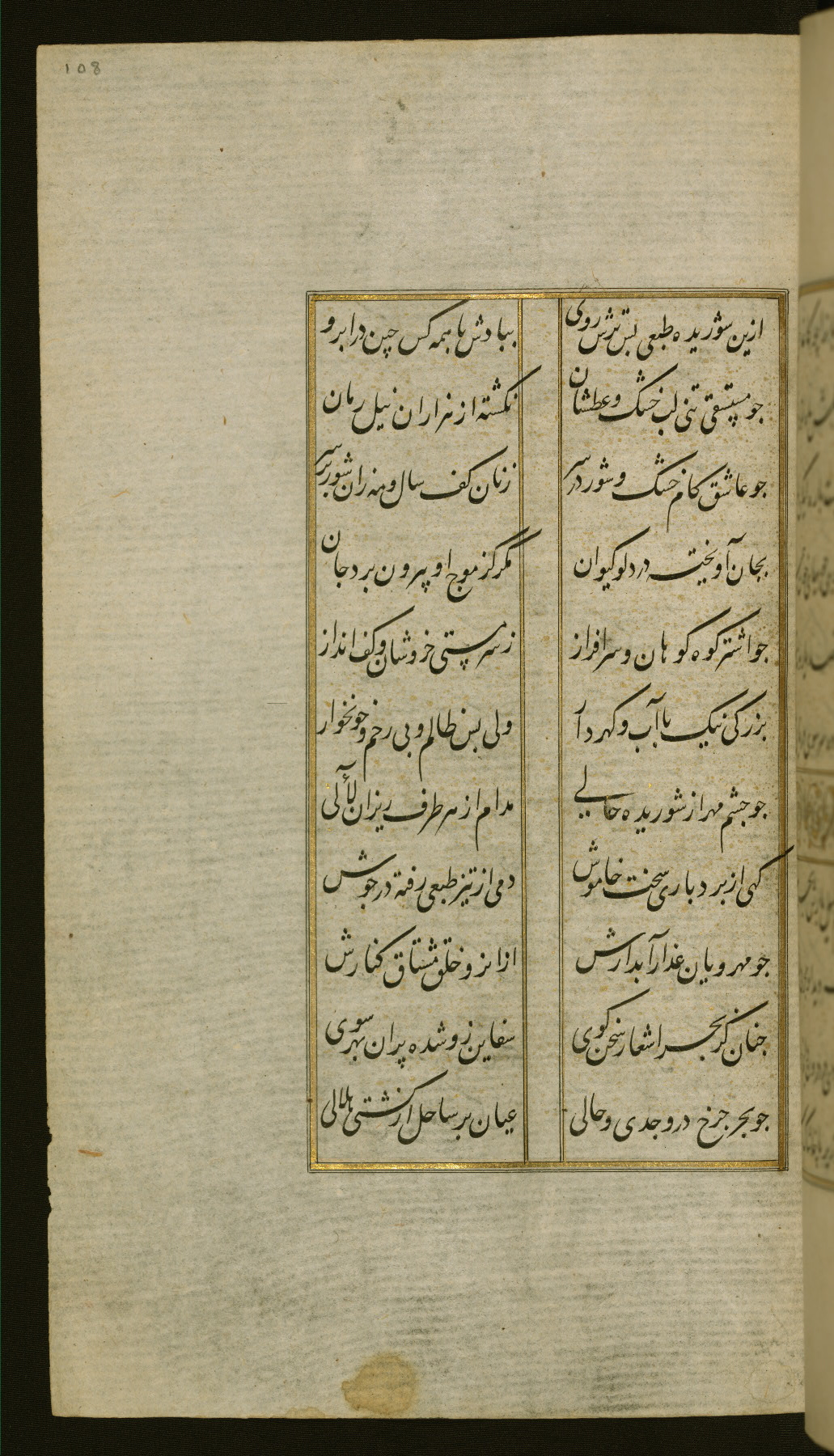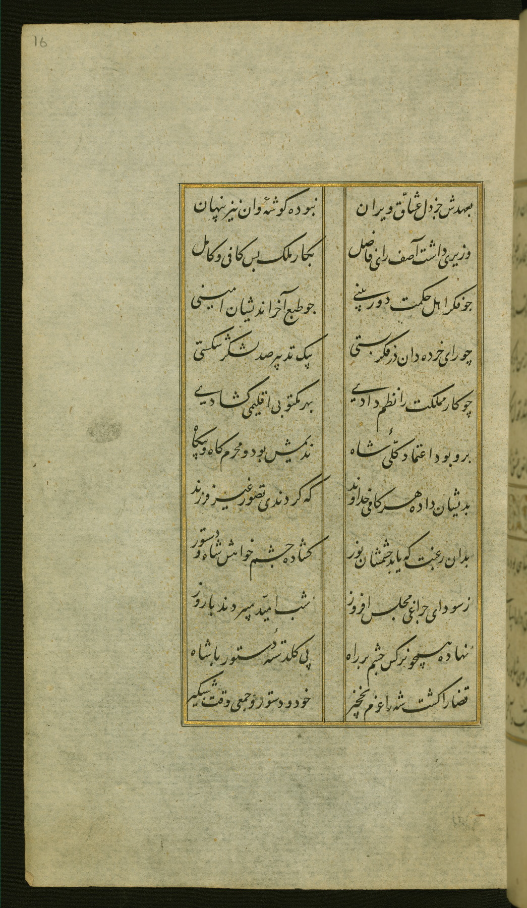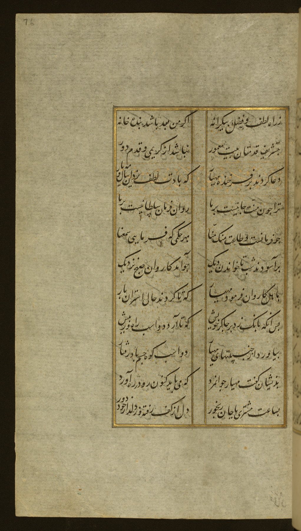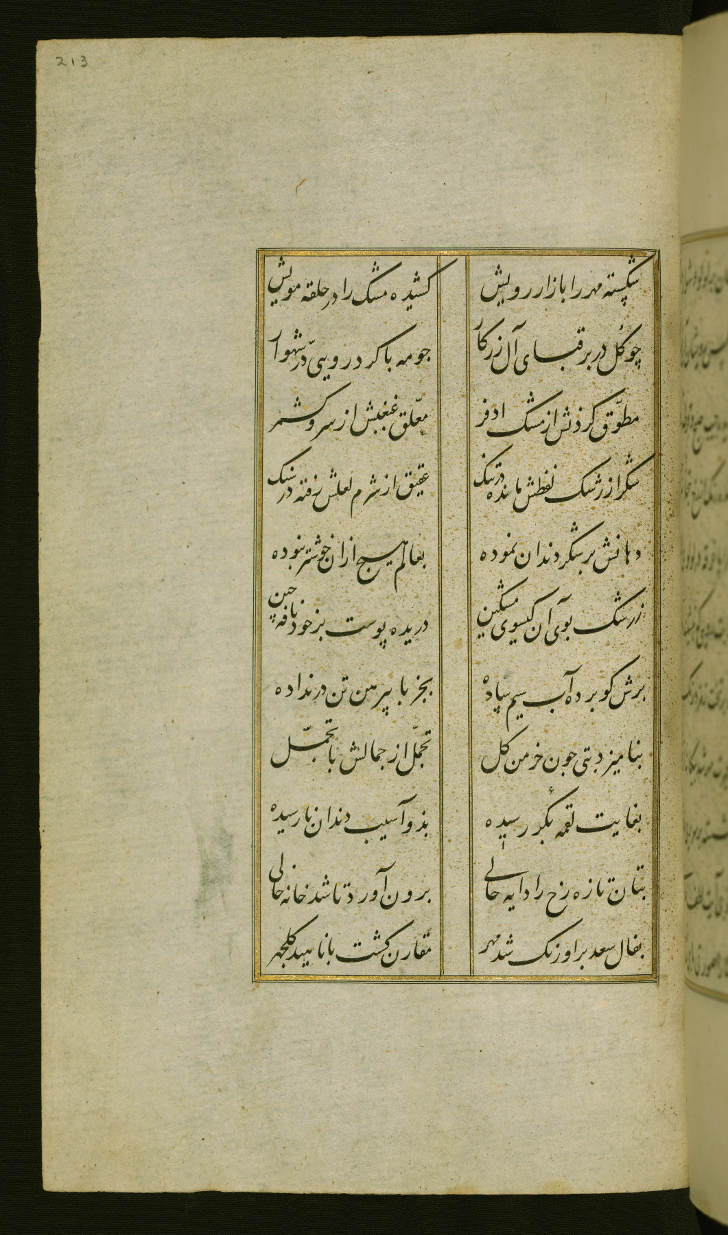 This manuscript is an illustrated copy of the well-known poem recounting the platonic love story between Mihr (the Sun), the son of Shāhpūr, and his vizier's son Mushtarī (Jupiter). The story of 90 chapters was composed by Muḥammad ibn Aḥmad ‘Aṣṣār Tabrīzī (d. 784 AH / 1382 CE). The present copy was written in nasta‘līq script by Murshid al-Kātib in 881 AH / 1476 CE. Considering the number of surviving manuscripts in which this calligrapher’s name is found, it seems he was particularly prolific. The present codex is illustrated with nine paintings. The gold-brushed leather binding with doublures of red leather decorated with filigree work is original to the manuscript.
