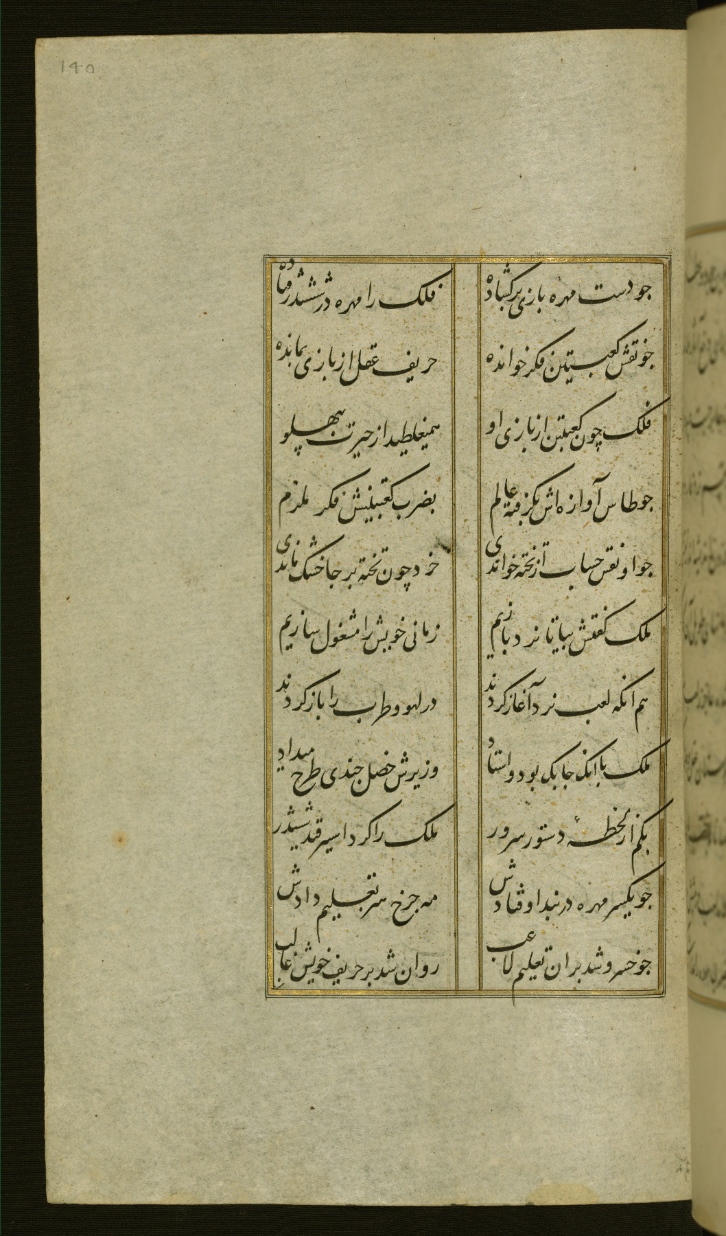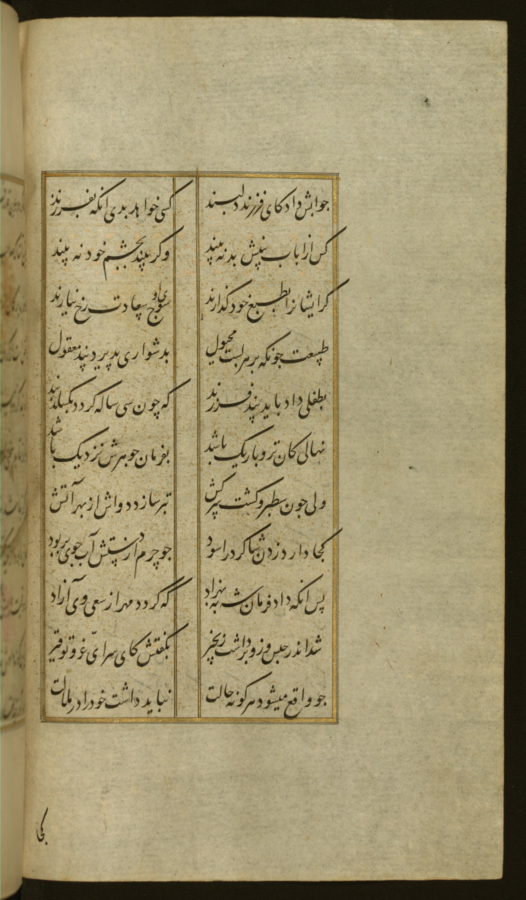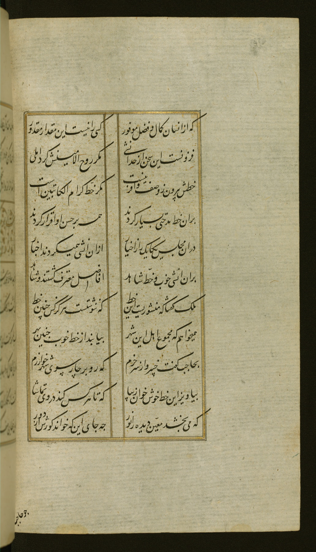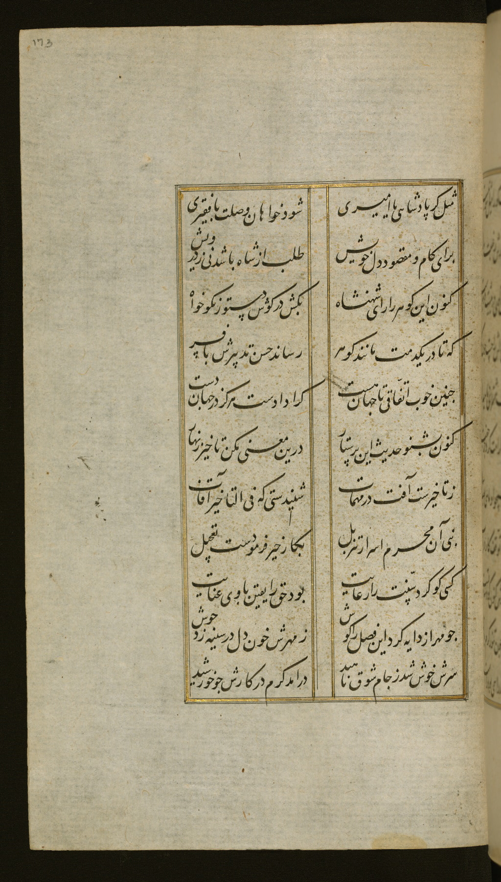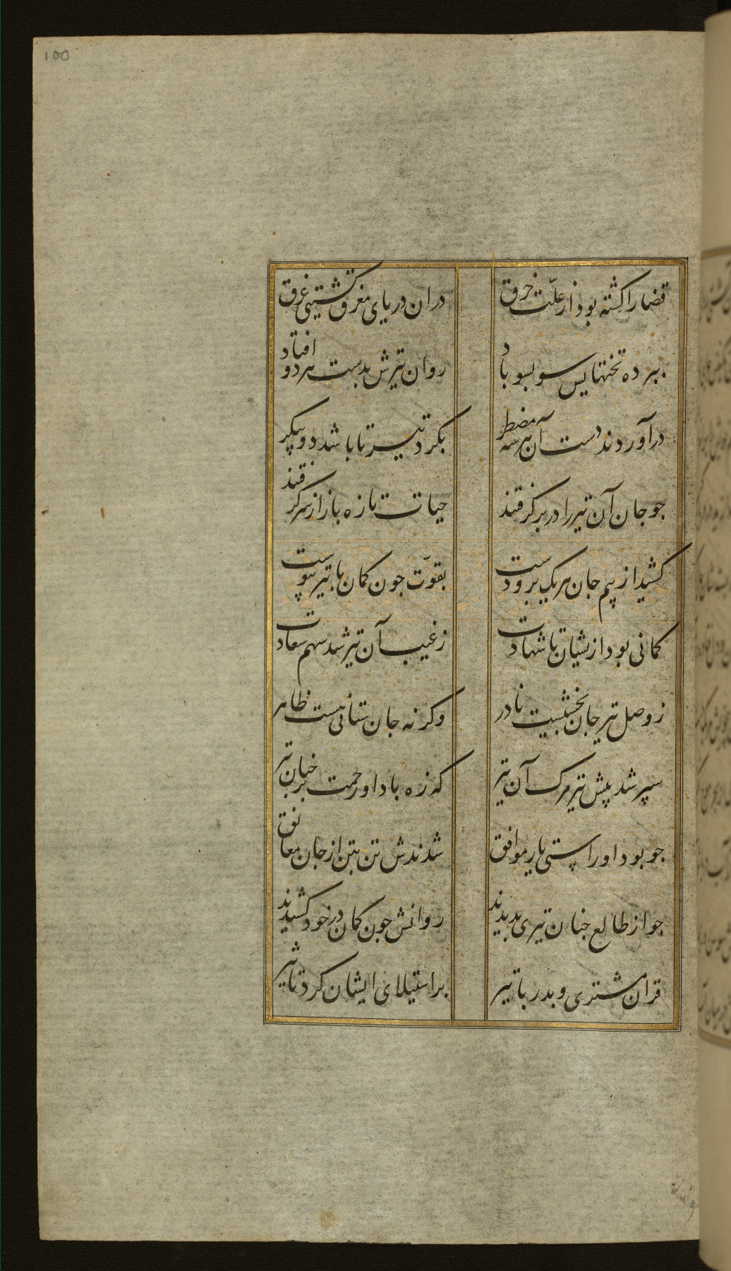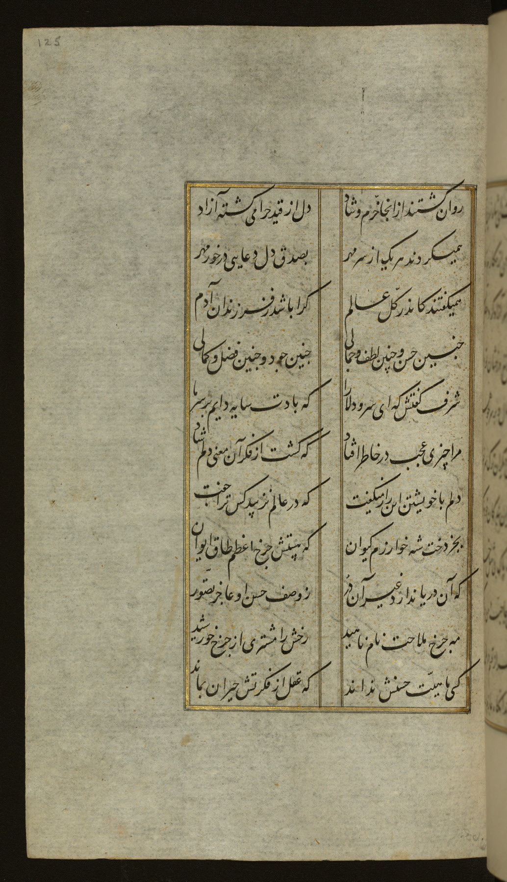 This manuscript is an illustrated copy of the well-known poem recounting the platonic love story between Mihr (the Sun), the son of Shāhpūr, and his vizier's son Mushtarī (Jupiter). The story of 90 chapters was composed by Muḥammad ibn Aḥmad ‘Aṣṣār Tabrīzī (d. 784 AH / 1382 CE). The present copy was written in nasta‘līq script by Murshid al-Kātib in 881 AH / 1476 CE. Considering the number of surviving manuscripts in which this calligrapher’s name is found, it seems he was particularly prolific. The present codex is illustrated with nine paintings. The gold-brushed leather binding with doublures of red leather decorated with filigree work is original to the manuscript.