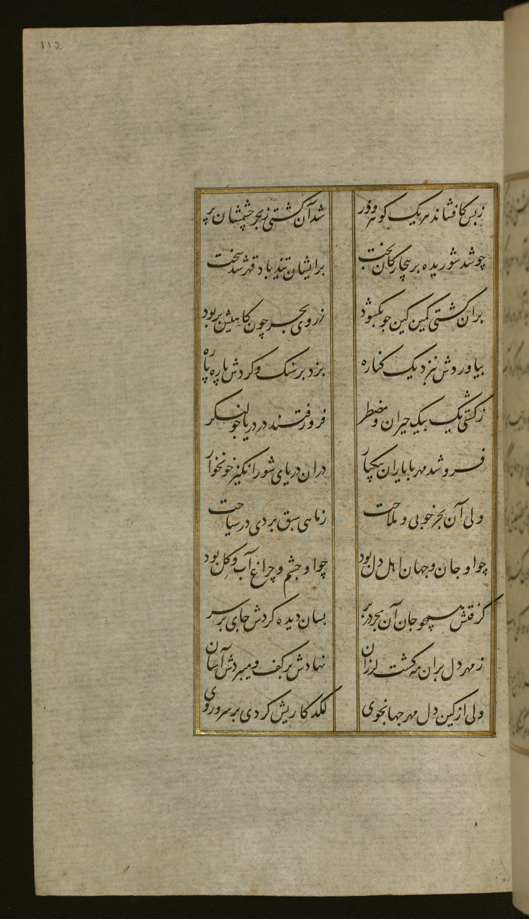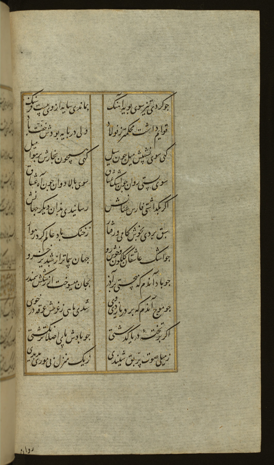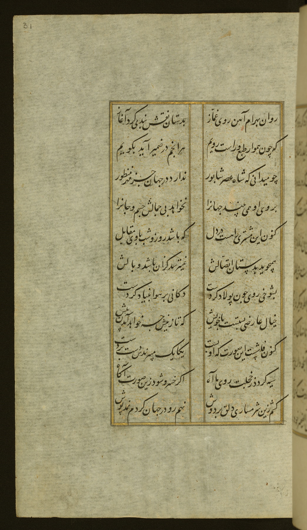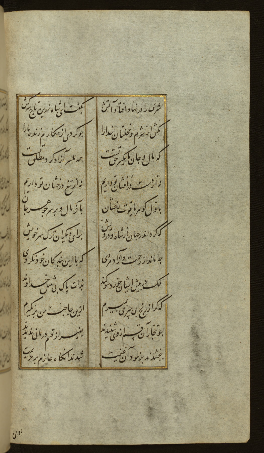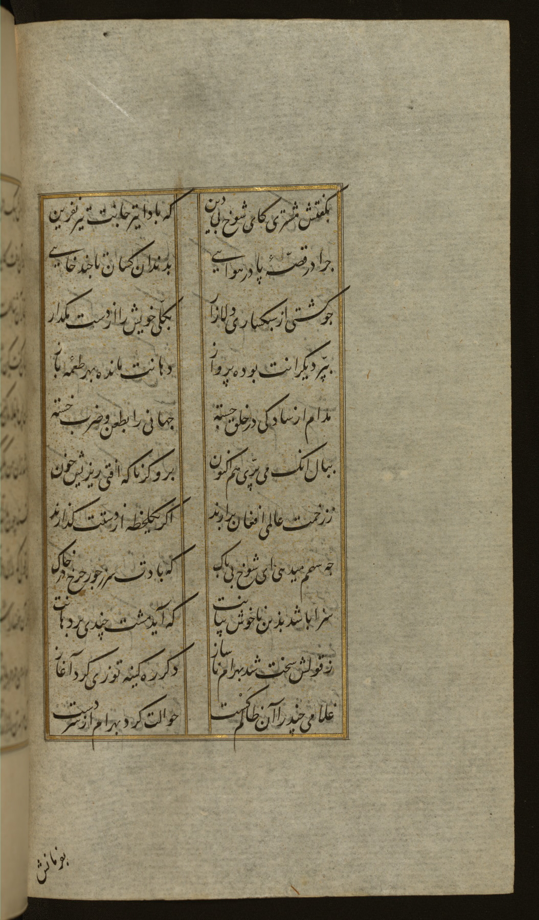 This manuscript is an illustrated copy of the well-known poem recounting the platonic love story between Mihr (the Sun), the son of Shāhpūr, and his vizier's son Mushtarī (Jupiter). The story of 90 chapters was composed by Muḥammad ibn Aḥmad ‘Aṣṣār Tabrīzī (d. 784 AH / 1382 CE). The present copy was written in nasta‘līq script by Murshid al-Kātib in 881 AH / 1476 CE. Considering the number of surviving manuscripts in which this calligrapher’s name is found, it seems he was particularly prolific. The present codex is illustrated with nine paintings. The gold-brushed leather binding with doublures of red leather decorated with filigree work is original to the manuscript.