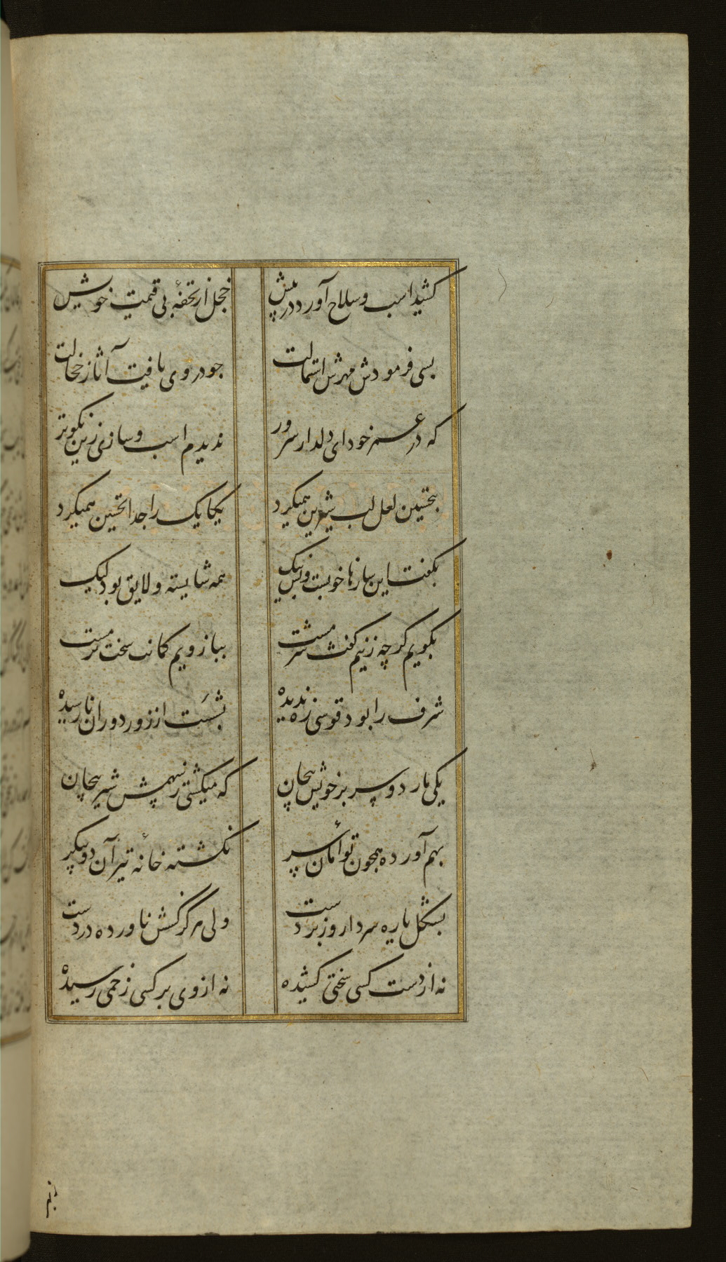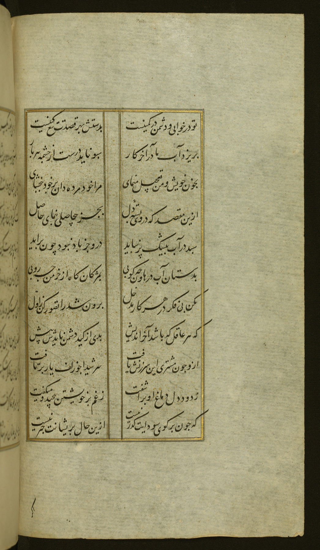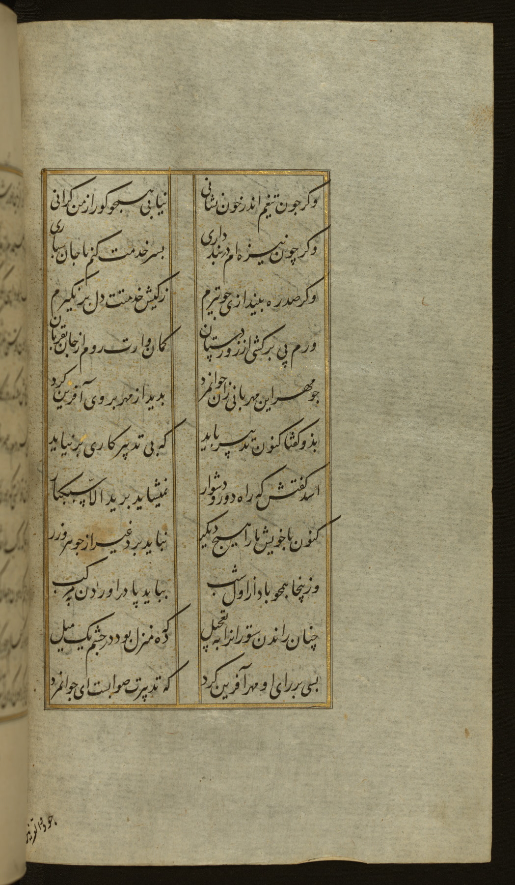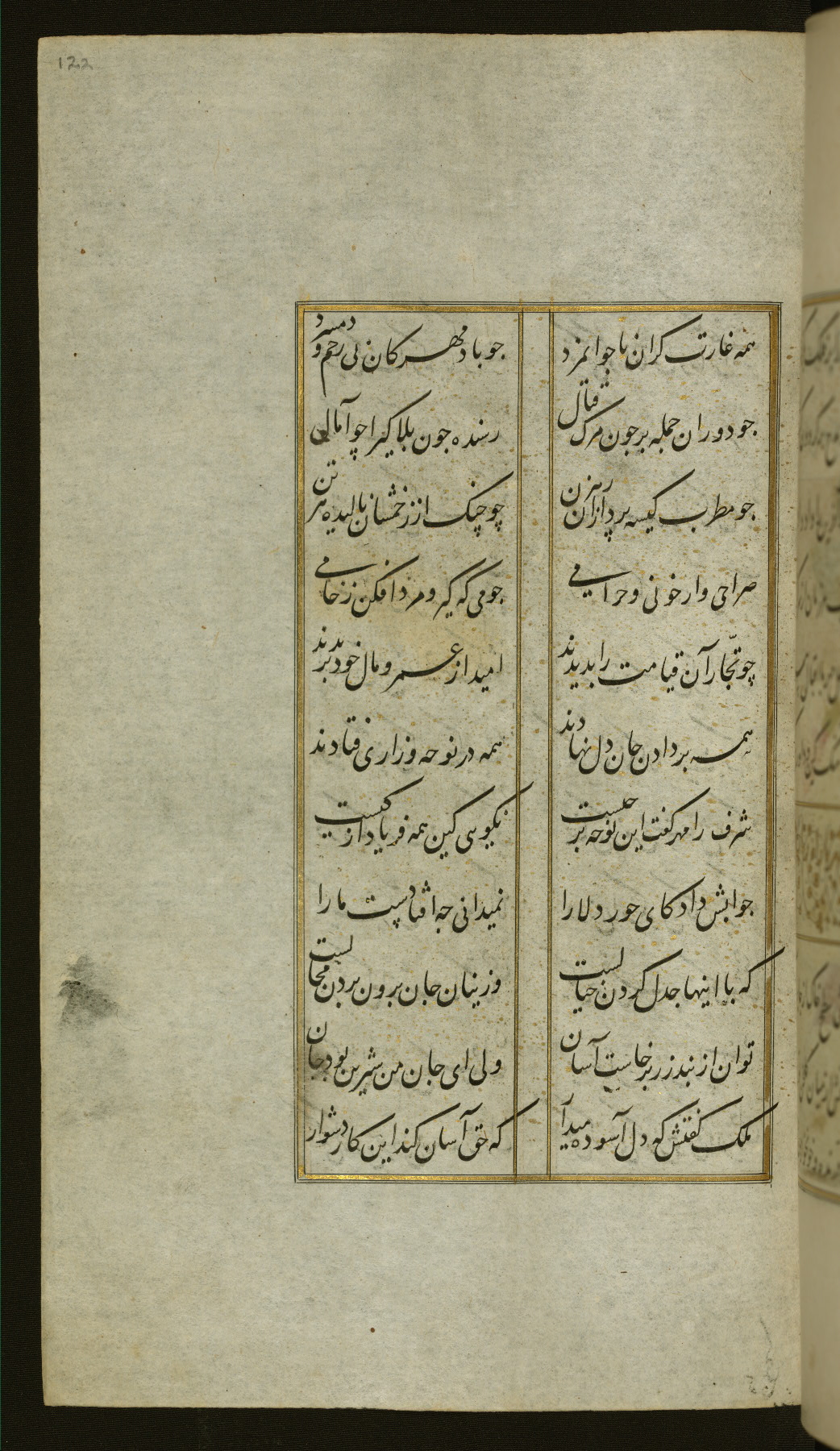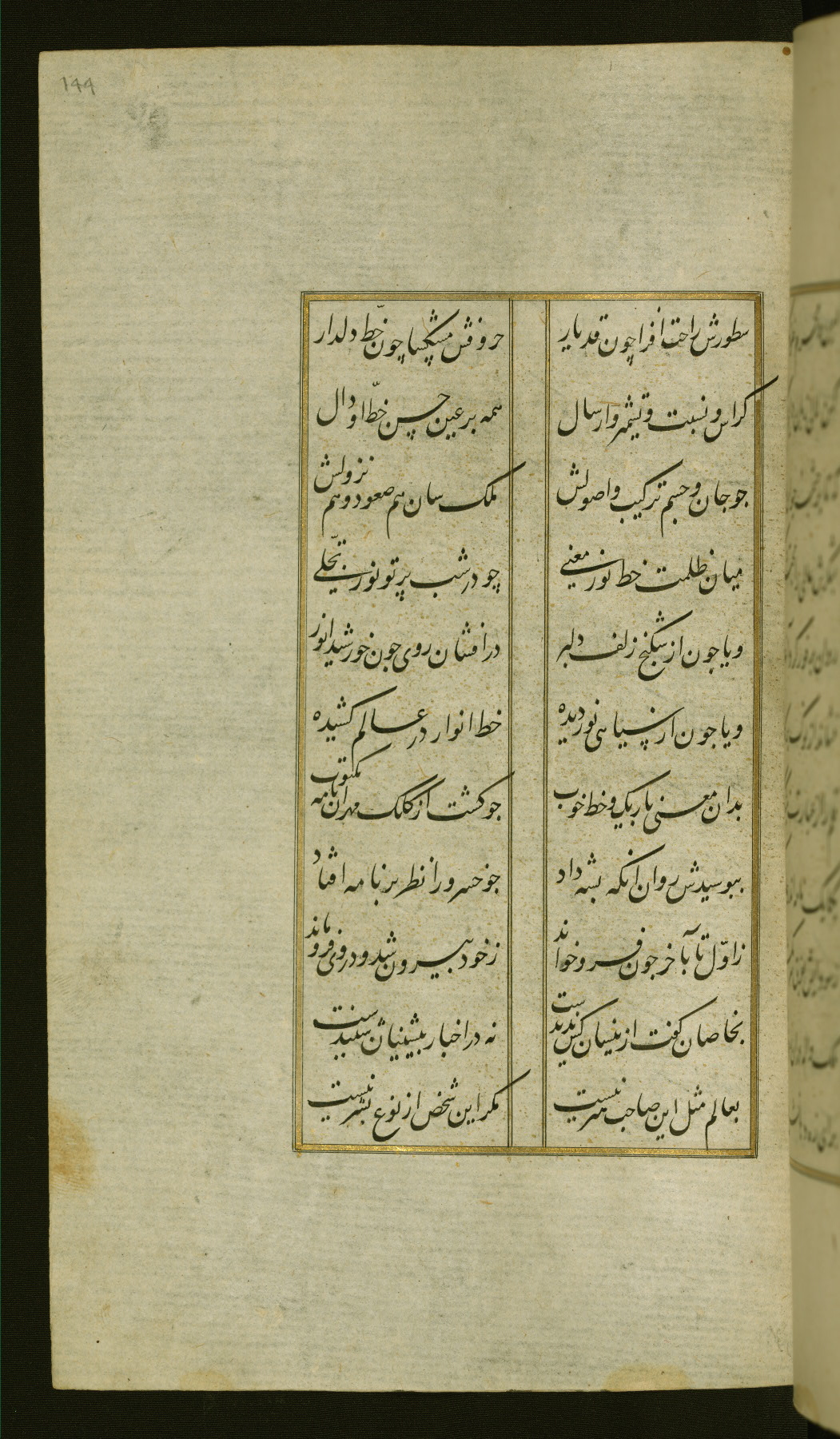 This manuscript is an illustrated copy of the well-known poem recounting the platonic love story between Mihr (the Sun), the son of Shāhpūr, and his vizier's son Mushtarī (Jupiter). The story of 90 chapters was composed by Muḥammad ibn Aḥmad ‘Aṣṣār Tabrīzī (d. 784 AH / 1382 CE). The present copy was written in nasta‘līq script by Murshid al-Kātib in 881 AH / 1476 CE. Considering the number of surviving manuscripts in which this calligrapher’s name is found, it seems he was particularly prolific. The present codex is illustrated with nine paintings. The gold-brushed leather binding with doublures of red leather decorated with filigree work is original to the manuscript.