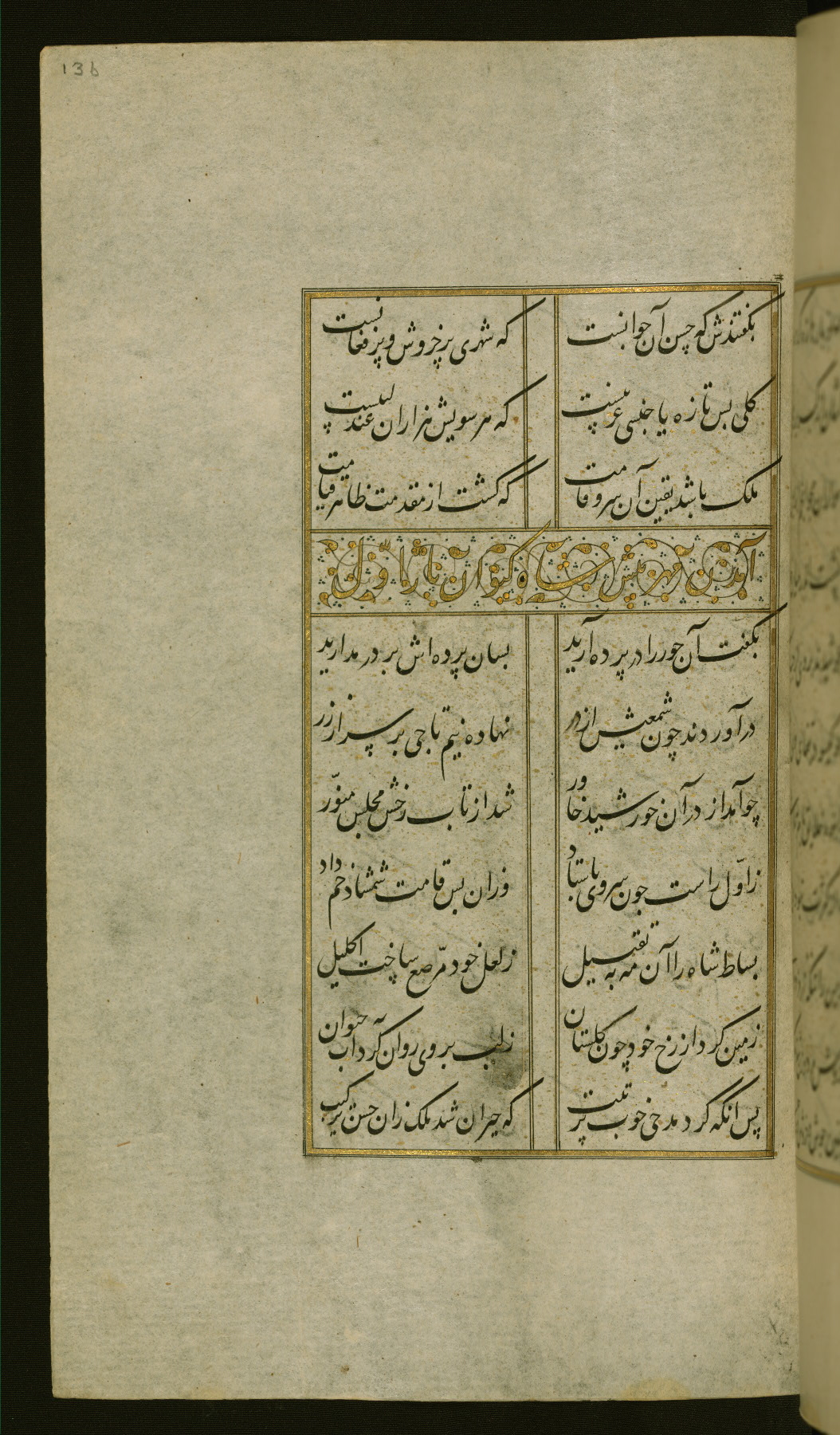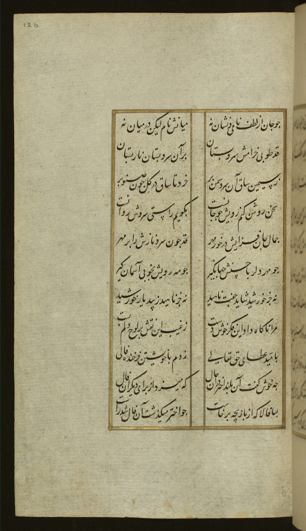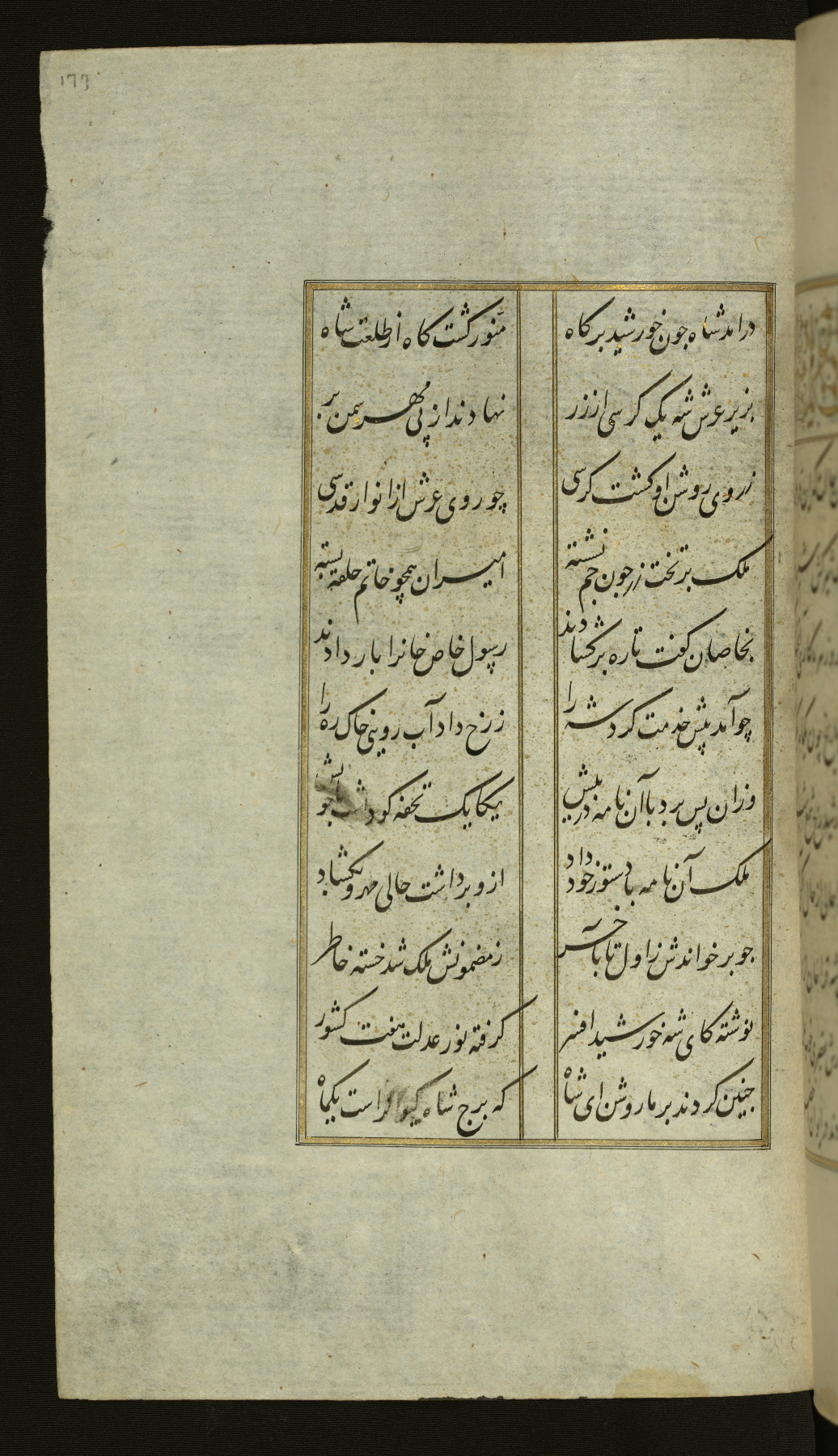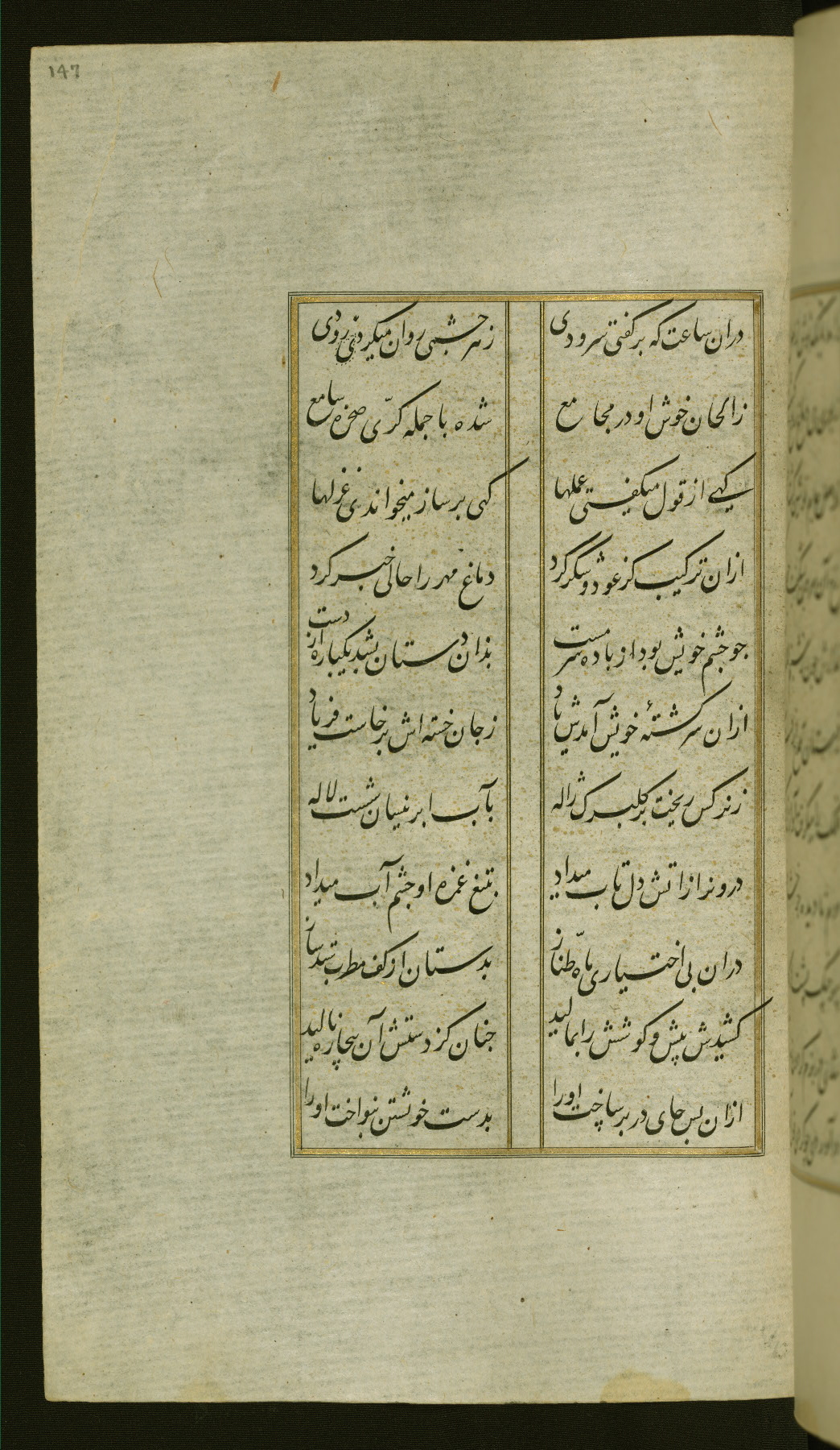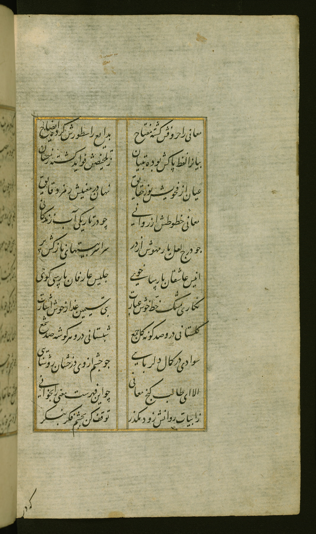 This manuscript is an illustrated copy of the well-known poem recounting the platonic love story between Mihr (the Sun), the son of Shāhpūr, and his vizier's son Mushtarī (Jupiter). The story of 90 chapters was composed by Muḥammad ibn Aḥmad ‘Aṣṣār Tabrīzī (d. 784 AH / 1382 CE). The present copy was written in nasta‘līq script by Murshid al-Kātib in 881 AH / 1476 CE. Considering the number of surviving manuscripts in which this calligrapher’s name is found, it seems he was particularly prolific. The present codex is illustrated with nine paintings. The gold-brushed leather binding with doublures of red leather decorated with filigree work is original to the manuscript.