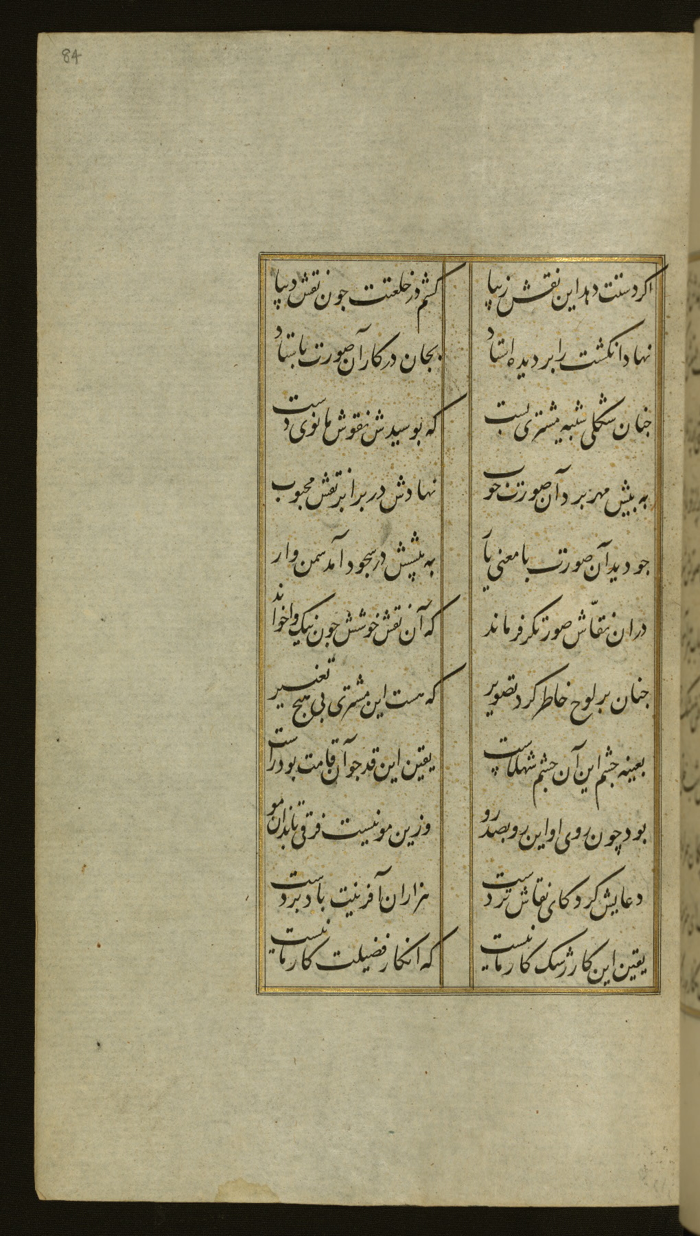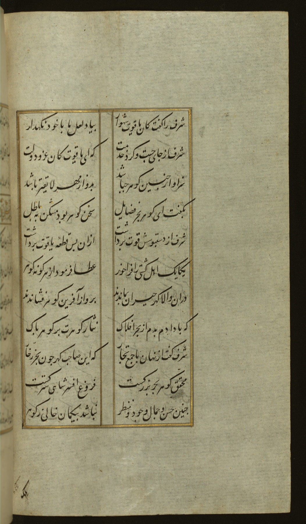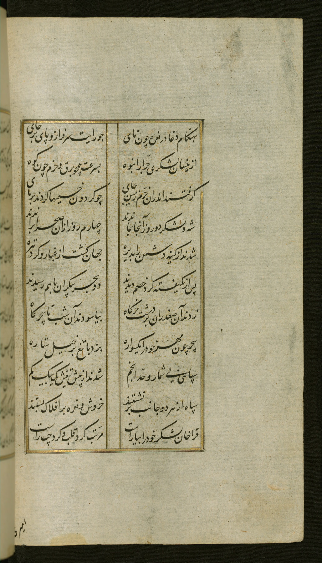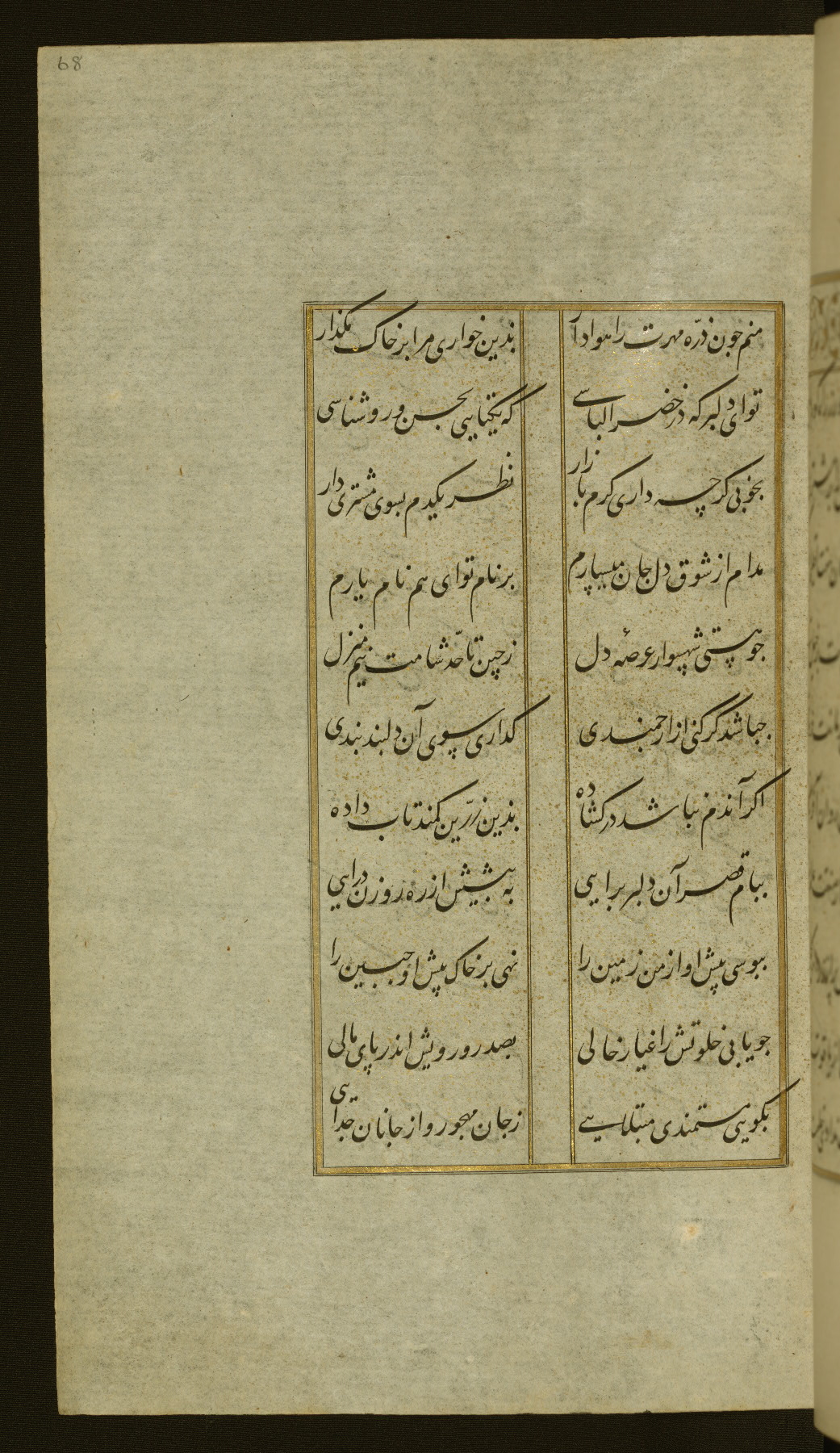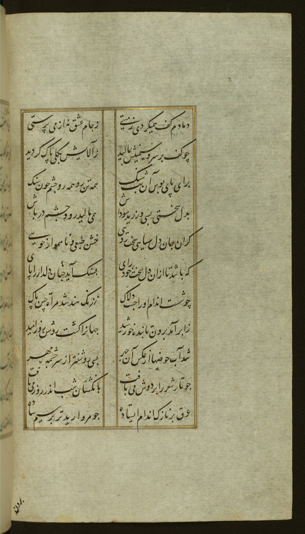 This manuscript is an illustrated copy of the well-known poem recounting the platonic love story between Mihr (the Sun), the son of Shāhpūr, and his vizier's son Mushtarī (Jupiter). The story of 90 chapters was composed by Muḥammad ibn Aḥmad ‘Aṣṣār Tabrīzī (d. 784 AH / 1382 CE). The present copy was written in nasta‘līq script by Murshid al-Kātib in 881 AH / 1476 CE. Considering the number of surviving manuscripts in which this calligrapher’s name is found, it seems he was particularly prolific. The present codex is illustrated with nine paintings. The gold-brushed leather binding with doublures of red leather decorated with filigree work is original to the manuscript.