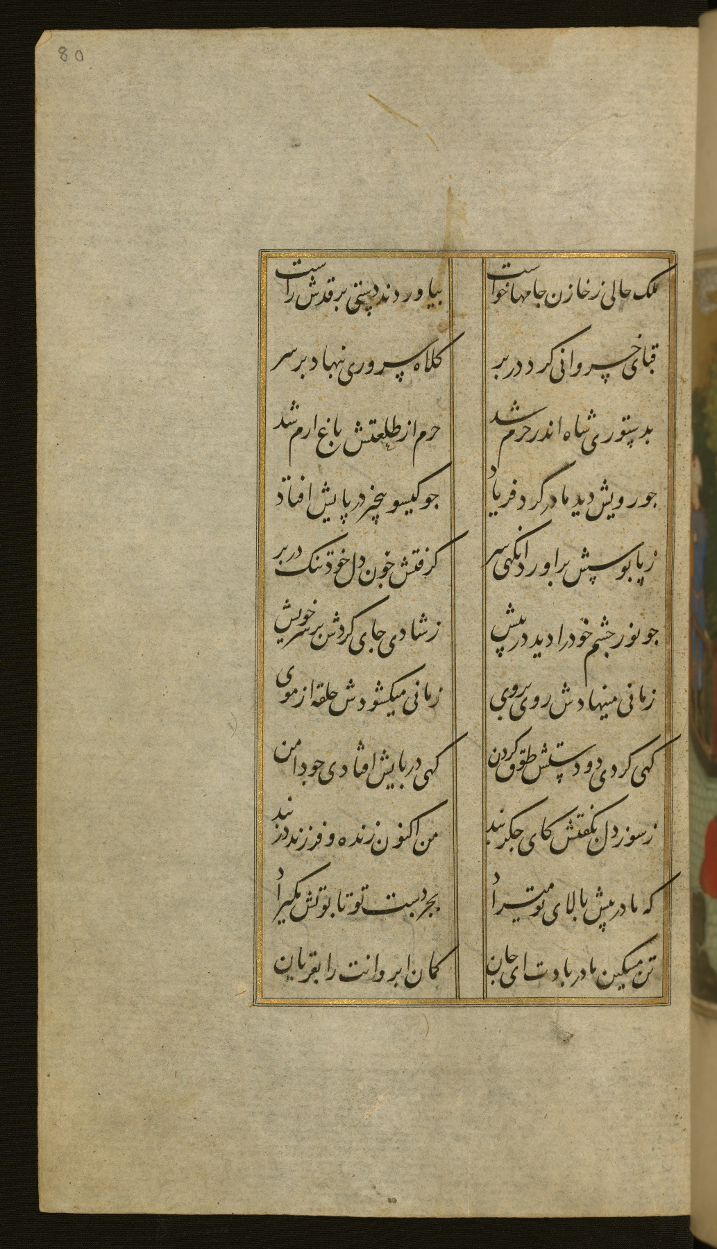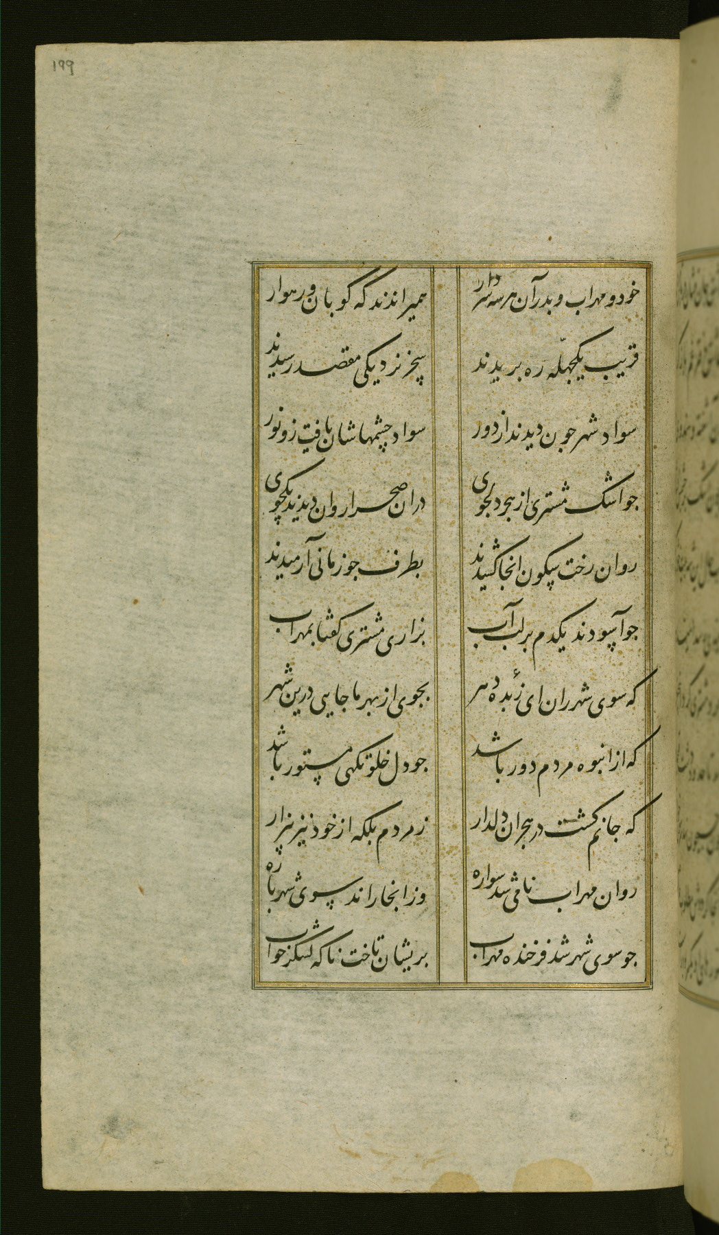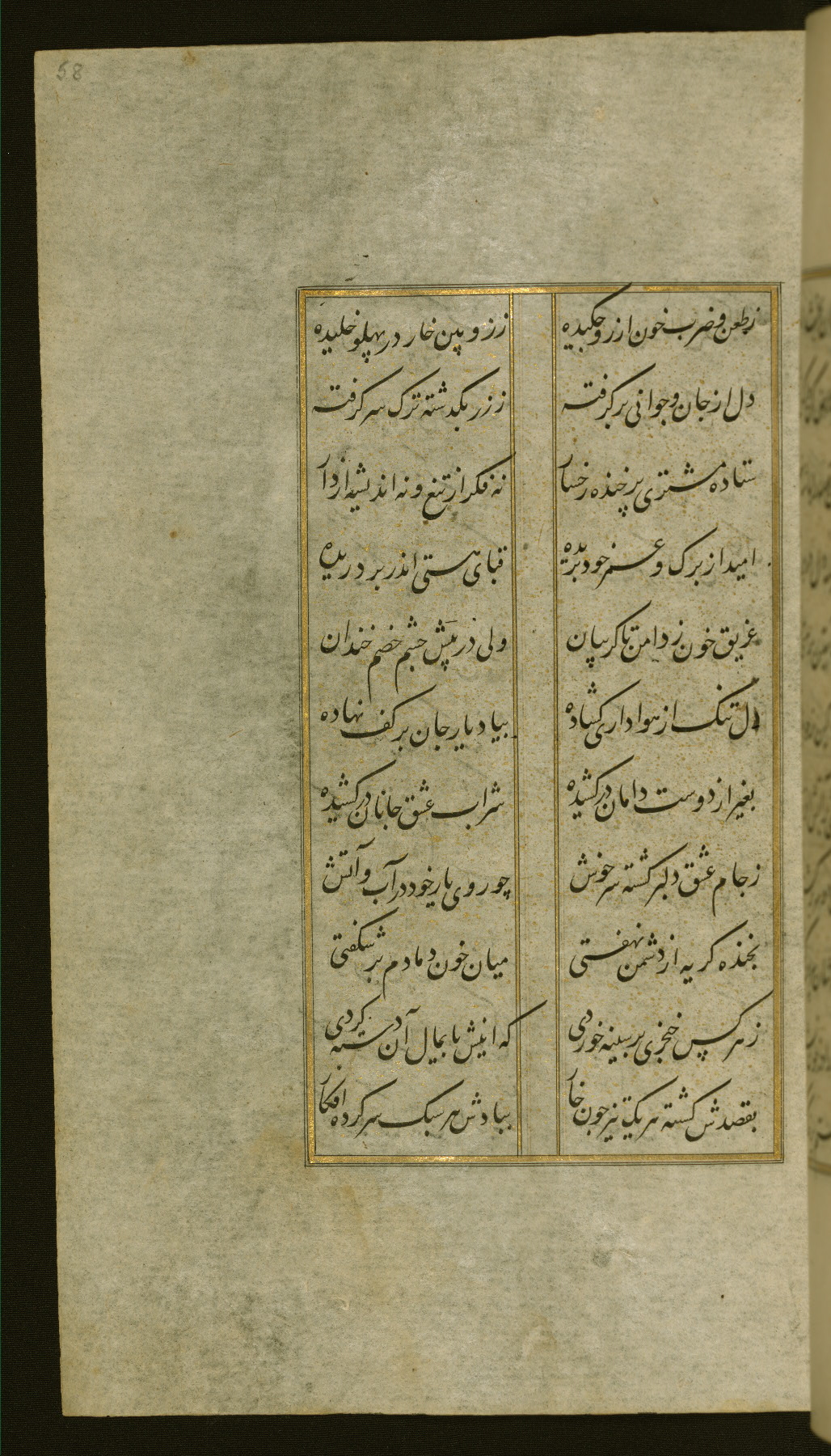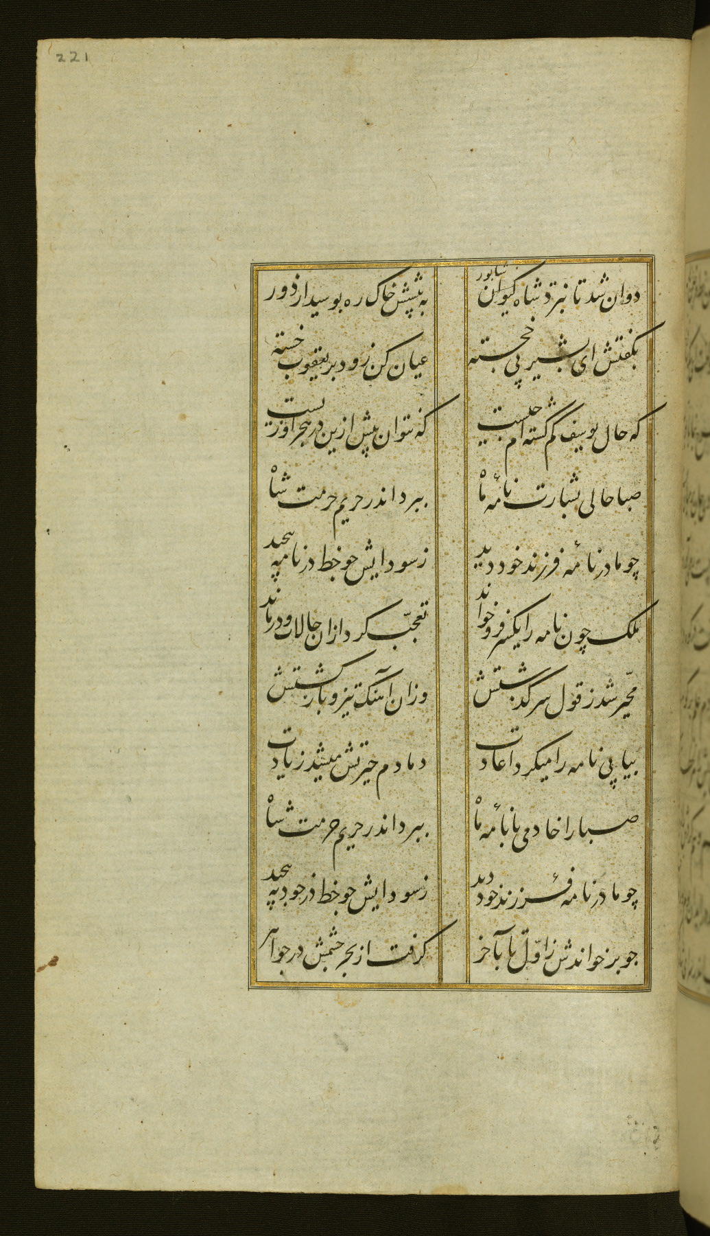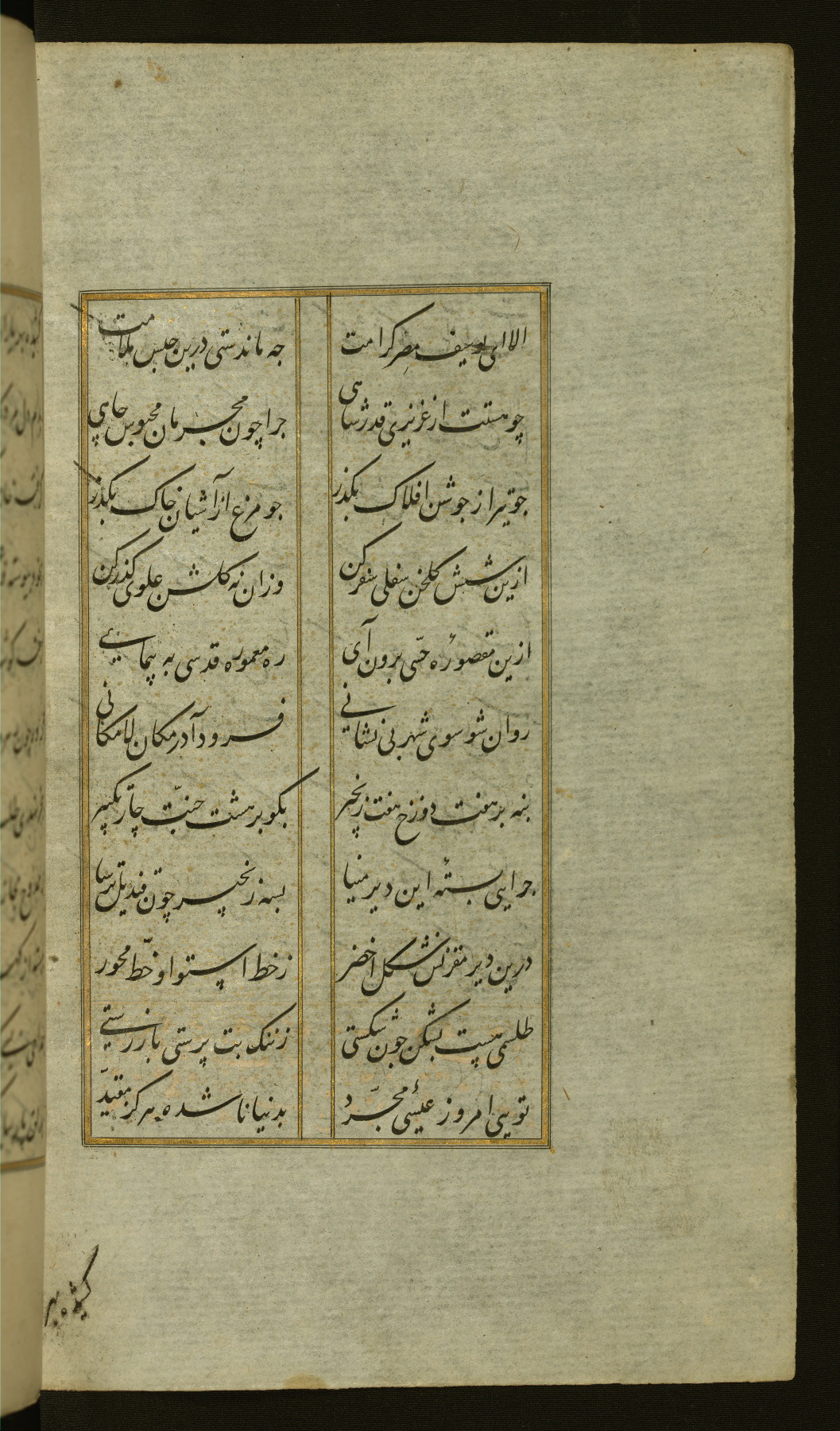 This manuscript is an illustrated copy of the well-known poem recounting the platonic love story between Mihr (the Sun), the son of Shāhpūr, and his vizier's son Mushtarī (Jupiter). The story of 90 chapters was composed by Muḥammad ibn Aḥmad ‘Aṣṣār Tabrīzī (d. 784 AH / 1382 CE). The present copy was written in nasta‘līq script by Murshid al-Kātib in 881 AH / 1476 CE. Considering the number of surviving manuscripts in which this calligrapher’s name is found, it seems he was particularly prolific. The present codex is illustrated with nine paintings. The gold-brushed leather binding with doublures of red leather decorated with filigree work is original to the manuscript.