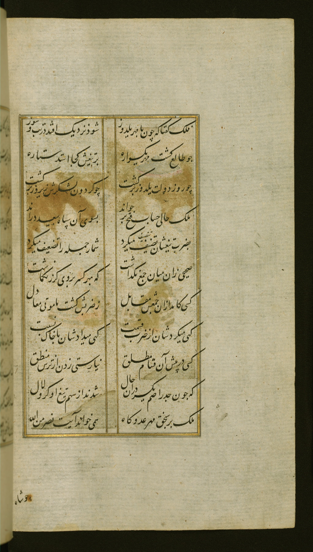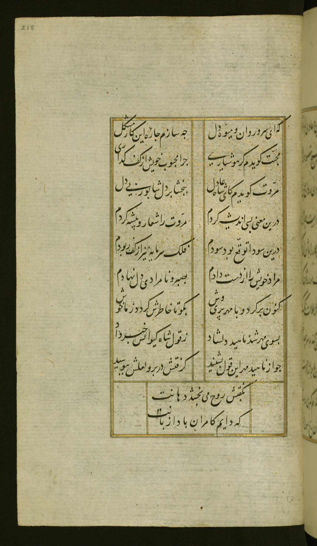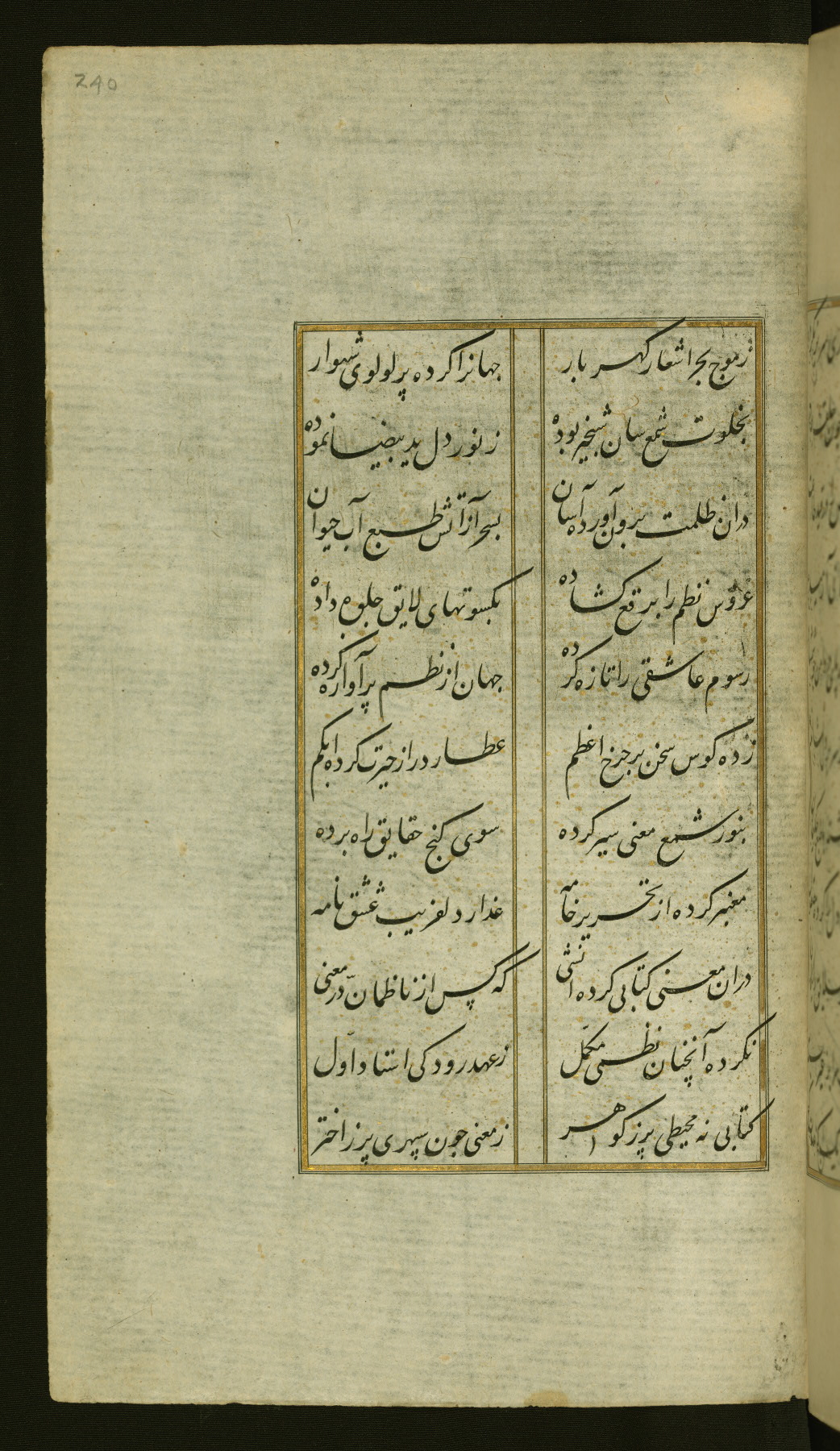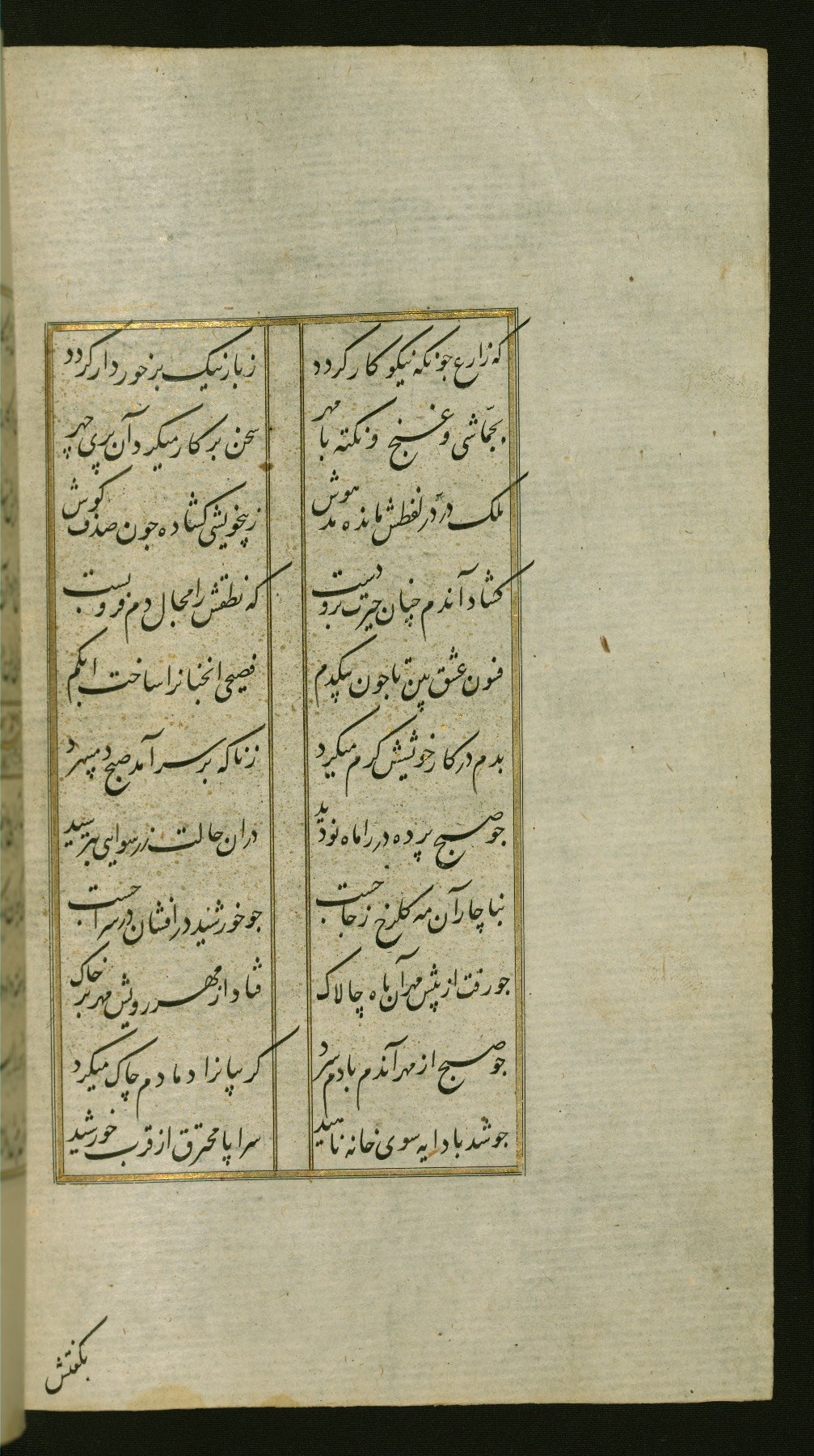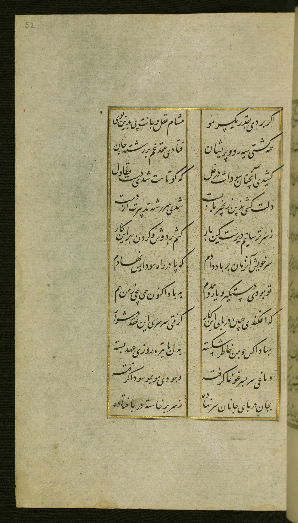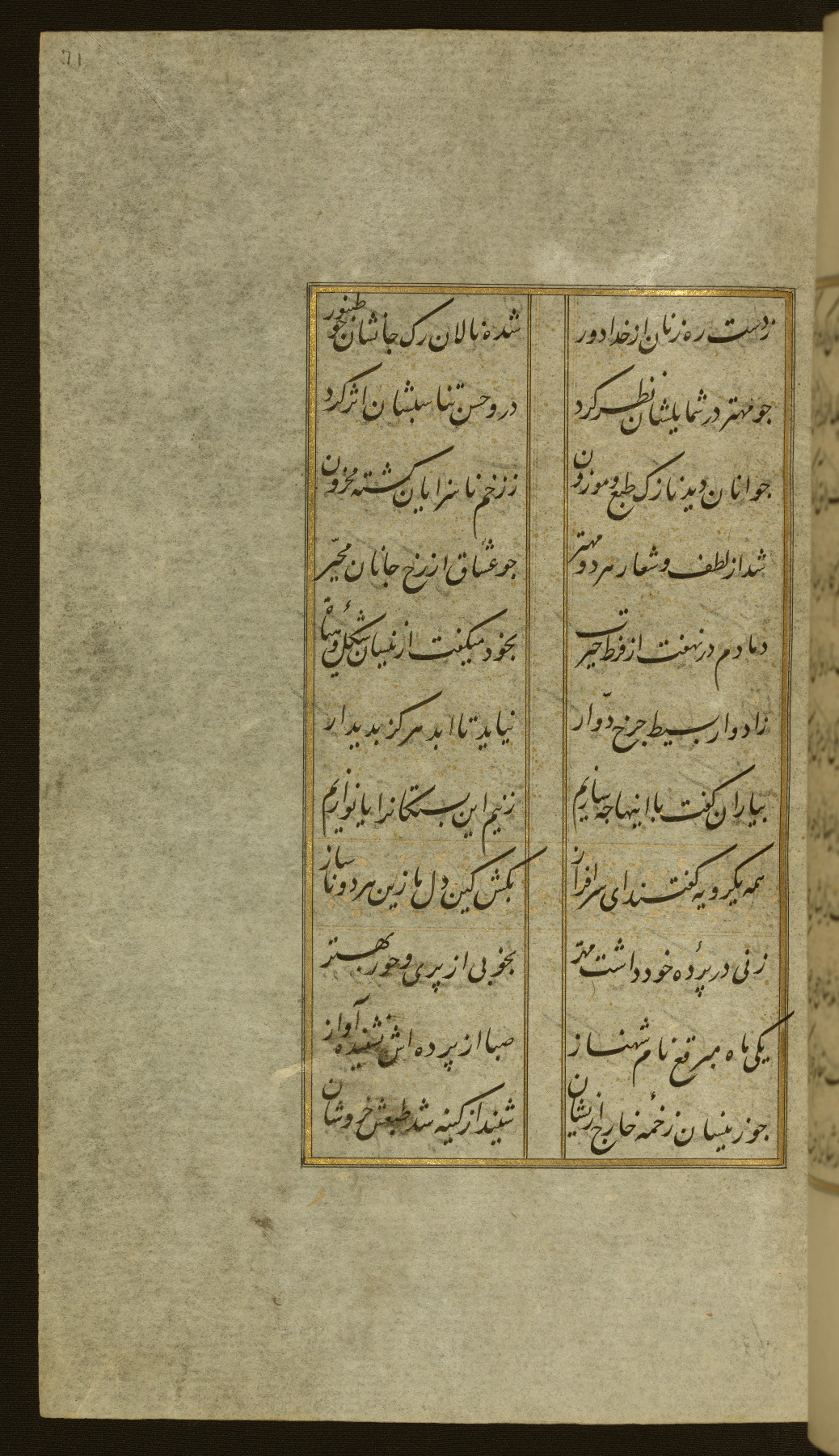 This manuscript is an illustrated copy of the well-known poem recounting the platonic love story between Mihr (the Sun), the son of Shāhpūr, and his vizier's son Mushtarī (Jupiter). The story of 90 chapters was composed by Muḥammad ibn Aḥmad ‘Aṣṣār Tabrīzī (d. 784 AH / 1382 CE). The present copy was written in nasta‘līq script by Murshid al-Kātib in 881 AH / 1476 CE. Considering the number of surviving manuscripts in which this calligrapher’s name is found, it seems he was particularly prolific. The present codex is illustrated with nine paintings. The gold-brushed leather binding with doublures of red leather decorated with filigree work is original to the manuscript.