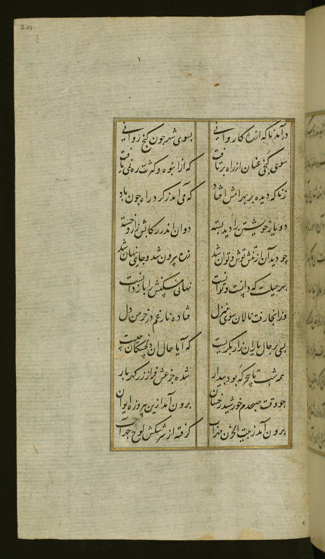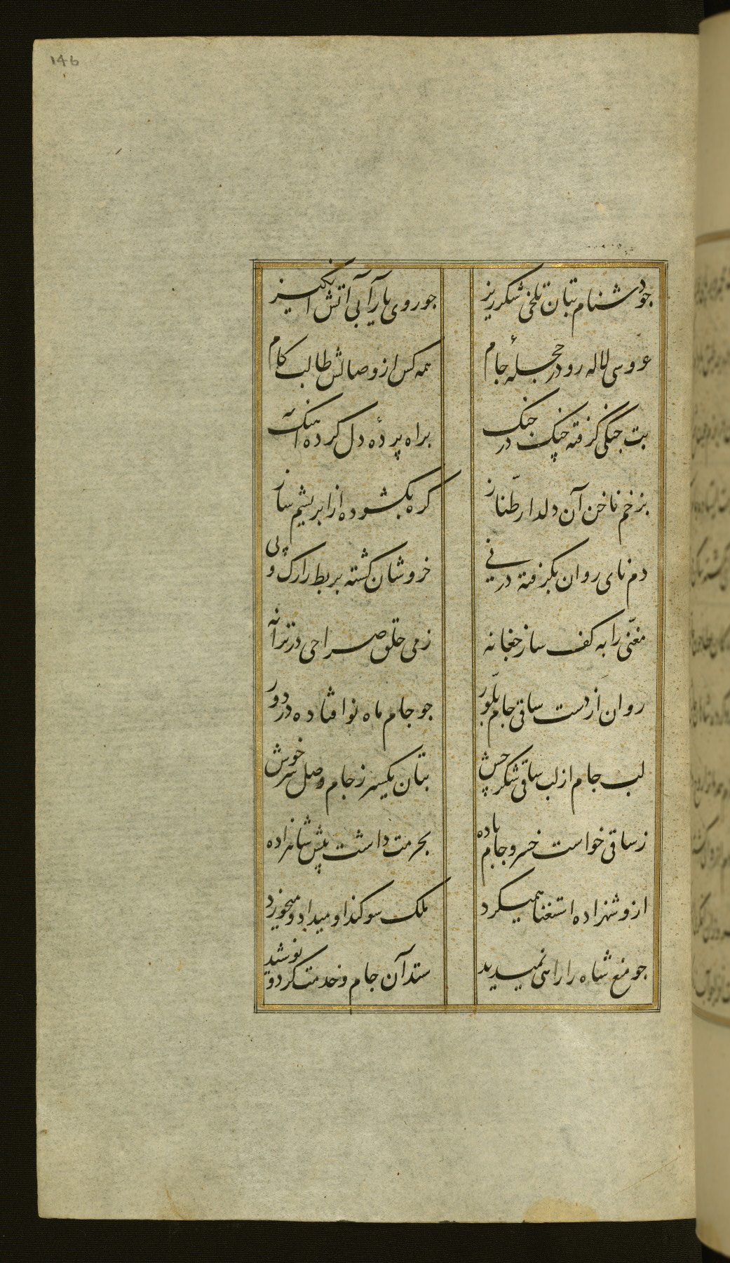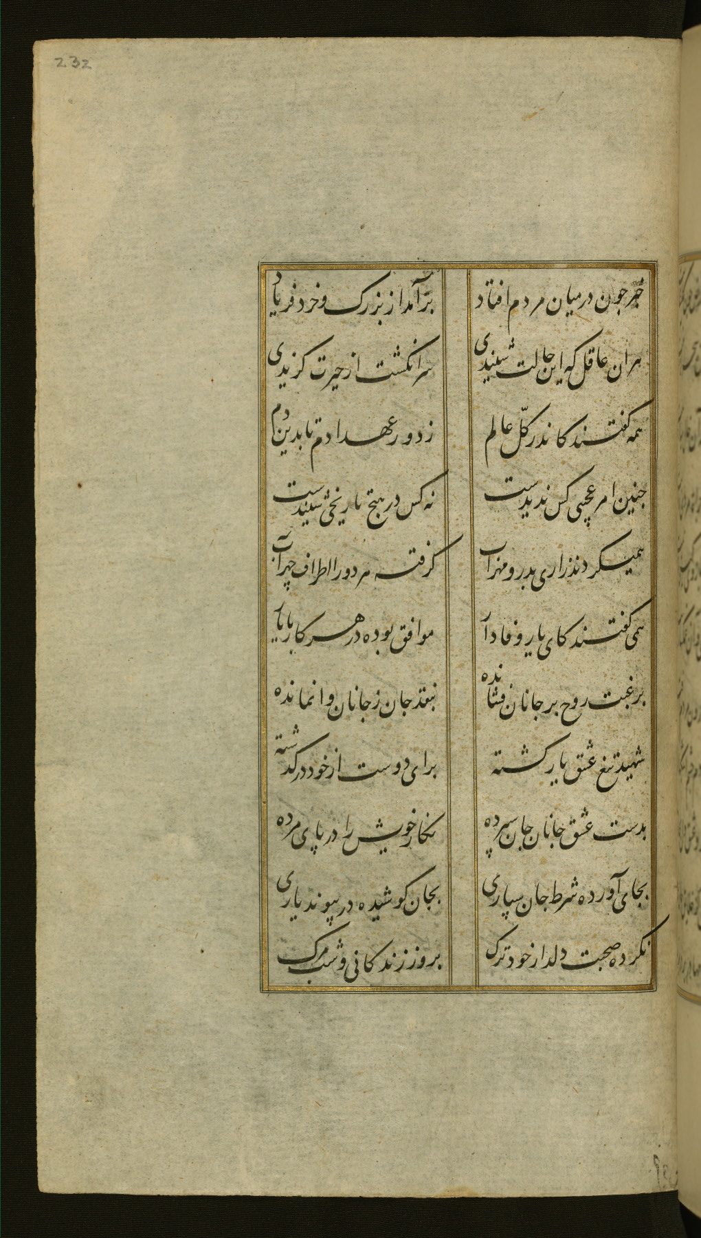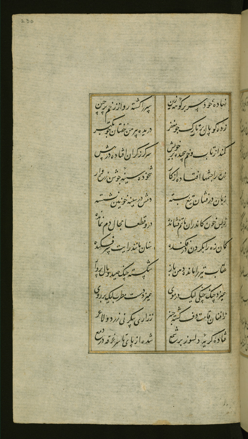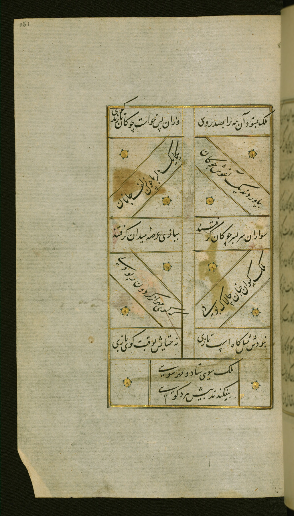 This manuscript is an illustrated copy of the well-known poem recounting the platonic love story between Mihr (the Sun), the son of Shāhpūr, and his vizier's son Mushtarī (Jupiter). The story of 90 chapters was composed by Muḥammad ibn Aḥmad ‘Aṣṣār Tabrīzī (d. 784 AH / 1382 CE). The present copy was written in nasta‘līq script by Murshid al-Kātib in 881 AH / 1476 CE. Considering the number of surviving manuscripts in which this calligrapher’s name is found, it seems he was particularly prolific. The present codex is illustrated with nine paintings. The gold-brushed leather binding with doublures of red leather decorated with filigree work is original to the manuscript.