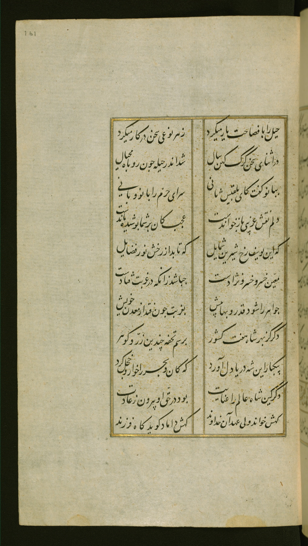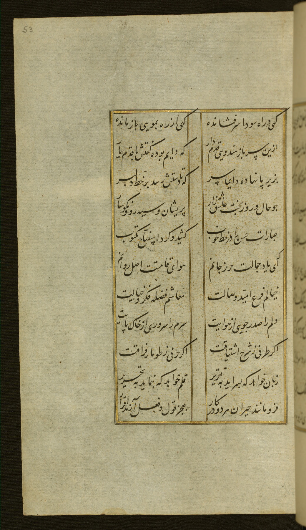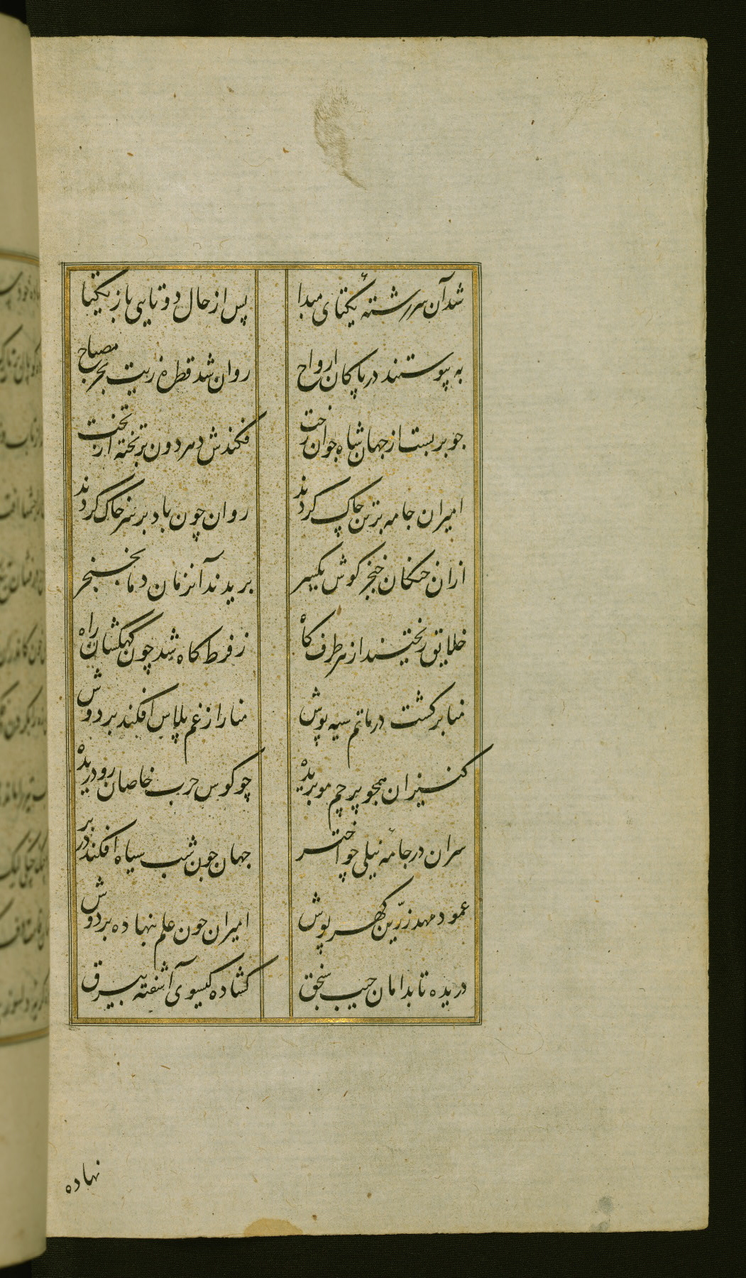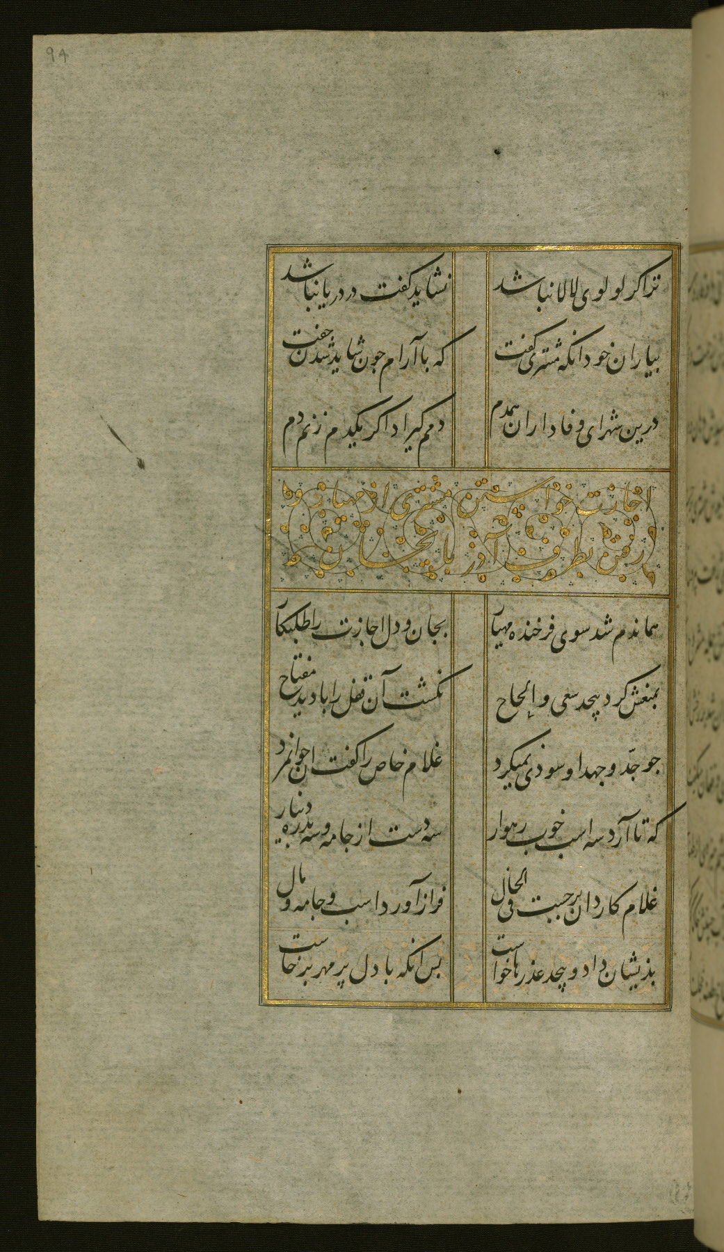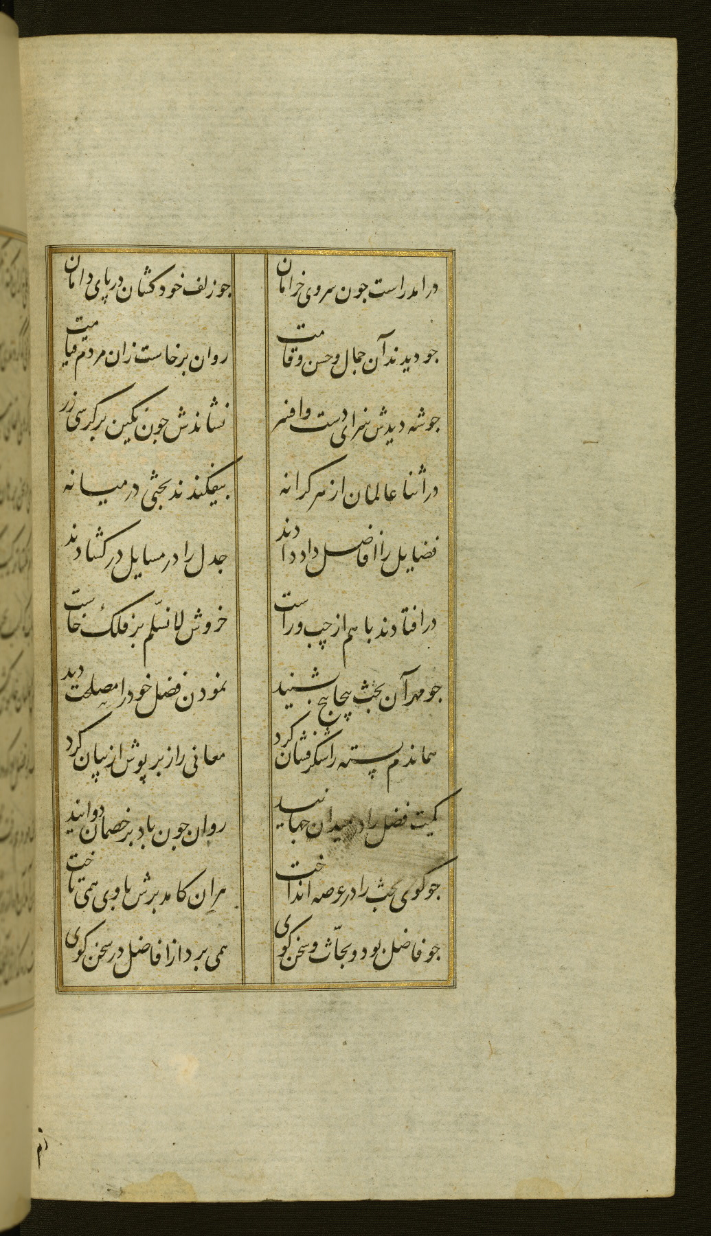 This manuscript is an illustrated copy of the well-known poem recounting the platonic love story between Mihr (the Sun), the son of Shāhpūr, and his vizier's son Mushtarī (Jupiter). The story of 90 chapters was composed by Muḥammad ibn Aḥmad ‘Aṣṣār Tabrīzī (d. 784 AH / 1382 CE). The present copy was written in nasta‘līq script by Murshid al-Kātib in 881 AH / 1476 CE. Considering the number of surviving manuscripts in which this calligrapher’s name is found, it seems he was particularly prolific. The present codex is illustrated with nine paintings. The gold-brushed leather binding with doublures of red leather decorated with filigree work is original to the manuscript.