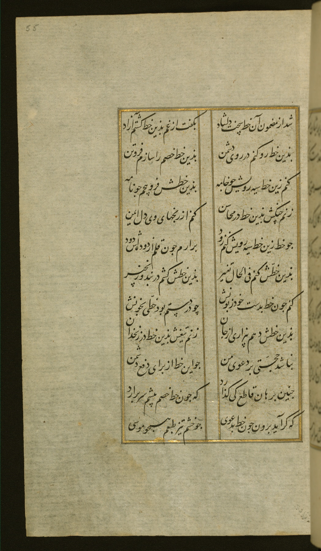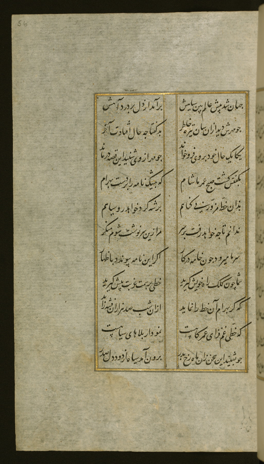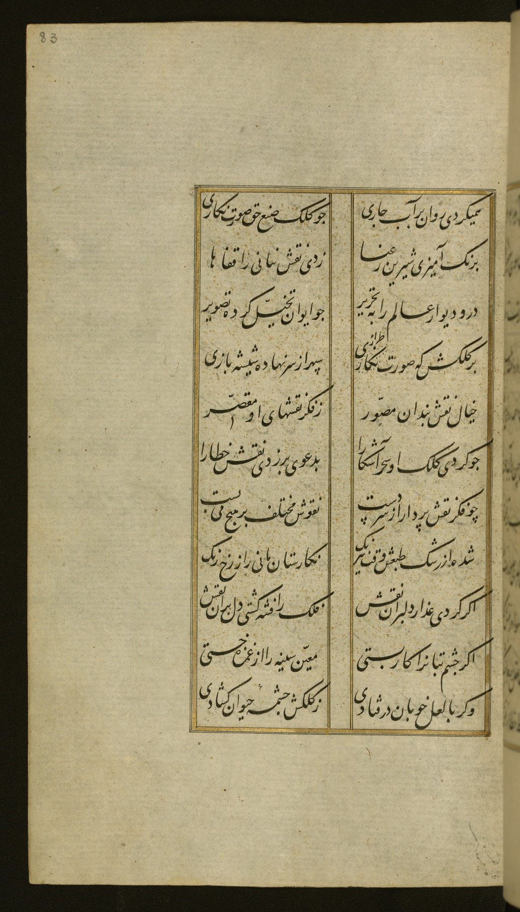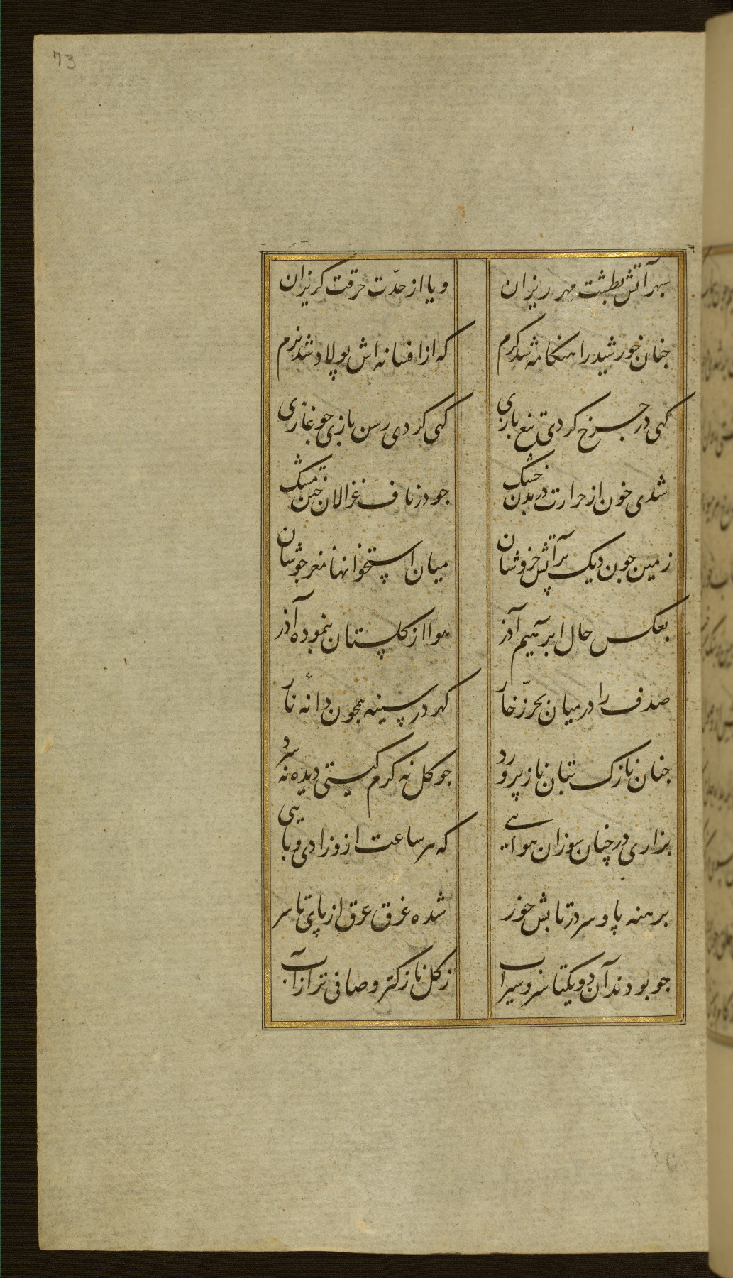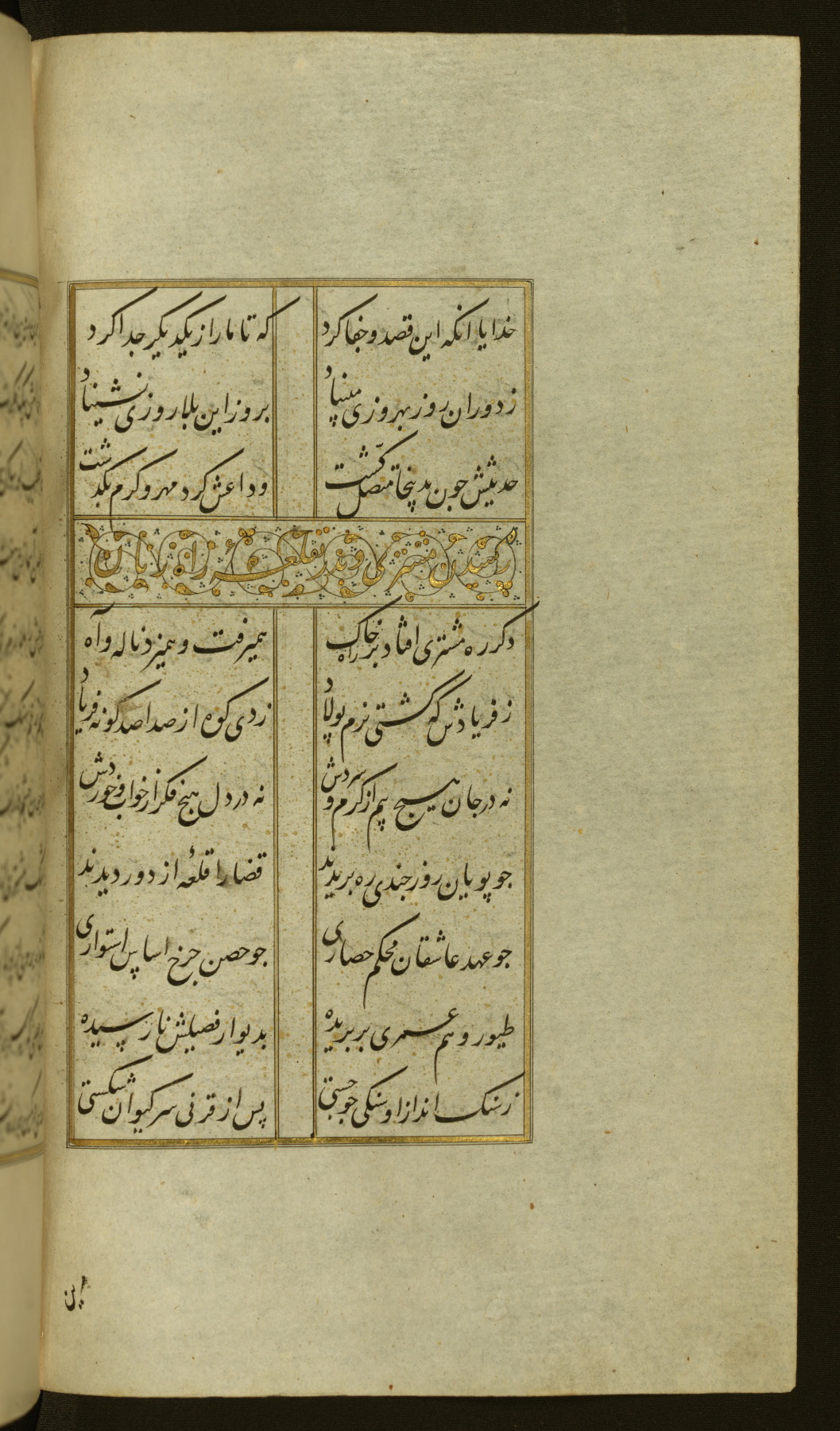 This manuscript is an illustrated copy of the well-known poem recounting the platonic love story between Mihr (the Sun), the son of Shāhpūr, and his vizier's son Mushtarī (Jupiter). The story of 90 chapters was composed by Muḥammad ibn Aḥmad ‘Aṣṣār Tabrīzī (d. 784 AH / 1382 CE). The present copy was written in nasta‘līq script by Murshid al-Kātib in 881 AH / 1476 CE. Considering the number of surviving manuscripts in which this calligrapher’s name is found, it seems he was particularly prolific. The present codex is illustrated with nine paintings. The gold-brushed leather binding with doublures of red leather decorated with filigree work is original to the manuscript.