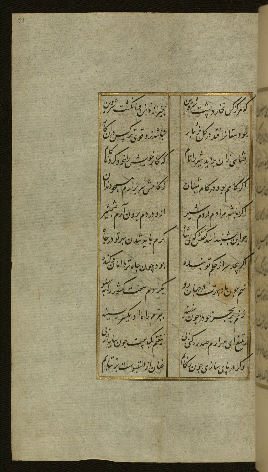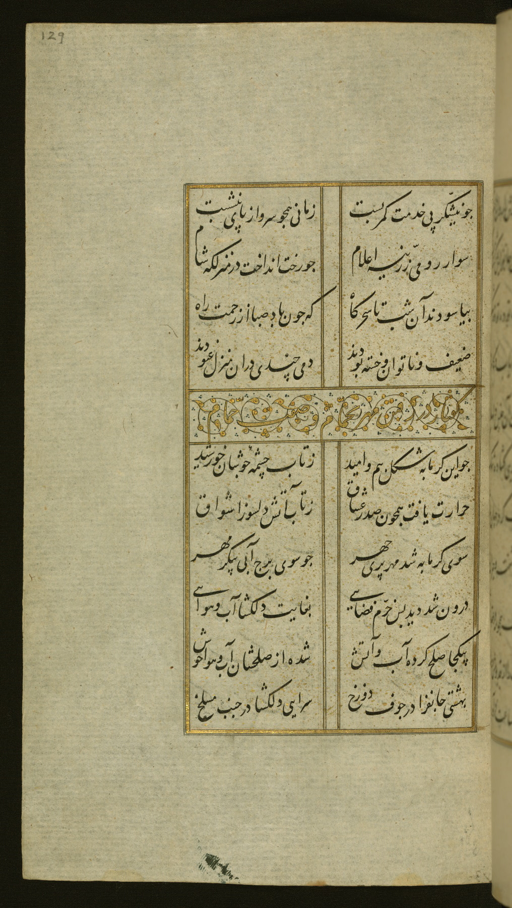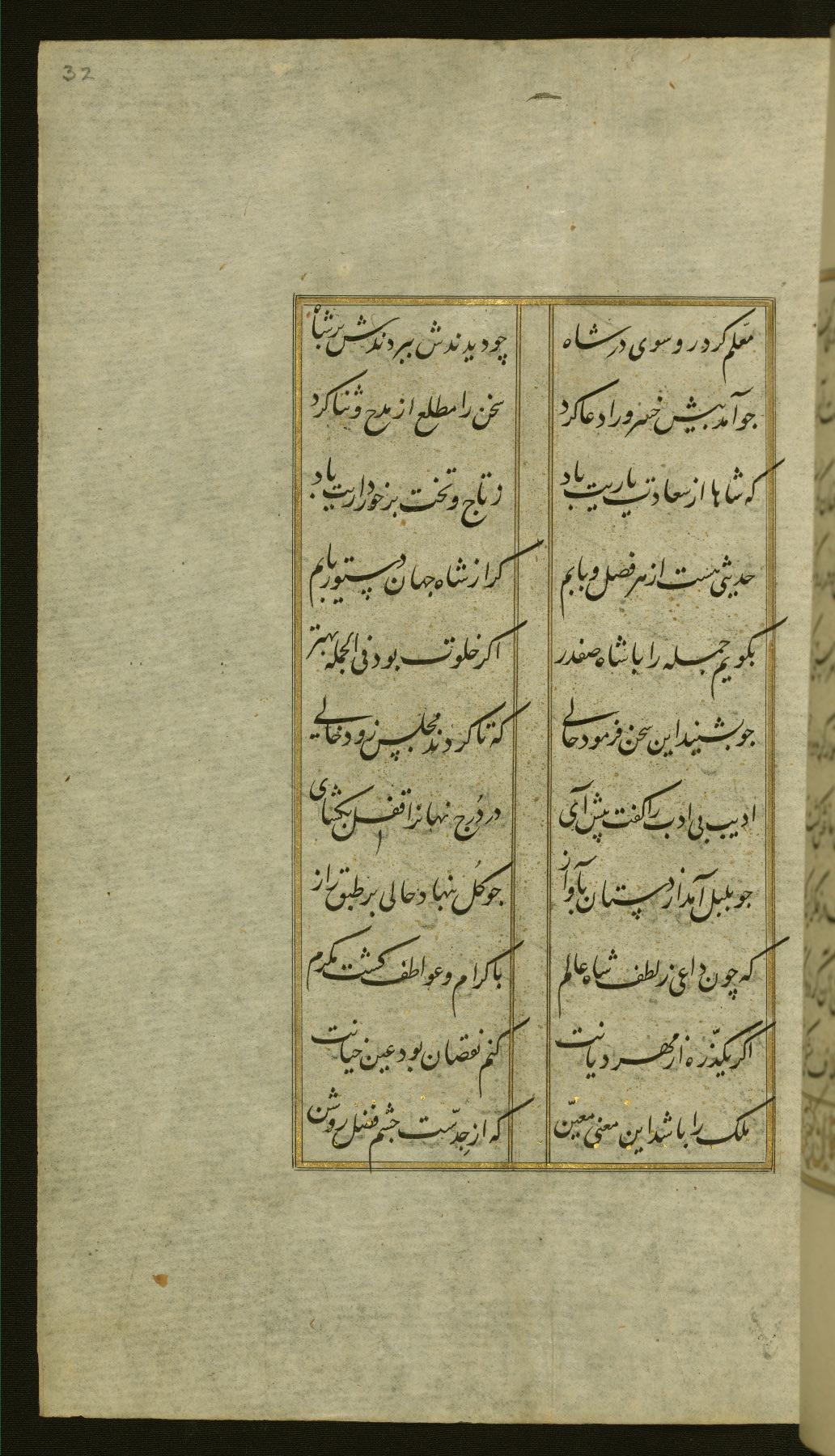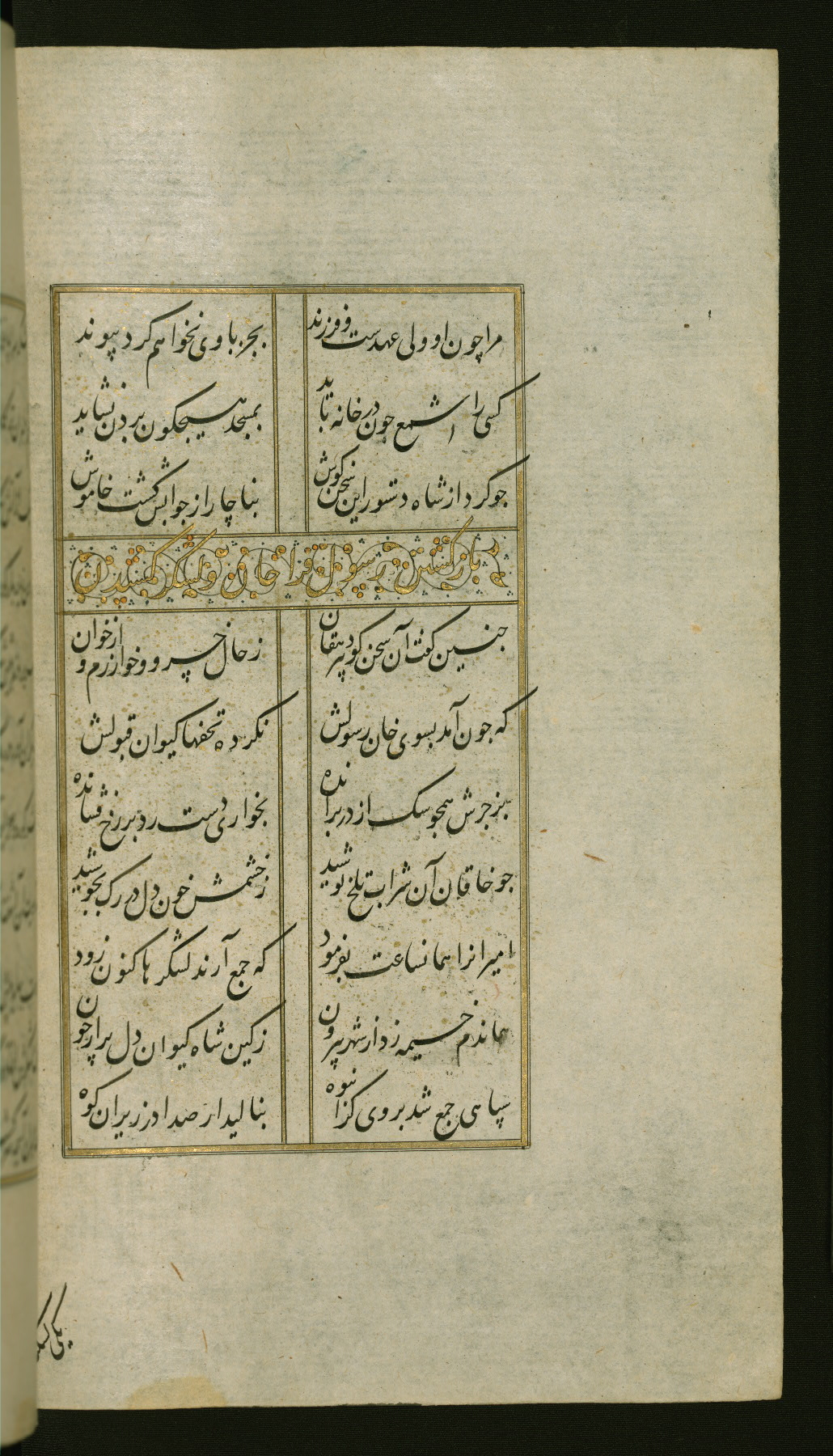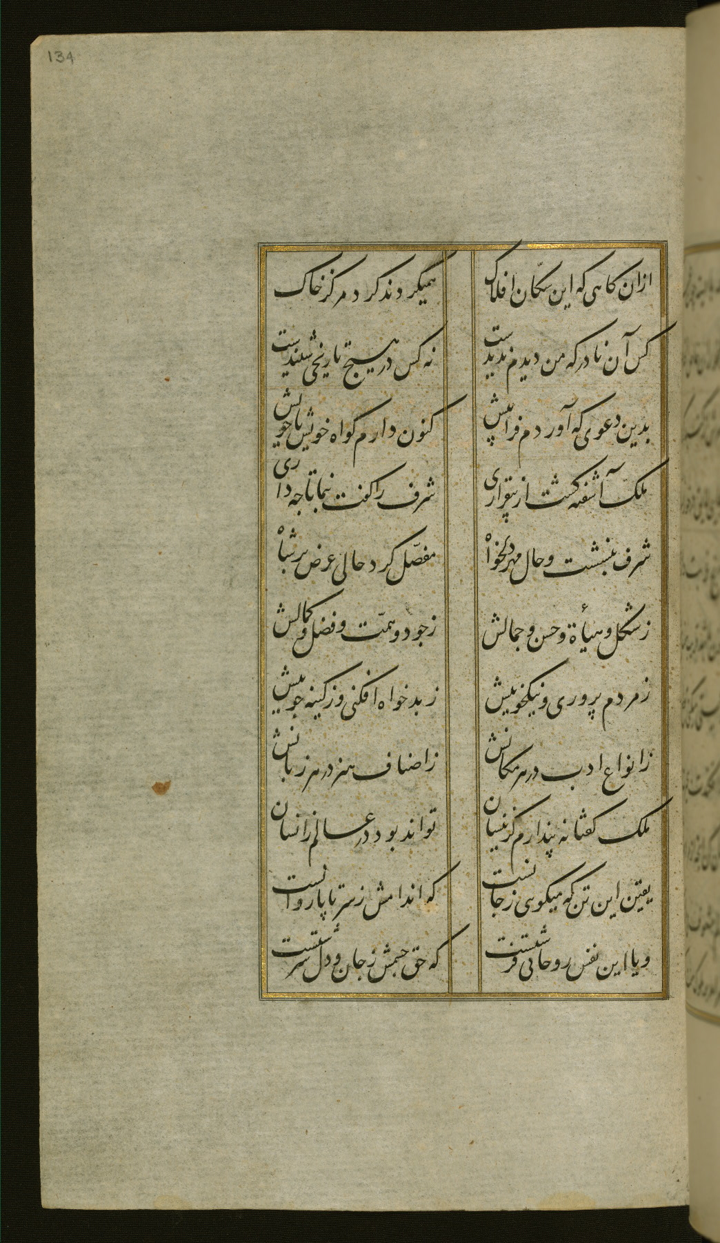 This manuscript is an illustrated copy of the well-known poem recounting the platonic love story between Mihr (the Sun), the son of Shāhpūr, and his vizier's son Mushtarī (Jupiter). The story of 90 chapters was composed by Muḥammad ibn Aḥmad ‘Aṣṣār Tabrīzī (d. 784 AH / 1382 CE). The present copy was written in nasta‘līq script by Murshid al-Kātib in 881 AH / 1476 CE. Considering the number of surviving manuscripts in which this calligrapher’s name is found, it seems he was particularly prolific. The present codex is illustrated with nine paintings. The gold-brushed leather binding with doublures of red leather decorated with filigree work is original to the manuscript.