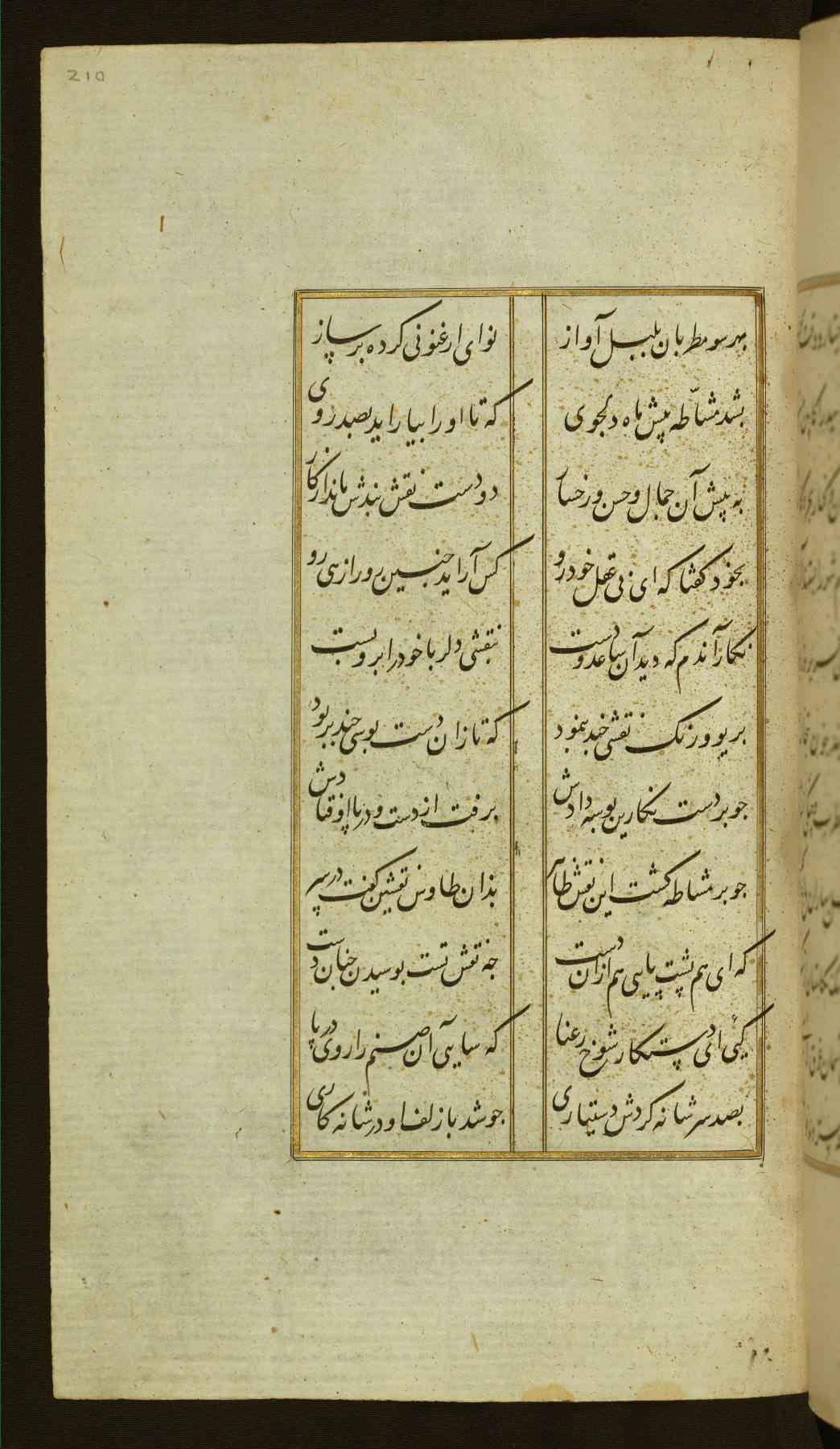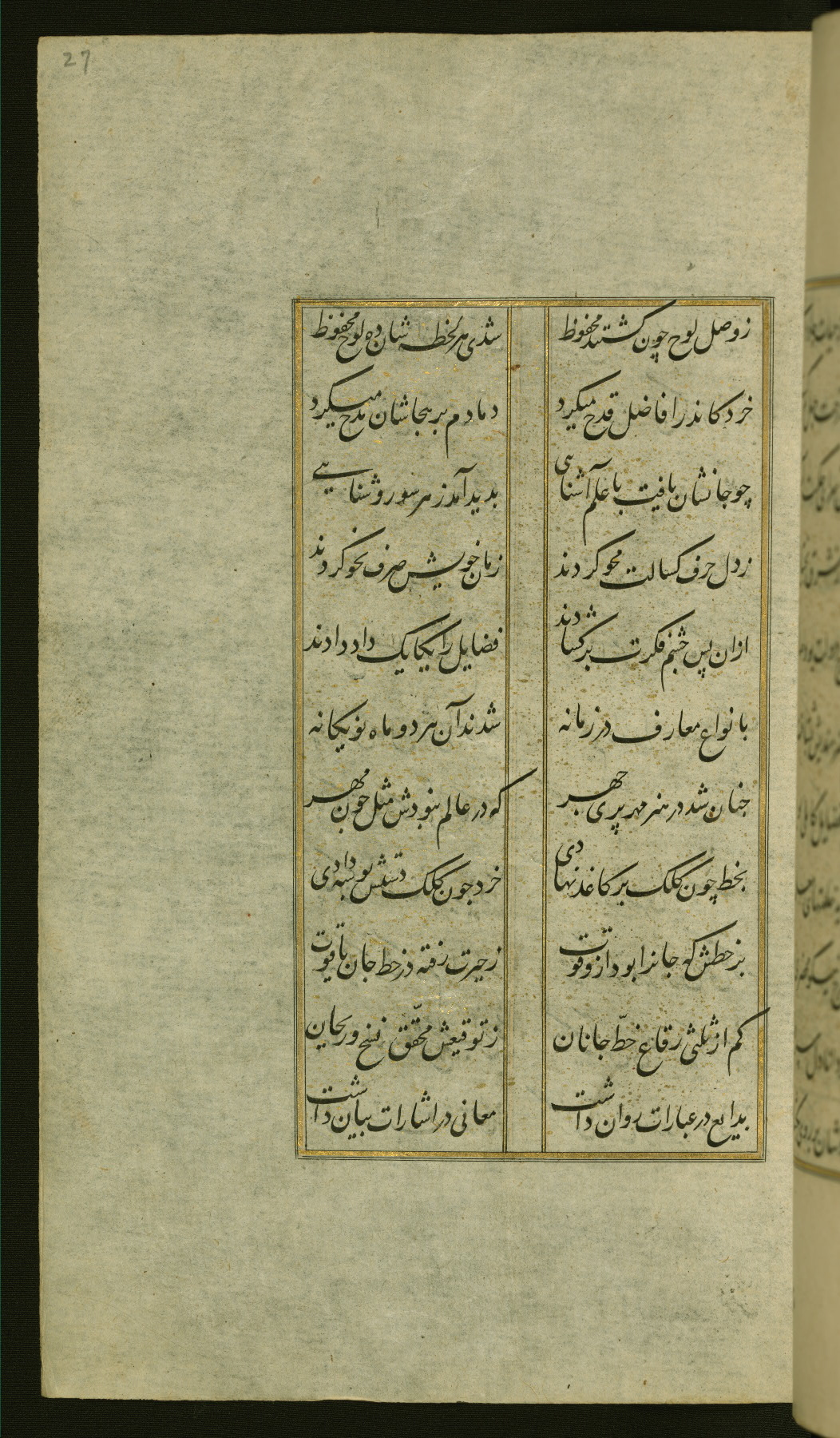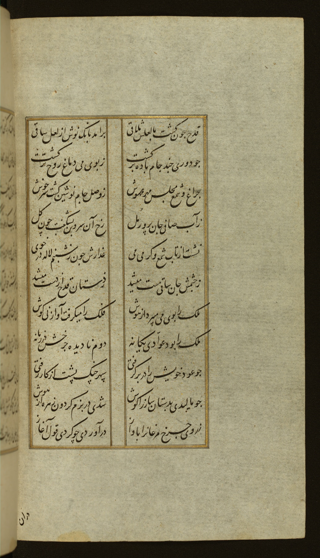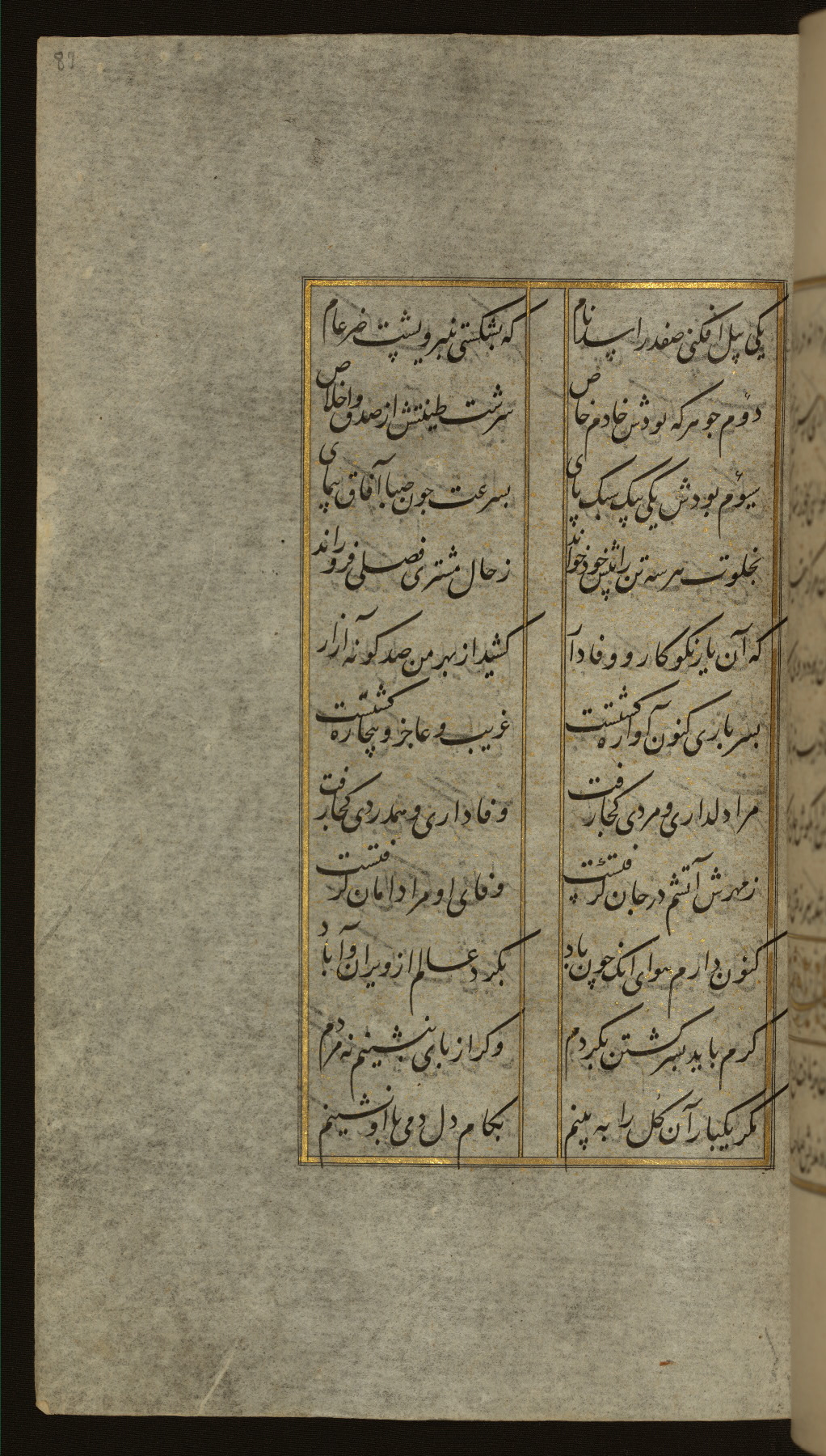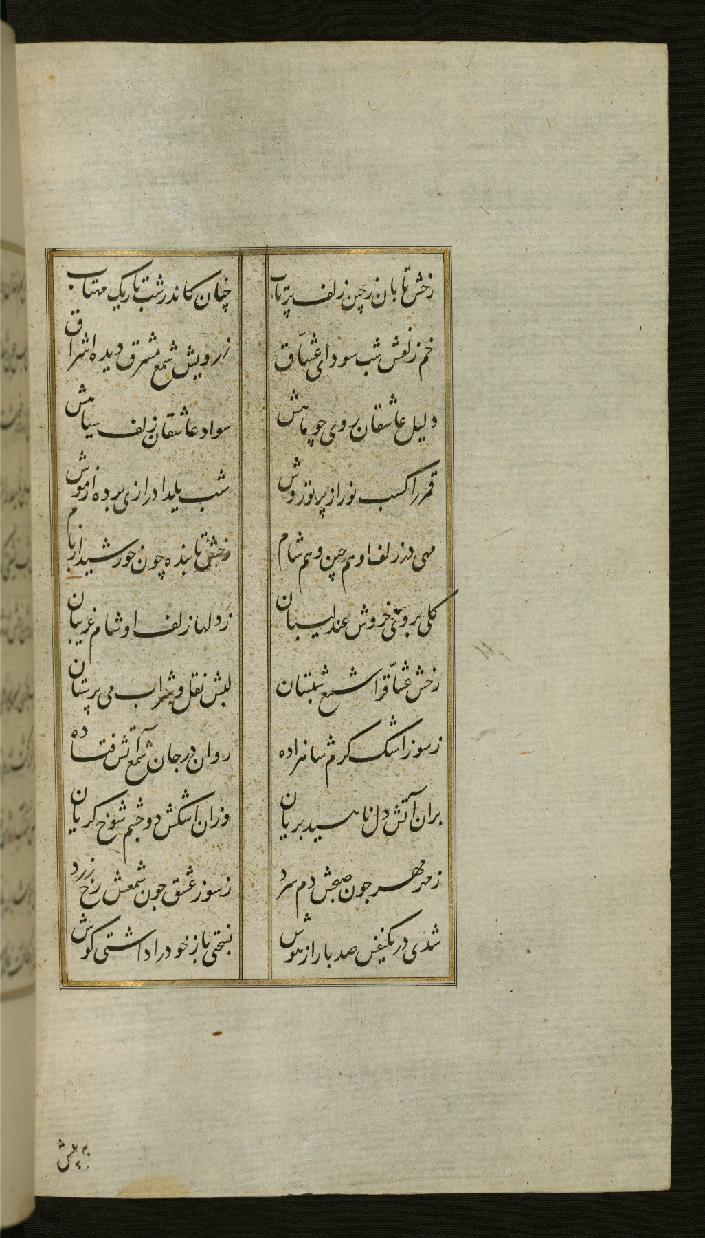 This manuscript is an illustrated copy of the well-known poem recounting the platonic love story between Mihr (the Sun), the son of Shāhpūr, and his vizier's son Mushtarī (Jupiter). The story of 90 chapters was composed by Muḥammad ibn Aḥmad ‘Aṣṣār Tabrīzī (d. 784 AH / 1382 CE). The present copy was written in nasta‘līq script by Murshid al-Kātib in 881 AH / 1476 CE. Considering the number of surviving manuscripts in which this calligrapher’s name is found, it seems he was particularly prolific. The present codex is illustrated with nine paintings. The gold-brushed leather binding with doublures of red leather decorated with filigree work is original to the manuscript.