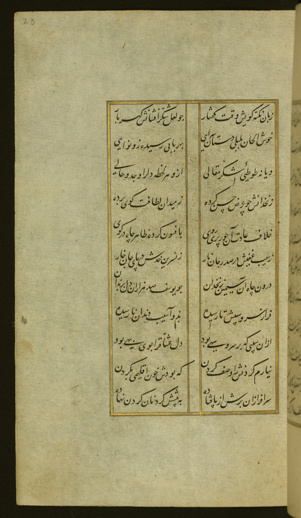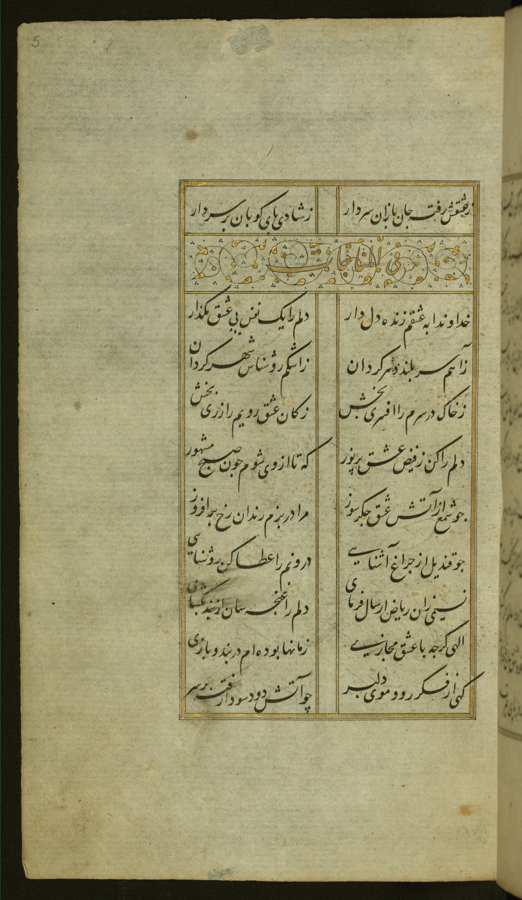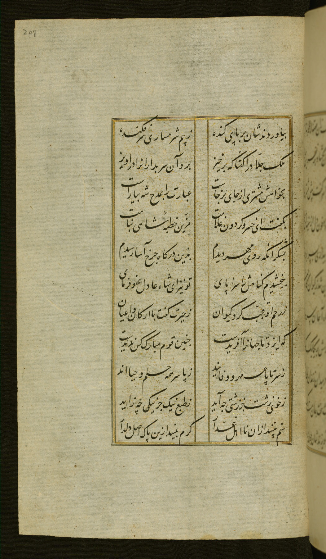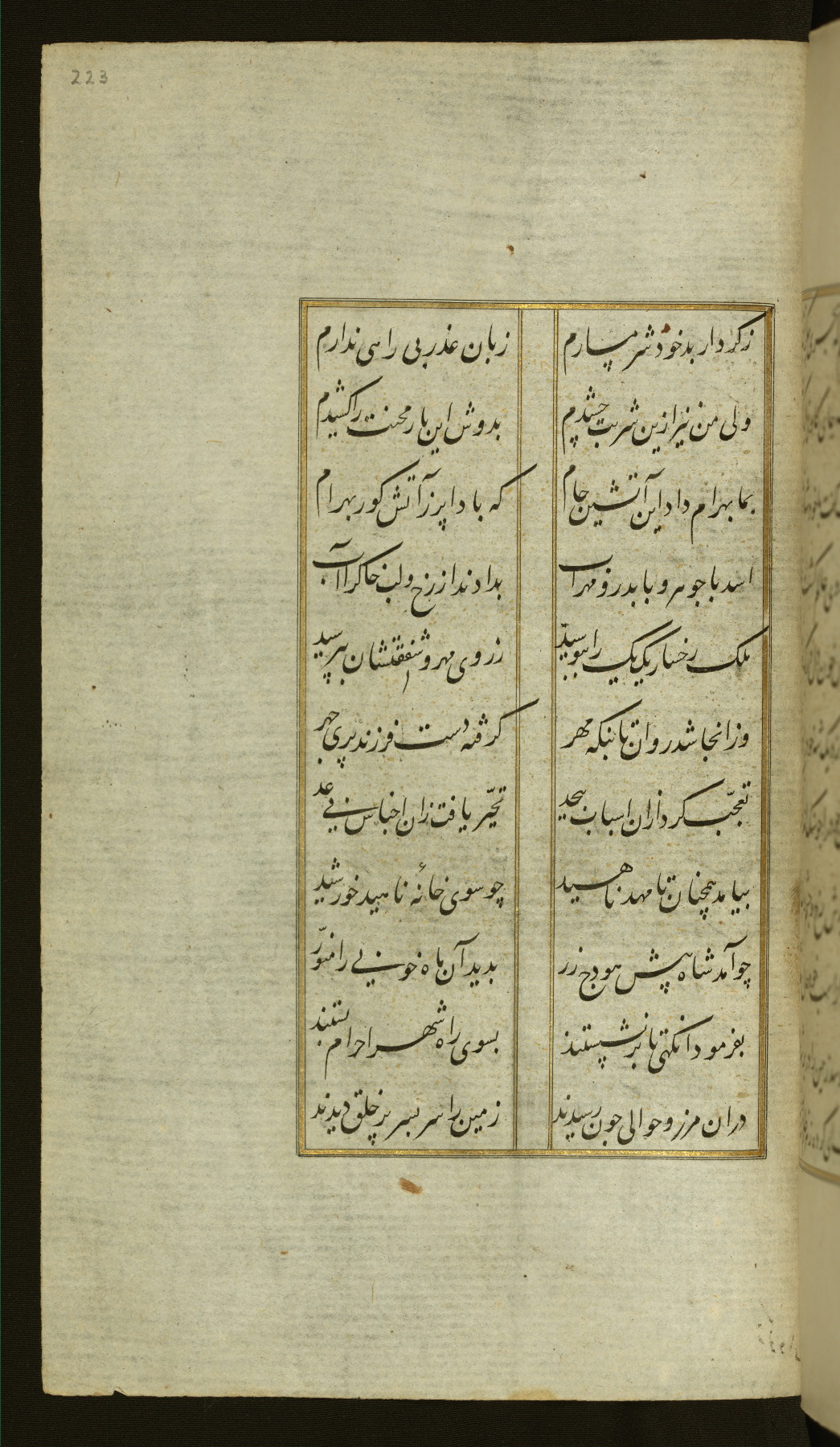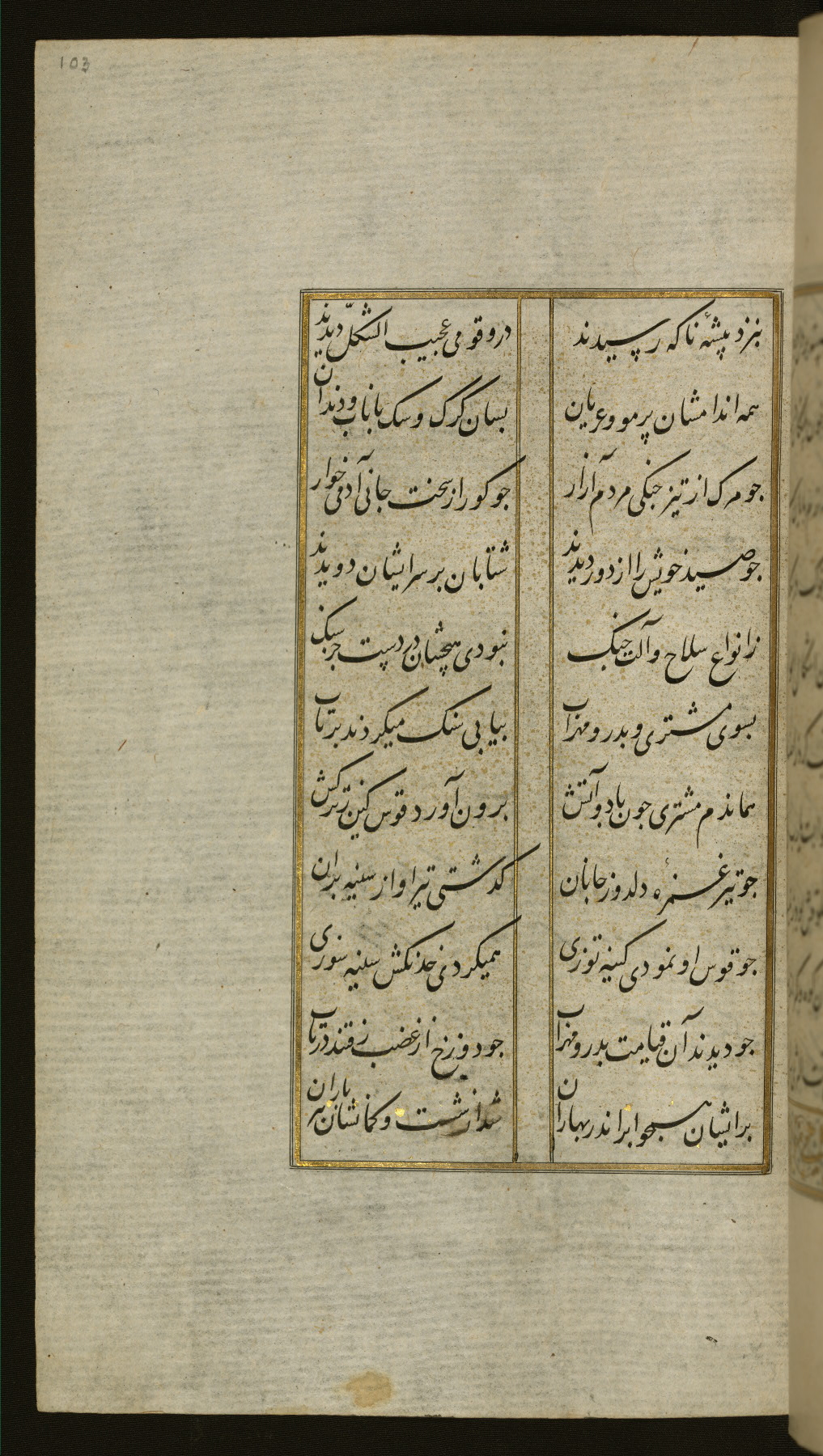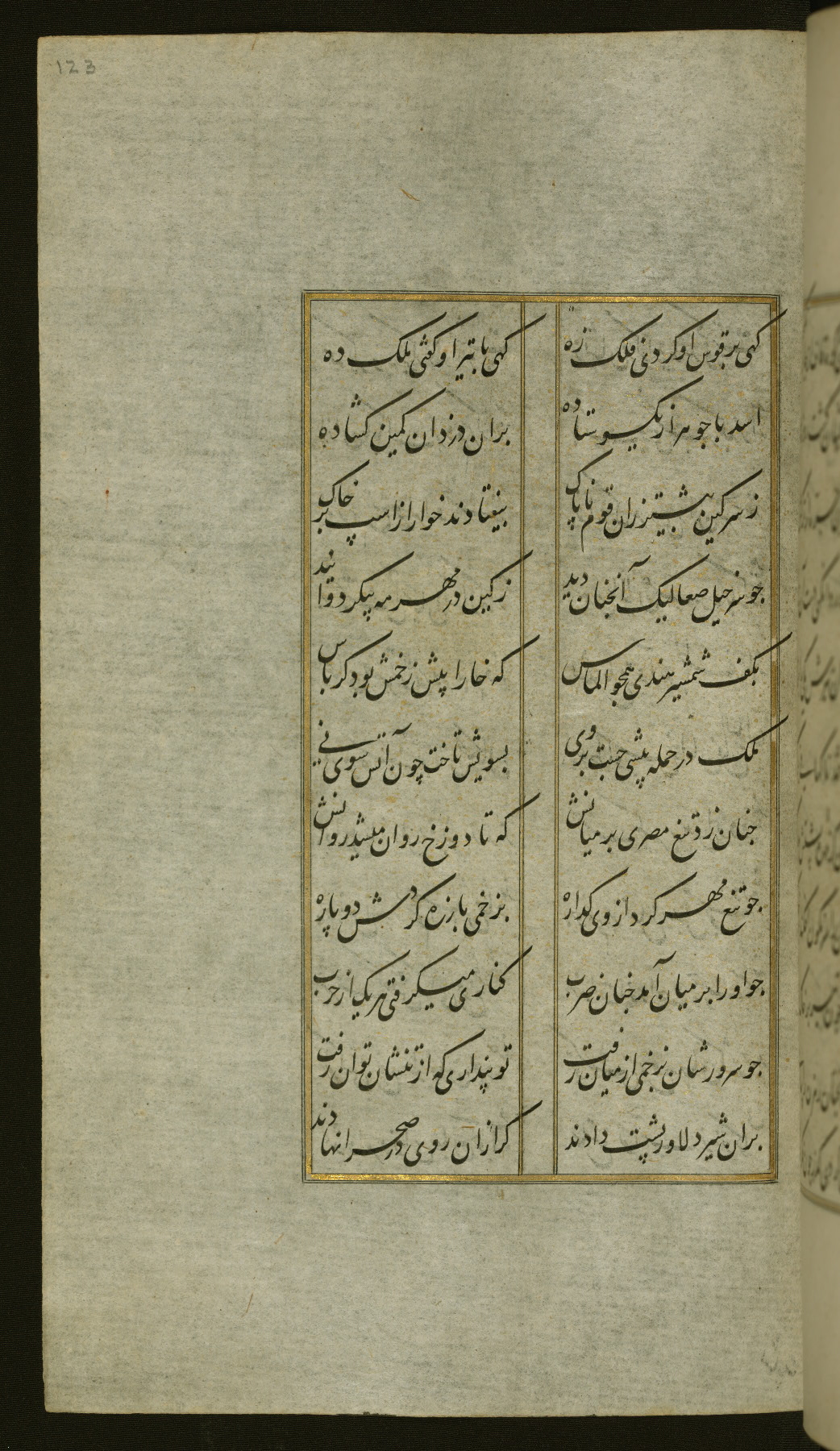 This manuscript is an illustrated copy of the well-known poem recounting the platonic love story between Mihr (the Sun), the son of Shāhpūr, and his vizier's son Mushtarī (Jupiter). The story of 90 chapters was composed by Muḥammad ibn Aḥmad ‘Aṣṣār Tabrīzī (d. 784 AH / 1382 CE). The present copy was written in nasta‘līq script by Murshid al-Kātib in 881 AH / 1476 CE. Considering the number of surviving manuscripts in which this calligrapher’s name is found, it seems he was particularly prolific. The present codex is illustrated with nine paintings. The gold-brushed leather binding with doublures of red leather decorated with filigree work is original to the manuscript.