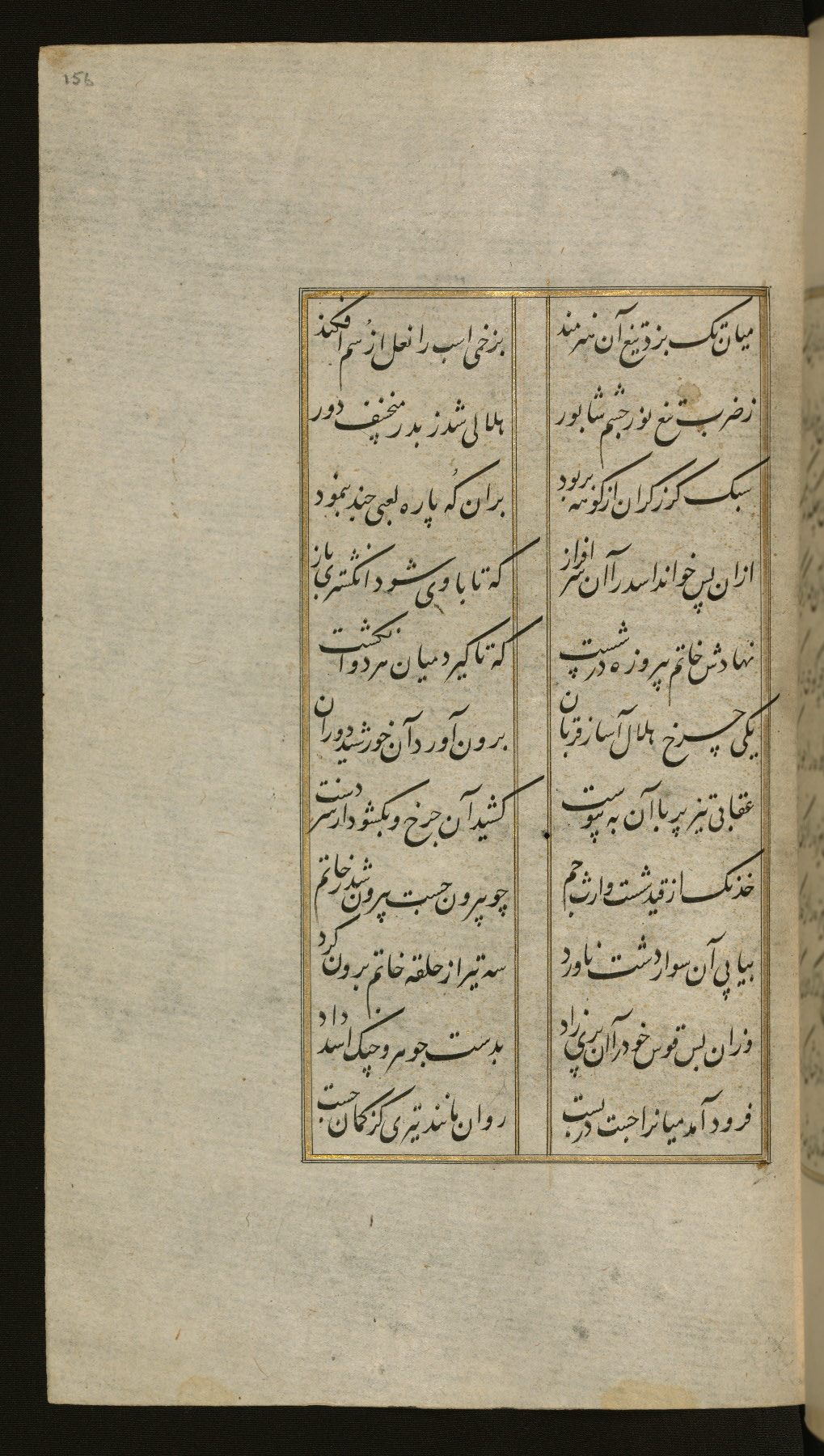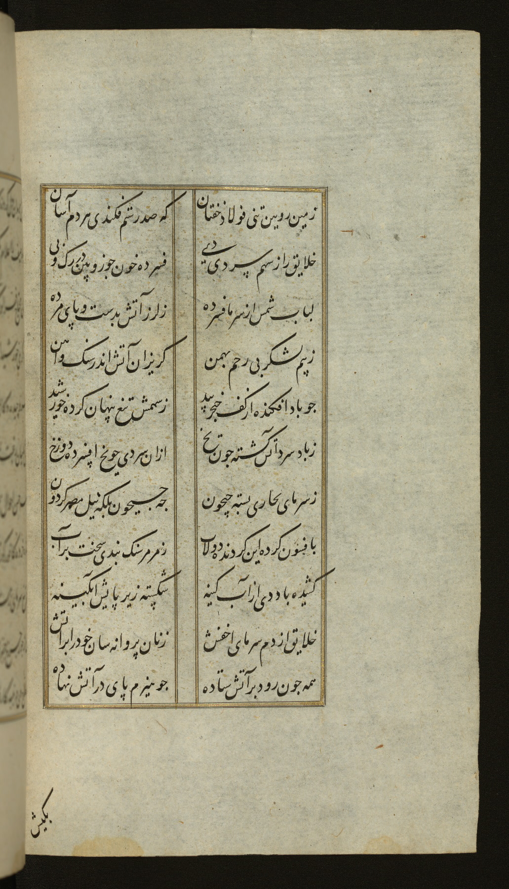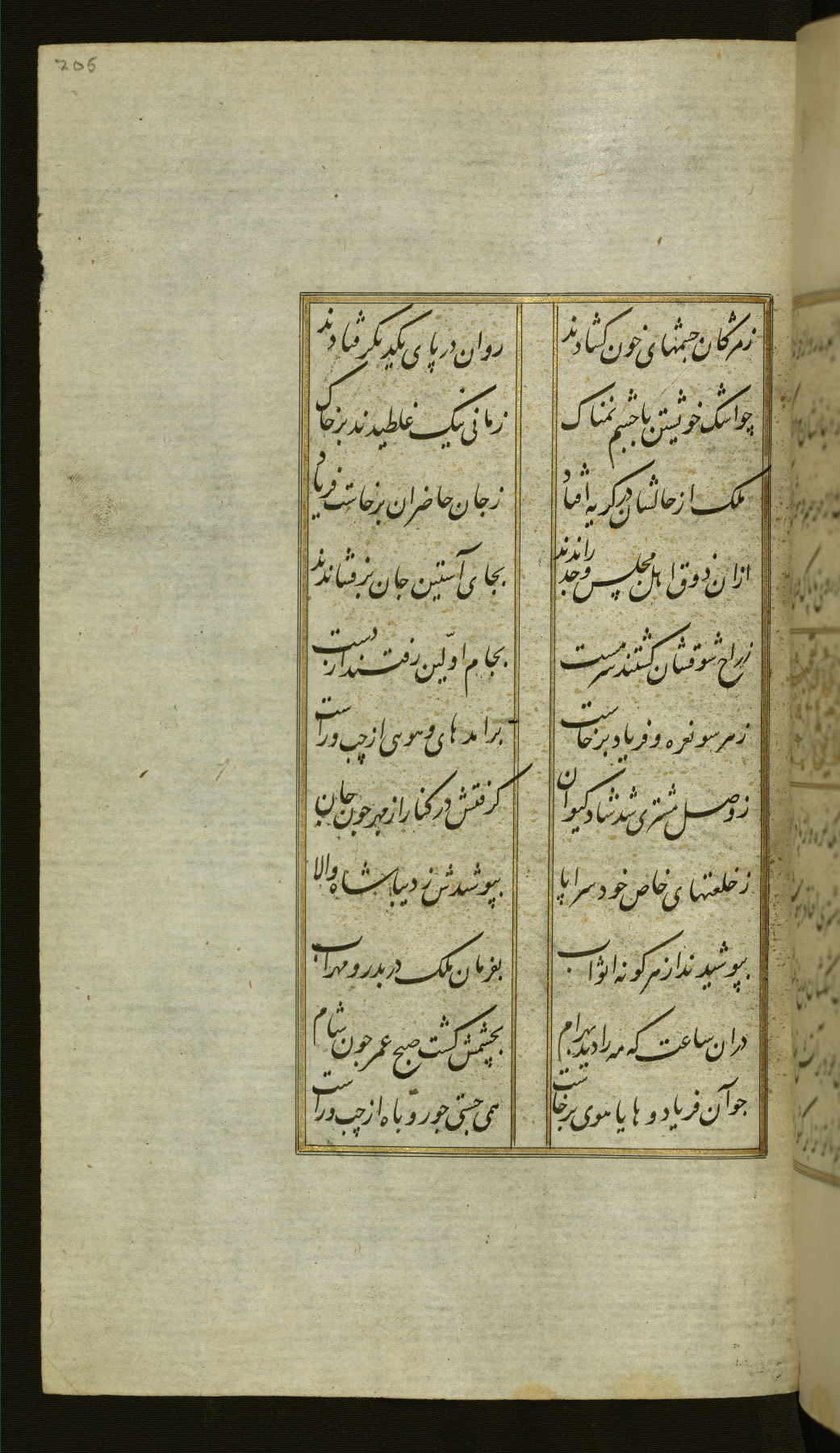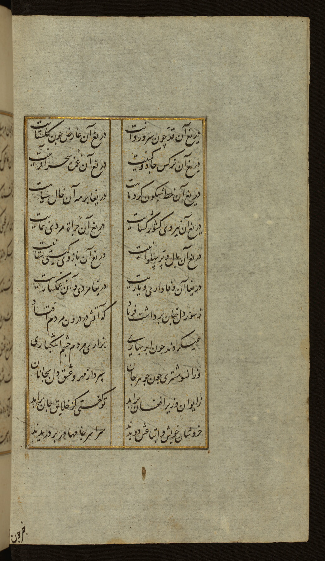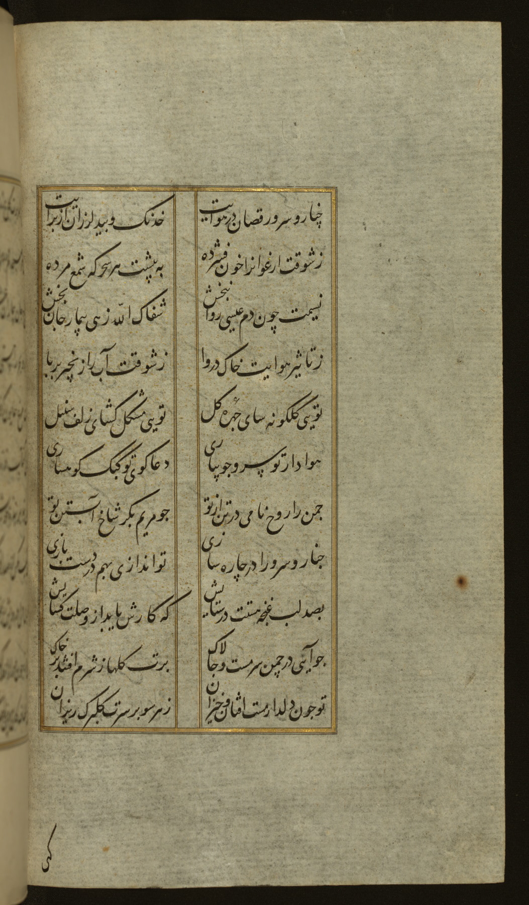 This manuscript is an illustrated copy of the well-known poem recounting the platonic love story between Mihr (the Sun), the son of Shāhpūr, and his vizier's son Mushtarī (Jupiter). The story of 90 chapters was composed by Muḥammad ibn Aḥmad ‘Aṣṣār Tabrīzī (d. 784 AH / 1382 CE). The present copy was written in nasta‘līq script by Murshid al-Kātib in 881 AH / 1476 CE. Considering the number of surviving manuscripts in which this calligrapher’s name is found, it seems he was particularly prolific. The present codex is illustrated with nine paintings. The gold-brushed leather binding with doublures of red leather decorated with filigree work is original to the manuscript.