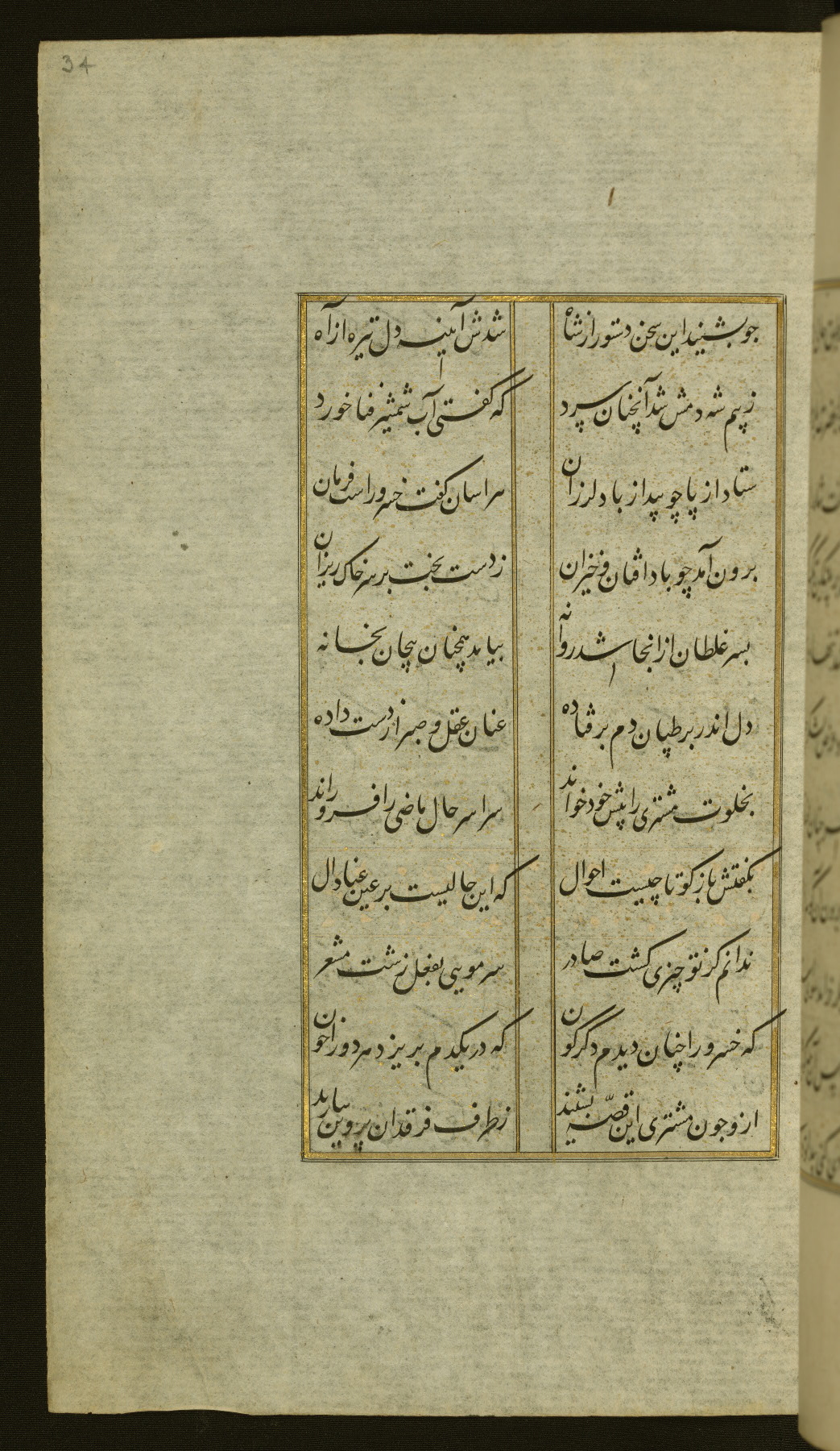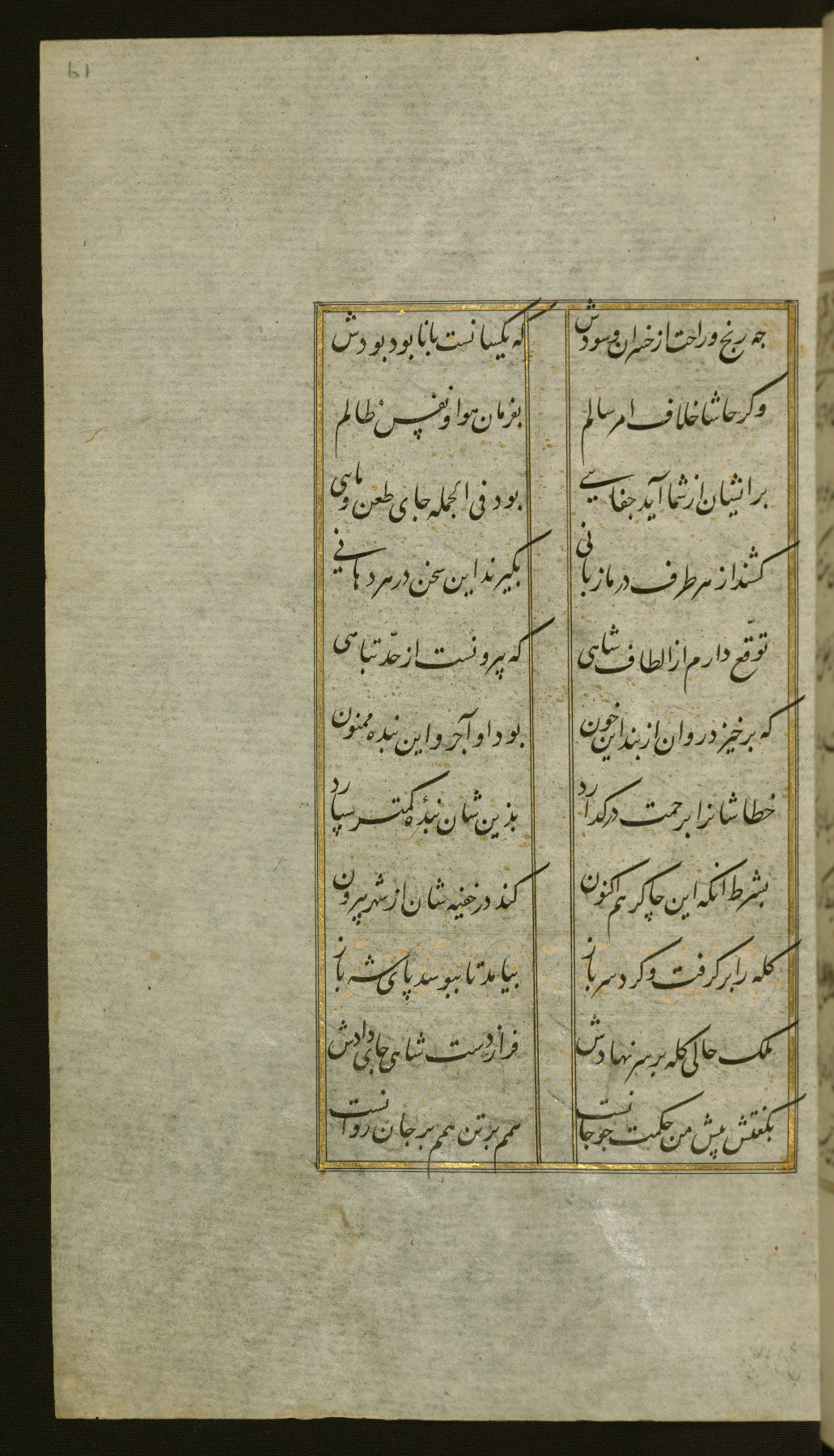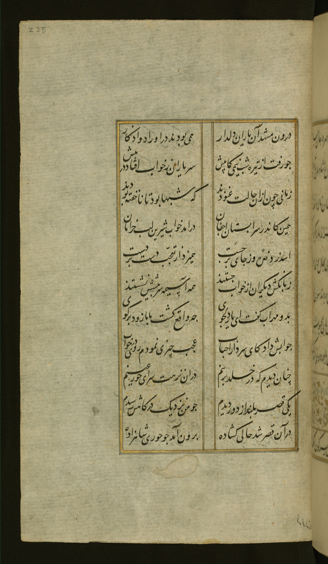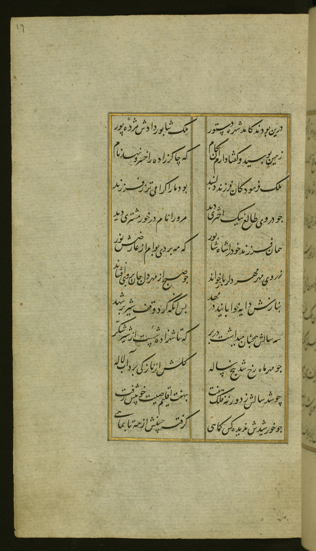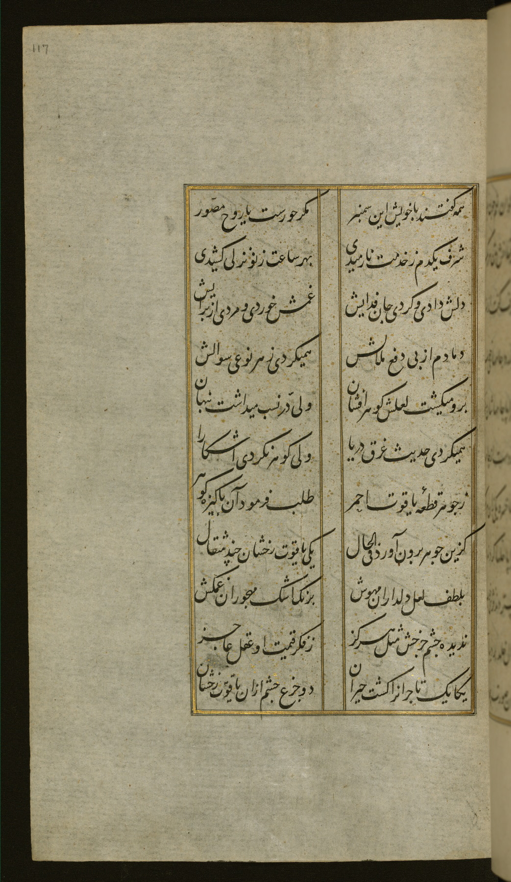 This manuscript is an illustrated copy of the well-known poem recounting the platonic love story between Mihr (the Sun), the son of Shāhpūr, and his vizier's son Mushtarī (Jupiter). The story of 90 chapters was composed by Muḥammad ibn Aḥmad ‘Aṣṣār Tabrīzī (d. 784 AH / 1382 CE). The present copy was written in nasta‘līq script by Murshid al-Kātib in 881 AH / 1476 CE. Considering the number of surviving manuscripts in which this calligrapher’s name is found, it seems he was particularly prolific. The present codex is illustrated with nine paintings. The gold-brushed leather binding with doublures of red leather decorated with filigree work is original to the manuscript.