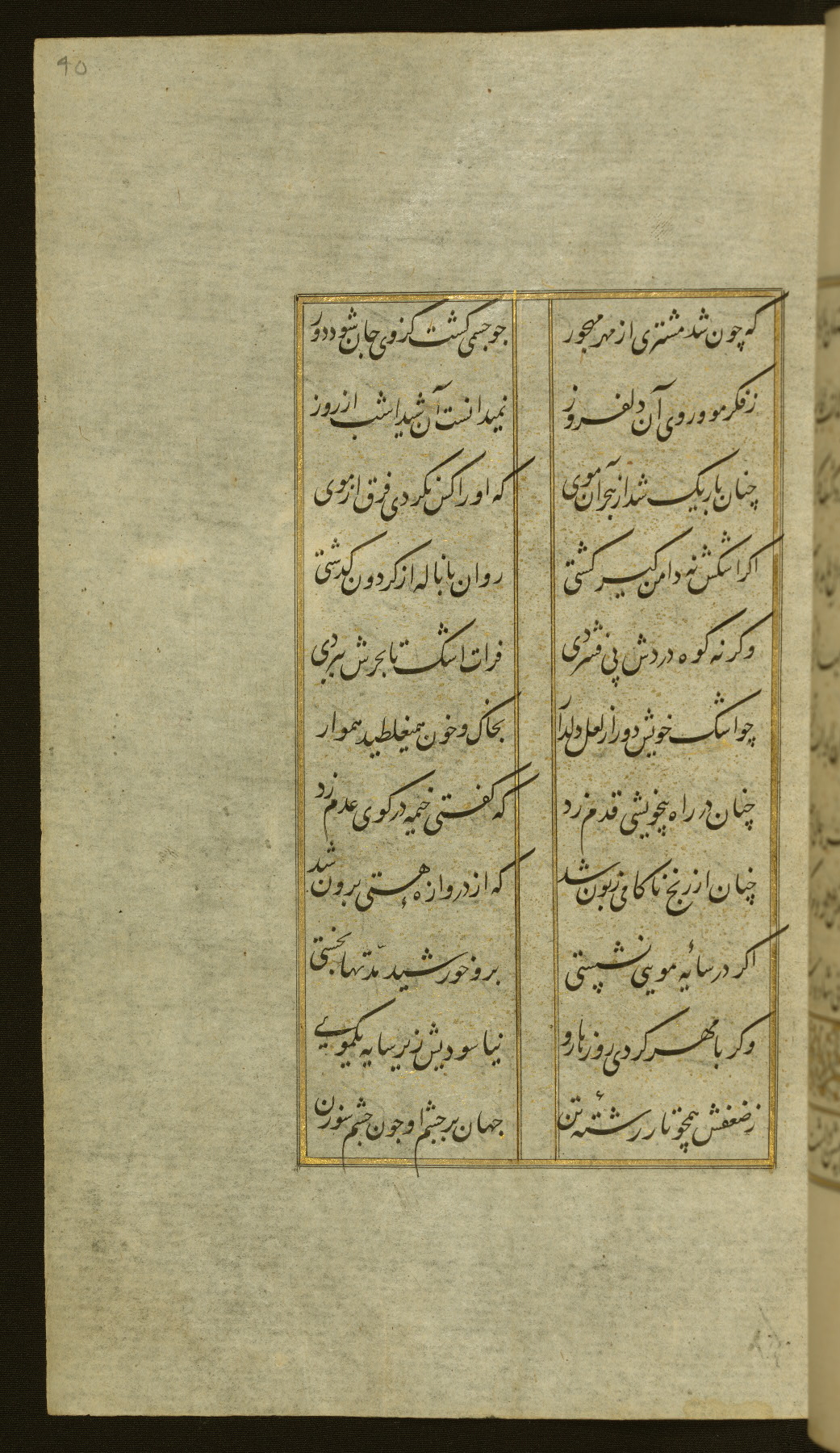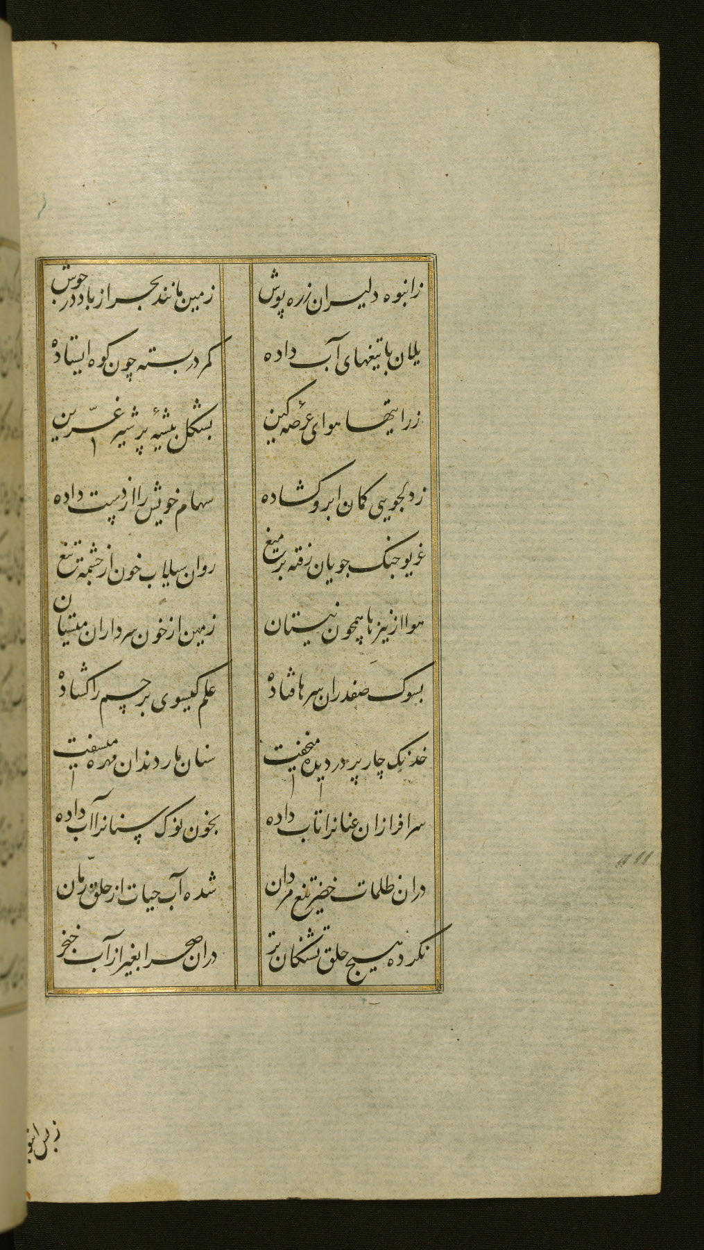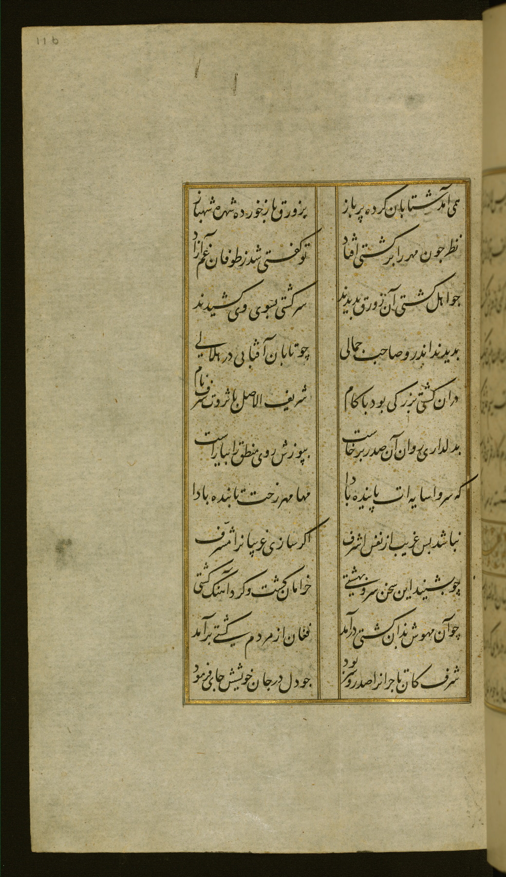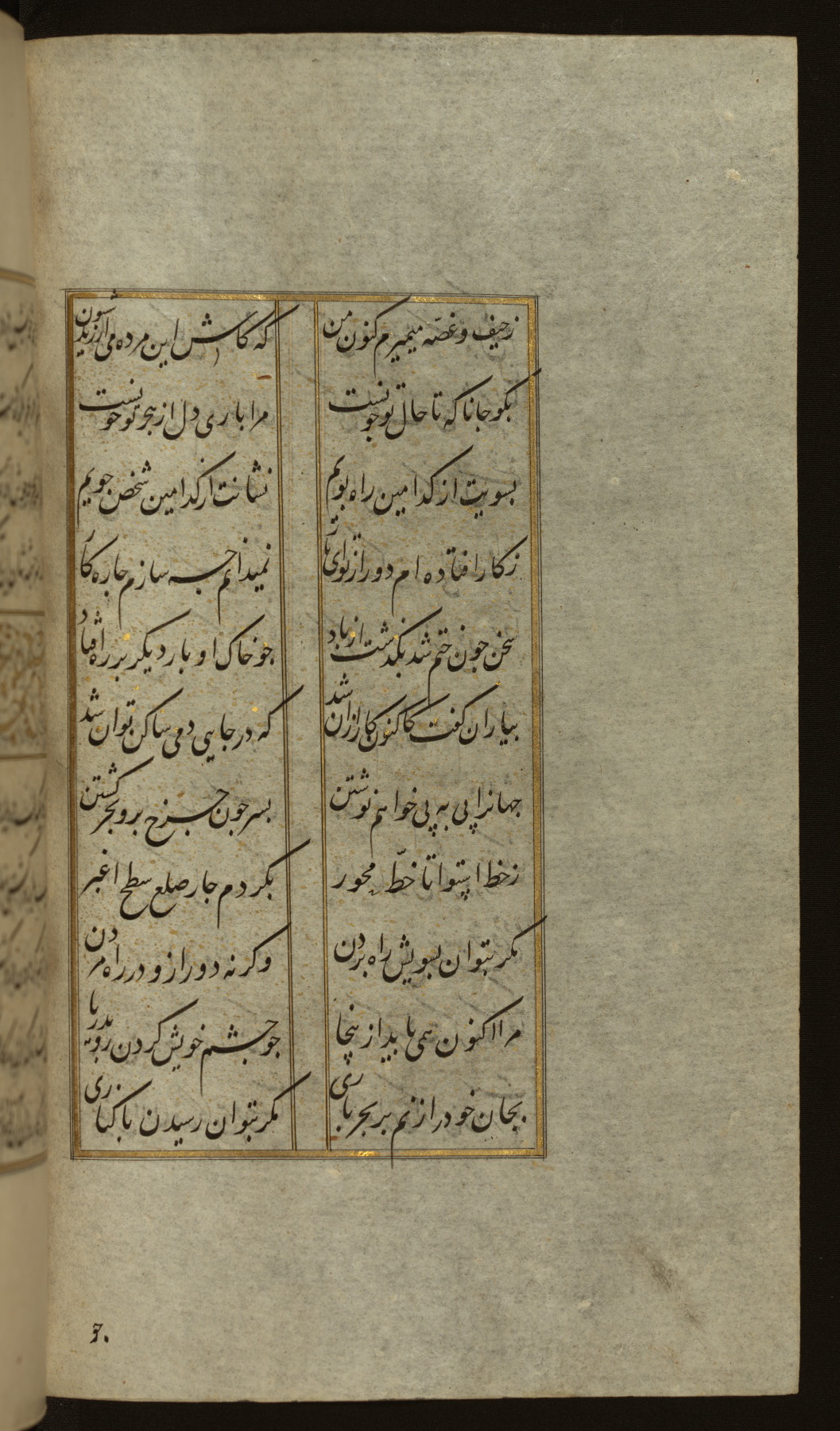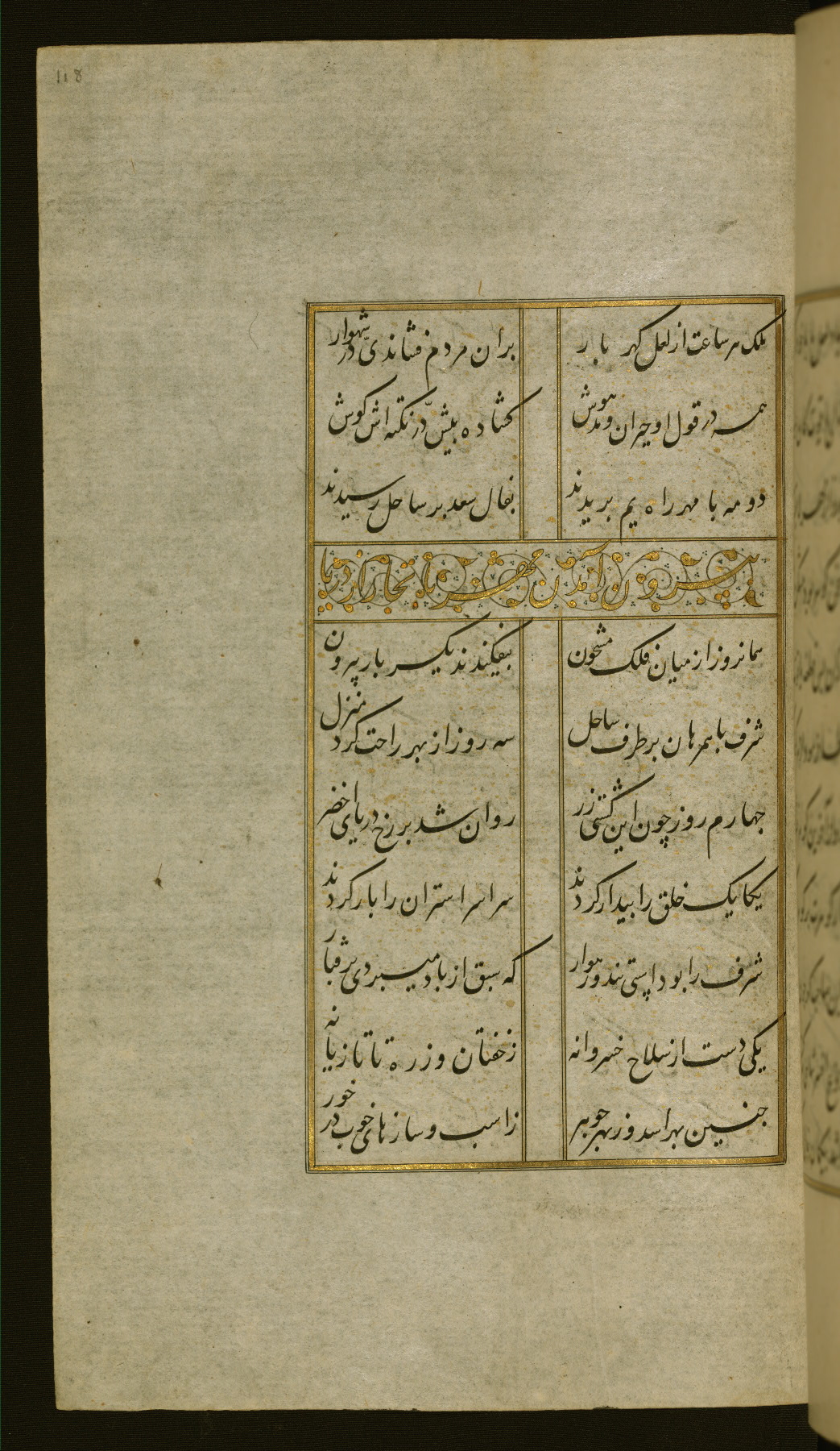 This manuscript is an illustrated copy of the well-known poem recounting the platonic love story between Mihr (the Sun), the son of Shāhpūr, and his vizier's son Mushtarī (Jupiter). The story of 90 chapters was composed by Muḥammad ibn Aḥmad ‘Aṣṣār Tabrīzī (d. 784 AH / 1382 CE). The present copy was written in nasta‘līq script by Murshid al-Kātib in 881 AH / 1476 CE. Considering the number of surviving manuscripts in which this calligrapher’s name is found, it seems he was particularly prolific. The present codex is illustrated with nine paintings. The gold-brushed leather binding with doublures of red leather decorated with filigree work is original to the manuscript.