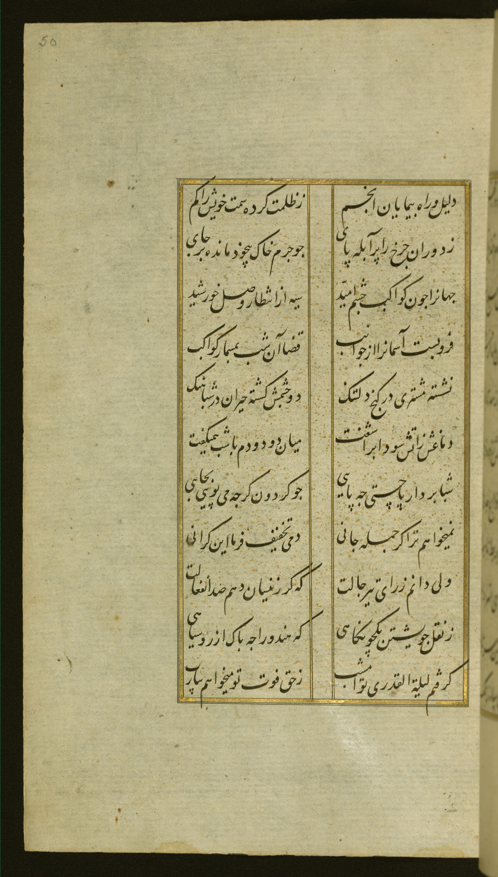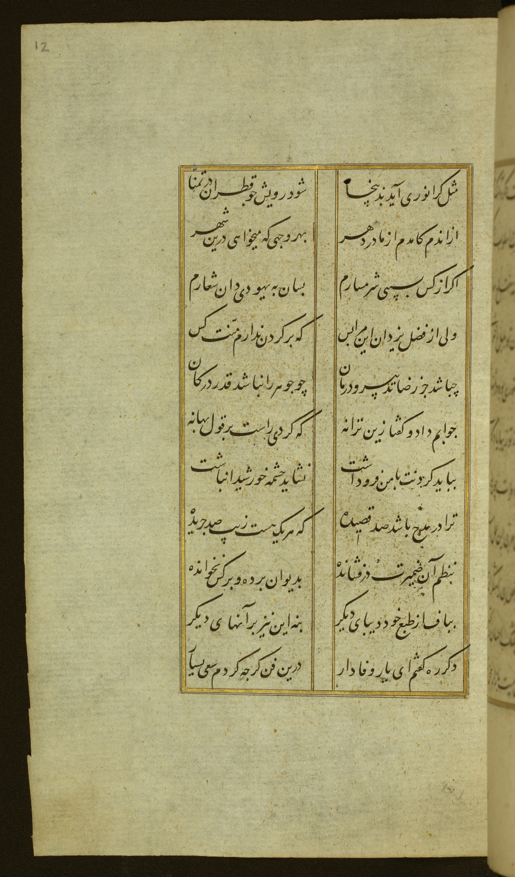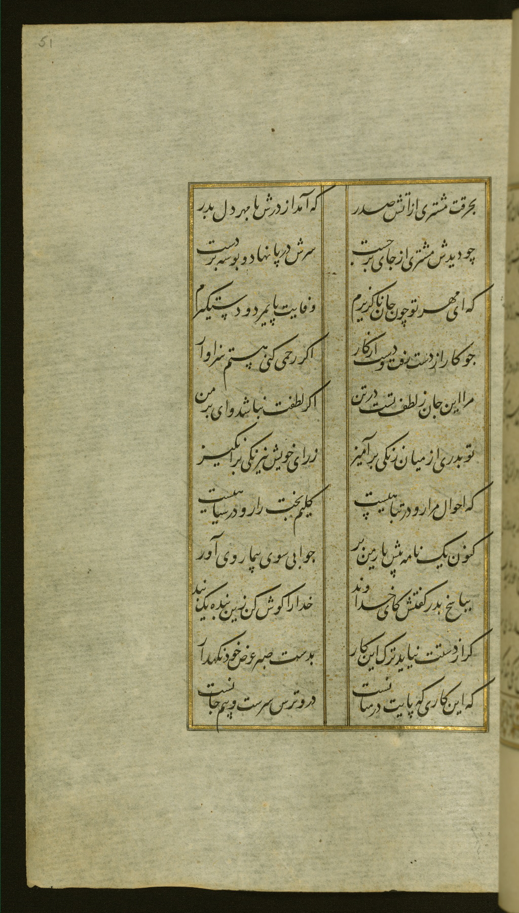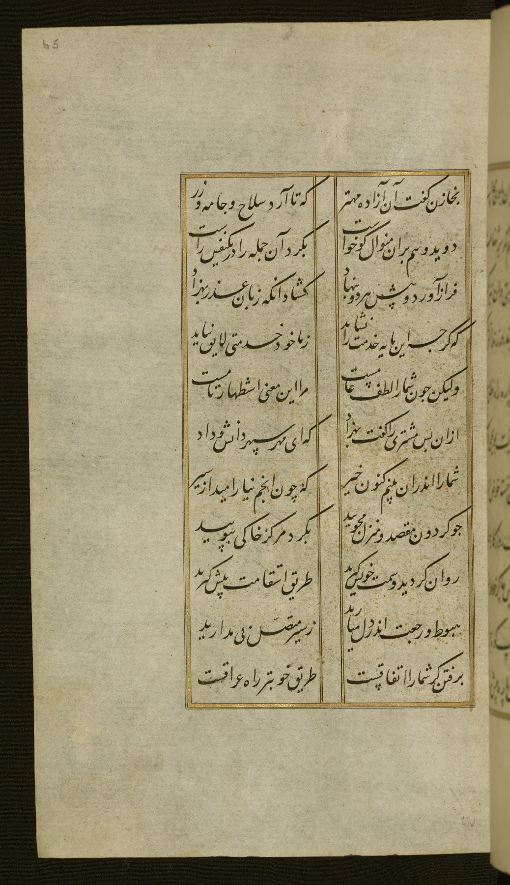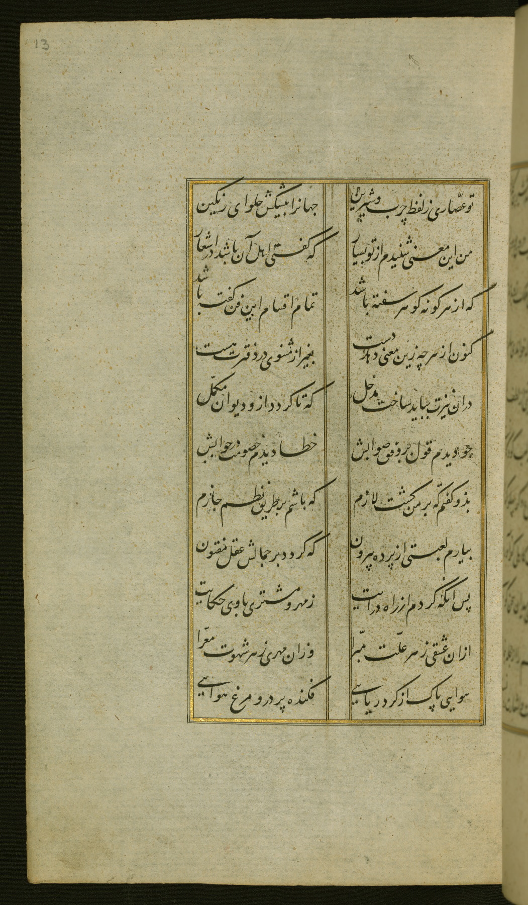 This manuscript is an illustrated copy of the well-known poem recounting the platonic love story between Mihr (the Sun), the son of Shāhpūr, and his vizier's son Mushtarī (Jupiter). The story of 90 chapters was composed by Muḥammad ibn Aḥmad ‘Aṣṣār Tabrīzī (d. 784 AH / 1382 CE). The present copy was written in nasta‘līq script by Murshid al-Kātib in 881 AH / 1476 CE. Considering the number of surviving manuscripts in which this calligrapher’s name is found, it seems he was particularly prolific. The present codex is illustrated with nine paintings. The gold-brushed leather binding with doublures of red leather decorated with filigree work is original to the manuscript.