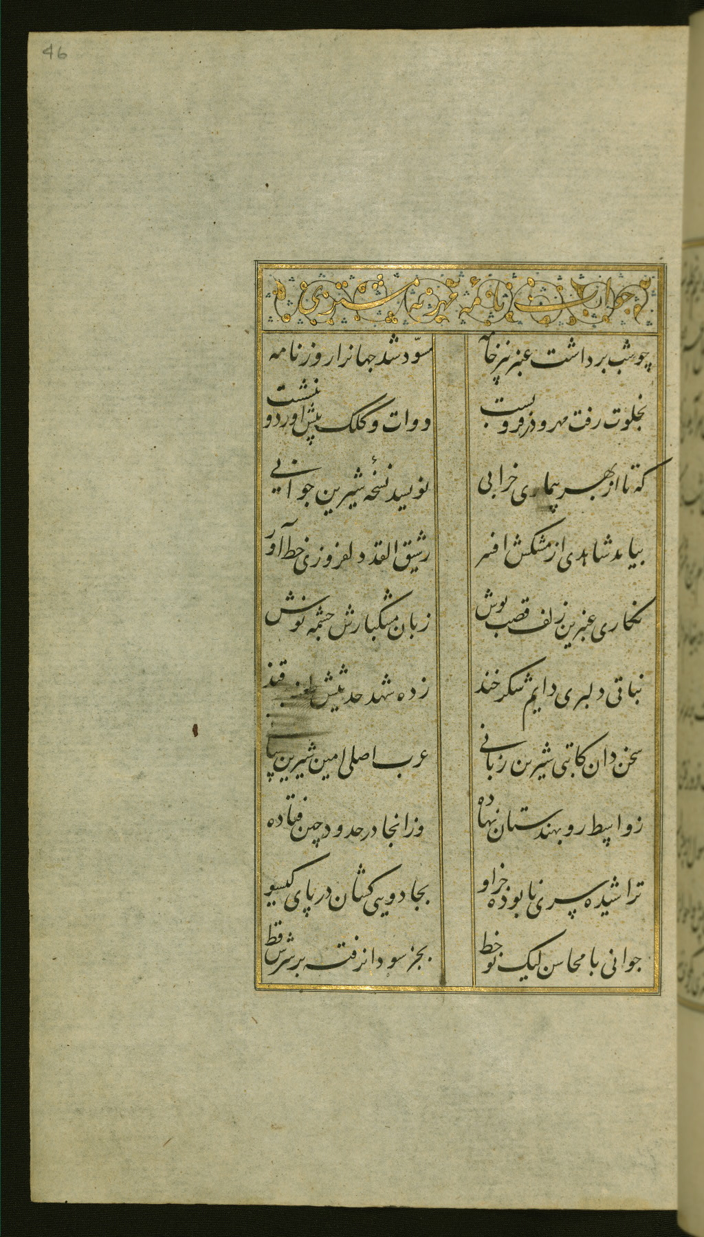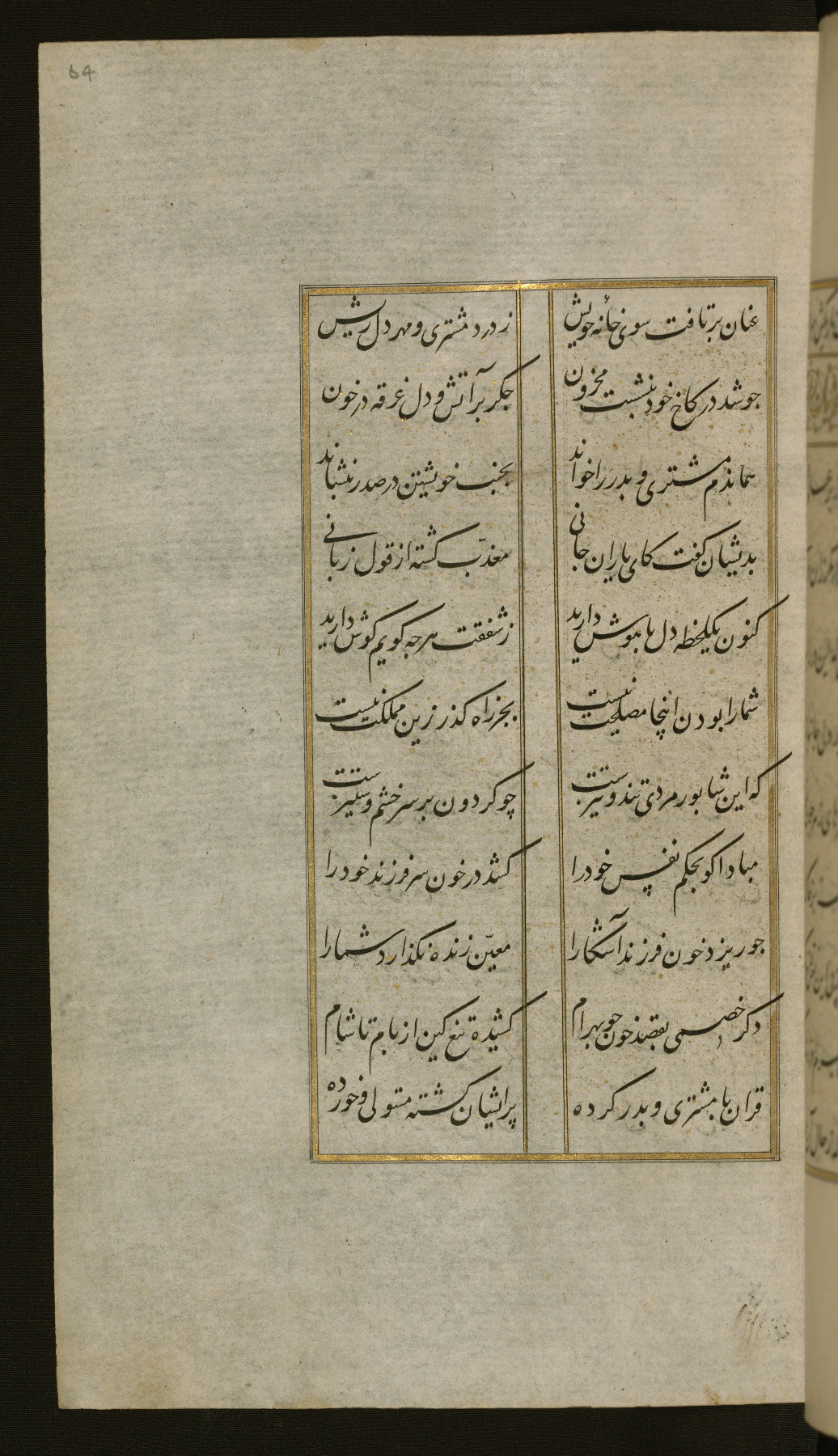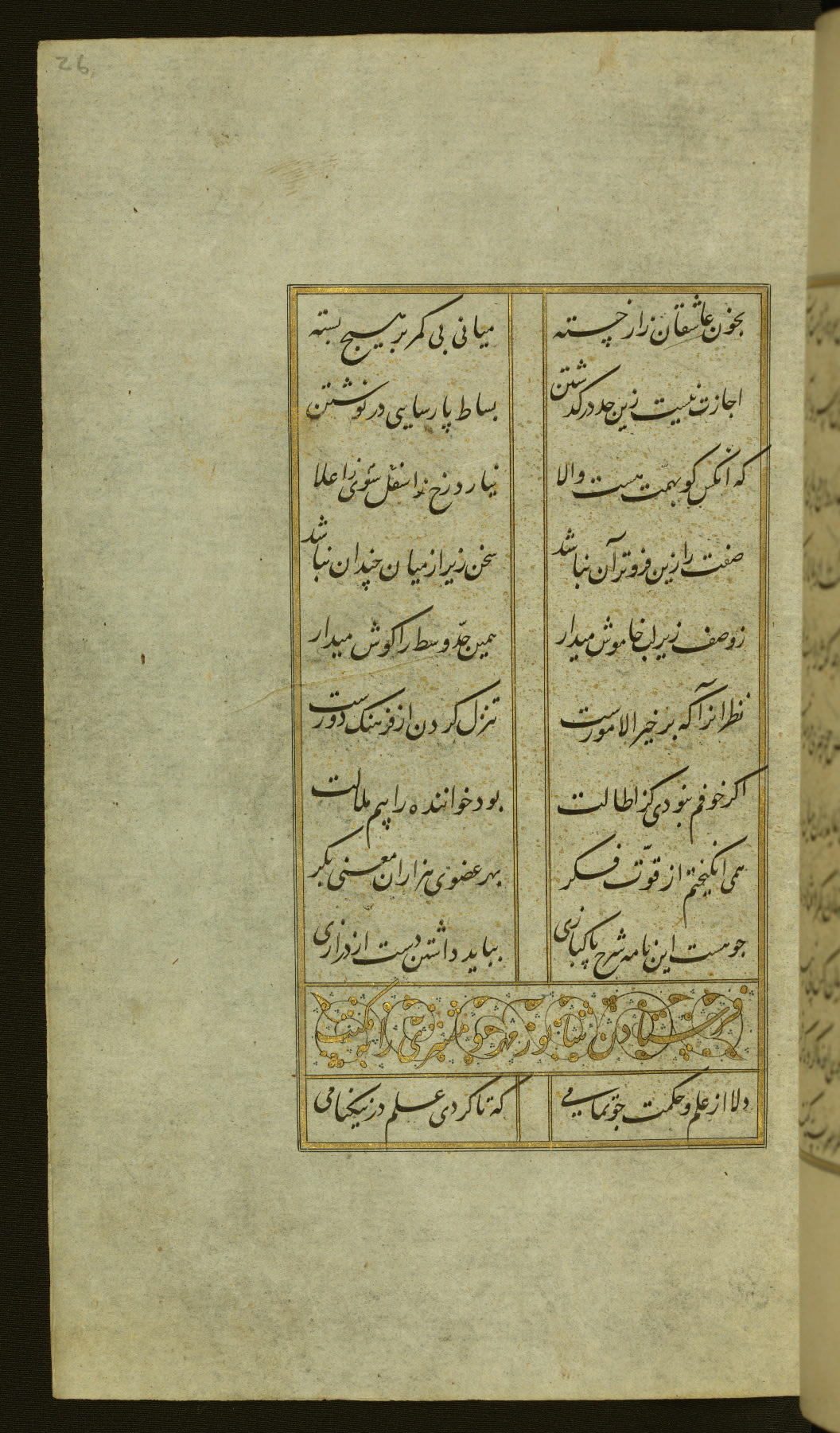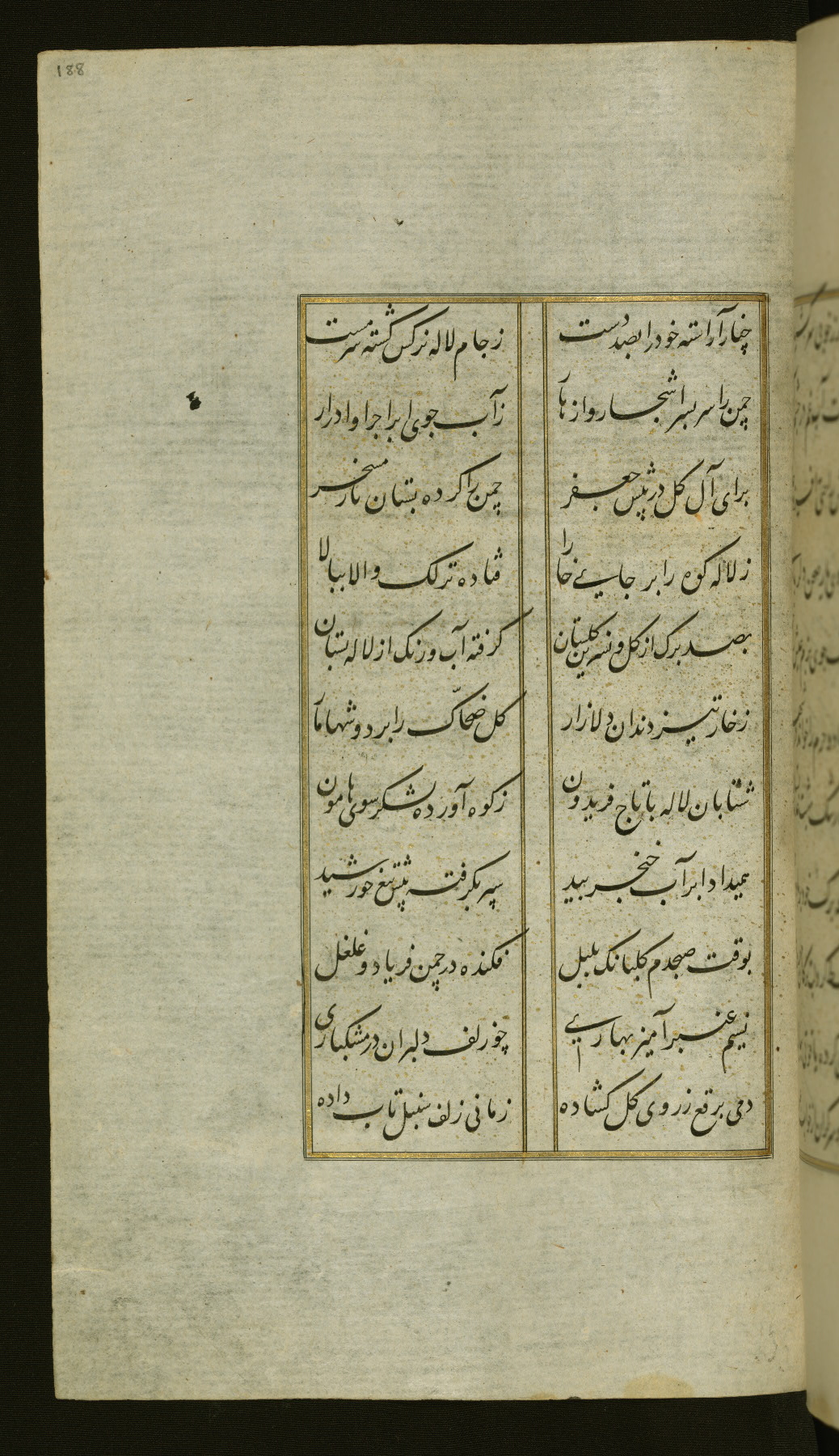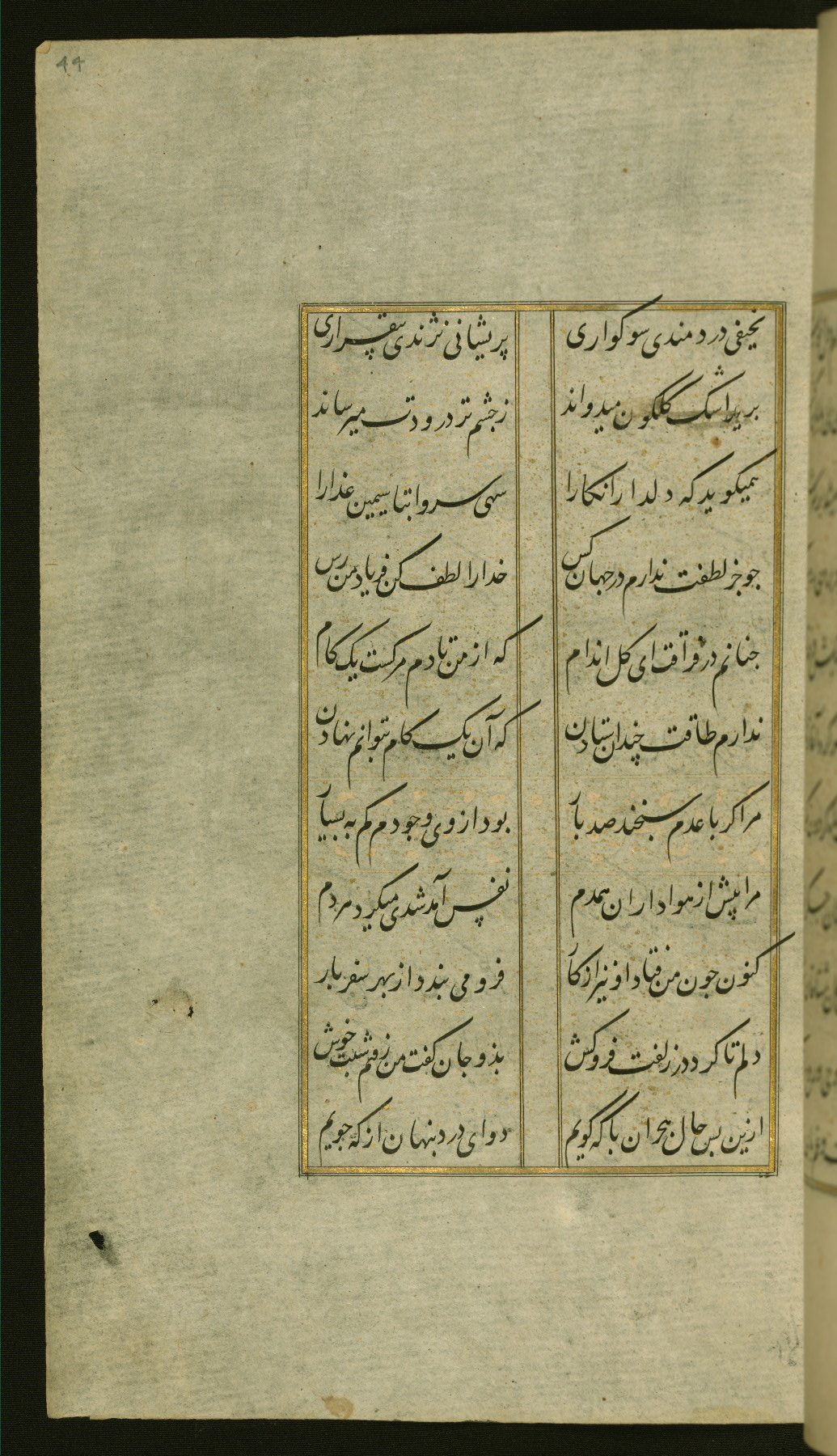This manuscript is an illustrated copy of the well-known poem recounting the platonic love story between Mihr (the Sun), the son of Shāhpūr, and his vizier's son Mushtarī (Jupiter). The story of 90 chapters was composed by Muḥammad ibn Aḥmad ‘Aṣṣār Tabrīzī (d. 784 AH / 1382 CE). The present copy was written in nasta‘līq script by Murshid al-Kātib in 881 AH / 1476 CE. Considering the number of surviving manuscripts in which this calligrapher’s name is found, it seems he was particularly prolific. The present codex is illustrated with nine paintings. The gold-brushed leather binding with doublures of red leather decorated with filigree work is original to the manuscript.