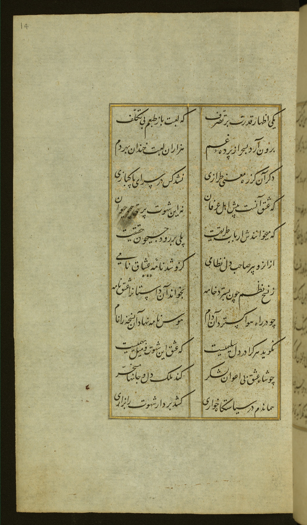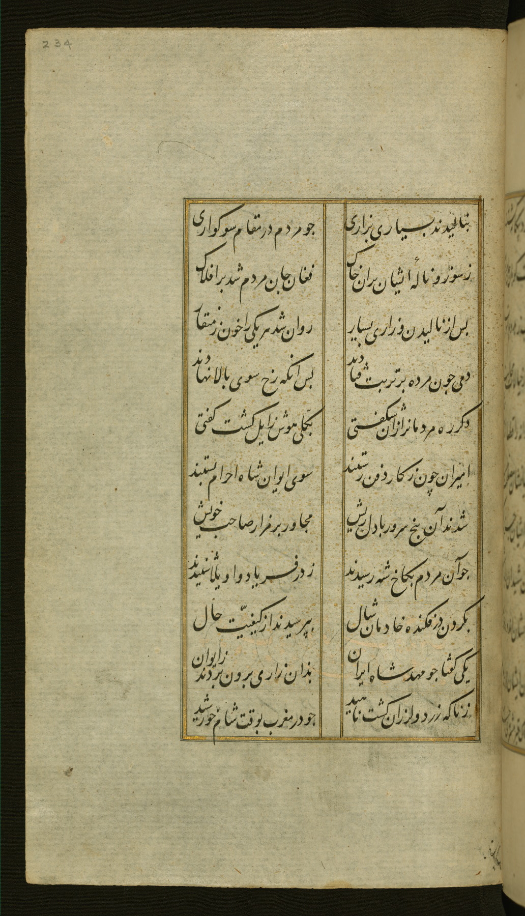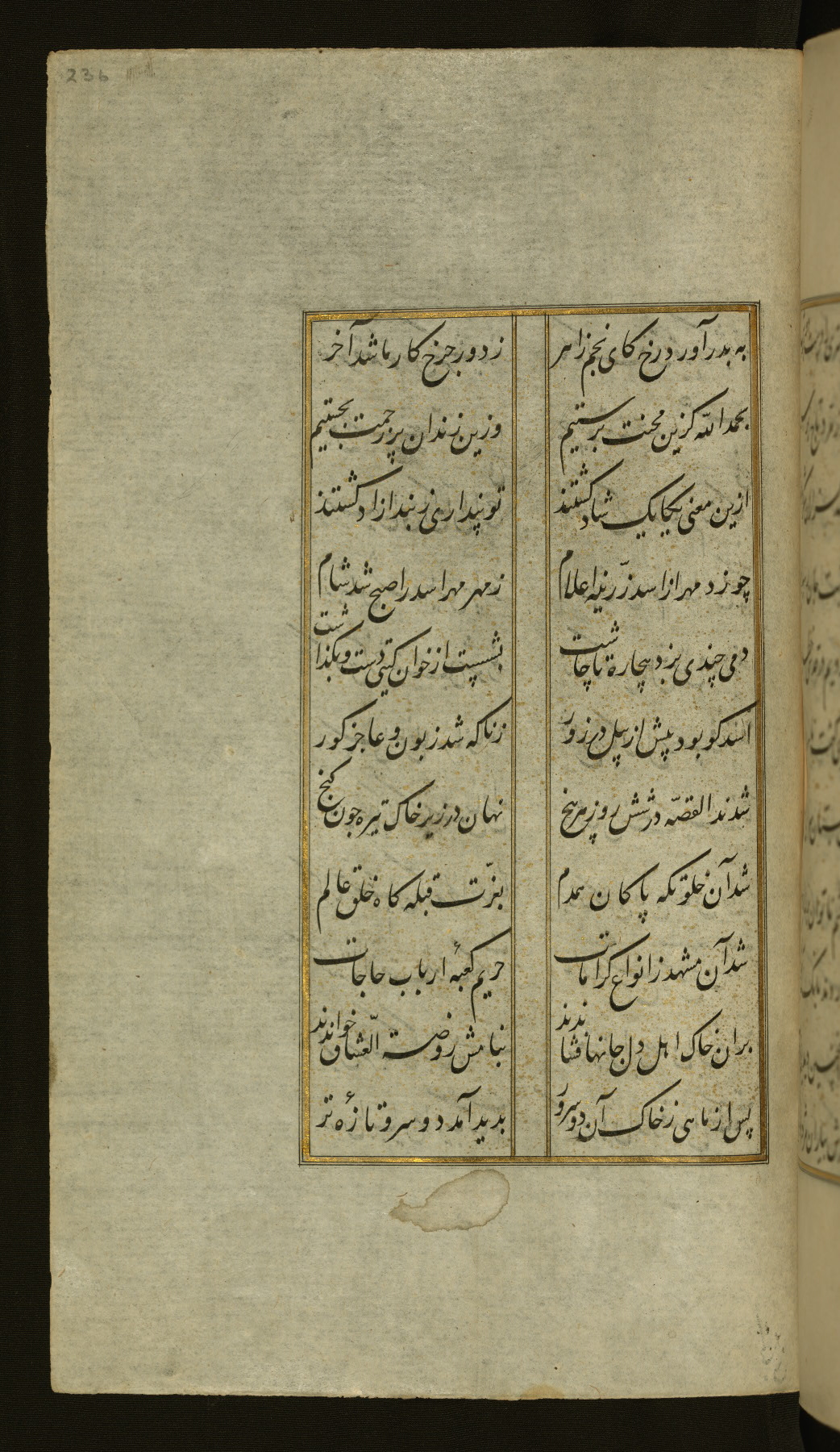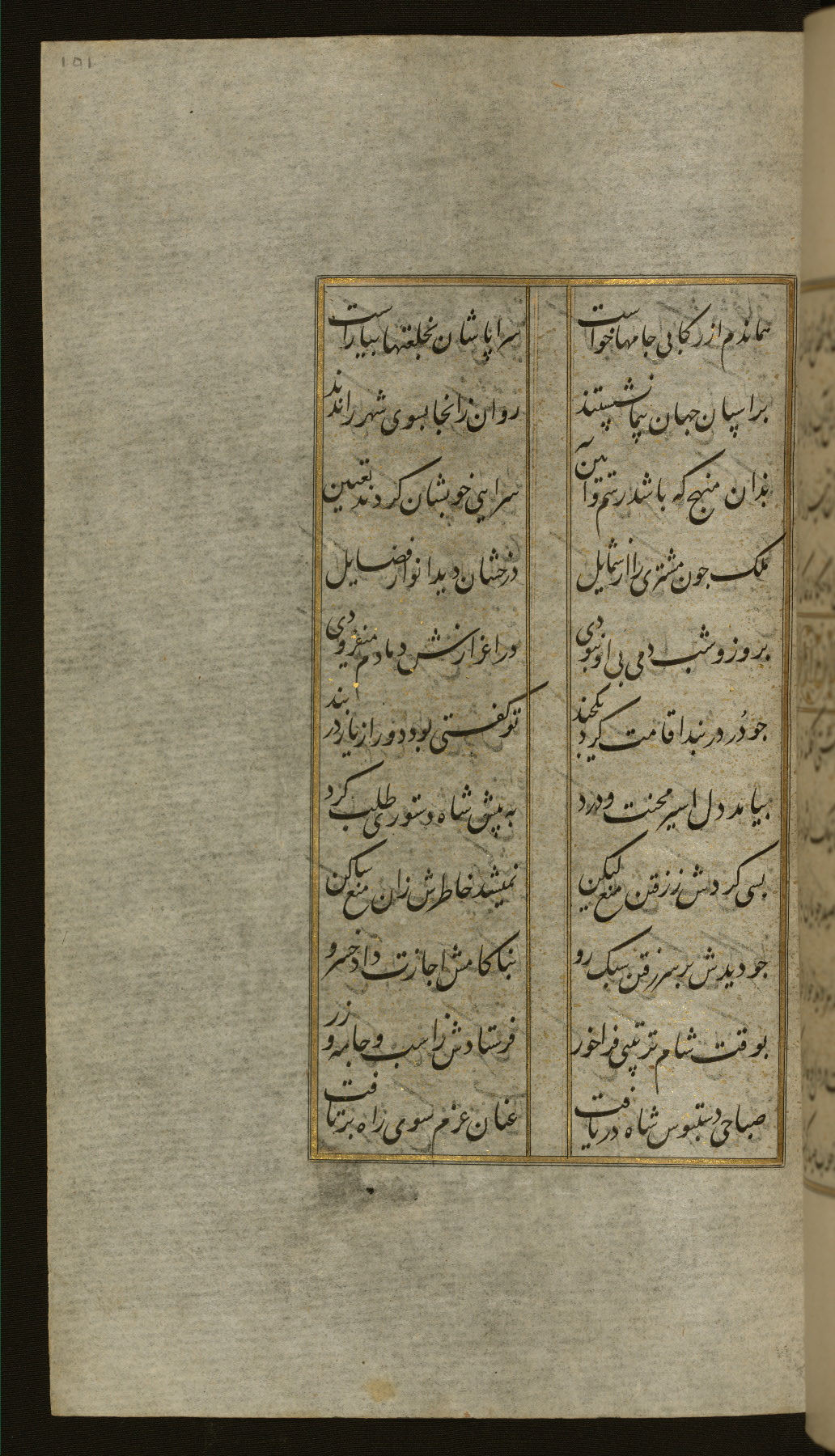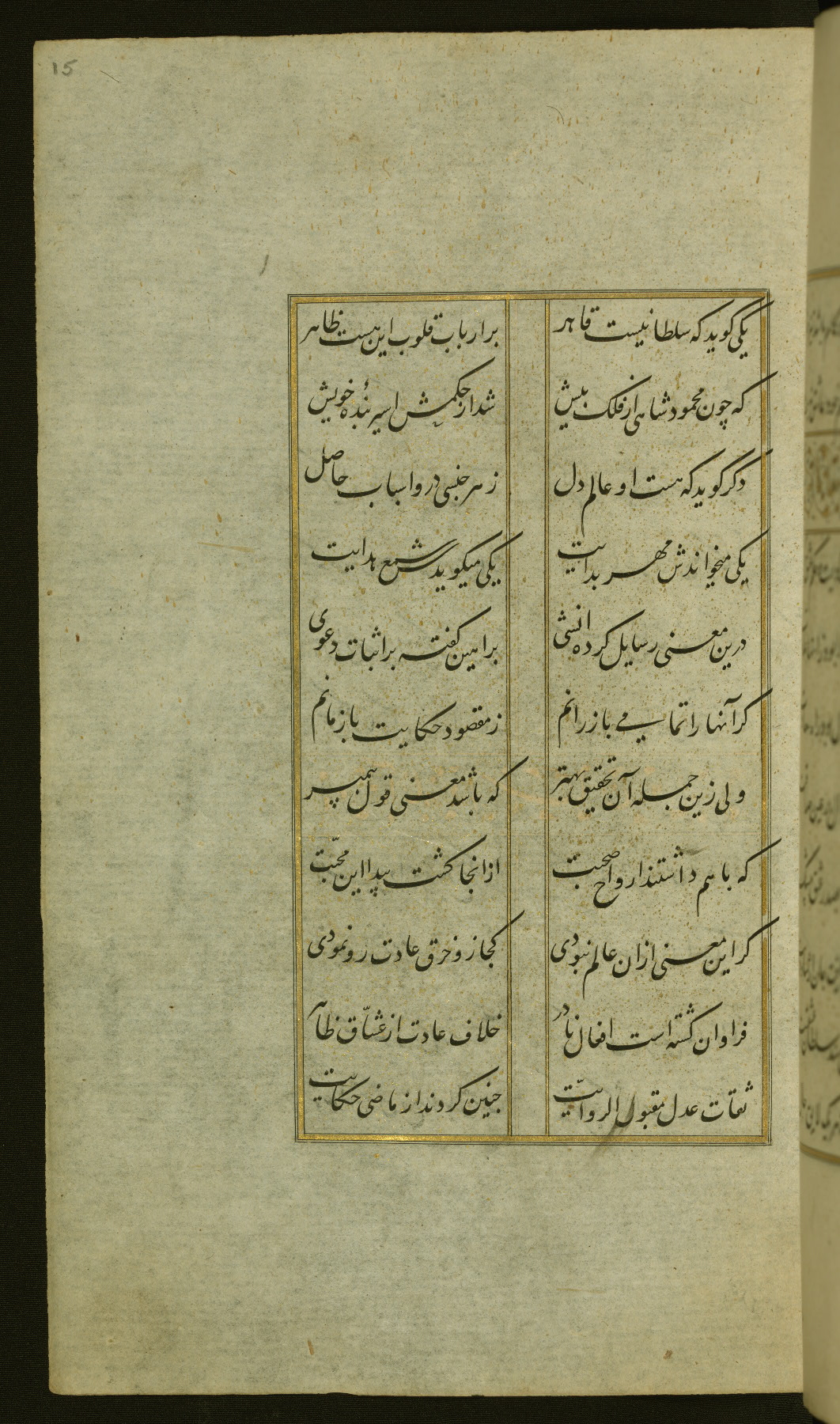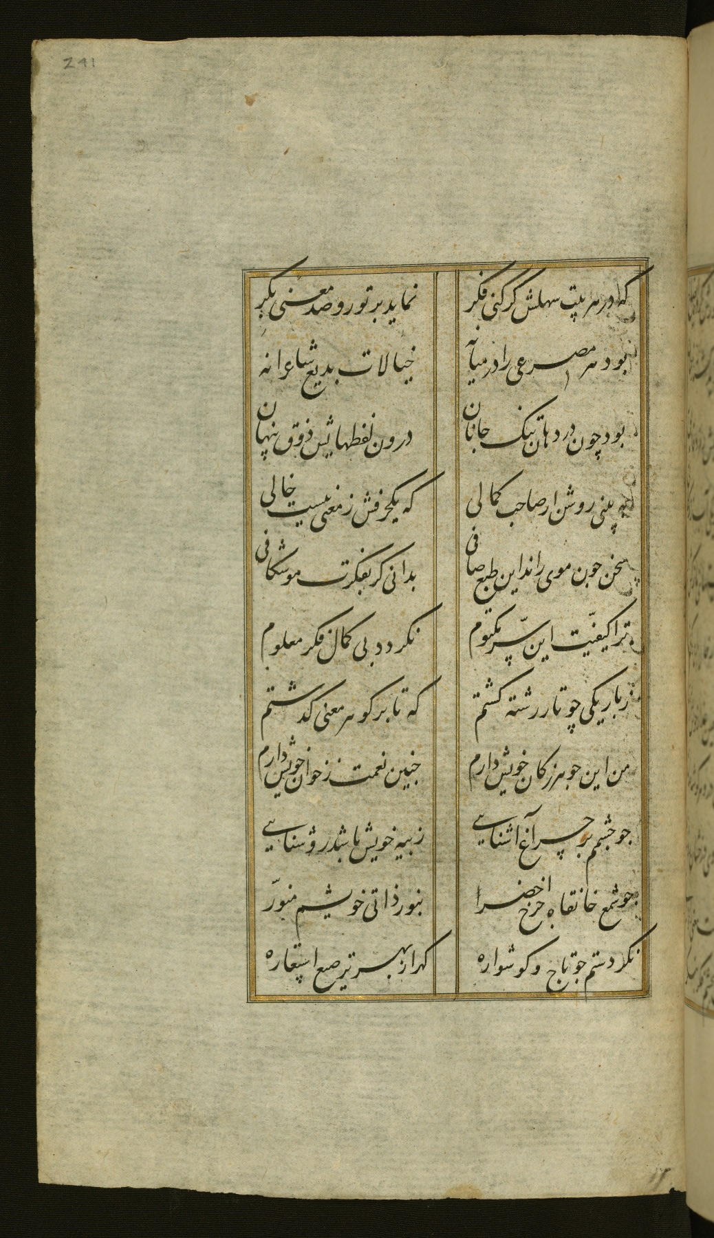 This manuscript is an illustrated copy of the well-known poem recounting the platonic love story between Mihr (the Sun), the son of Shāhpūr, and his vizier's son Mushtarī (Jupiter). The story of 90 chapters was composed by Muḥammad ibn Aḥmad ‘Aṣṣār Tabrīzī (d. 784 AH / 1382 CE). The present copy was written in nasta‘līq script by Murshid al-Kātib in 881 AH / 1476 CE. Considering the number of surviving manuscripts in which this calligrapher’s name is found, it seems he was particularly prolific. The present codex is illustrated with nine paintings. The gold-brushed leather binding with doublures of red leather decorated with filigree work is original to the manuscript.