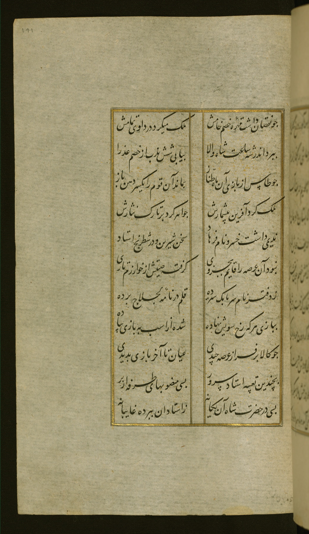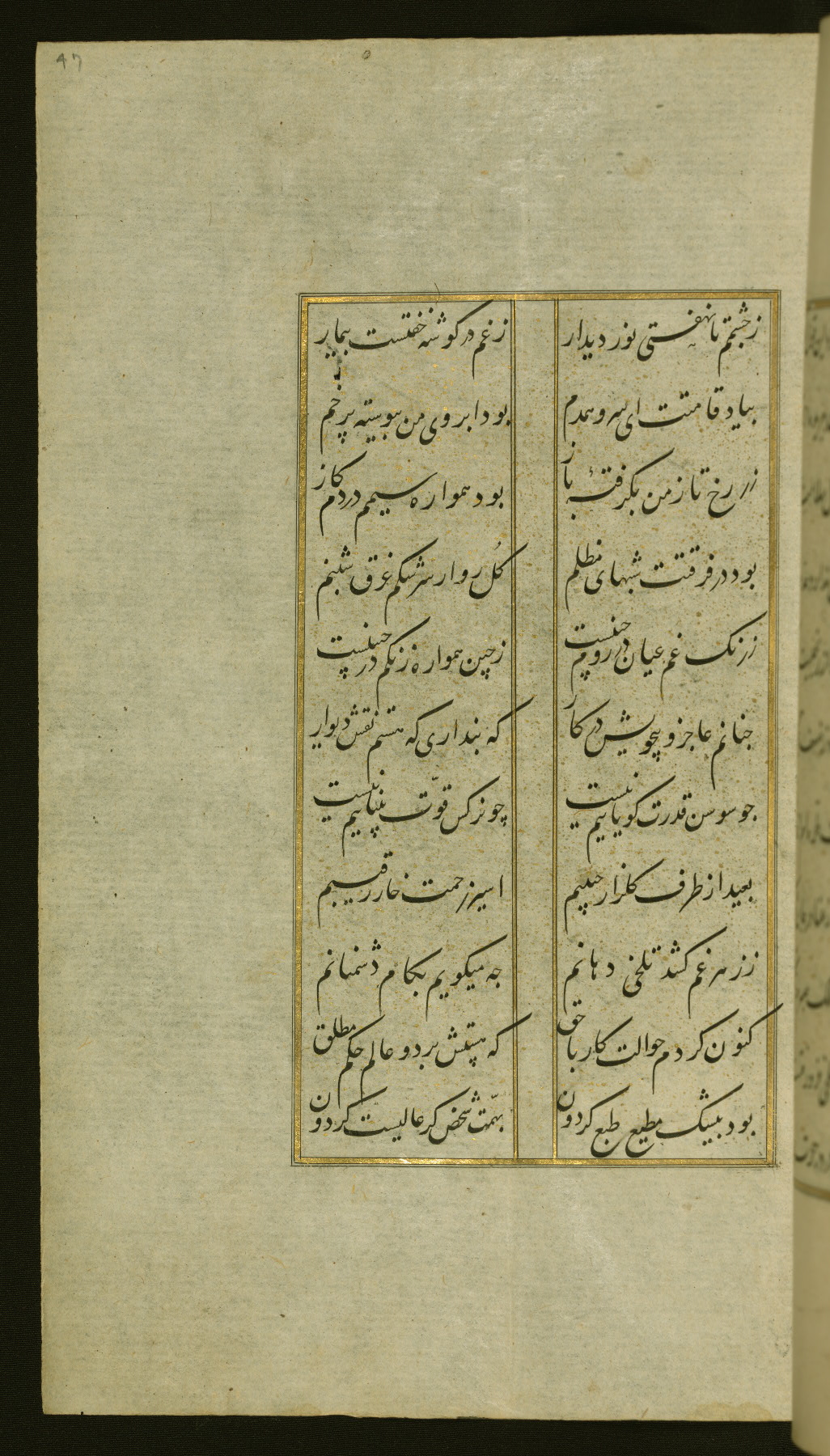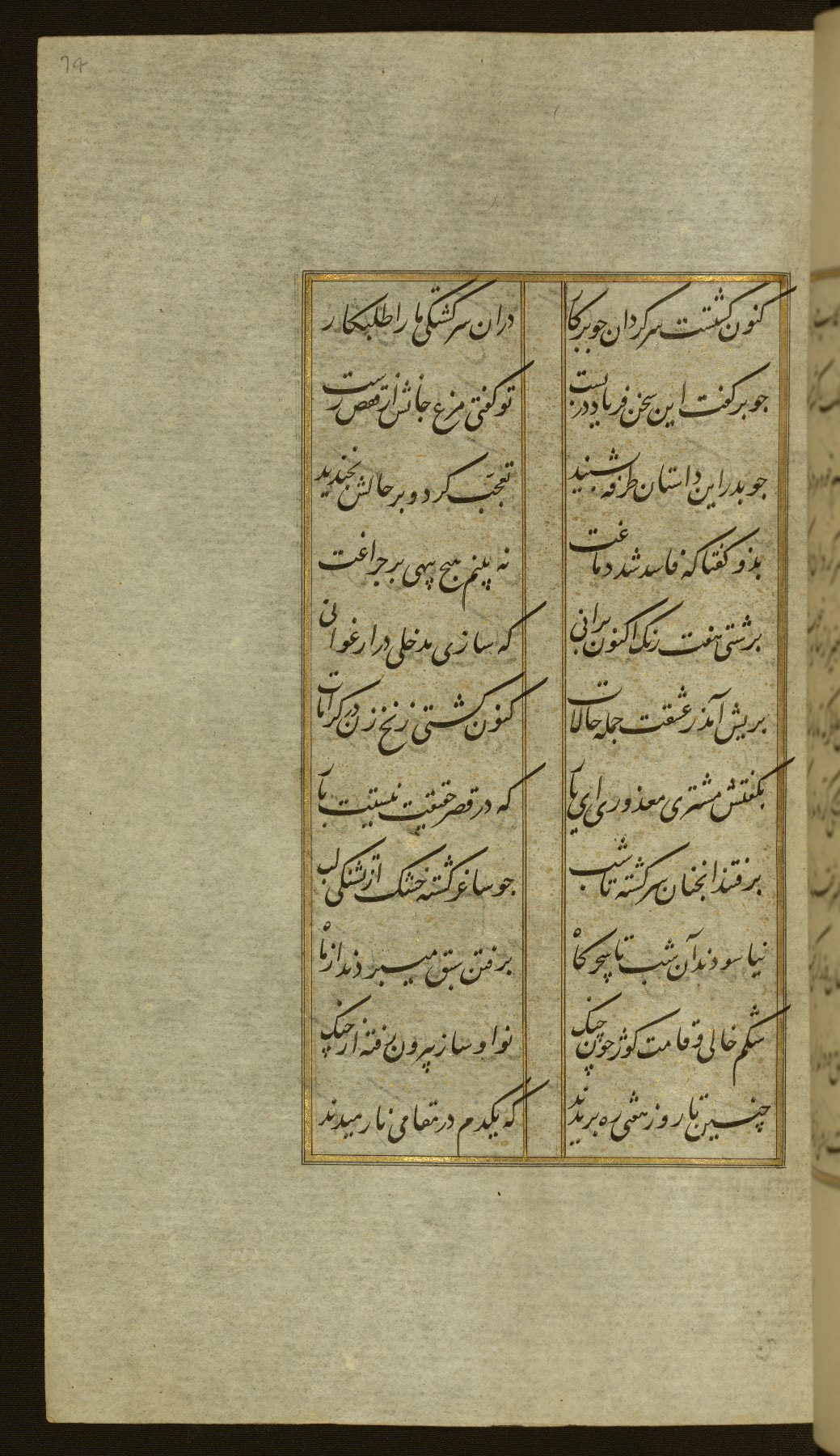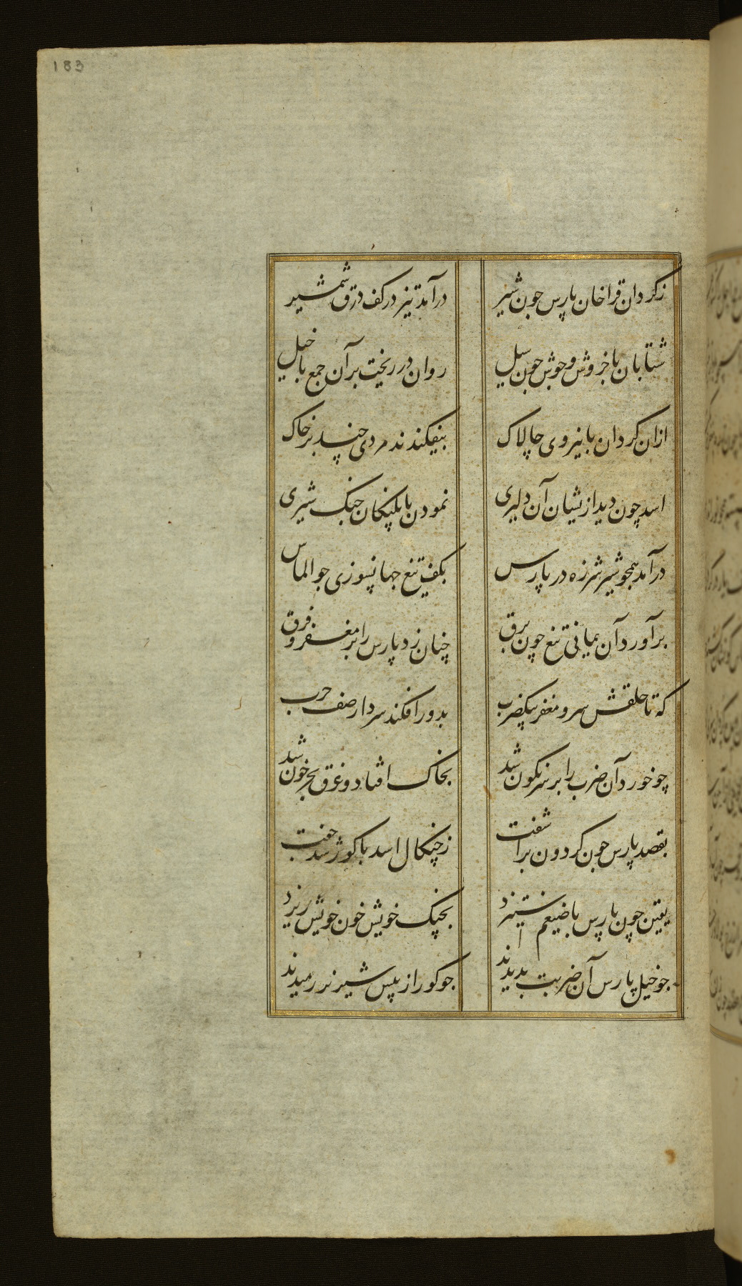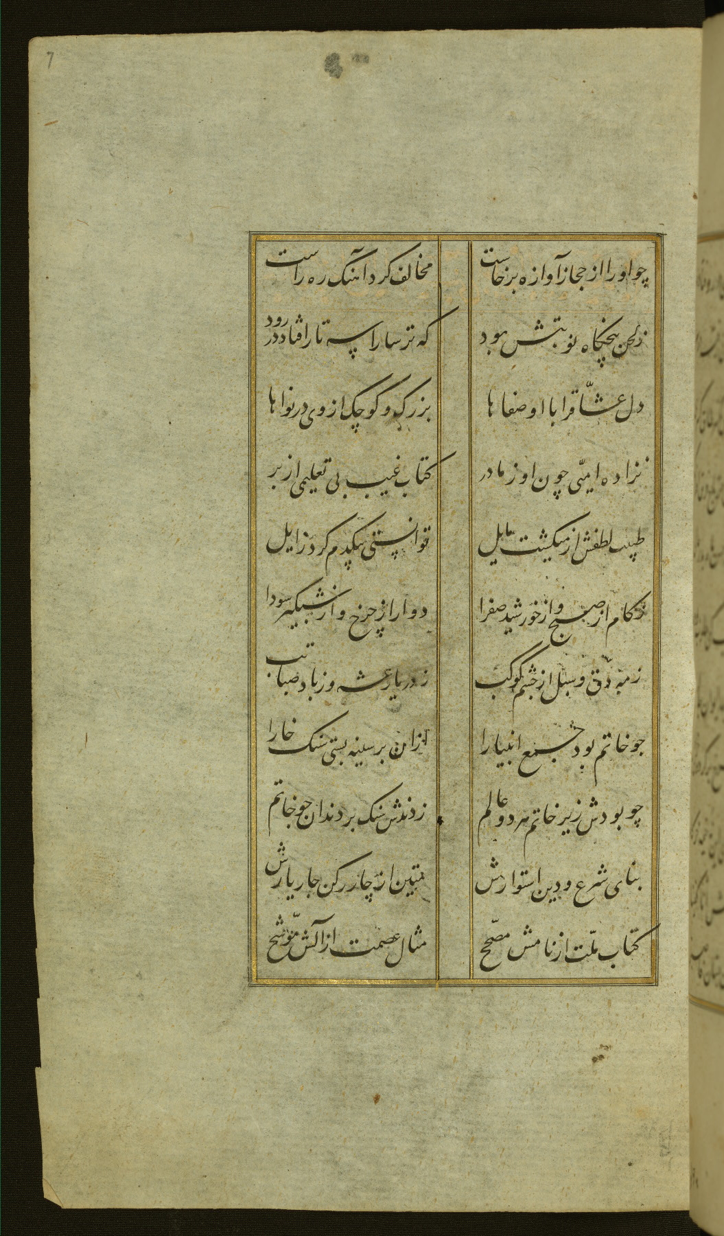This manuscript is an illustrated copy of the well-known poem recounting the platonic love story between Mihr (the Sun), the son of Shāhpūr, and his vizier's son Mushtarī (Jupiter). The story of 90 chapters was composed by Muḥammad ibn Aḥmad ‘Aṣṣār Tabrīzī (d. 784 AH / 1382 CE). The present copy was written in nasta‘līq script by Murshid al-Kātib in 881 AH / 1476 CE. Considering the number of surviving manuscripts in which this calligrapher’s name is found, it seems he was particularly prolific. The present codex is illustrated with nine paintings. The gold-brushed leather binding with doublures of red leather decorated with filigree work is original to the manuscript.