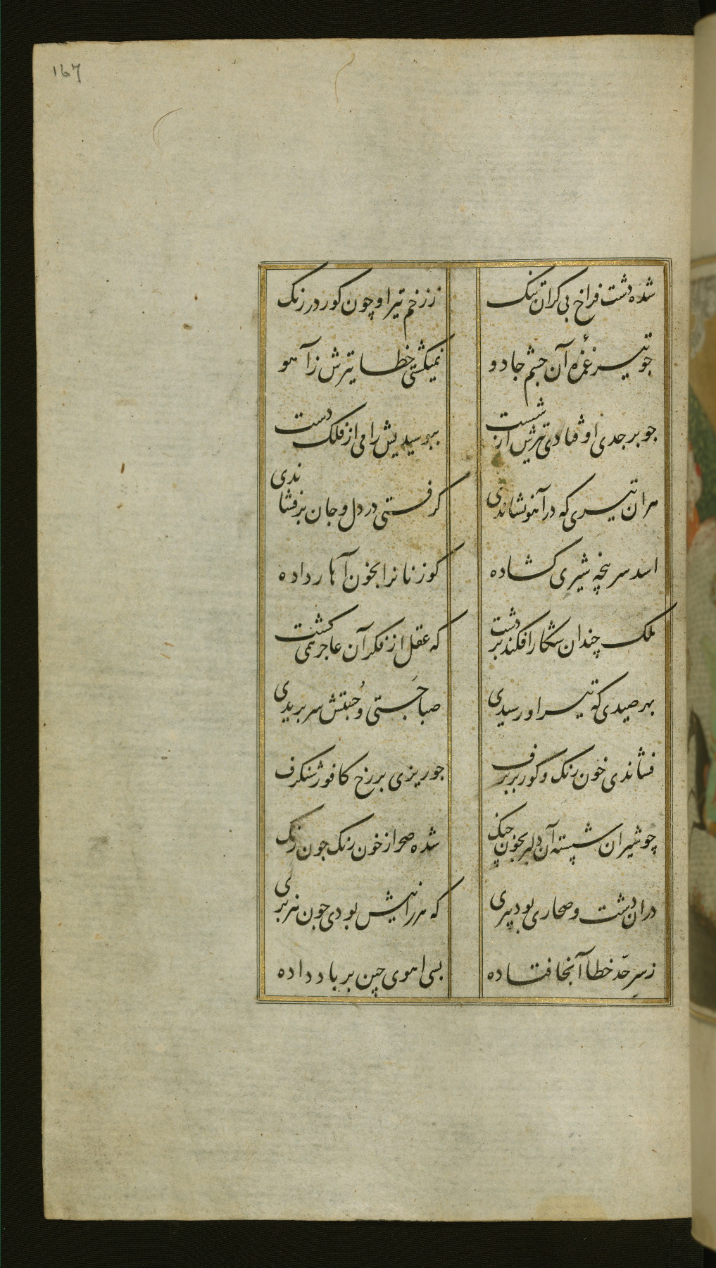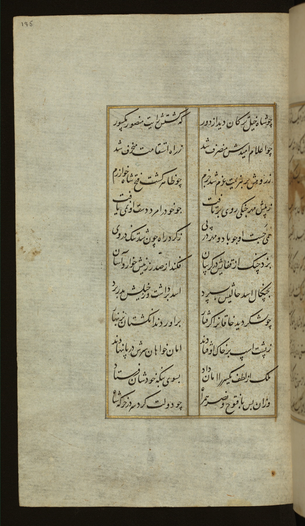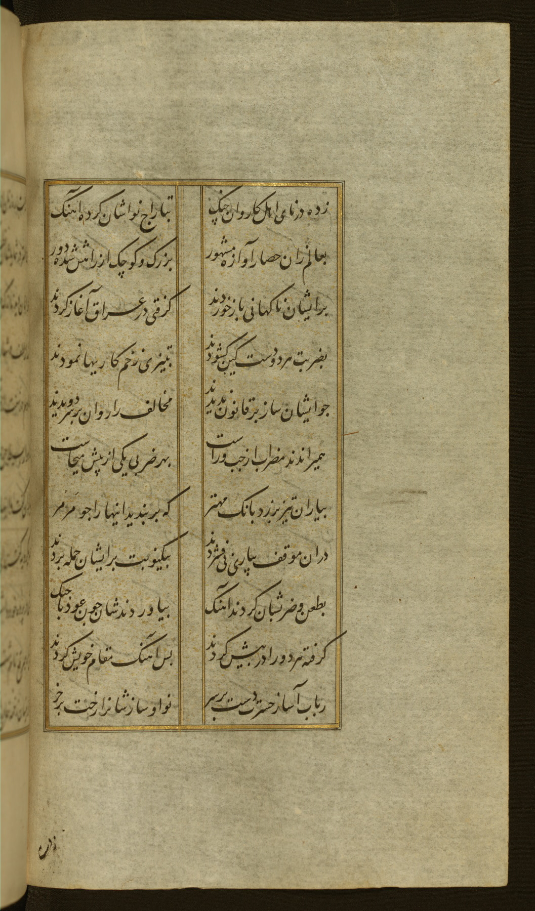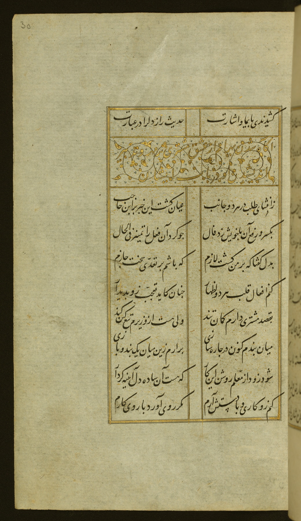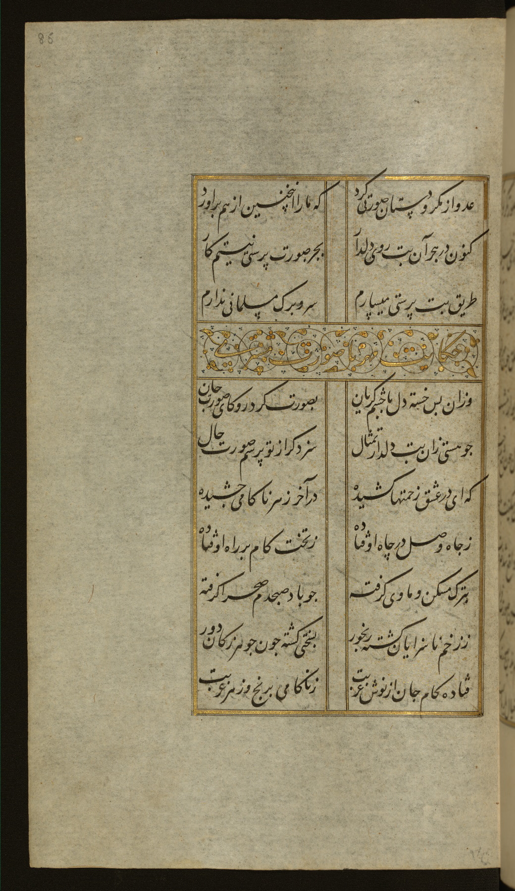 This manuscript is an illustrated copy of the well-known poem recounting the platonic love story between Mihr (the Sun), the son of Shāhpūr, and his vizier's son Mushtarī (Jupiter). The story of 90 chapters was composed by Muḥammad ibn Aḥmad ‘Aṣṣār Tabrīzī (d. 784 AH / 1382 CE). The present copy was written in nasta‘līq script by Murshid al-Kātib in 881 AH / 1476 CE. Considering the number of surviving manuscripts in which this calligrapher’s name is found, it seems he was particularly prolific. The present codex is illustrated with nine paintings. The gold-brushed leather binding with doublures of red leather decorated with filigree work is original to the manuscript.