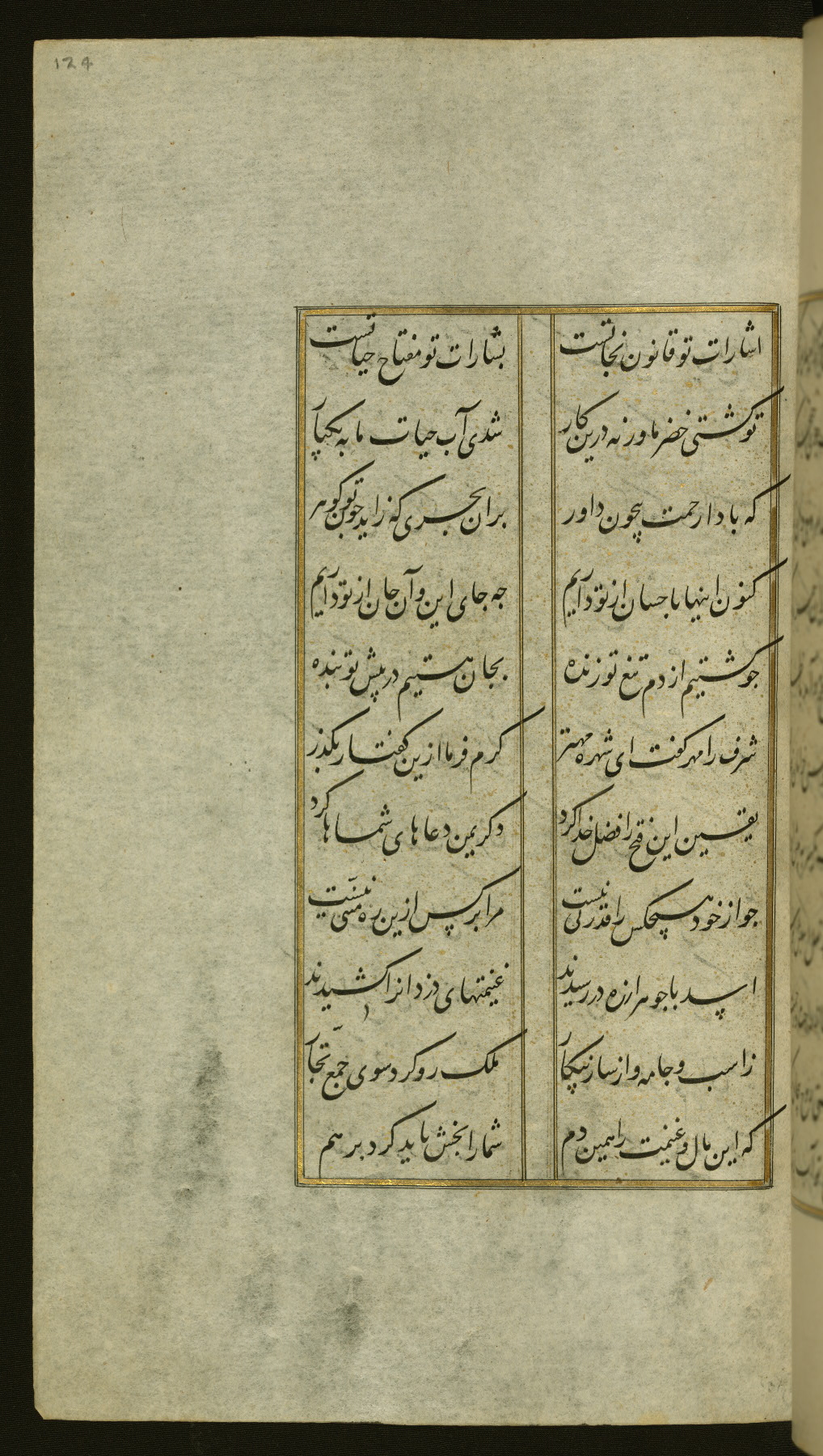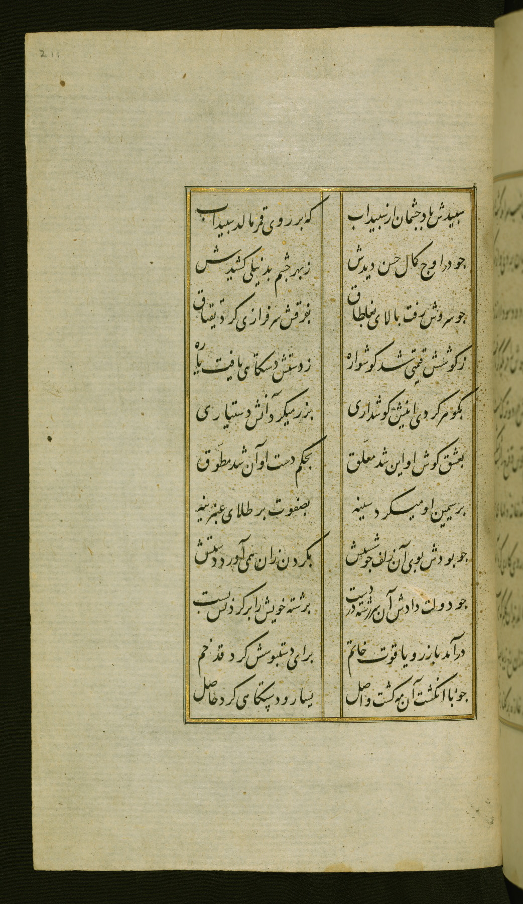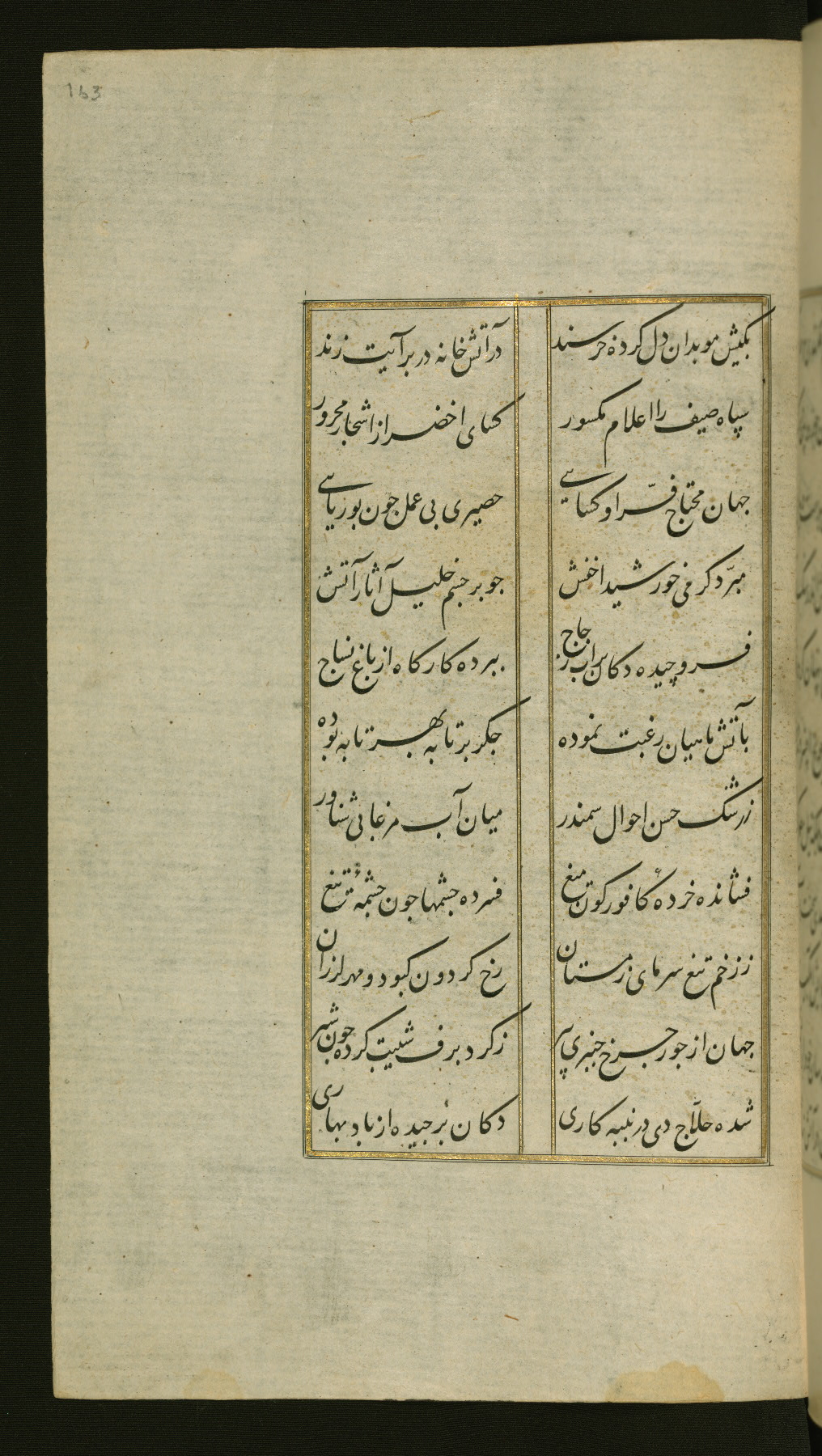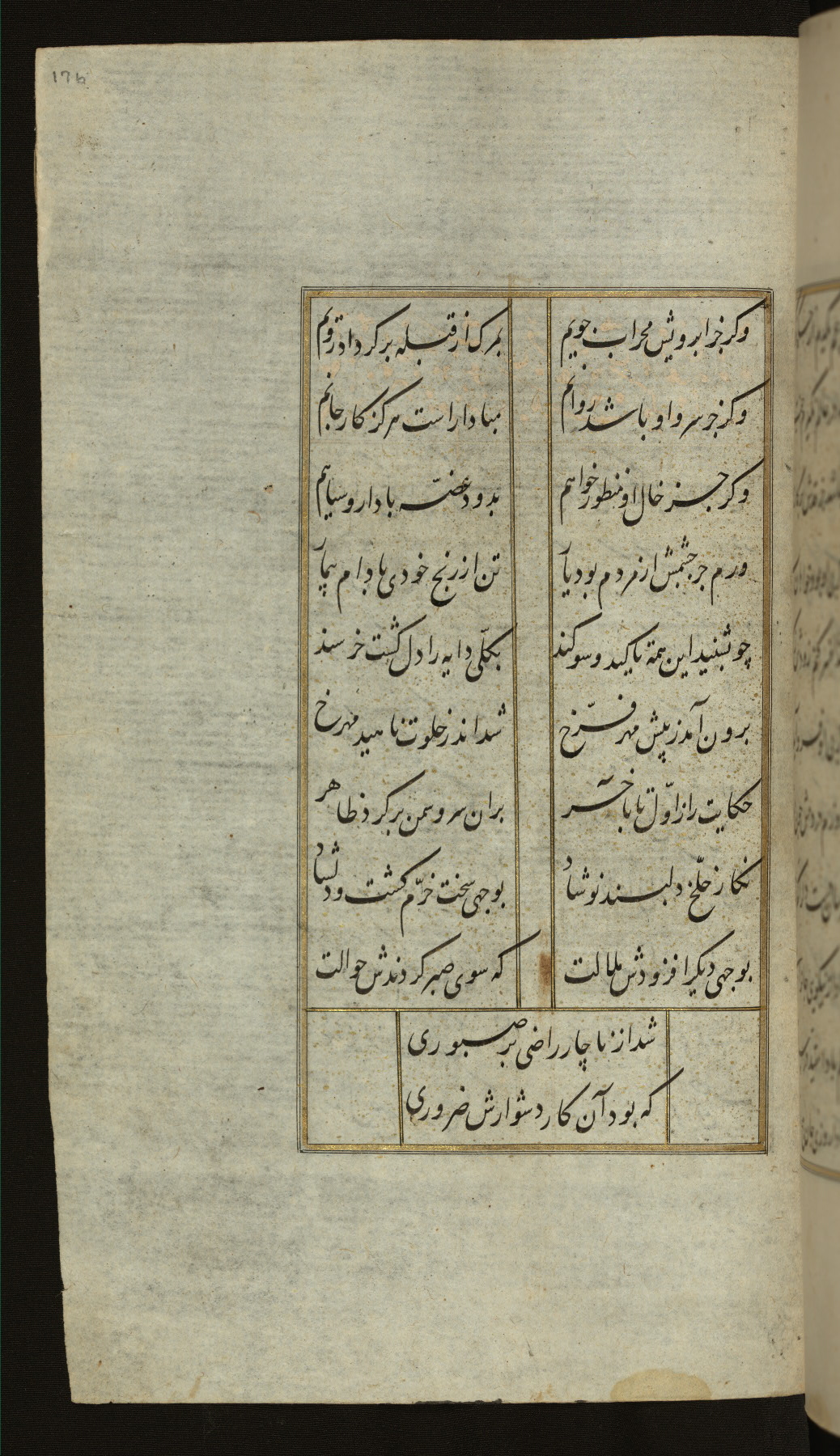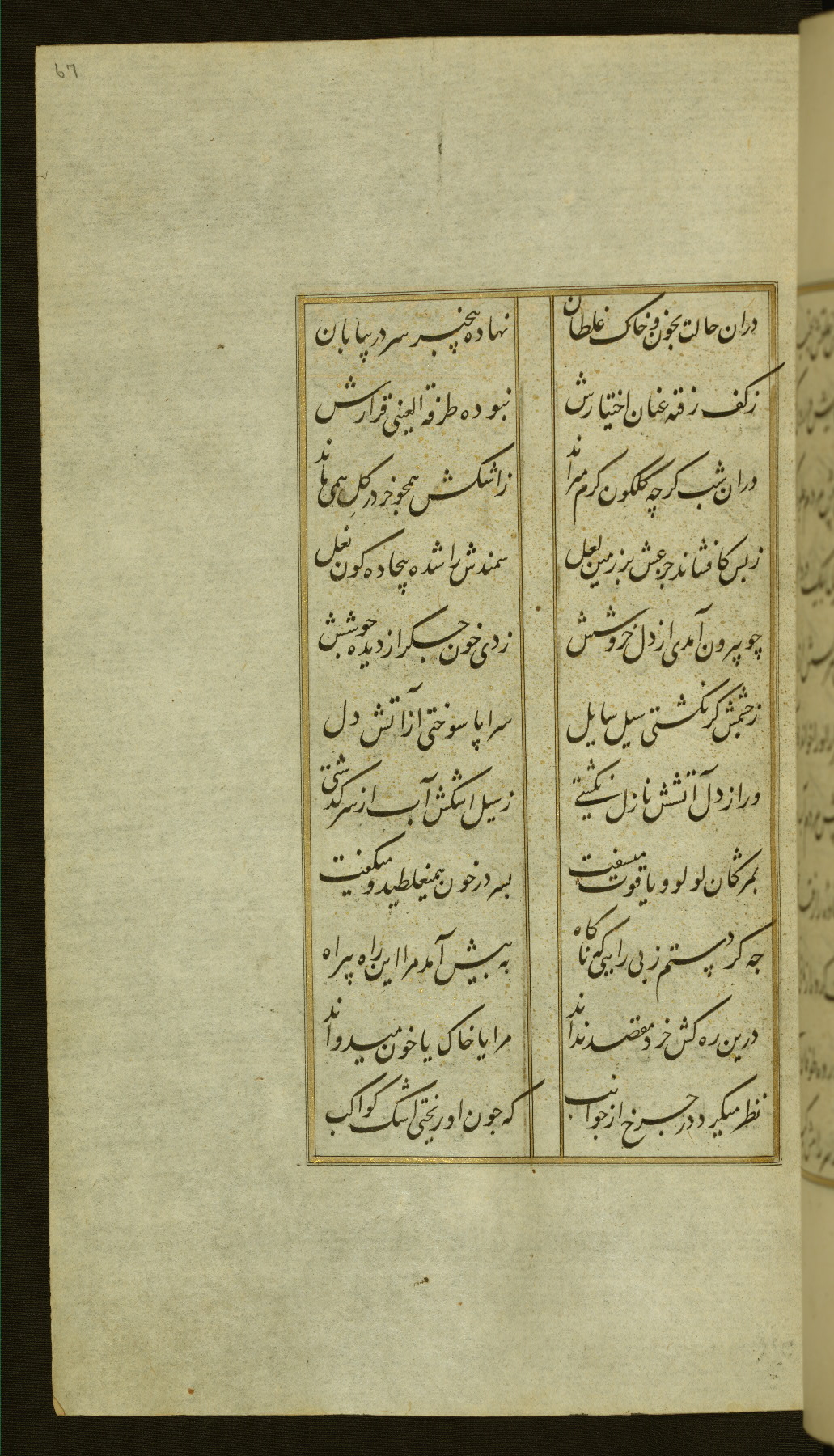 This manuscript is an illustrated copy of the well-known poem recounting the platonic love story between Mihr (the Sun), the son of Shāhpūr, and his vizier's son Mushtarī (Jupiter). The story of 90 chapters was composed by Muḥammad ibn Aḥmad ‘Aṣṣār Tabrīzī (d. 784 AH / 1382 CE). The present copy was written in nasta‘līq script by Murshid al-Kātib in 881 AH / 1476 CE. Considering the number of surviving manuscripts in which this calligrapher’s name is found, it seems he was particularly prolific. The present codex is illustrated with nine paintings. The gold-brushed leather binding with doublures of red leather decorated with filigree work is original to the manuscript.