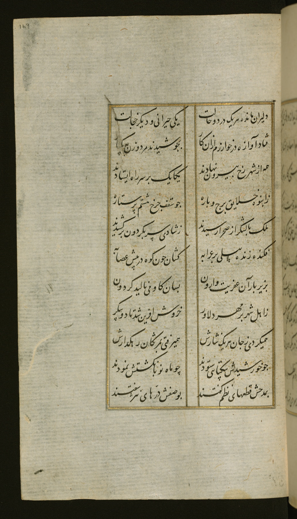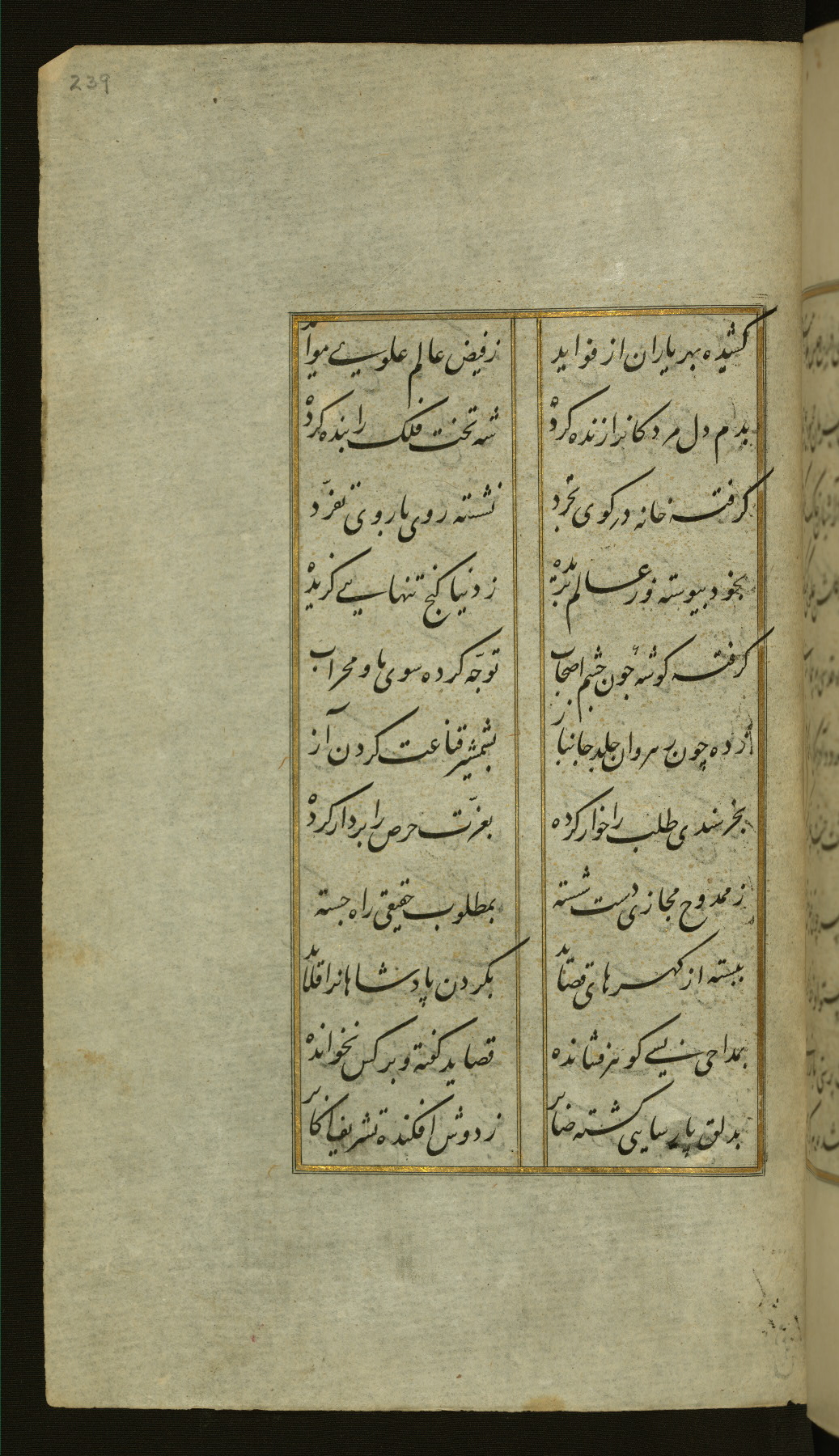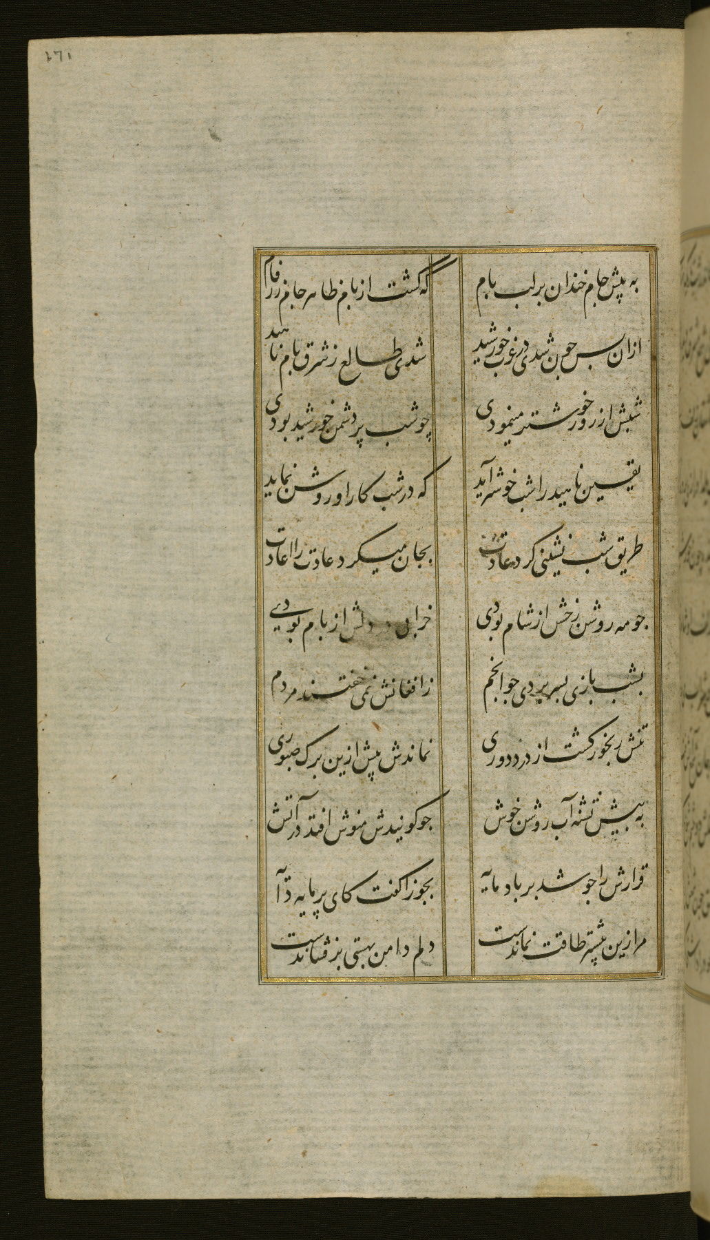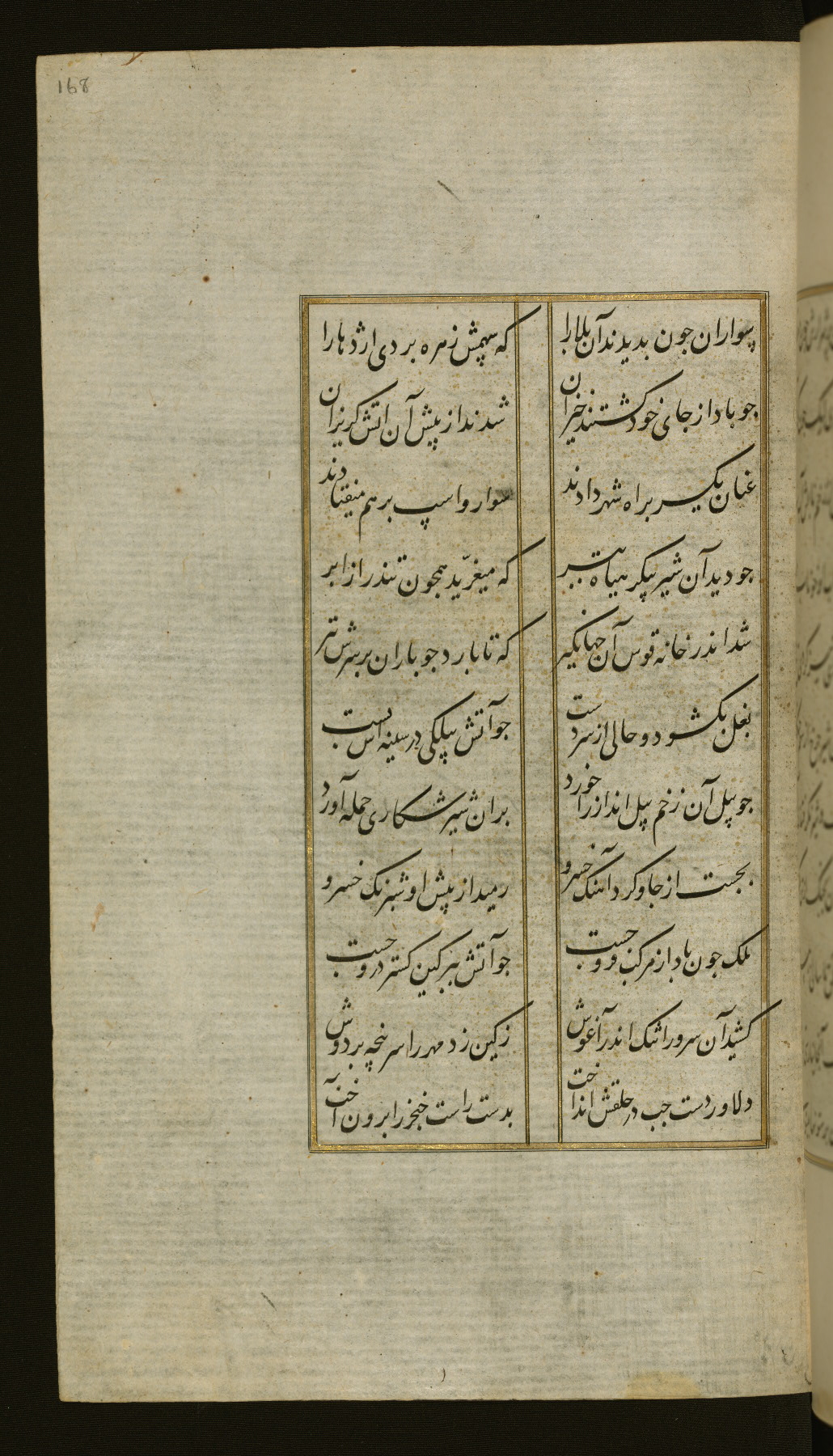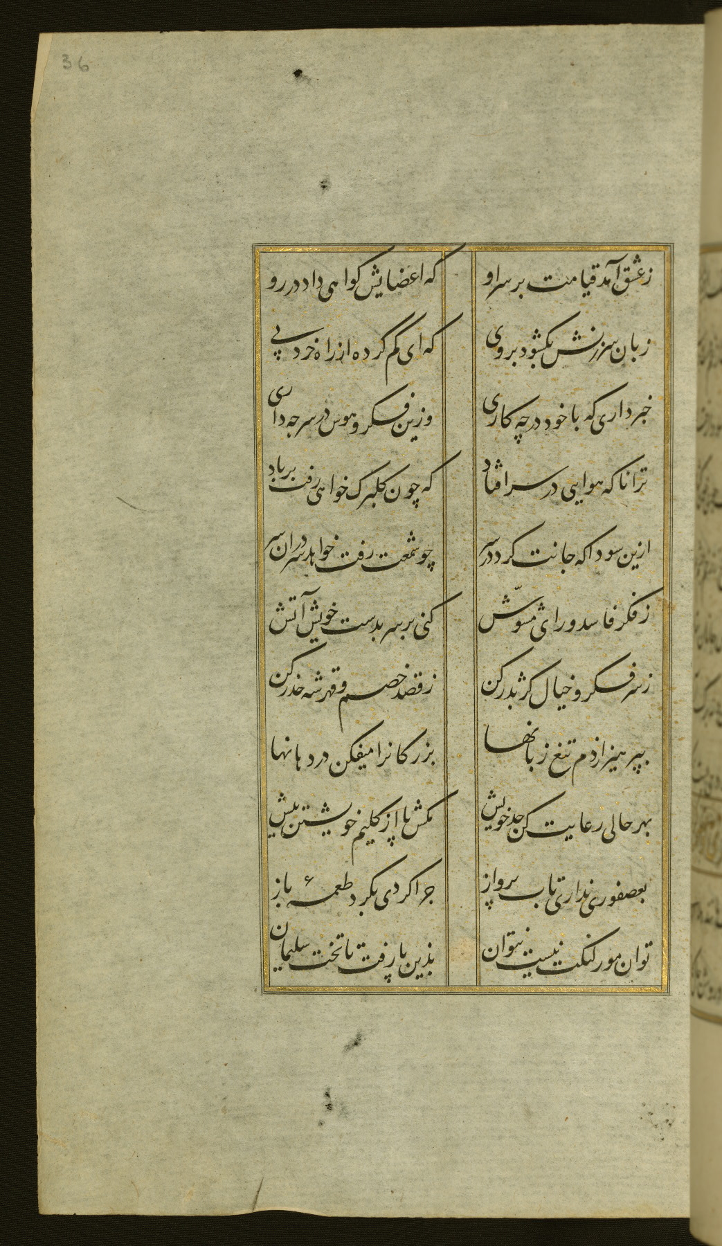 This manuscript is an illustrated copy of the well-known poem recounting the platonic love story between Mihr (the Sun), the son of Shāhpūr, and his vizier's son Mushtarī (Jupiter). The story of 90 chapters was composed by Muḥammad ibn Aḥmad ‘Aṣṣār Tabrīzī (d. 784 AH / 1382 CE). The present copy was written in nasta‘līq script by Murshid al-Kātib in 881 AH / 1476 CE. Considering the number of surviving manuscripts in which this calligrapher’s name is found, it seems he was particularly prolific. The present codex is illustrated with nine paintings. The gold-brushed leather binding with doublures of red leather decorated with filigree work is original to the manuscript.