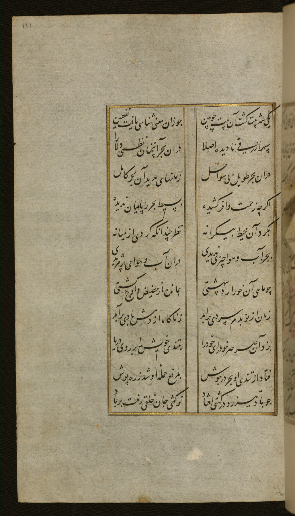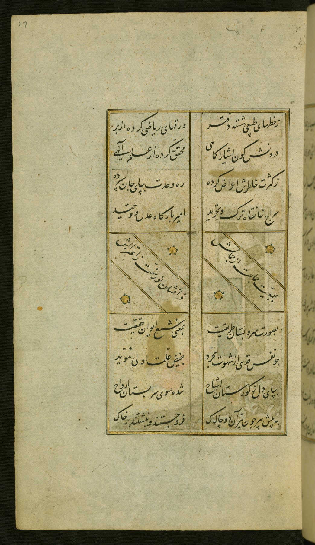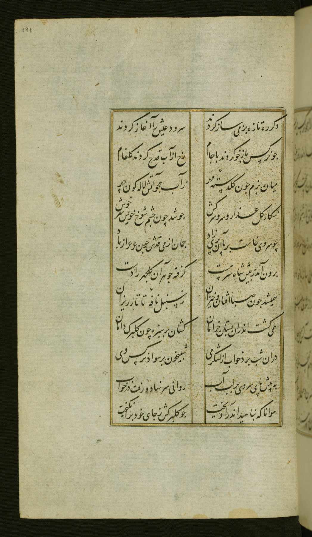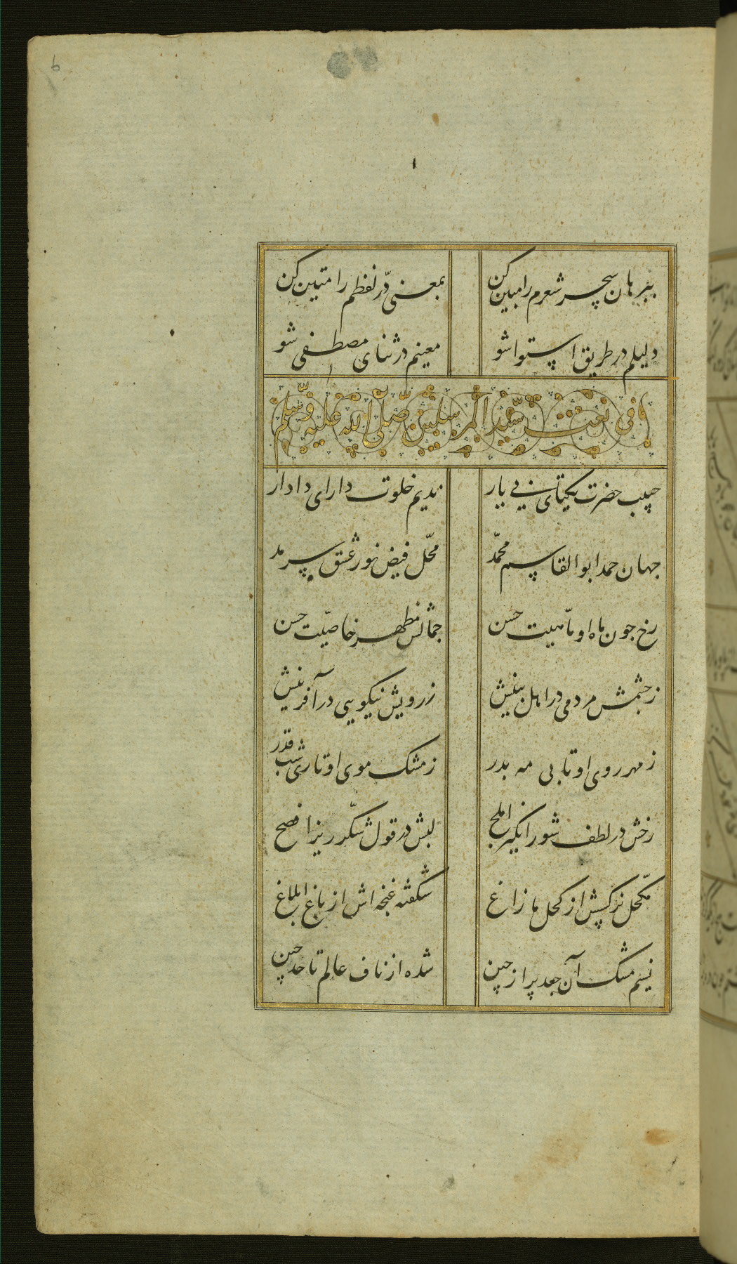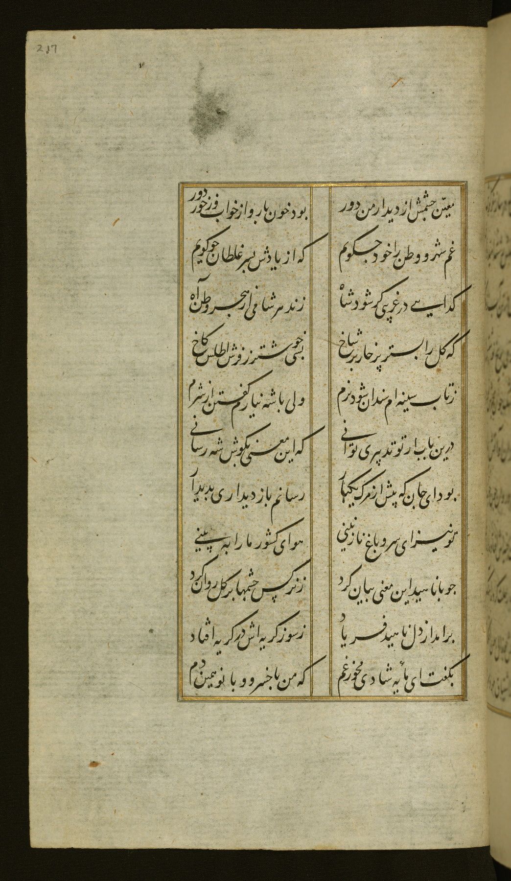 This manuscript is an illustrated copy of the well-known poem recounting the platonic love story between Mihr (the Sun), the son of Shāhpūr, and his vizier's son Mushtarī (Jupiter). The story of 90 chapters was composed by Muḥammad ibn Aḥmad ‘Aṣṣār Tabrīzī (d. 784 AH / 1382 CE). The present copy was written in nasta‘līq script by Murshid al-Kātib in 881 AH / 1476 CE. Considering the number of surviving manuscripts in which this calligrapher’s name is found, it seems he was particularly prolific. The present codex is illustrated with nine paintings. The gold-brushed leather binding with doublures of red leather decorated with filigree work is original to the manuscript.