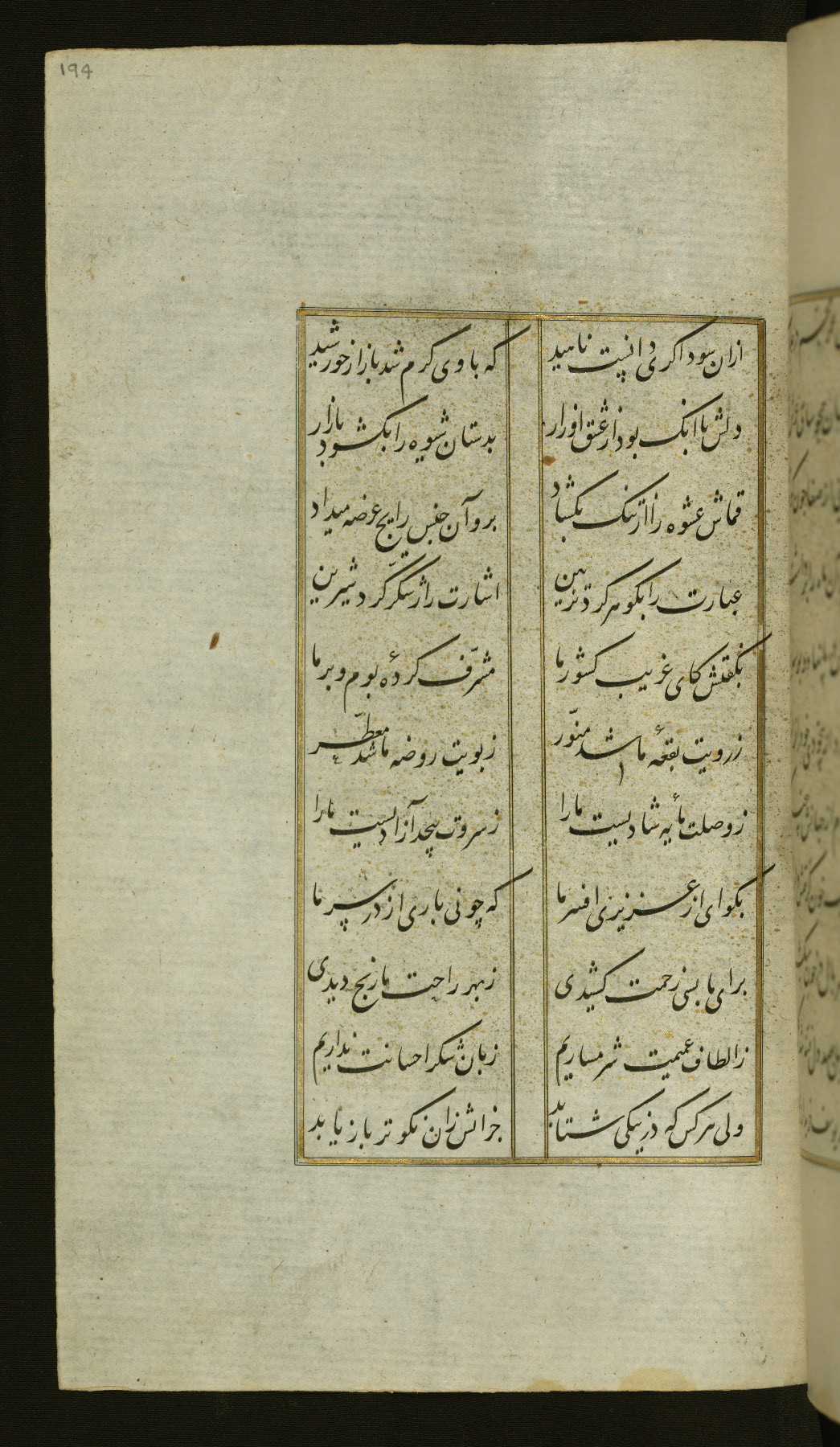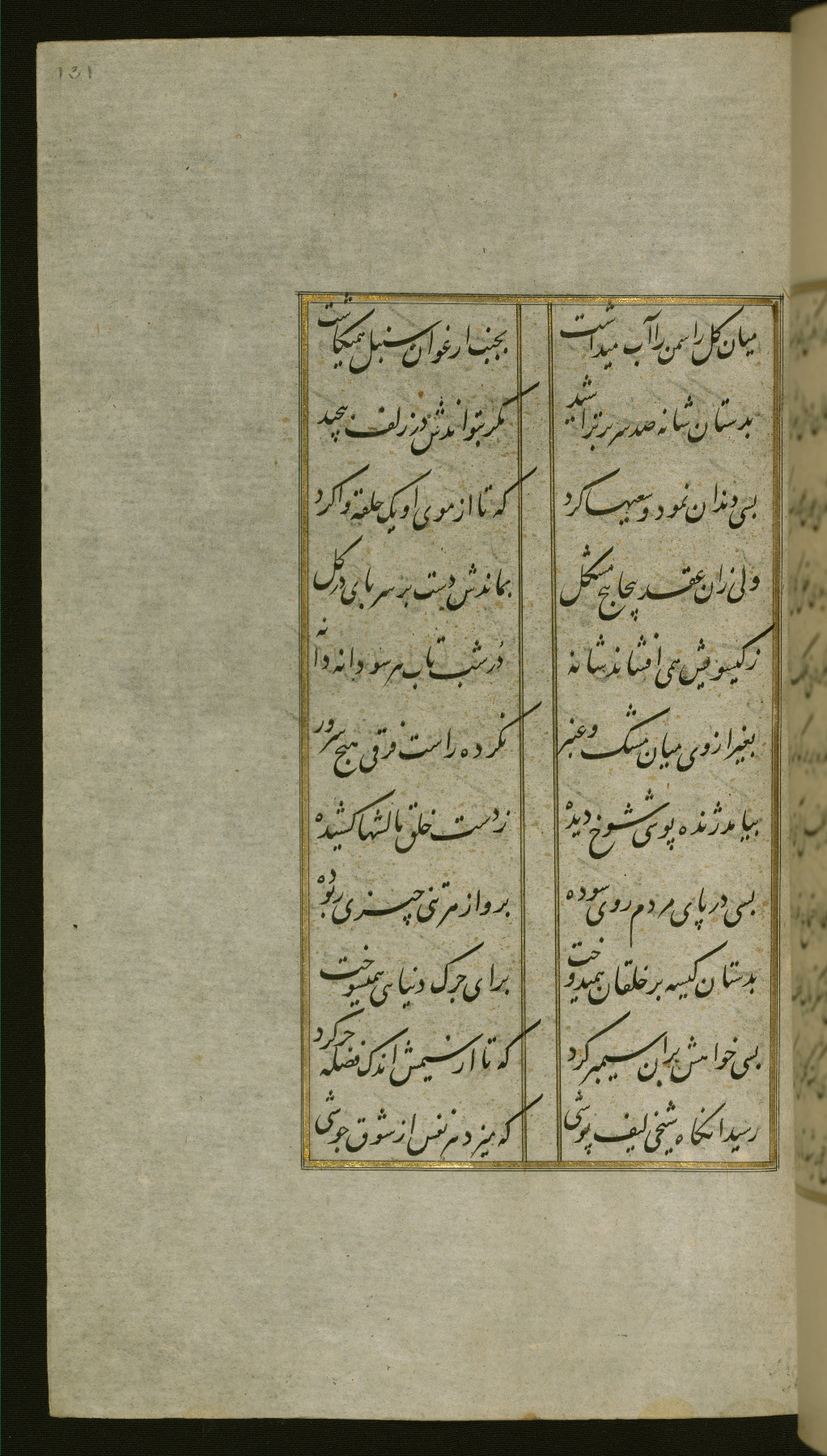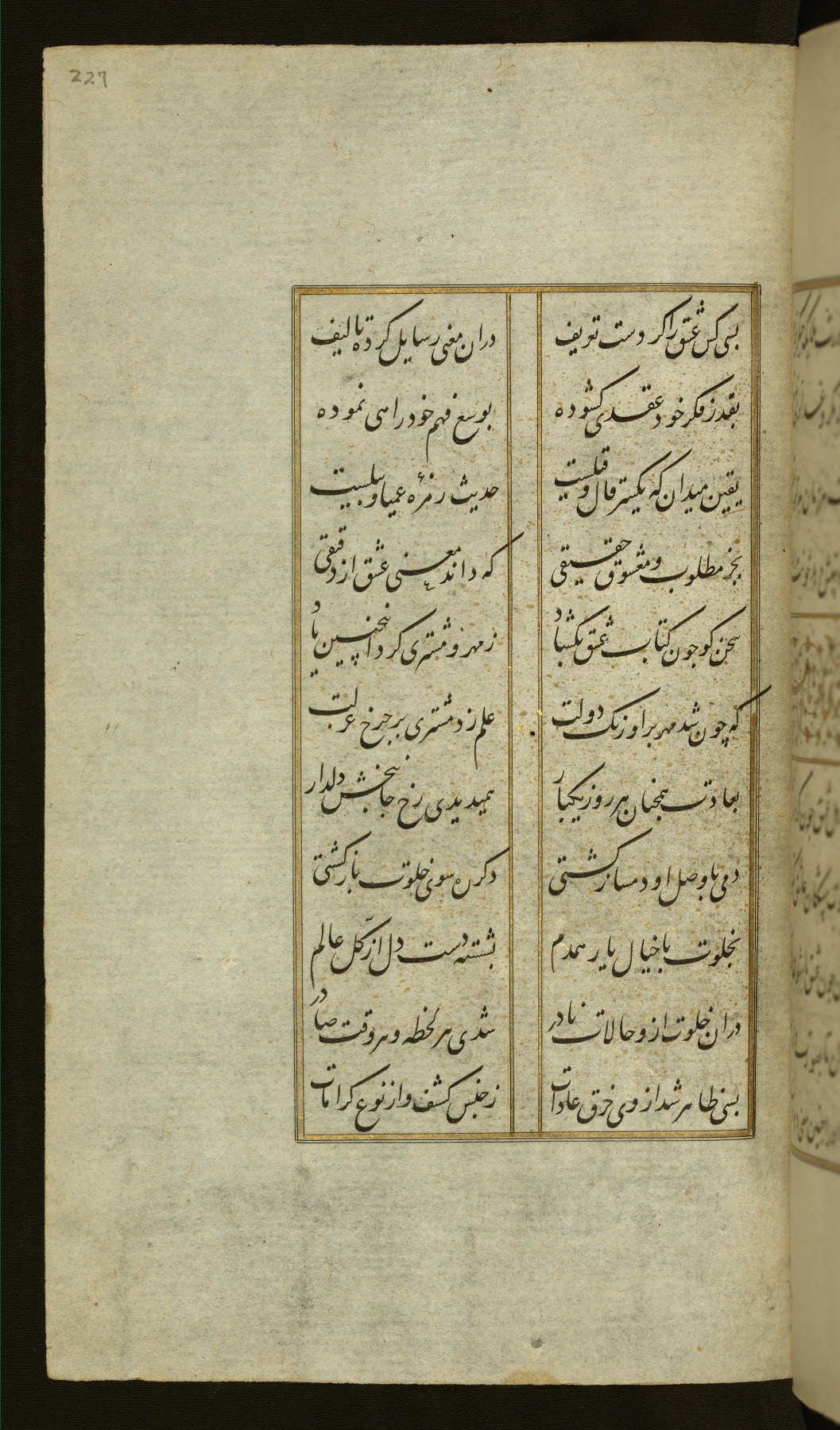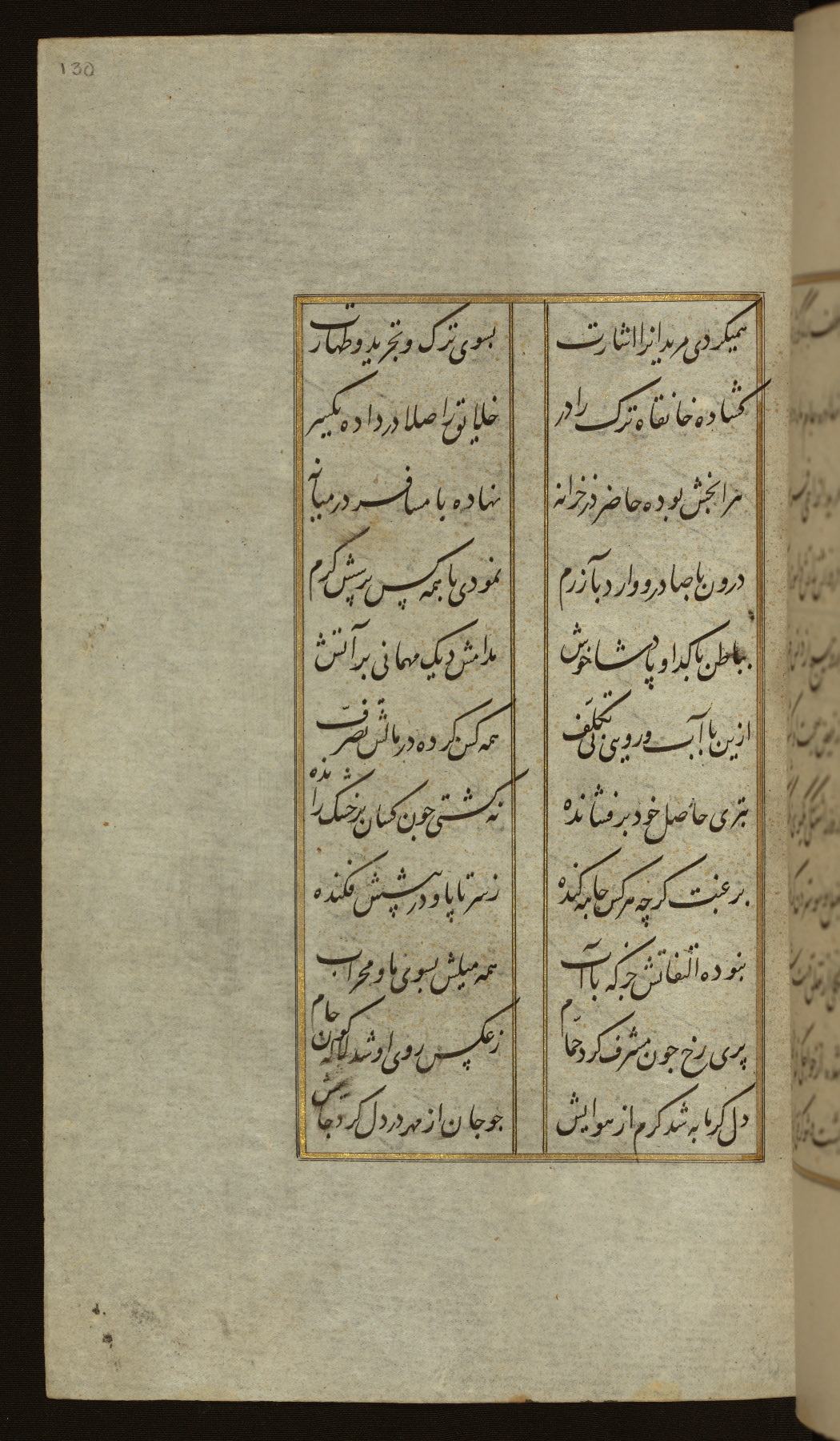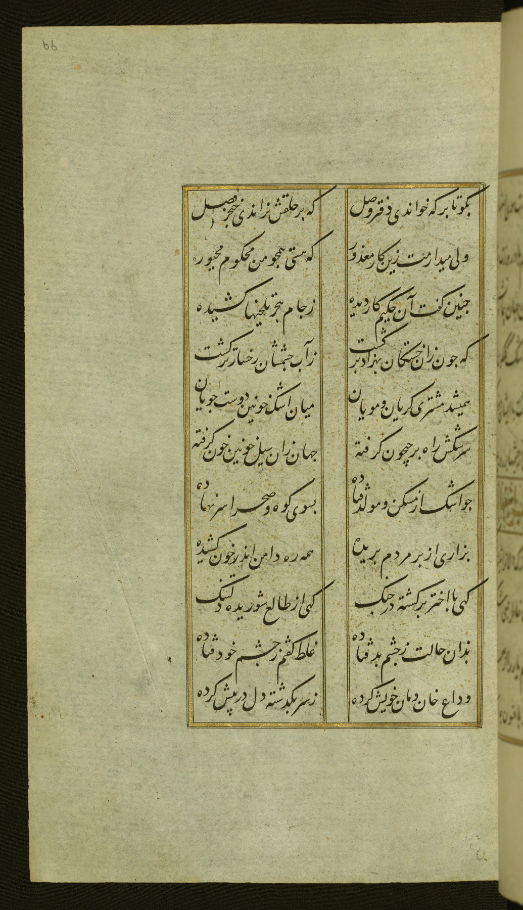 This manuscript is an illustrated copy of the well-known poem recounting the platonic love story between Mihr (the Sun), the son of Shāhpūr, and his vizier's son Mushtarī (Jupiter). The story of 90 chapters was composed by Muḥammad ibn Aḥmad ‘Aṣṣār Tabrīzī (d. 784 AH / 1382 CE). The present copy was written in nasta‘līq script by Murshid al-Kātib in 881 AH / 1476 CE. Considering the number of surviving manuscripts in which this calligrapher’s name is found, it seems he was particularly prolific. The present codex is illustrated with nine paintings. The gold-brushed leather binding with doublures of red leather decorated with filigree work is original to the manuscript.