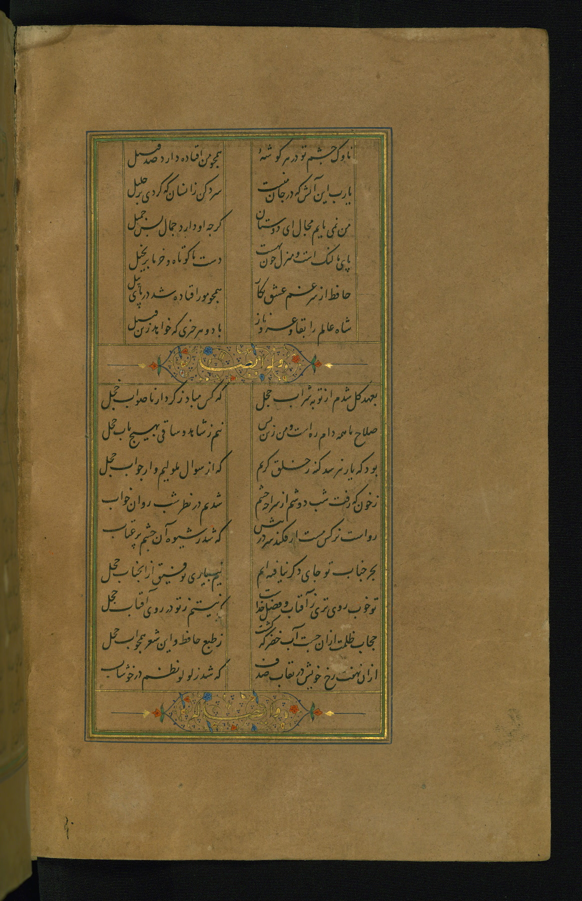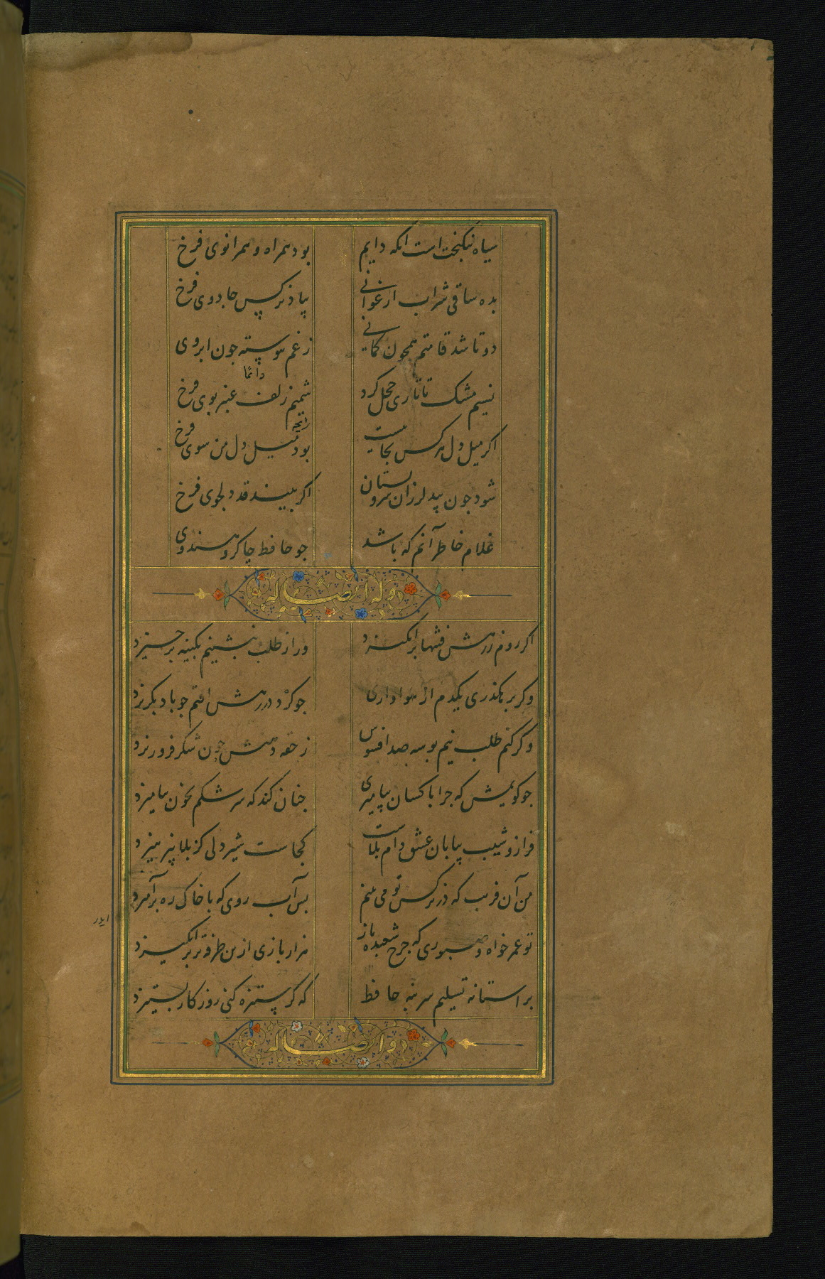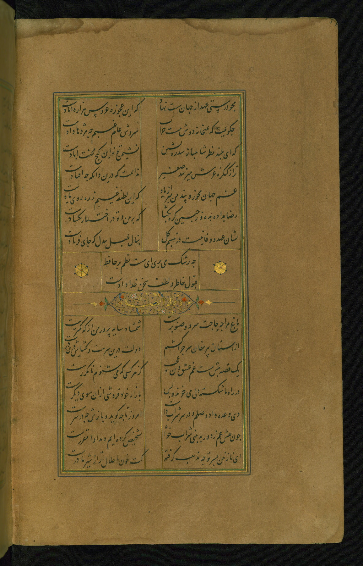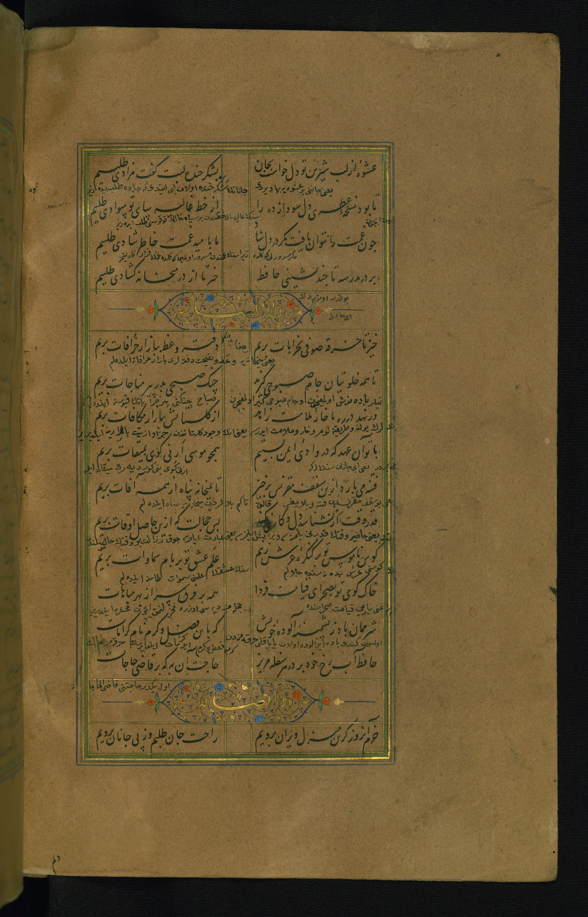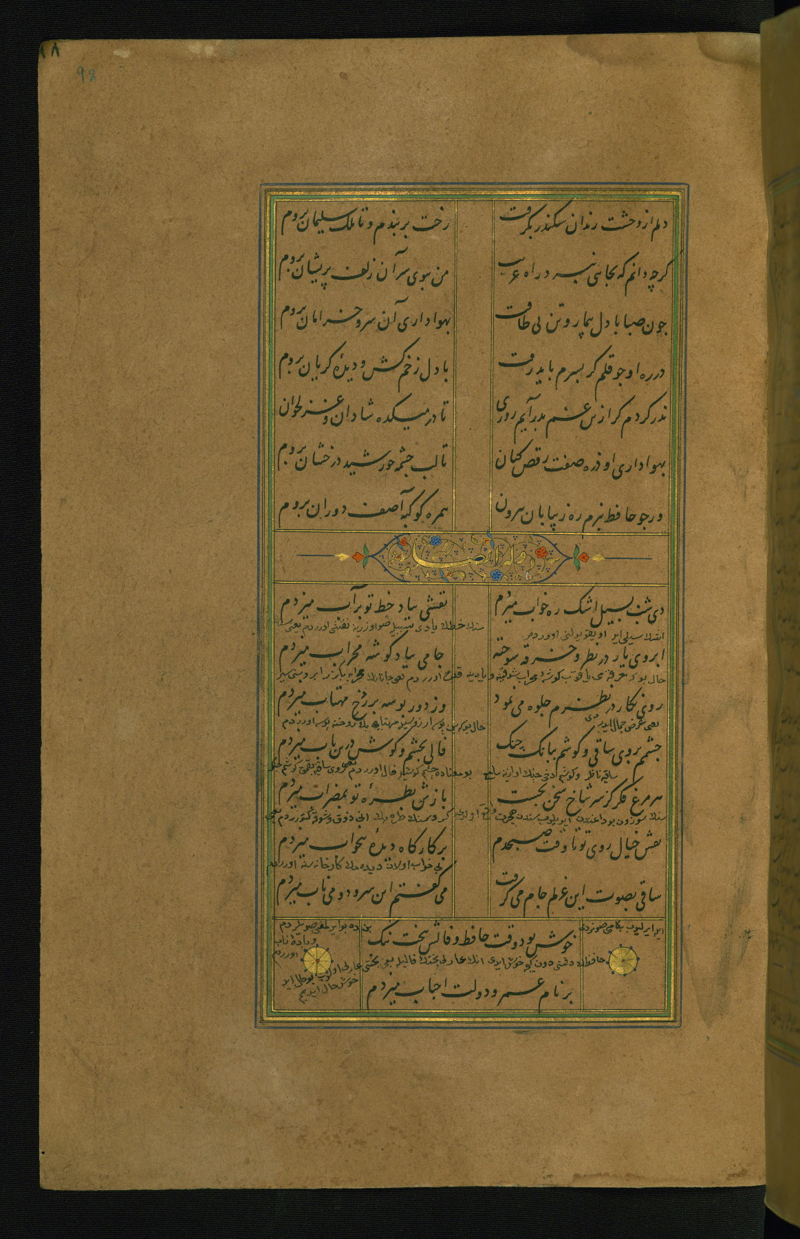 This is an illuminated and illustrated manuscript copy of the Collection of poems (dīvān) by Shams al-Dīn Muḥammad Ḥāfiz al-Shīrāzī (fl. eighth century AH / fourteenth CE). It was written in black nasta‘līq script with chapter/section headings in gold ink by Zayn al-‘Ābidīn ‘Abd al-Raḥmān al-Jāmī in 918 AH / 1512 CE in Safavid Iran. The manuscript opens with an illuminated medallion (fol. 1a), followed by a double-page illustrated frontispiece (fols. 1b-2a). The text begins with an incipit page with illuminated headpiece (fol. 2b). There are three additional illustrations (fols. 24a, 49b, and 87a). The red leather binding, which is not original and may be attributed to late twelfth-century AH / eighteenth CE or thirteenth-century AH / nineteenth CE Turkey, has a scalloped medallion with gold-tooled decoration and borders.