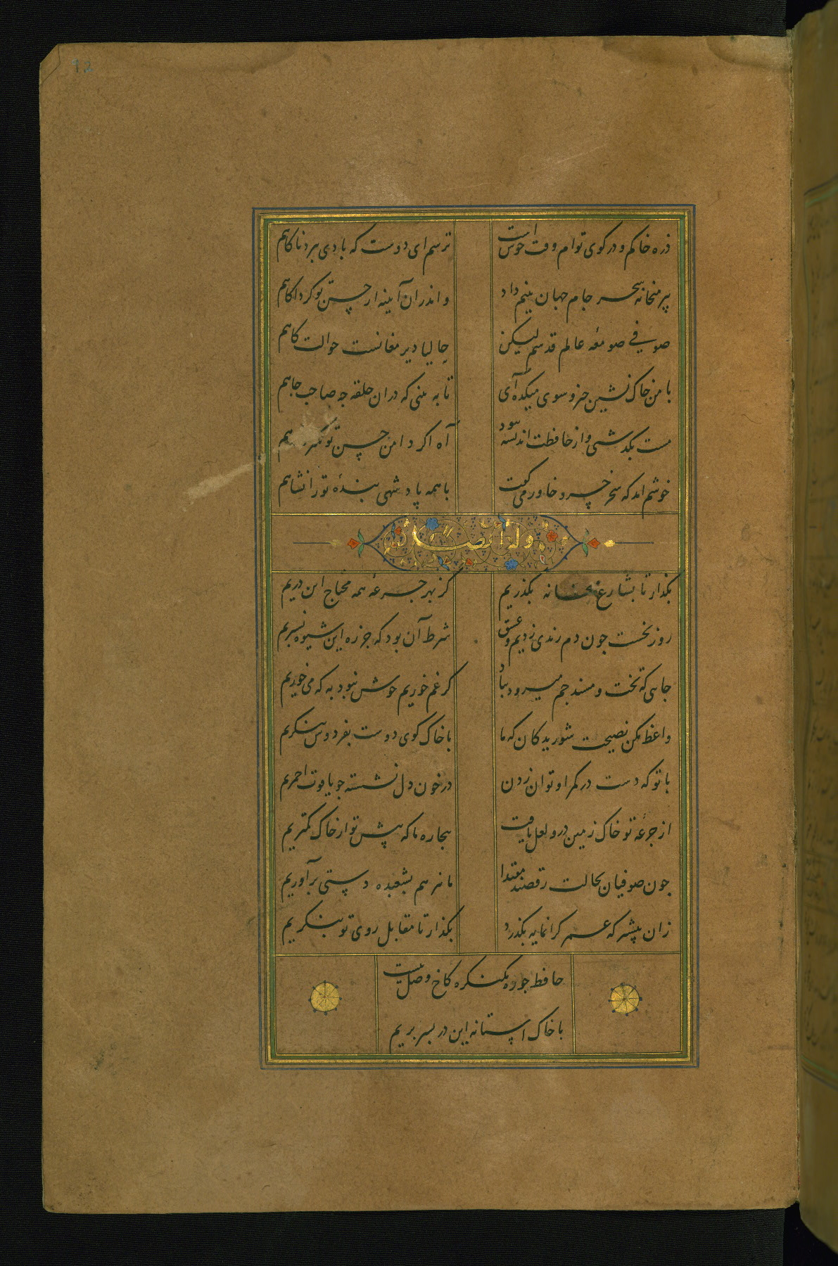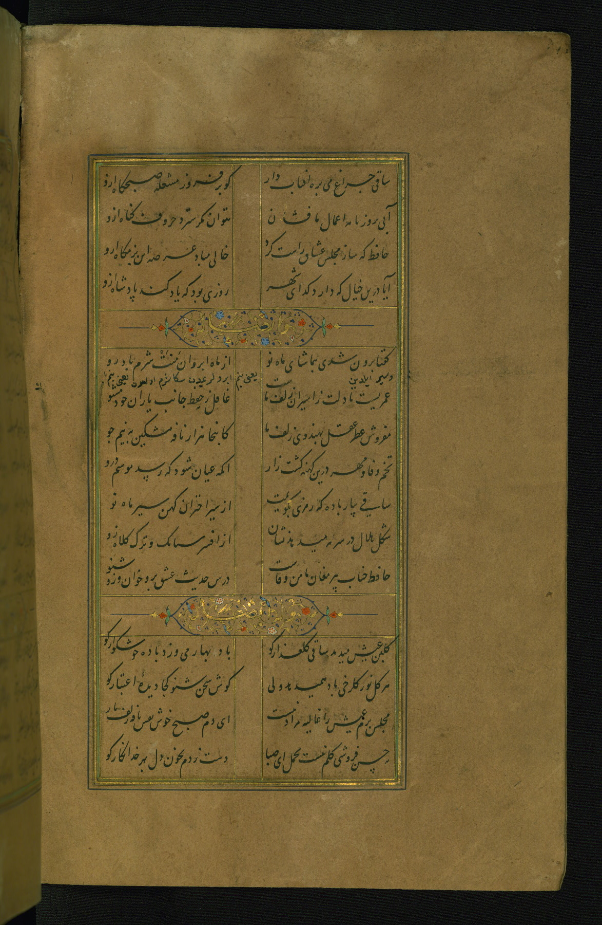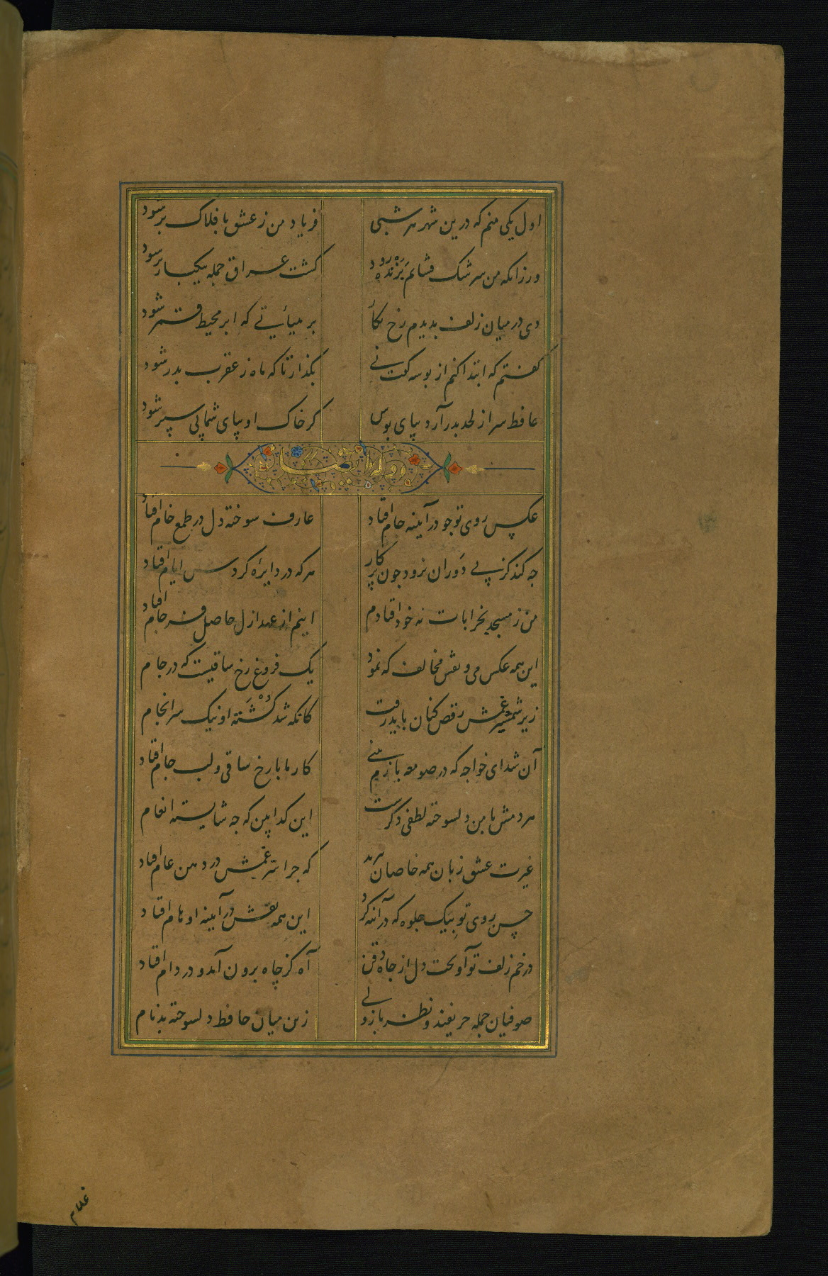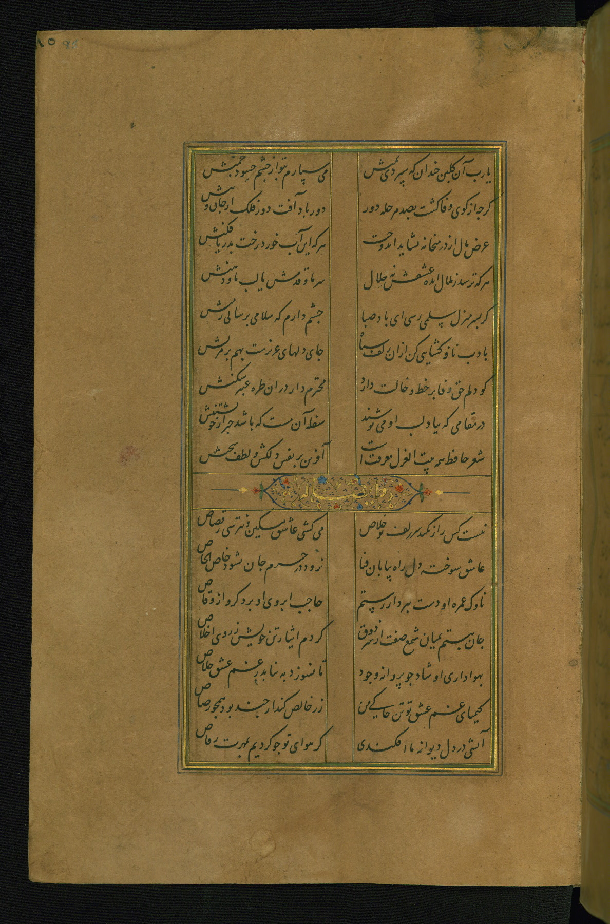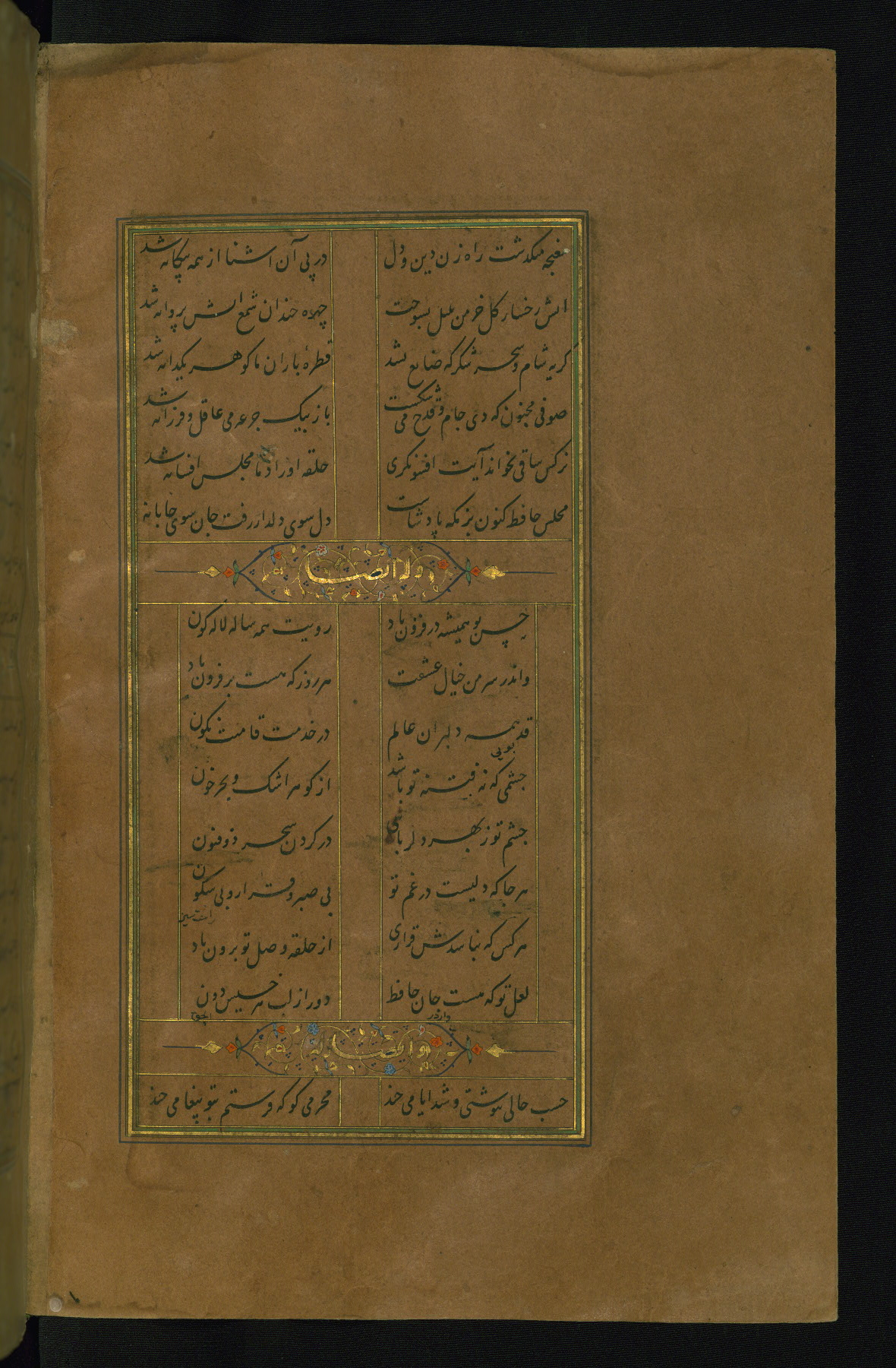 This is an illuminated and illustrated manuscript copy of the Collection of poems (dīvān) by Shams al-Dīn Muḥammad Ḥāfiz al-Shīrāzī (fl. eighth century AH / fourteenth CE). It was written in black nasta‘līq script with chapter/section headings in gold ink by Zayn al-‘Ābidīn ‘Abd al-Raḥmān al-Jāmī in 918 AH / 1512 CE in Safavid Iran. The manuscript opens with an illuminated medallion (fol. 1a), followed by a double-page illustrated frontispiece (fols. 1b-2a). The text begins with an incipit page with illuminated headpiece (fol. 2b). There are three additional illustrations (fols. 24a, 49b, and 87a). The red leather binding, which is not original and may be attributed to late twelfth-century AH / eighteenth CE or thirteenth-century AH / nineteenth CE Turkey, has a scalloped medallion with gold-tooled decoration and borders.