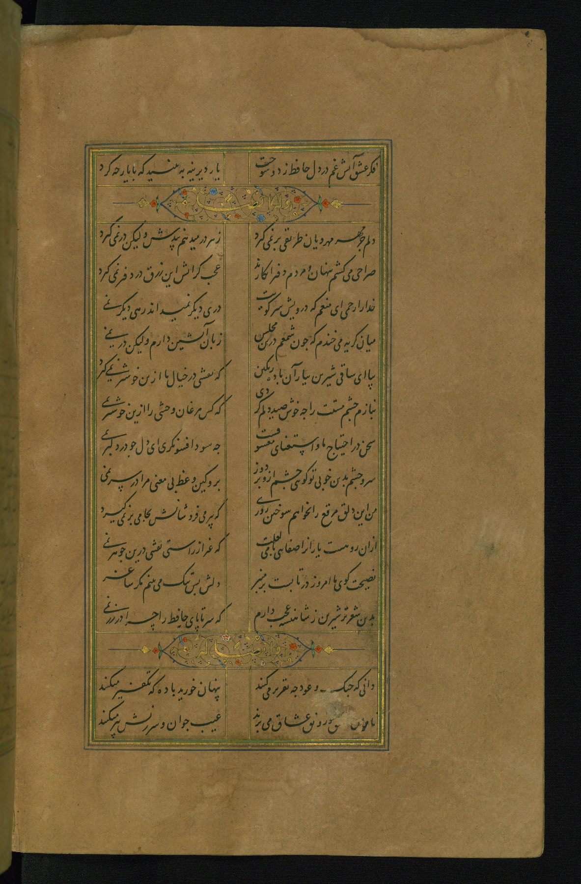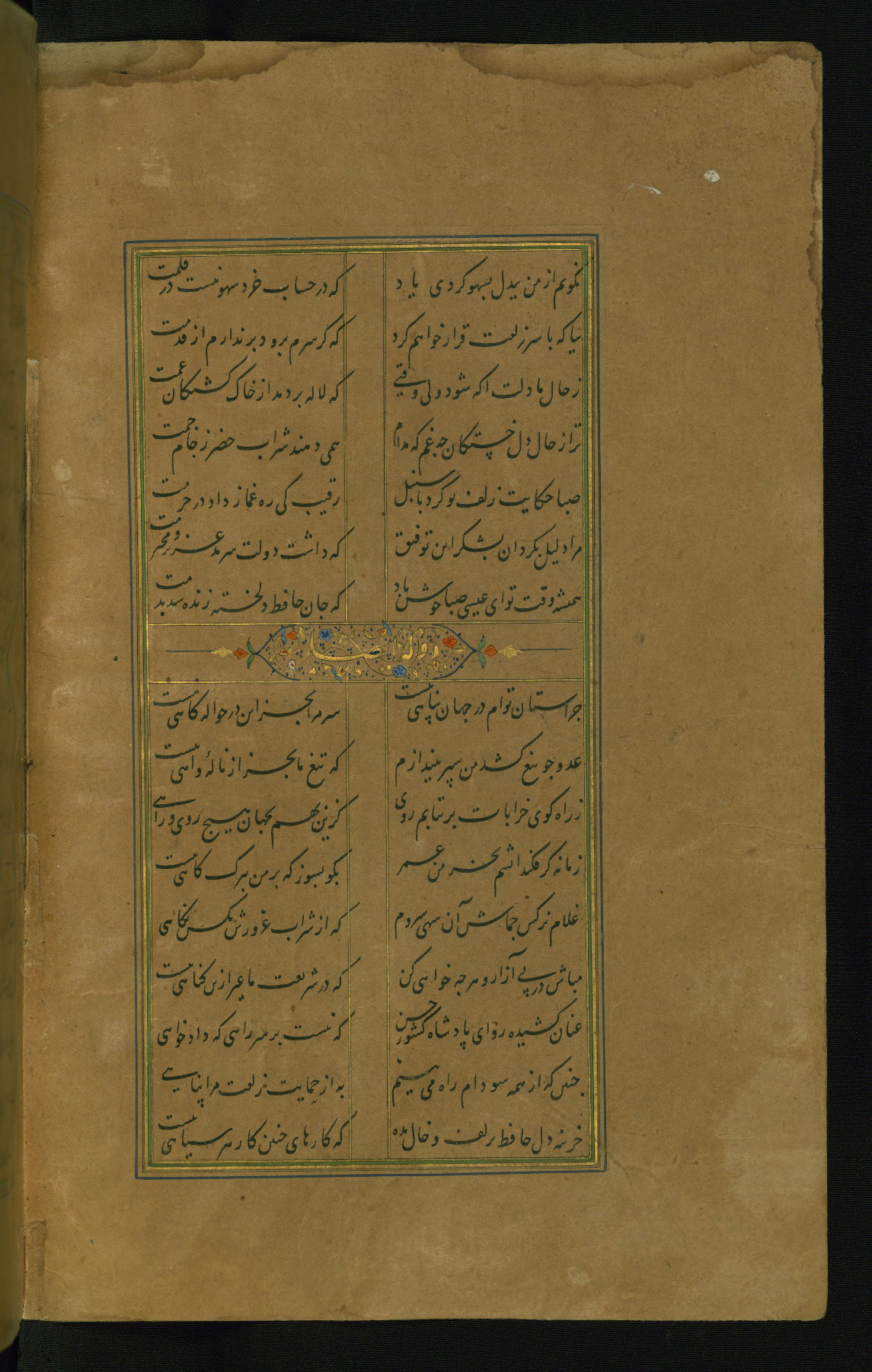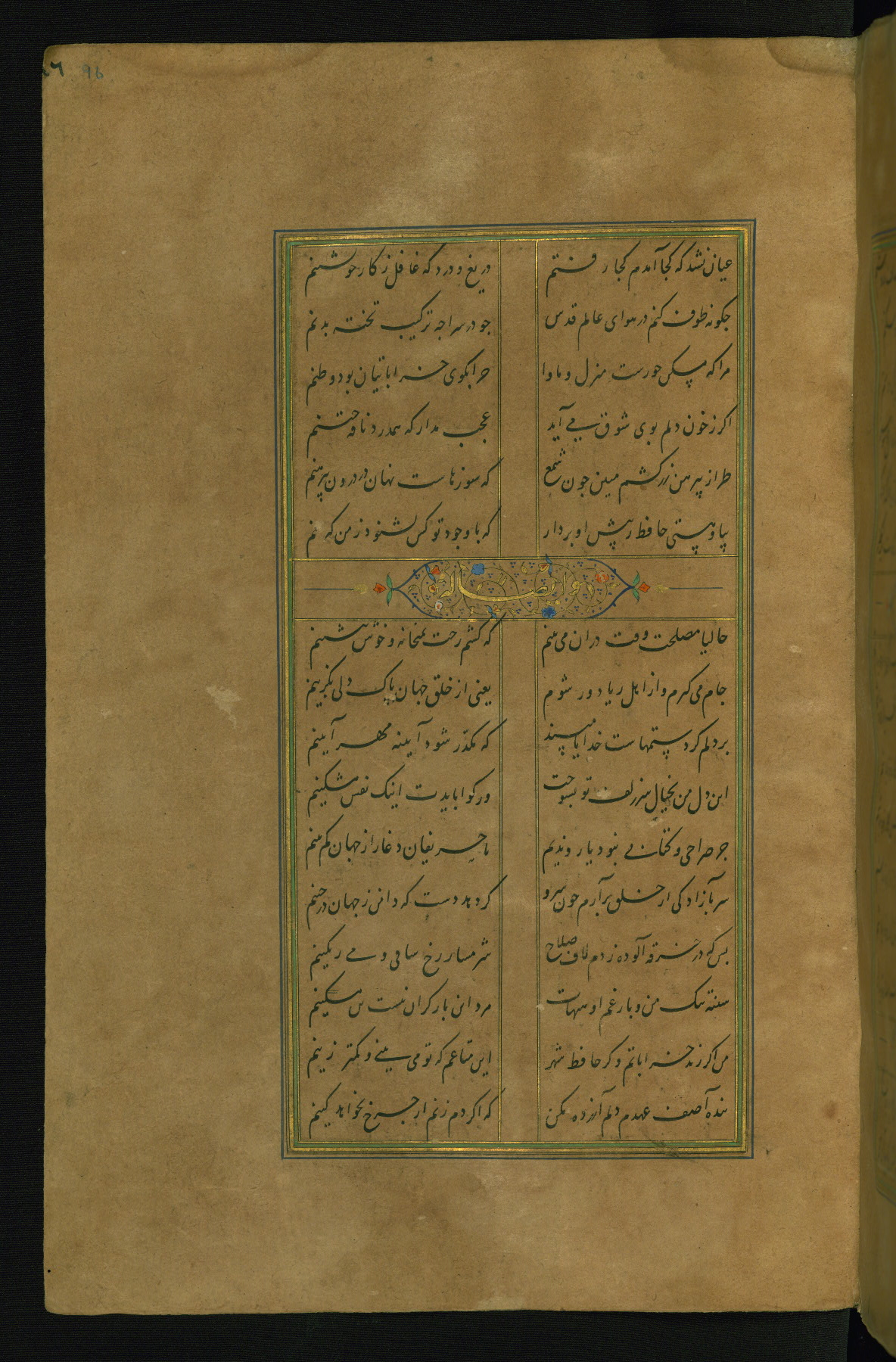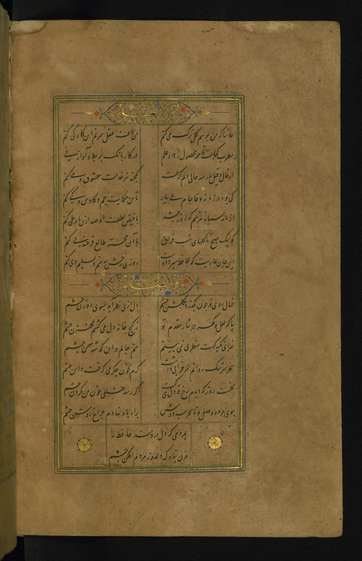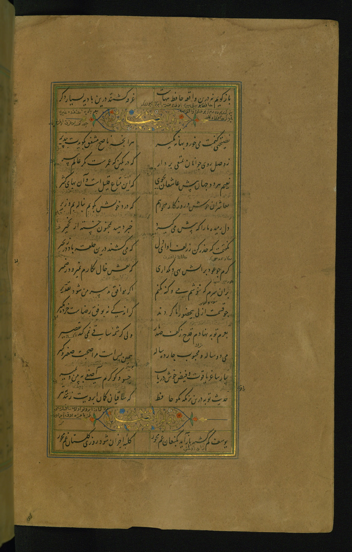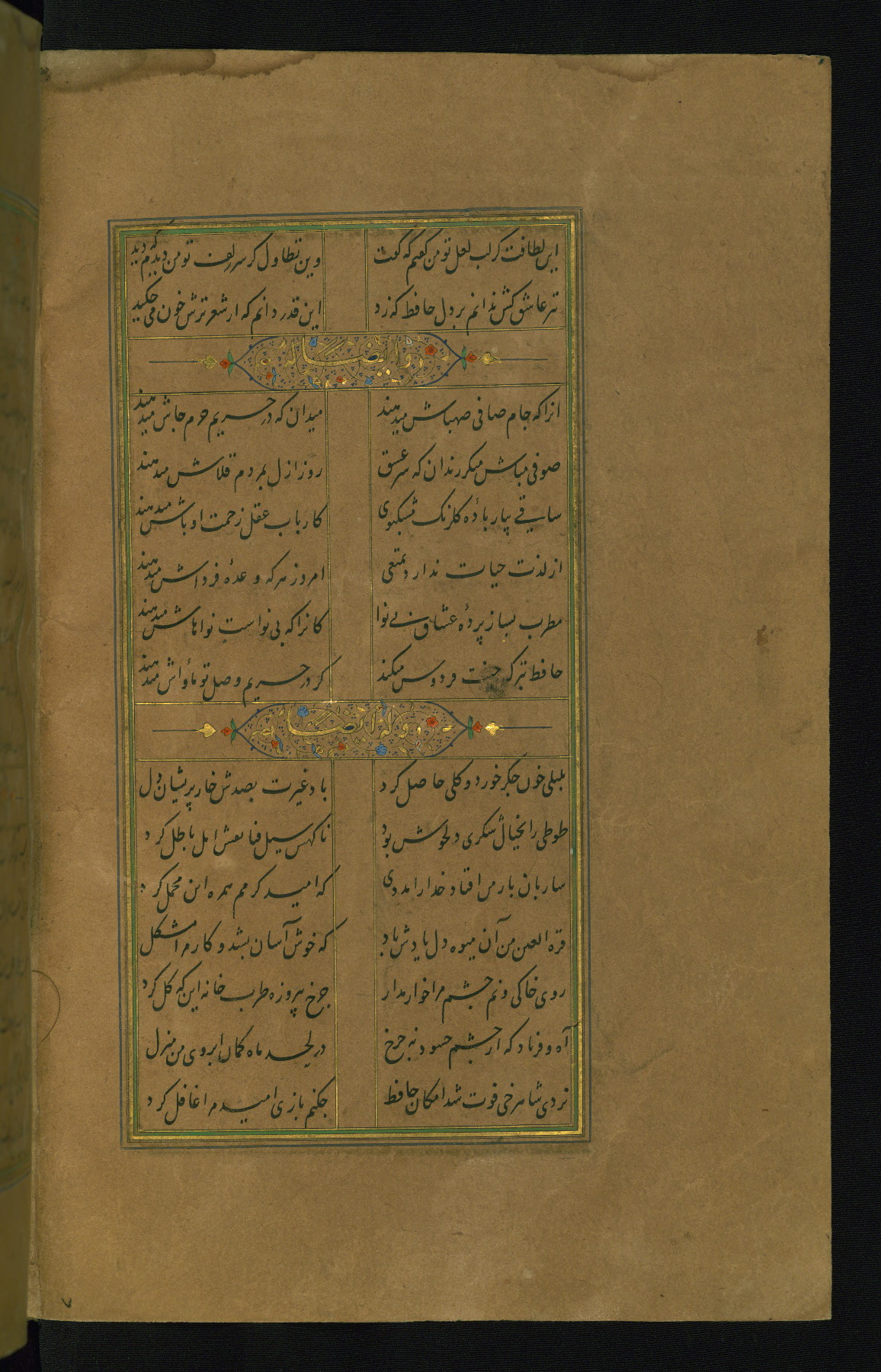 This is an illuminated and illustrated manuscript copy of the Collection of poems (dīvān) by Shams al-Dīn Muḥammad Ḥāfiz al-Shīrāzī (fl. eighth century AH / fourteenth CE). It was written in black nasta‘līq script with chapter/section headings in gold ink by Zayn al-‘Ābidīn ‘Abd al-Raḥmān al-Jāmī in 918 AH / 1512 CE in Safavid Iran. The manuscript opens with an illuminated medallion (fol. 1a), followed by a double-page illustrated frontispiece (fols. 1b-2a). The text begins with an incipit page with illuminated headpiece (fol. 2b). There are three additional illustrations (fols. 24a, 49b, and 87a). The red leather binding, which is not original and may be attributed to late twelfth-century AH / eighteenth CE or thirteenth-century AH / nineteenth CE Turkey, has a scalloped medallion with gold-tooled decoration and borders.