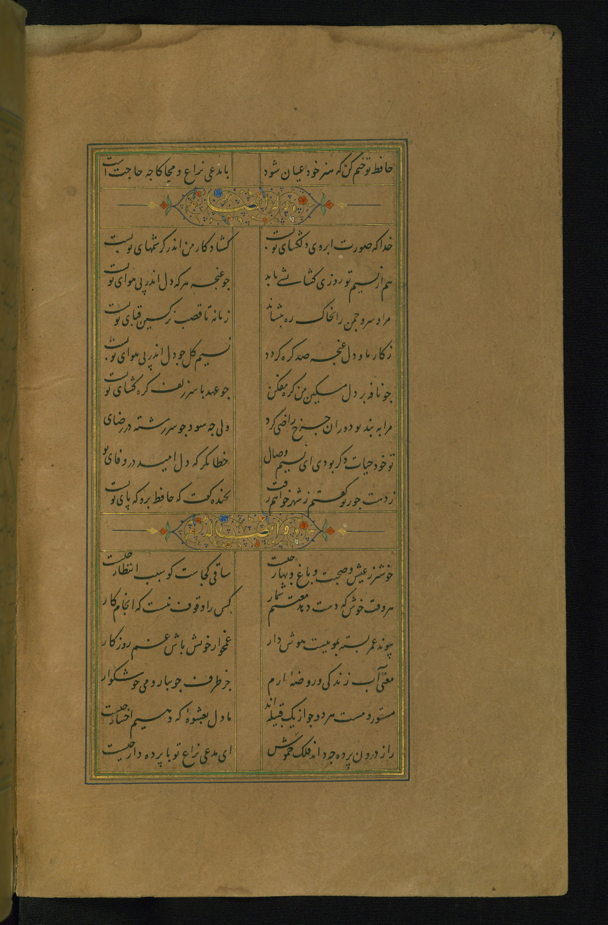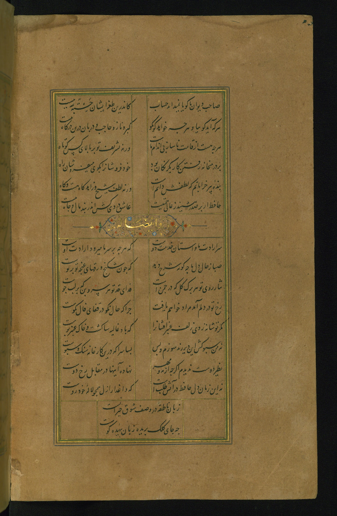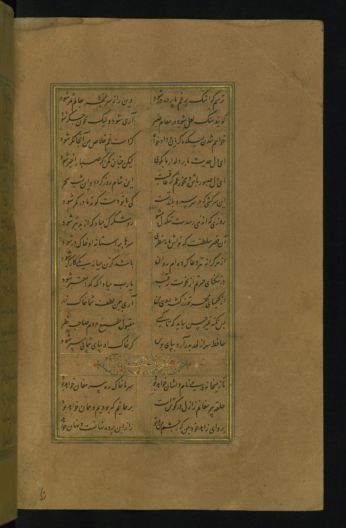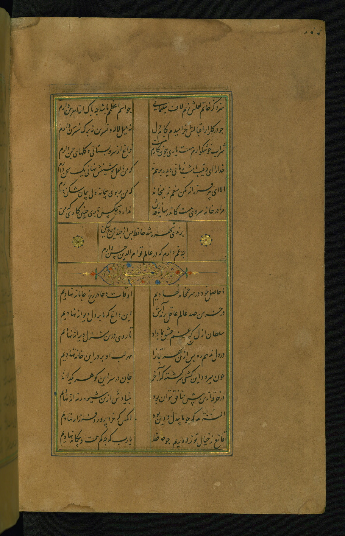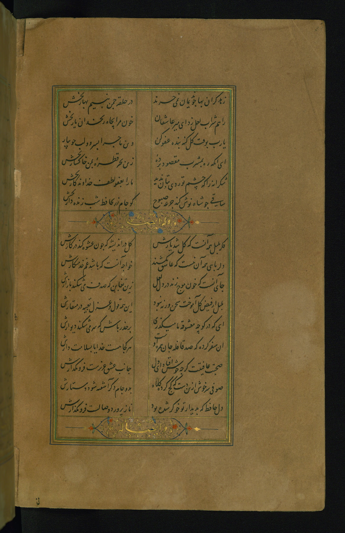 This is an illuminated and illustrated manuscript copy of the Collection of poems (dīvān) by Shams al-Dīn Muḥammad Ḥāfiz al-Shīrāzī (fl. eighth century AH / fourteenth CE). It was written in black nasta‘līq script with chapter/section headings in gold ink by Zayn al-‘Ābidīn ‘Abd al-Raḥmān al-Jāmī in 918 AH / 1512 CE in Safavid Iran. The manuscript opens with an illuminated medallion (fol. 1a), followed by a double-page illustrated frontispiece (fols. 1b-2a). The text begins with an incipit page with illuminated headpiece (fol. 2b). There are three additional illustrations (fols. 24a, 49b, and 87a). The red leather binding, which is not original and may be attributed to late twelfth-century AH / eighteenth CE or thirteenth-century AH / nineteenth CE Turkey, has a scalloped medallion with gold-tooled decoration and borders.