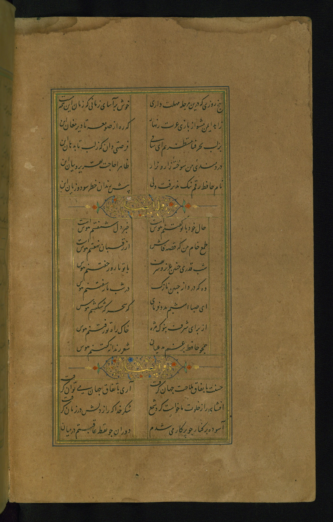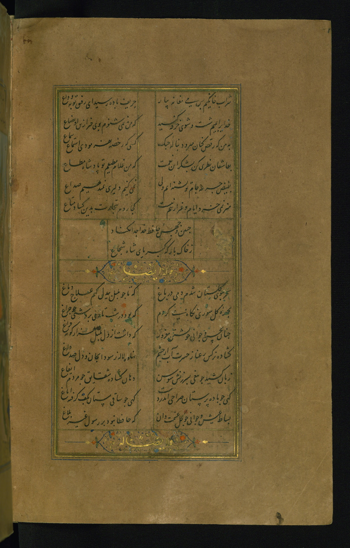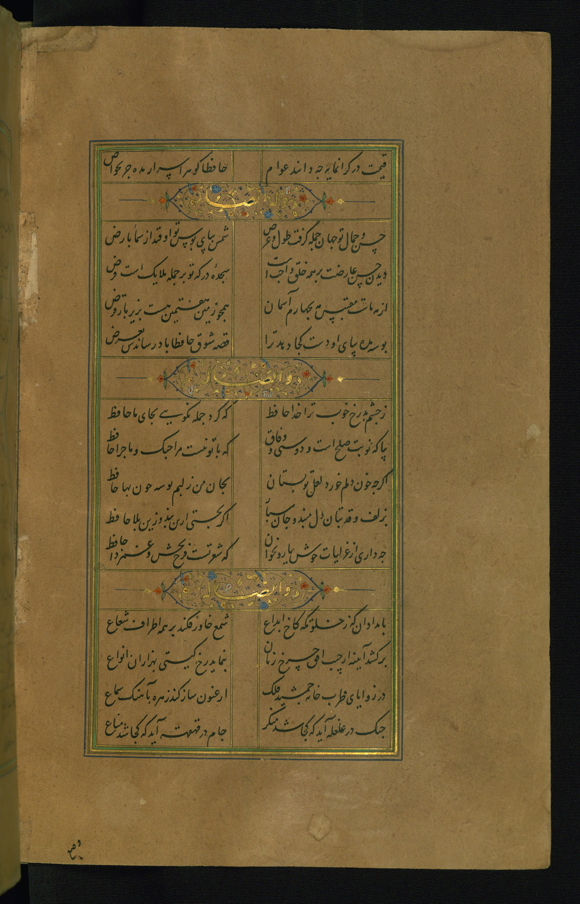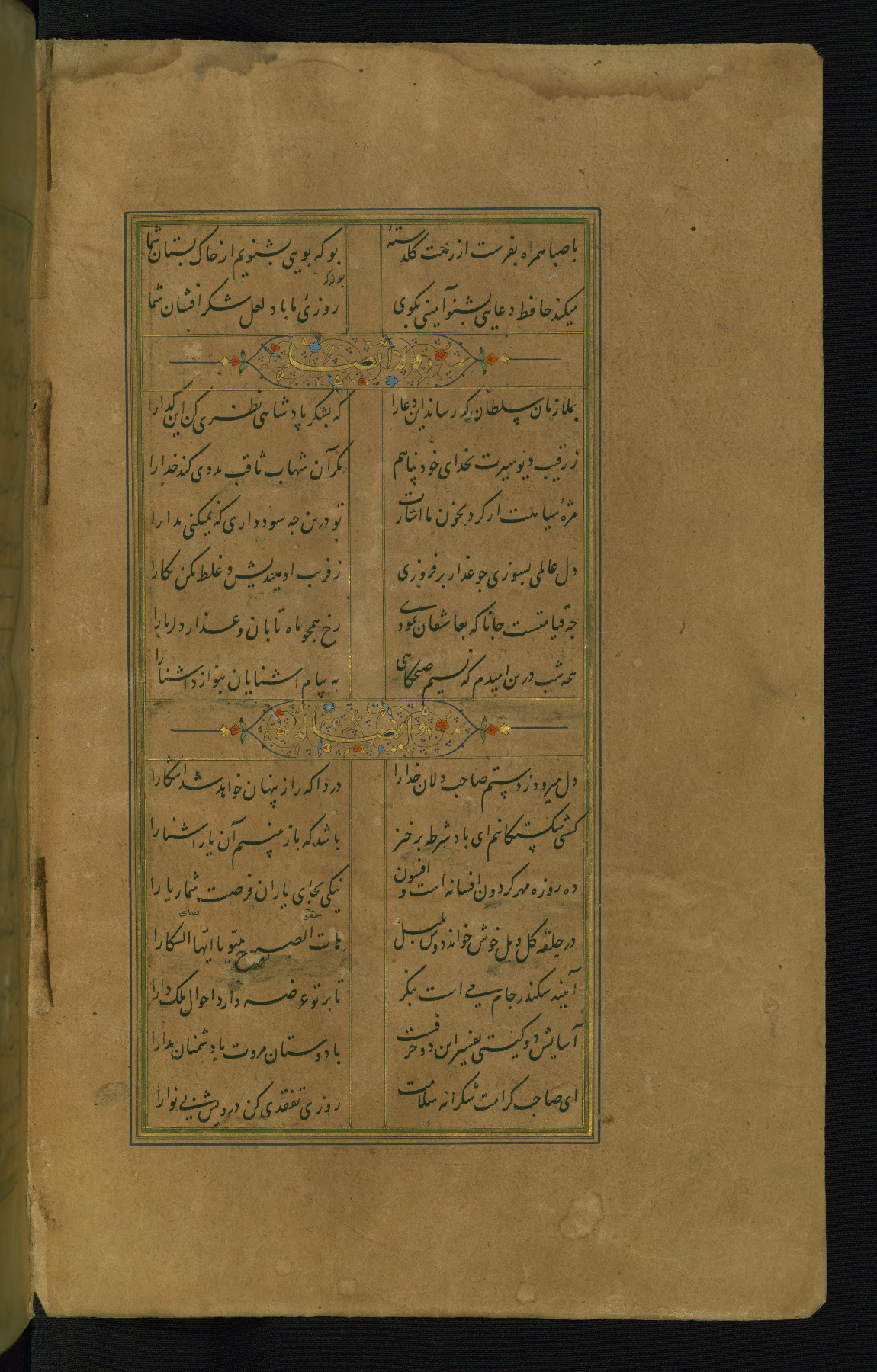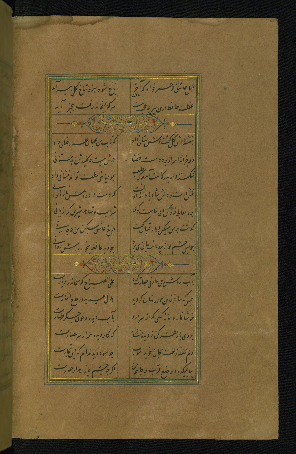 This is an illuminated and illustrated manuscript copy of the Collection of poems (dīvān) by Shams al-Dīn Muḥammad Ḥāfiz al-Shīrāzī (fl. eighth century AH / fourteenth CE). It was written in black nasta‘līq script with chapter/section headings in gold ink by Zayn al-‘Ābidīn ‘Abd al-Raḥmān al-Jāmī in 918 AH / 1512 CE in Safavid Iran. The manuscript opens with an illuminated medallion (fol. 1a), followed by a double-page illustrated frontispiece (fols. 1b-2a). The text begins with an incipit page with illuminated headpiece (fol. 2b). There are three additional illustrations (fols. 24a, 49b, and 87a). The red leather binding, which is not original and may be attributed to late twelfth-century AH / eighteenth CE or thirteenth-century AH / nineteenth CE Turkey, has a scalloped medallion with gold-tooled decoration and borders.