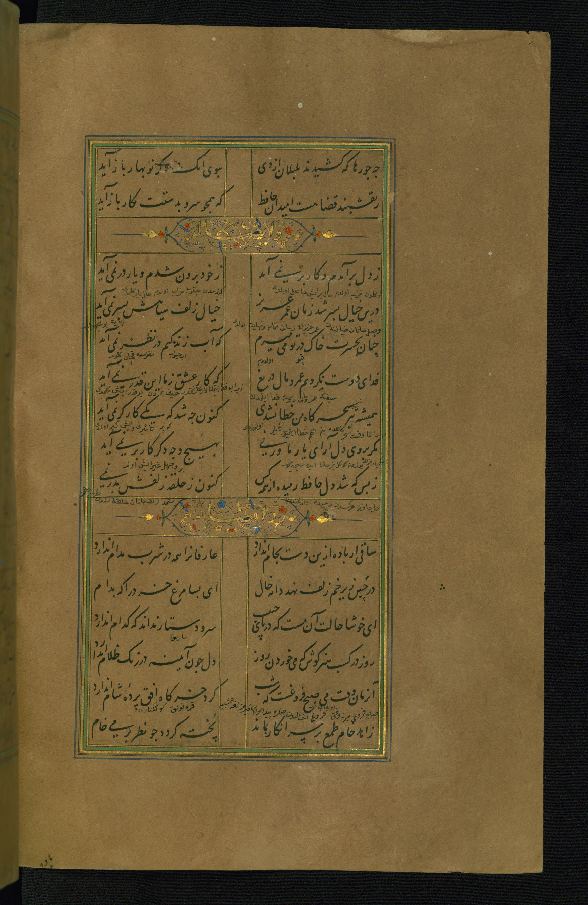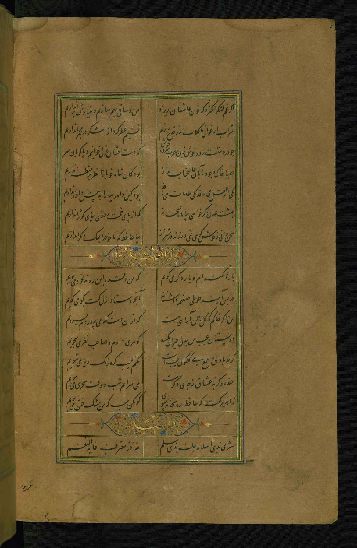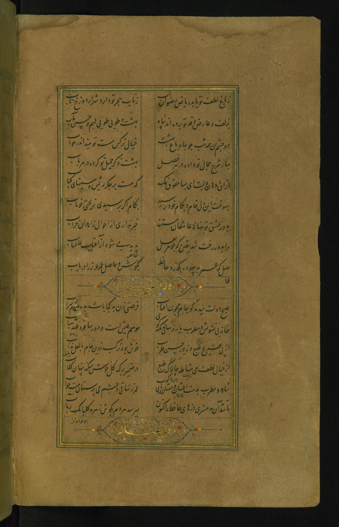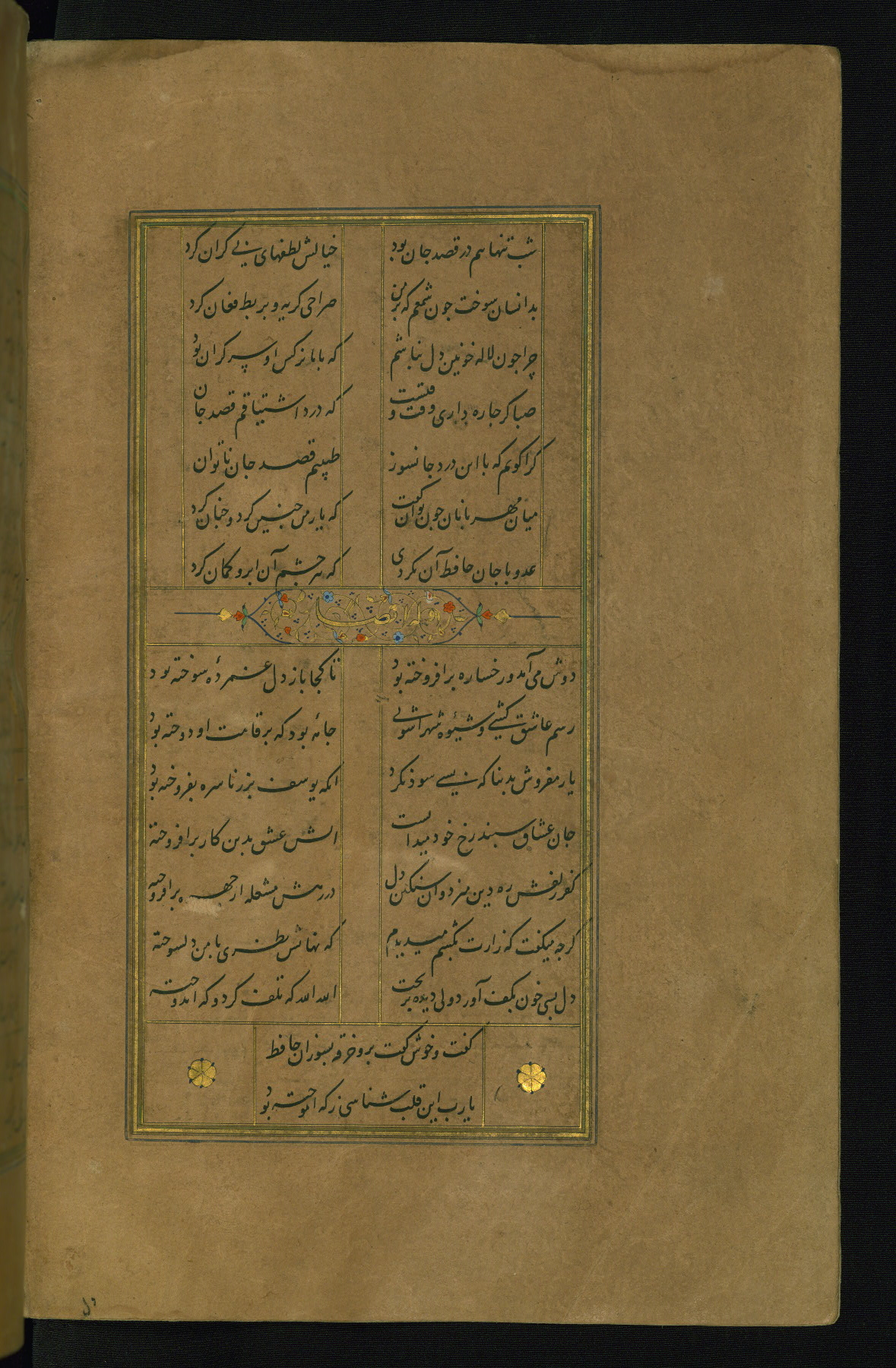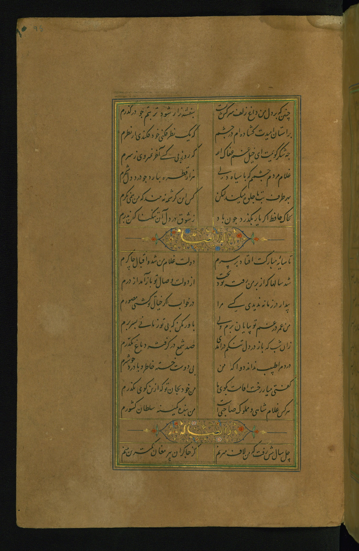 This is an illuminated and illustrated manuscript copy of the Collection of poems (dīvān) by Shams al-Dīn Muḥammad Ḥāfiz al-Shīrāzī (fl. eighth century AH / fourteenth CE). It was written in black nasta‘līq script with chapter/section headings in gold ink by Zayn al-‘Ābidīn ‘Abd al-Raḥmān al-Jāmī in 918 AH / 1512 CE in Safavid Iran. The manuscript opens with an illuminated medallion (fol. 1a), followed by a double-page illustrated frontispiece (fols. 1b-2a). The text begins with an incipit page with illuminated headpiece (fol. 2b). There are three additional illustrations (fols. 24a, 49b, and 87a). The red leather binding, which is not original and may be attributed to late twelfth-century AH / eighteenth CE or thirteenth-century AH / nineteenth CE Turkey, has a scalloped medallion with gold-tooled decoration and borders.