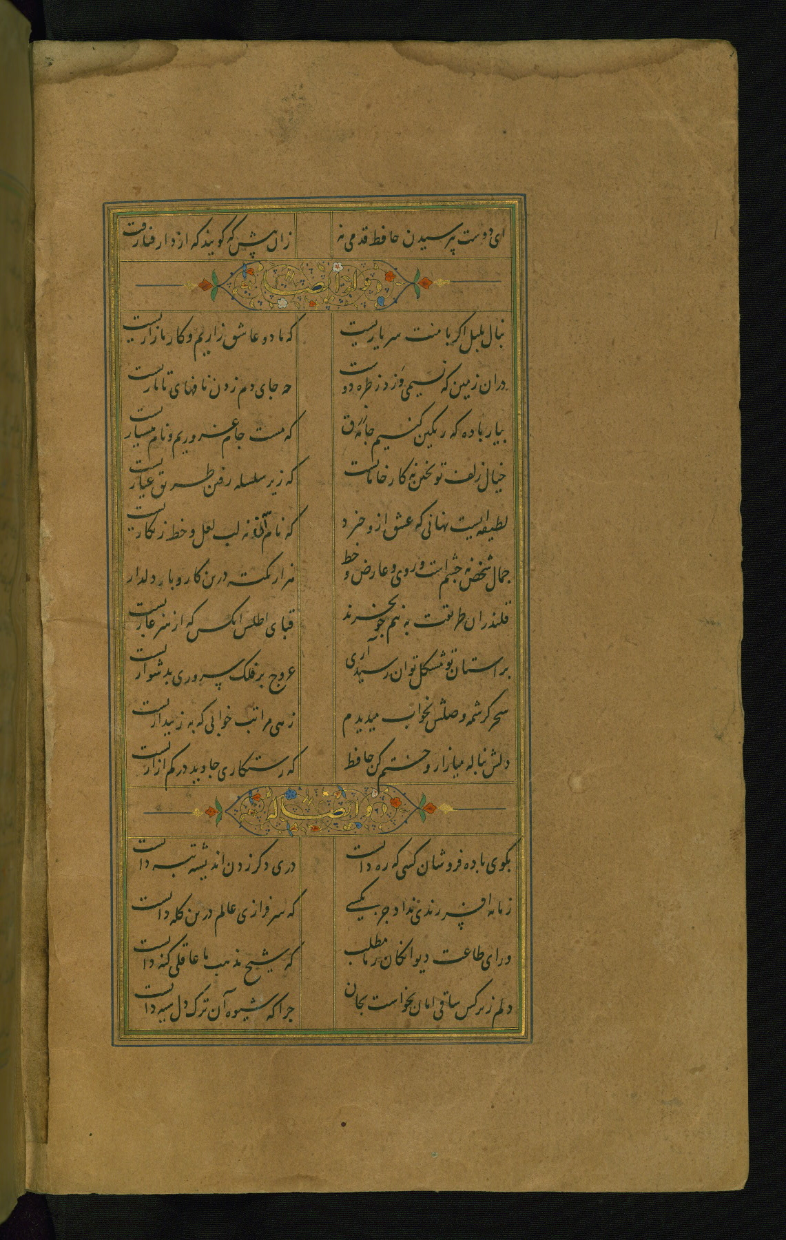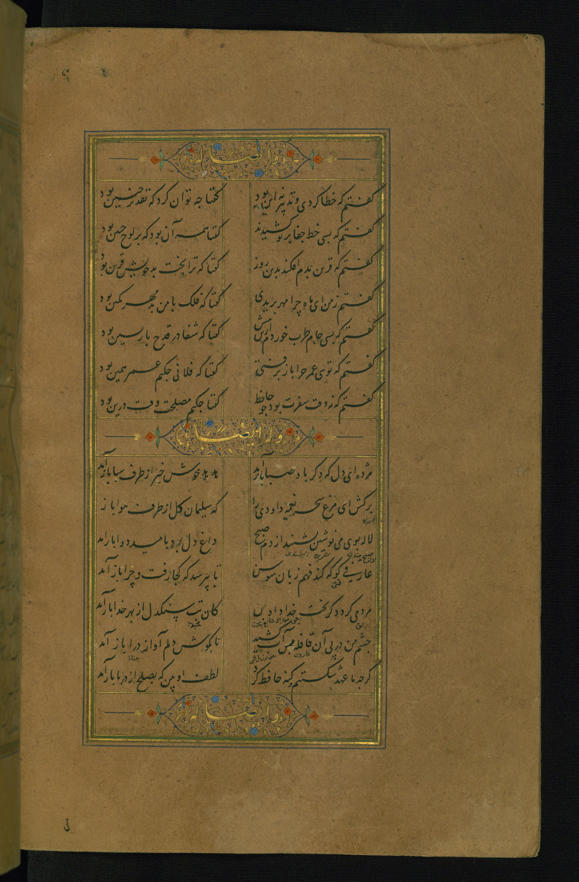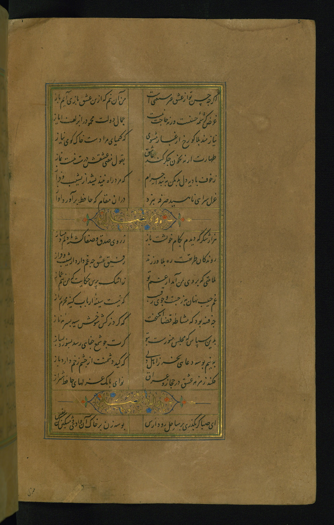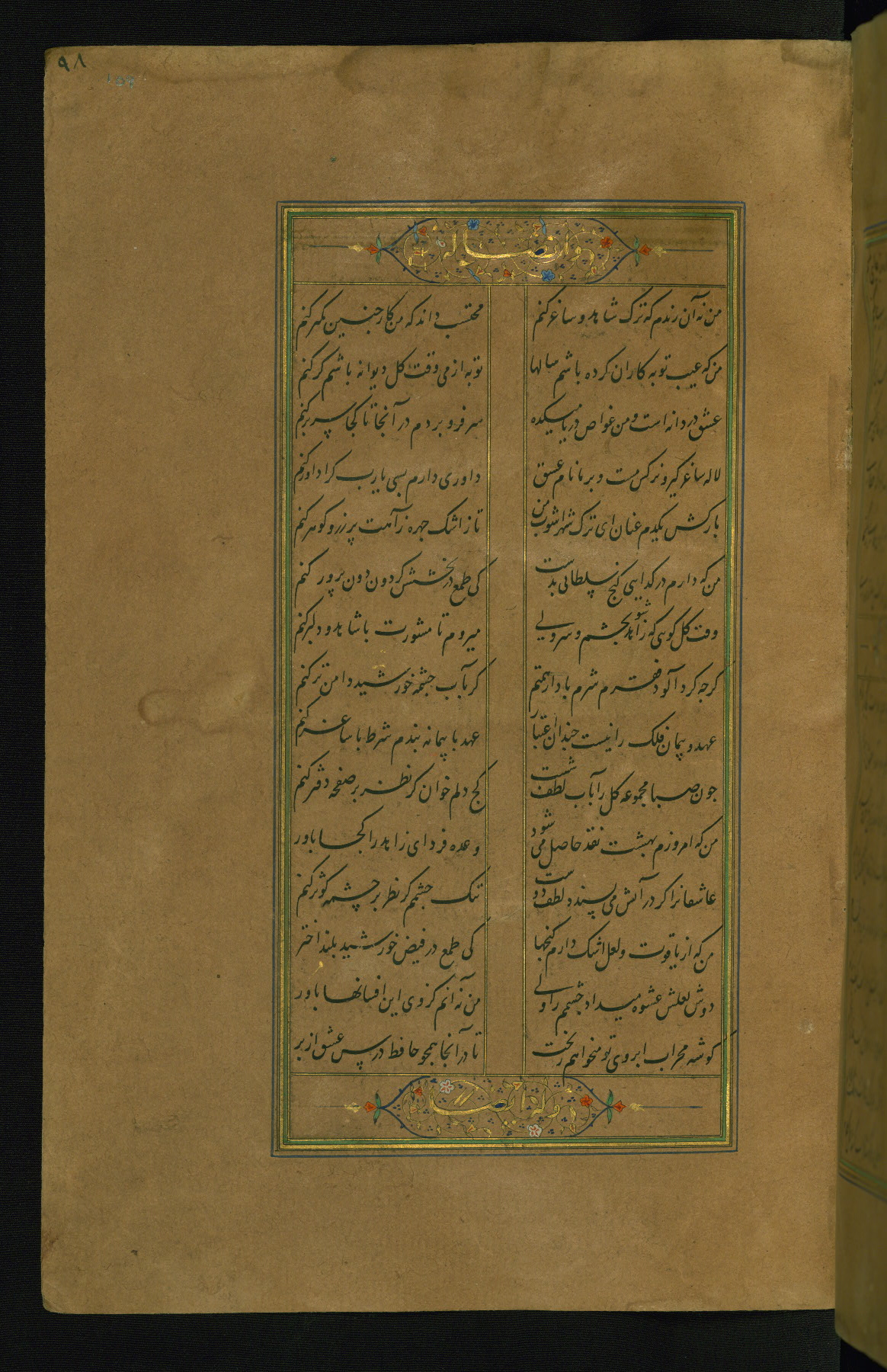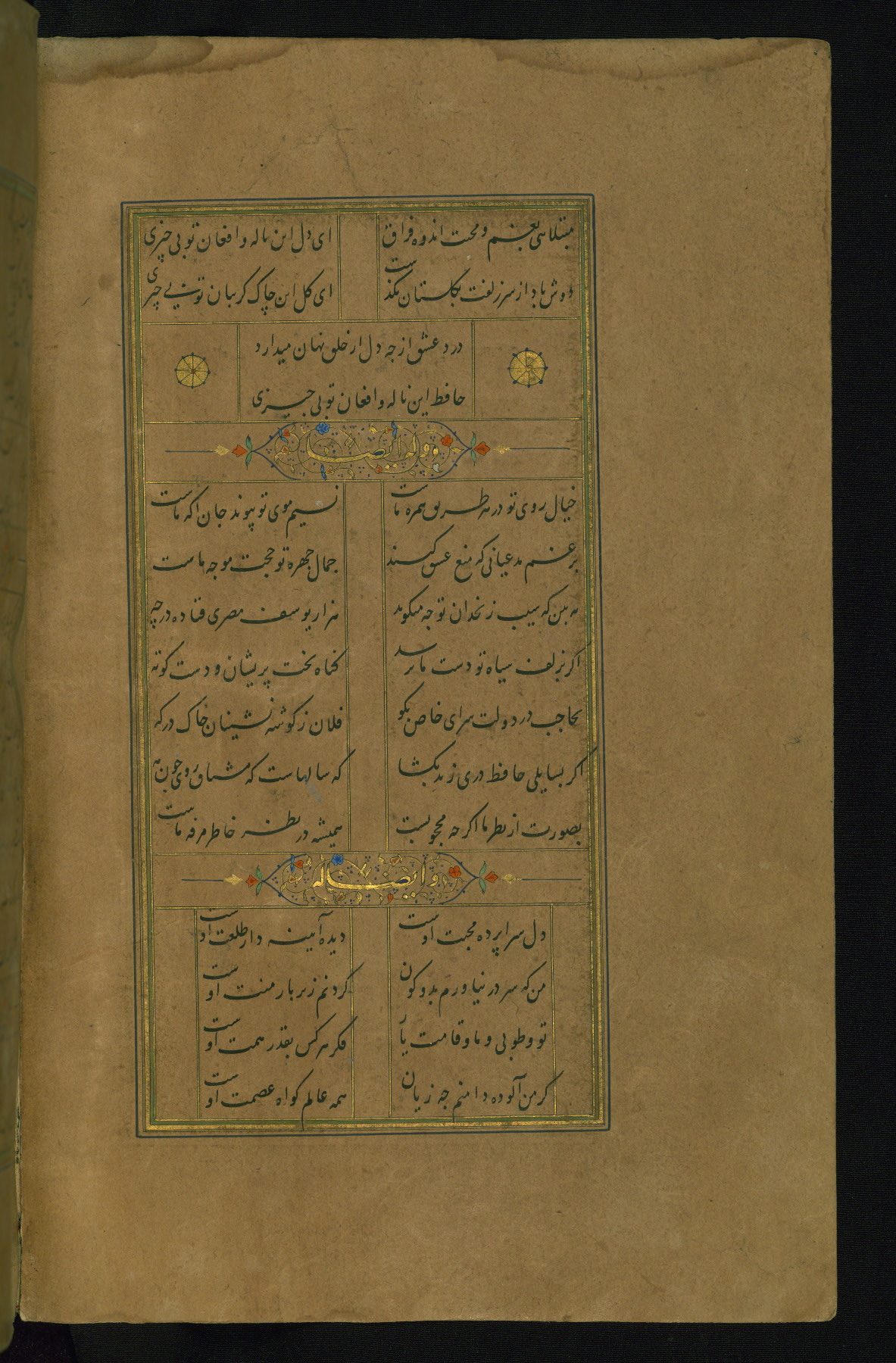 This is an illuminated and illustrated manuscript copy of the Collection of poems (dīvān) by Shams al-Dīn Muḥammad Ḥāfiz al-Shīrāzī (fl. eighth century AH / fourteenth CE). It was written in black nasta‘līq script with chapter/section headings in gold ink by Zayn al-‘Ābidīn ‘Abd al-Raḥmān al-Jāmī in 918 AH / 1512 CE in Safavid Iran. The manuscript opens with an illuminated medallion (fol. 1a), followed by a double-page illustrated frontispiece (fols. 1b-2a). The text begins with an incipit page with illuminated headpiece (fol. 2b). There are three additional illustrations (fols. 24a, 49b, and 87a). The red leather binding, which is not original and may be attributed to late twelfth-century AH / eighteenth CE or thirteenth-century AH / nineteenth CE Turkey, has a scalloped medallion with gold-tooled decoration and borders.