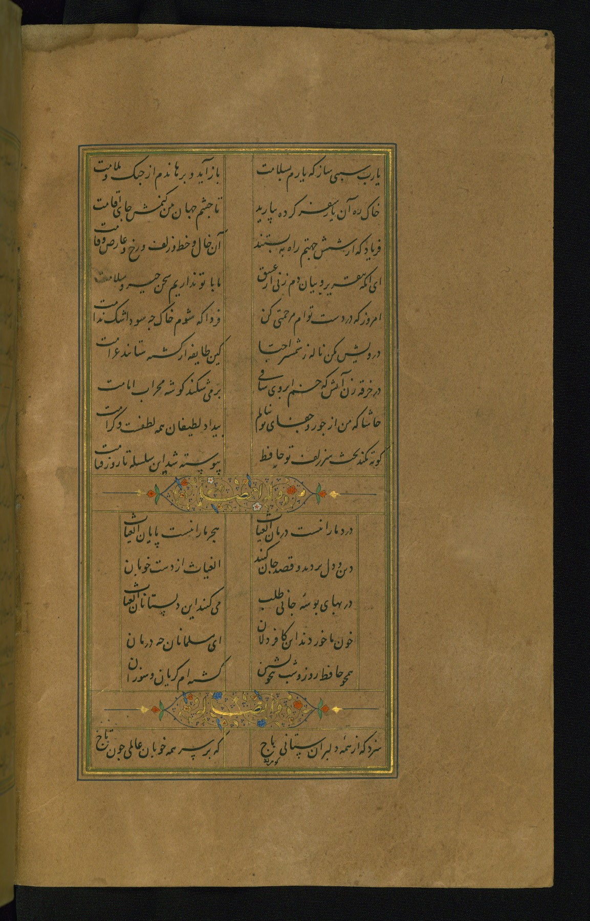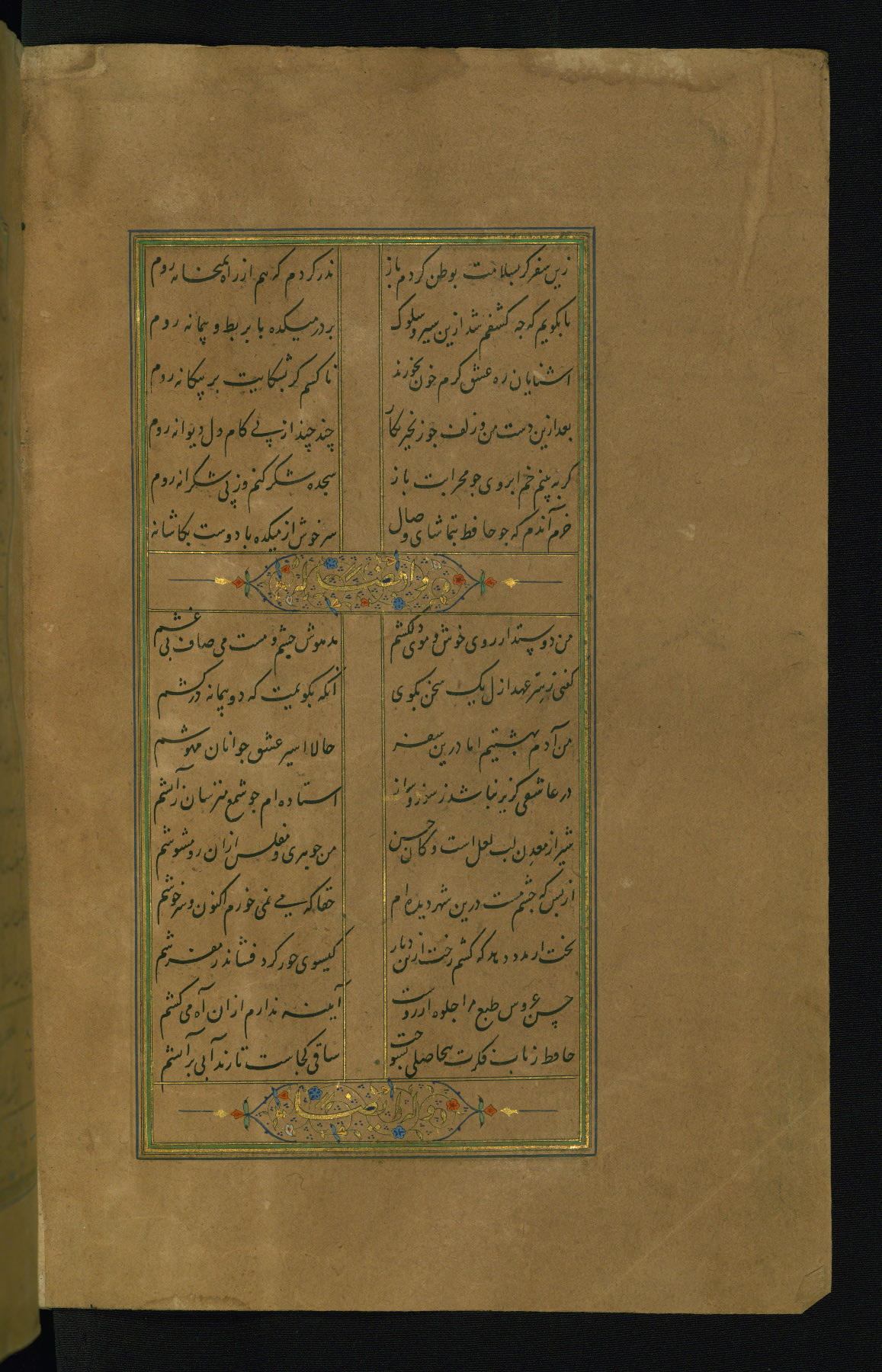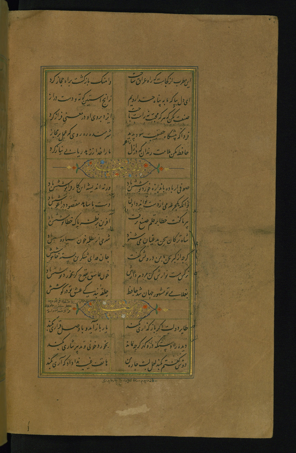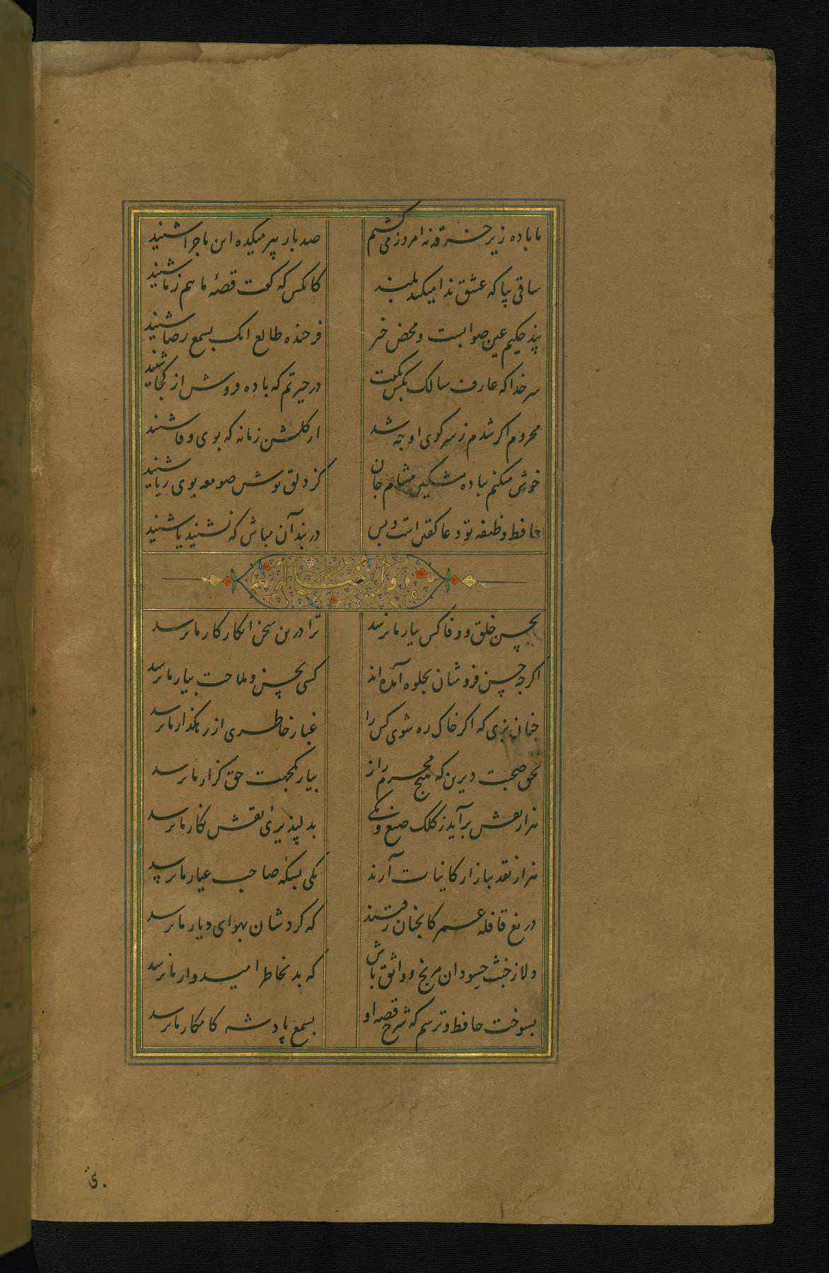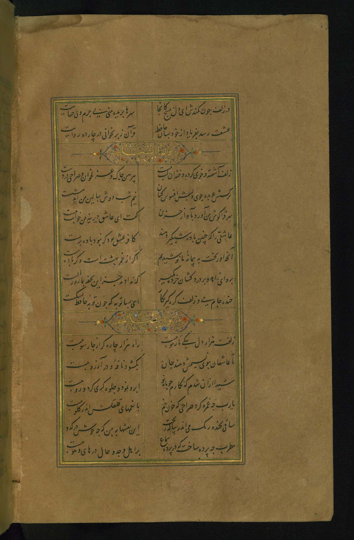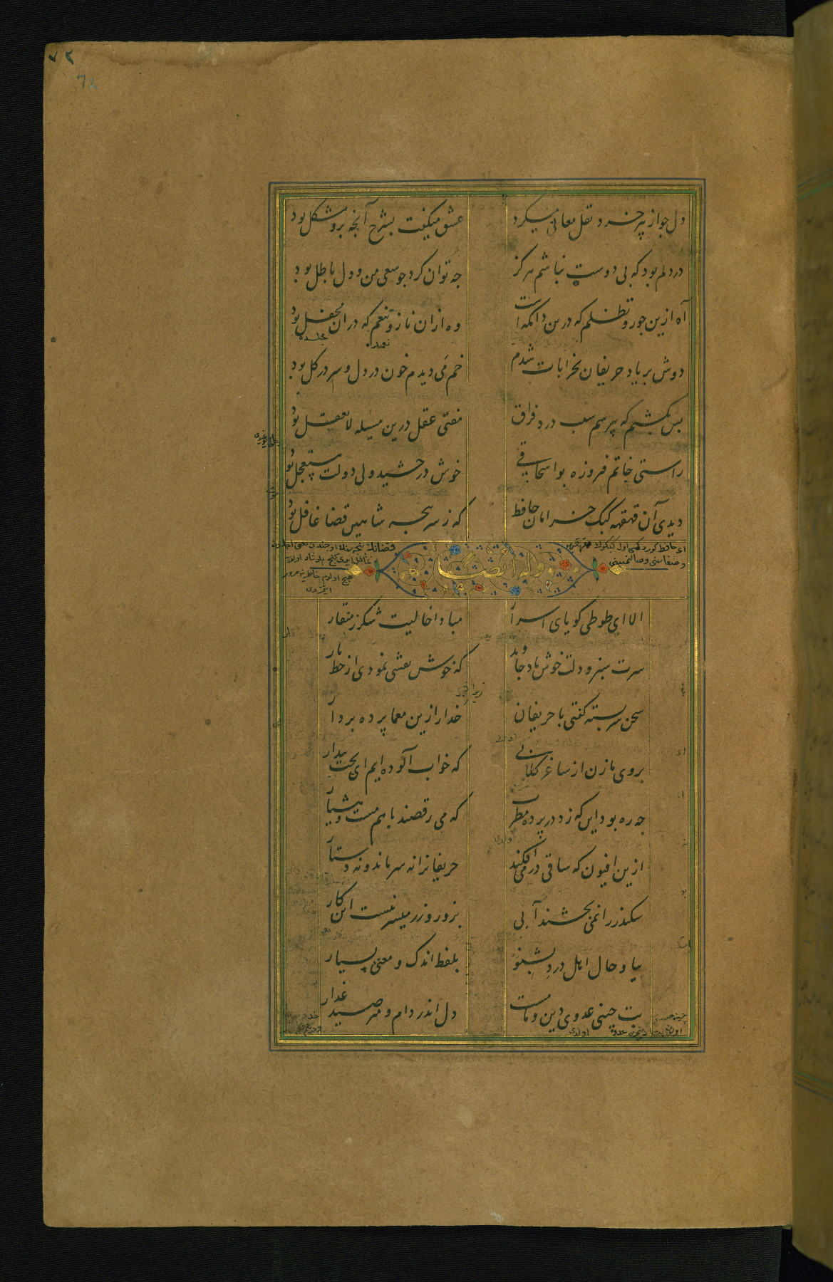 This is an illuminated and illustrated manuscript copy of the Collection of poems (dīvān) by Shams al-Dīn Muḥammad Ḥāfiz al-Shīrāzī (fl. eighth century AH / fourteenth CE). It was written in black nasta‘līq script with chapter/section headings in gold ink by Zayn al-‘Ābidīn ‘Abd al-Raḥmān al-Jāmī in 918 AH / 1512 CE in Safavid Iran. The manuscript opens with an illuminated medallion (fol. 1a), followed by a double-page illustrated frontispiece (fols. 1b-2a). The text begins with an incipit page with illuminated headpiece (fol. 2b). There are three additional illustrations (fols. 24a, 49b, and 87a). The red leather binding, which is not original and may be attributed to late twelfth-century AH / eighteenth CE or thirteenth-century AH / nineteenth CE Turkey, has a scalloped medallion with gold-tooled decoration and borders.